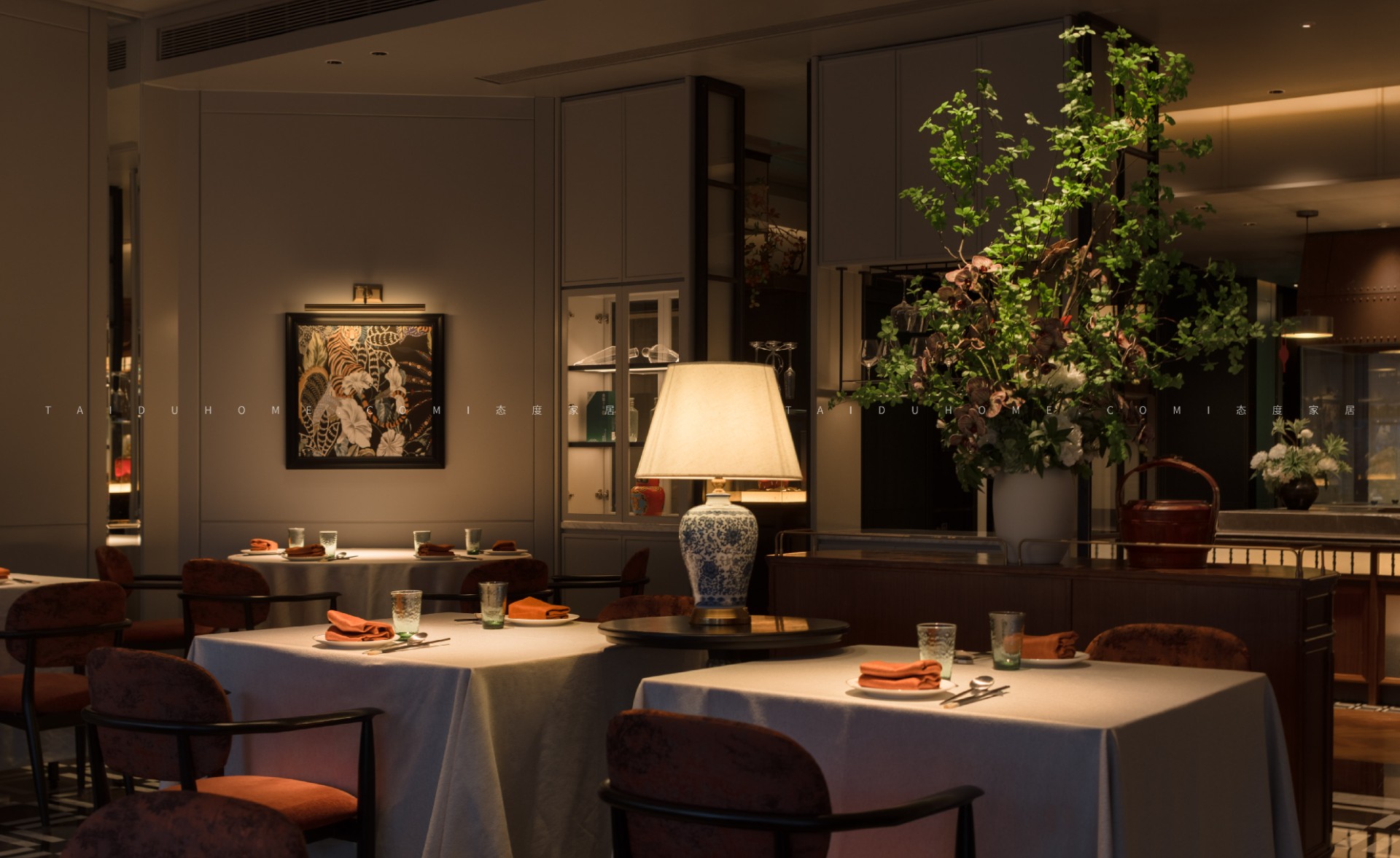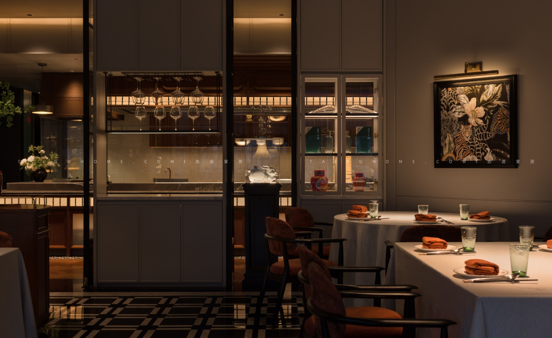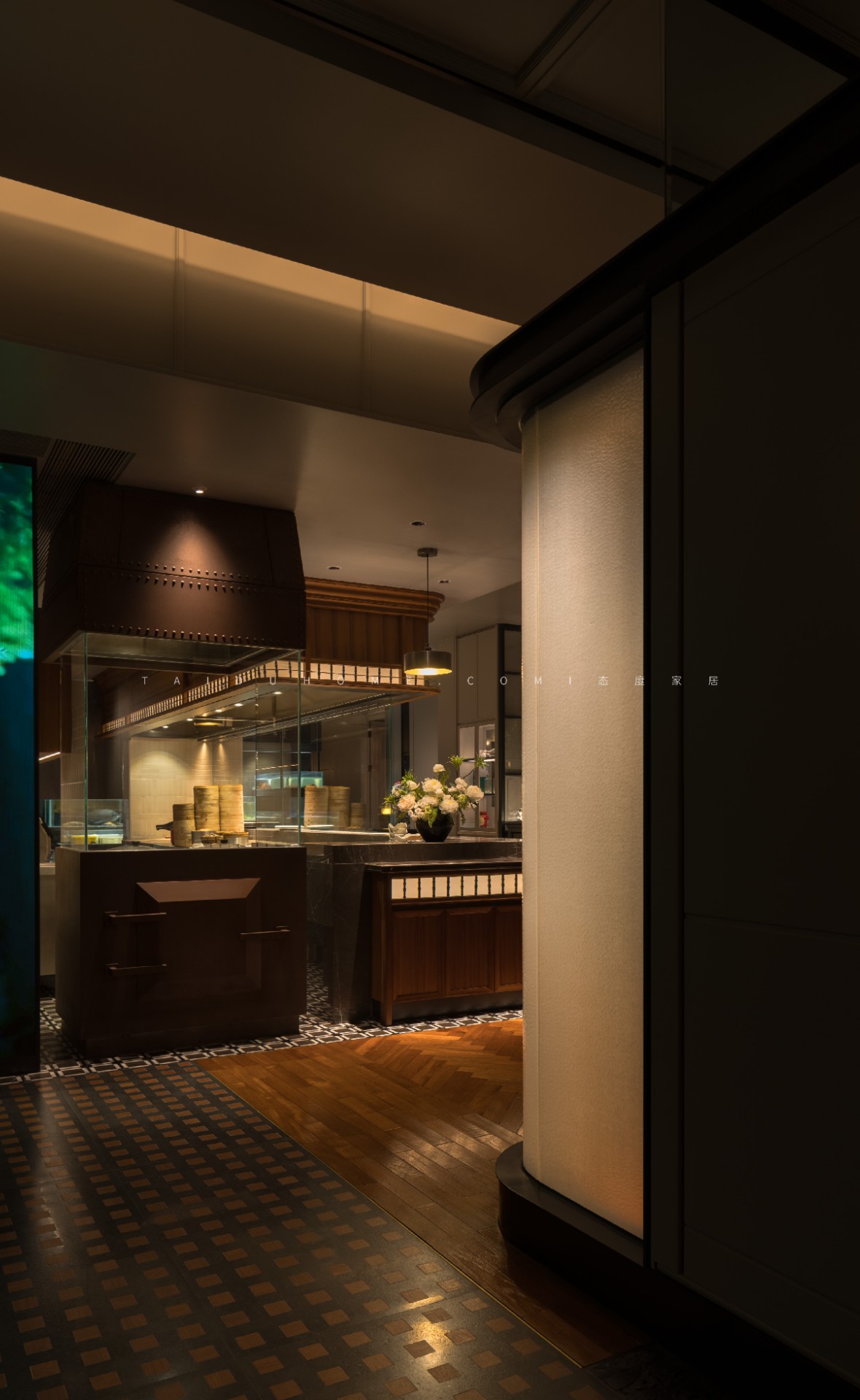 空间序列如一幅展开的长卷,以 “书房” 门厅为序,经水墨意蕴的 “曲廊” 过渡,最终抵达烟火氤氲的 “明档” 核心。散厅直面这份温暖景观,两侧包厢则如静雅厢房,借景生情,隔而不断。