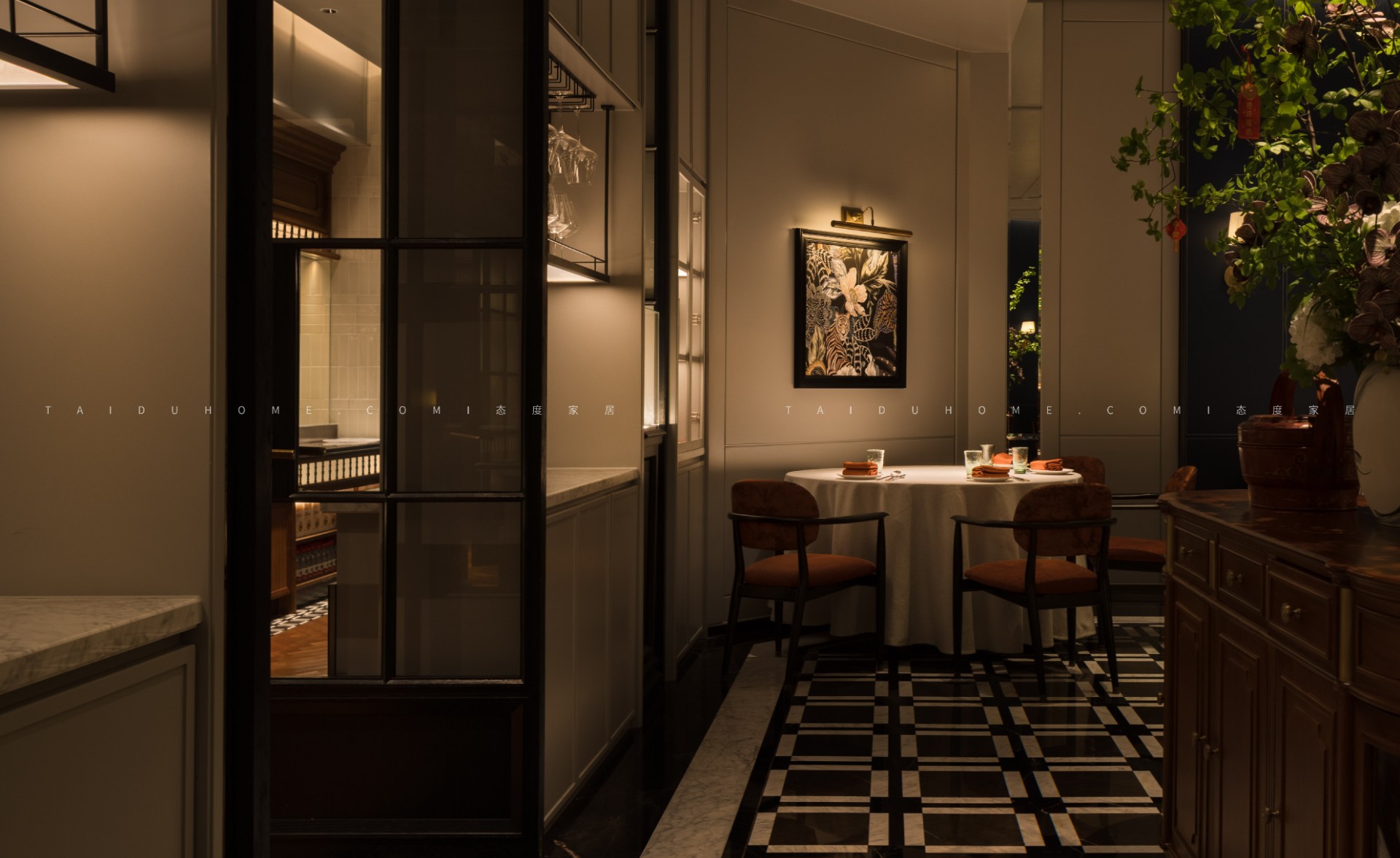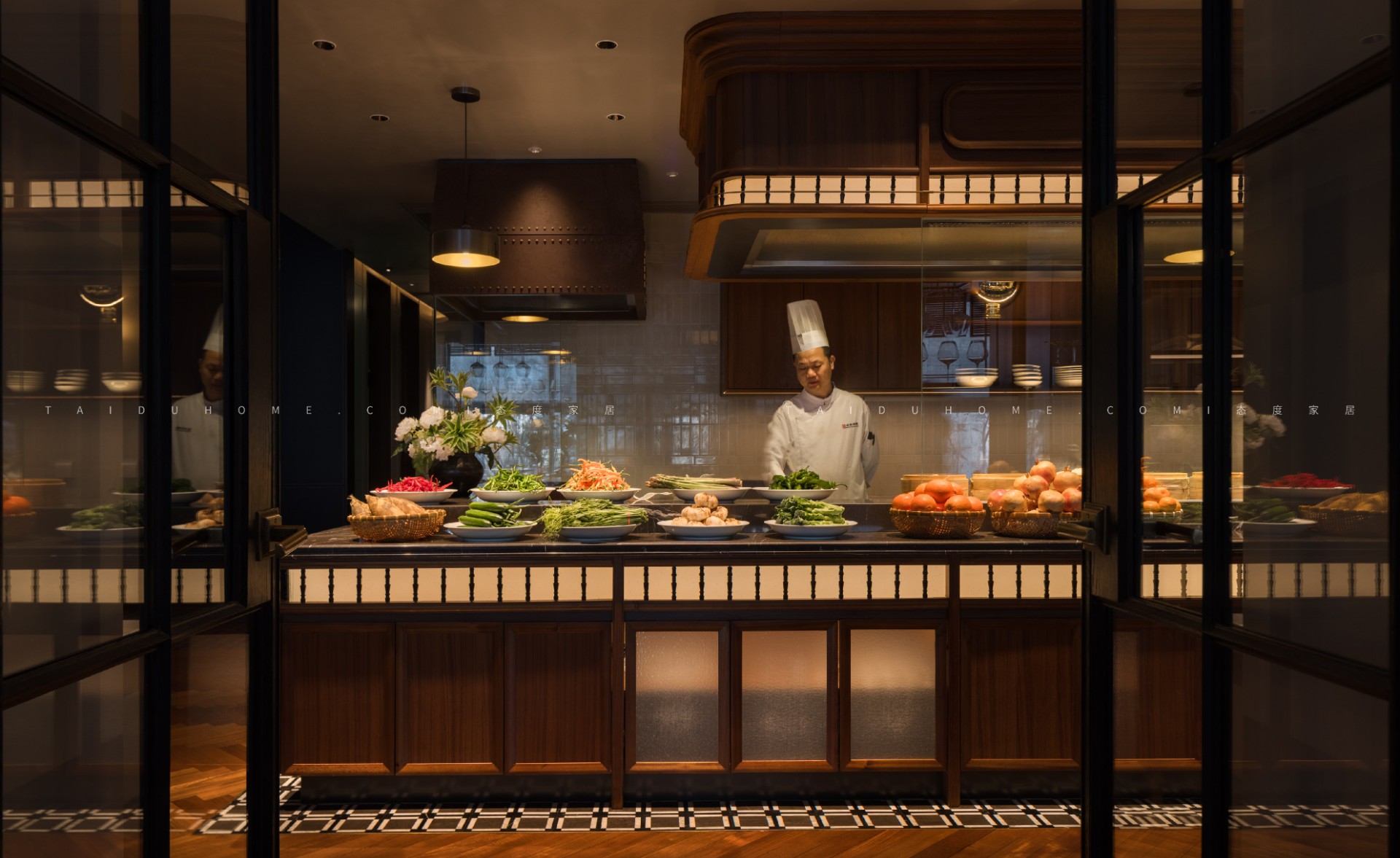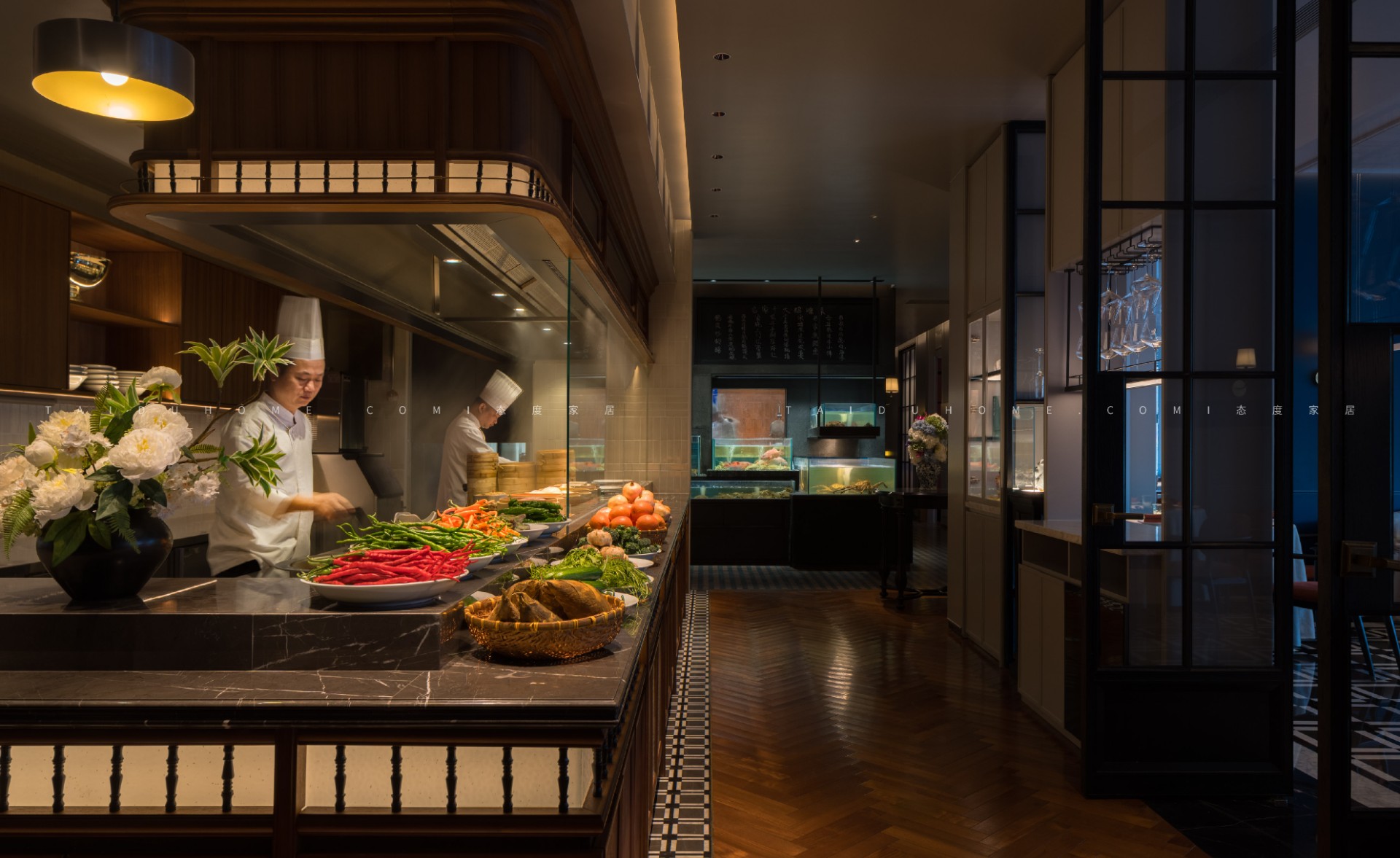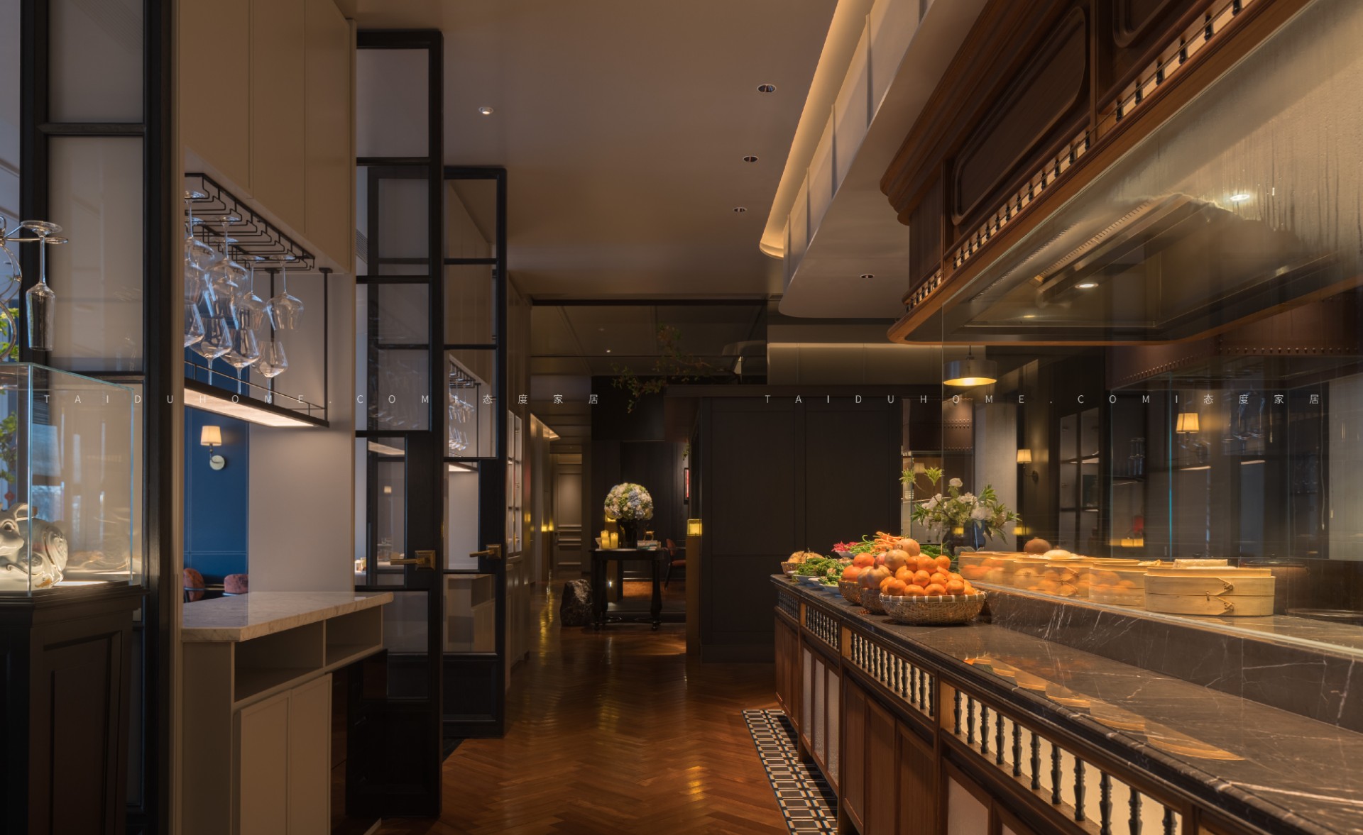 空间序列如一幅展开的长卷,以 “书房” 门厅为序,经水墨意蕴的 “曲廊” 过渡,最终抵达烟火氤氲的 “明档” 核心。散厅直面这份温暖景观,两侧包厢则如静雅厢房,借景生情,隔而不断。