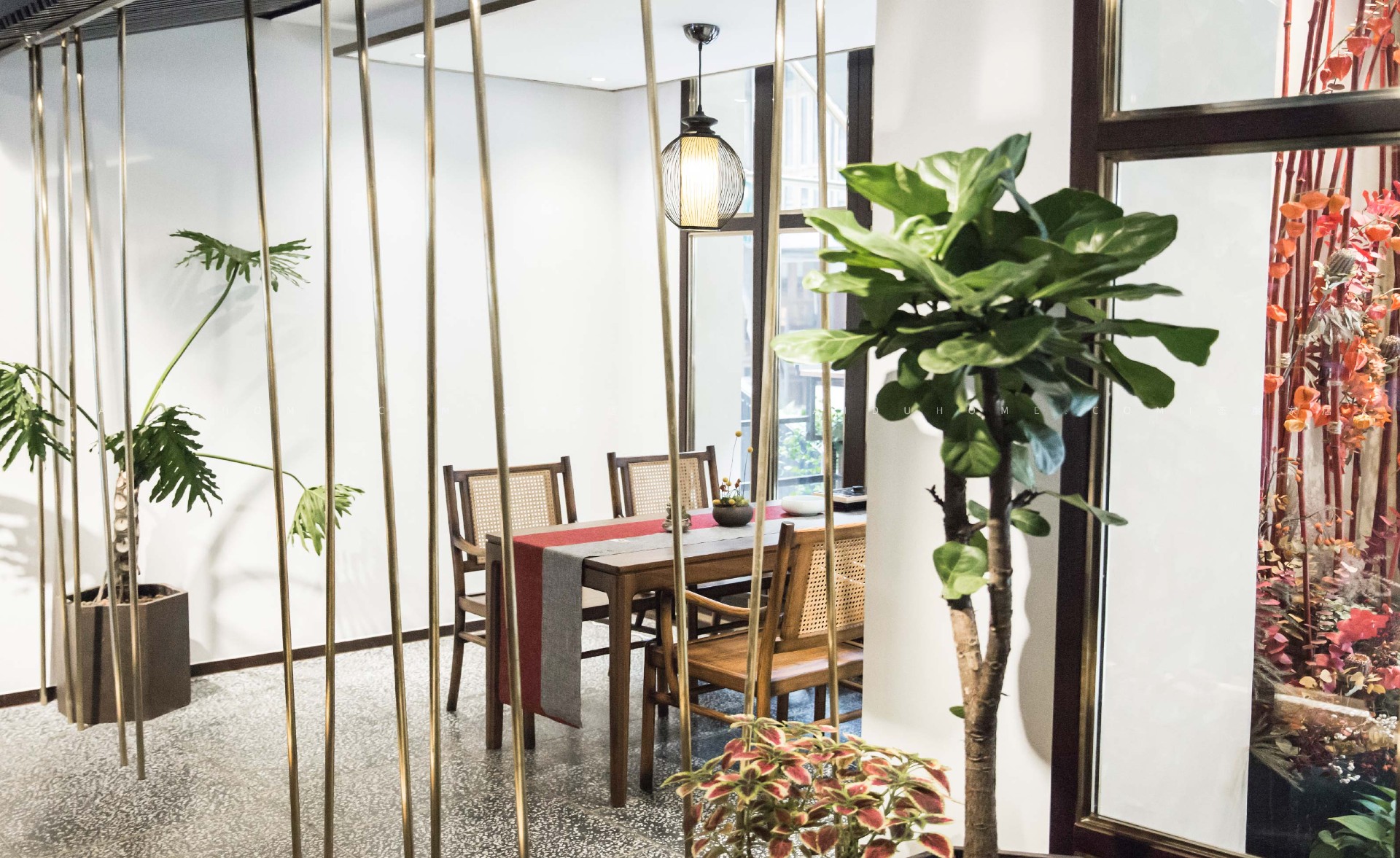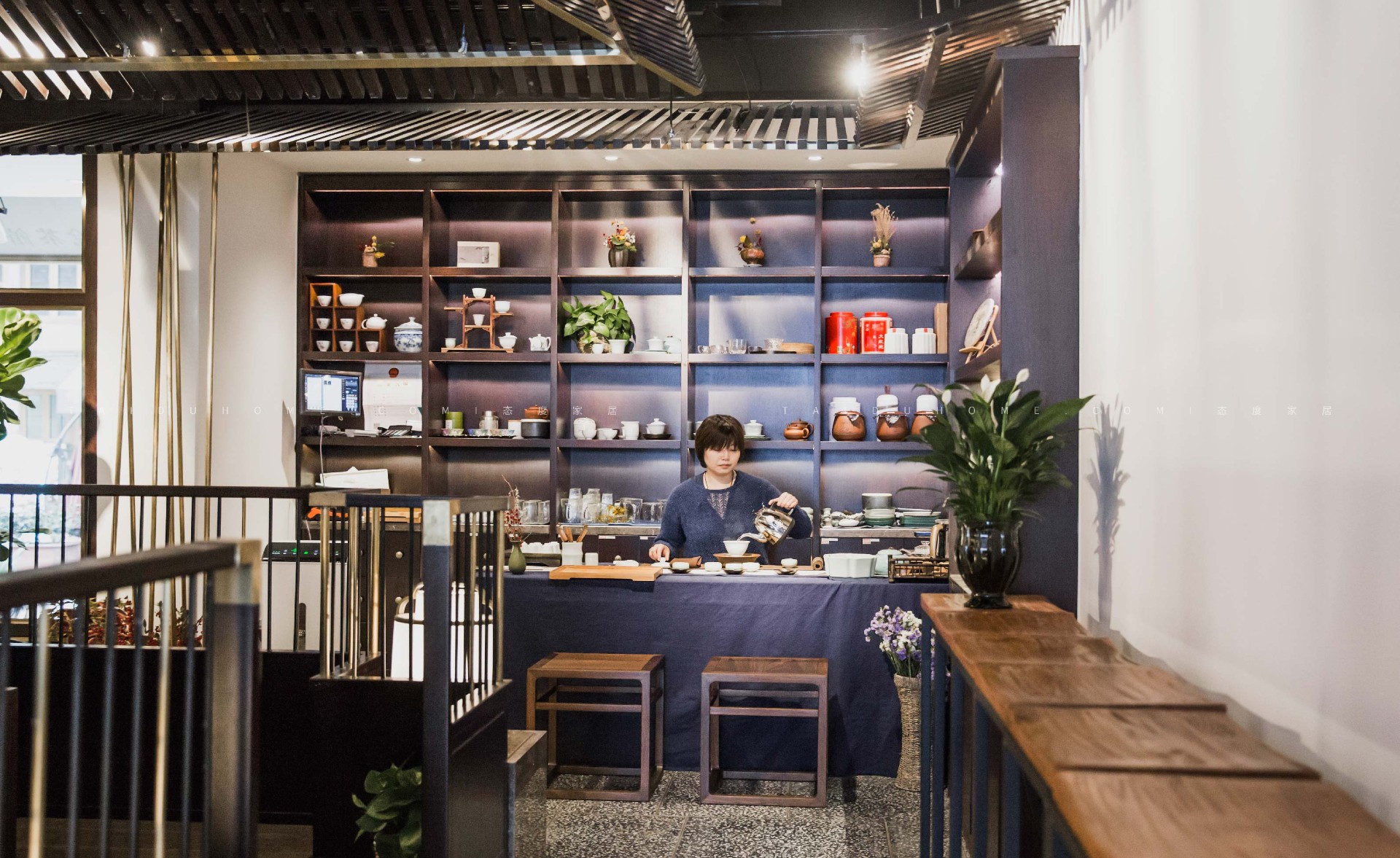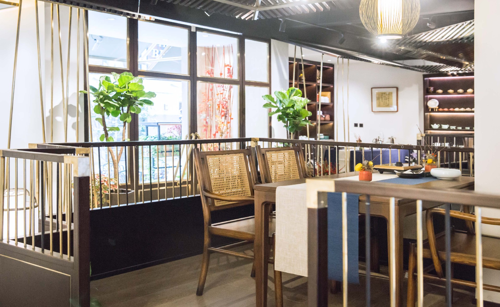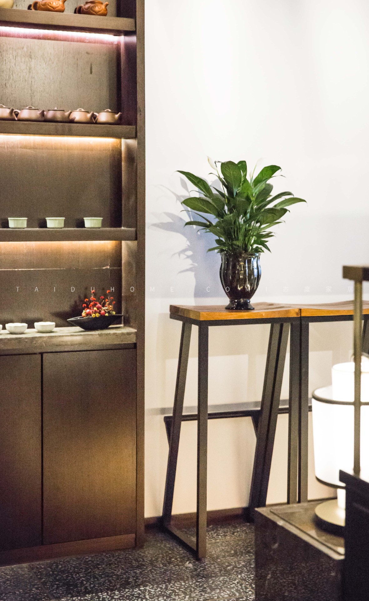 茶空间的迎客区域,我们以一张茶桌、两个茶凳和一面茶柜构成。色彩为厚重的黑胡桃木色,旁边则搭配以劲竹与绿植,生气盎然。