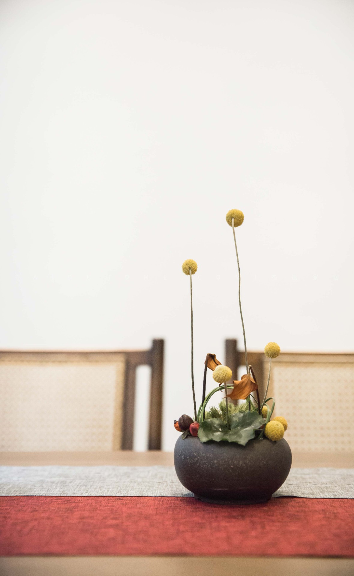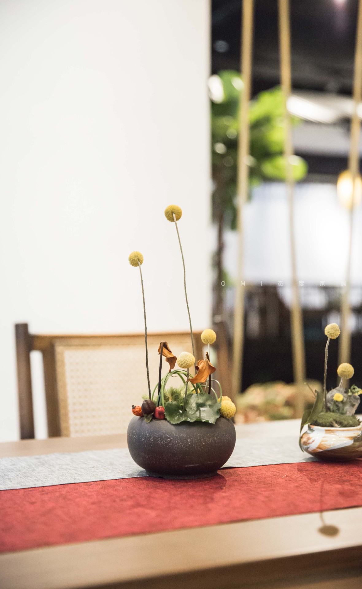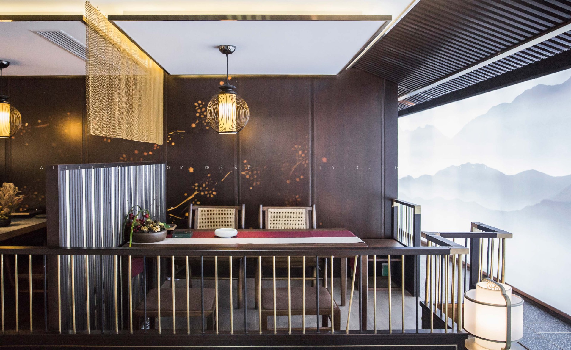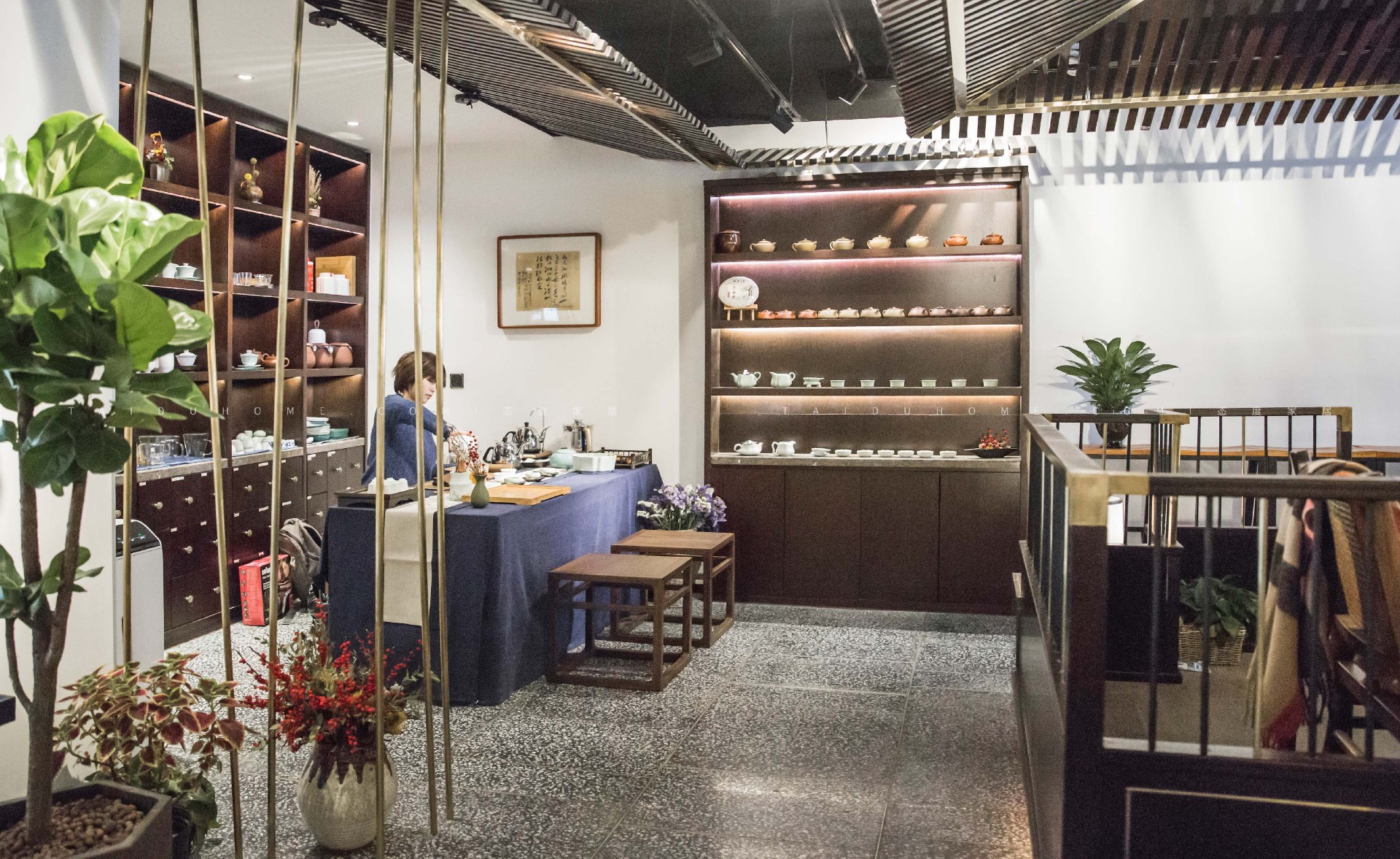 茶空间的迎客区域,我们以一张茶桌、两个茶凳和一面茶柜构成。色彩为厚重的黑胡桃木色,旁边则搭配以劲竹与绿植,生气盎然。