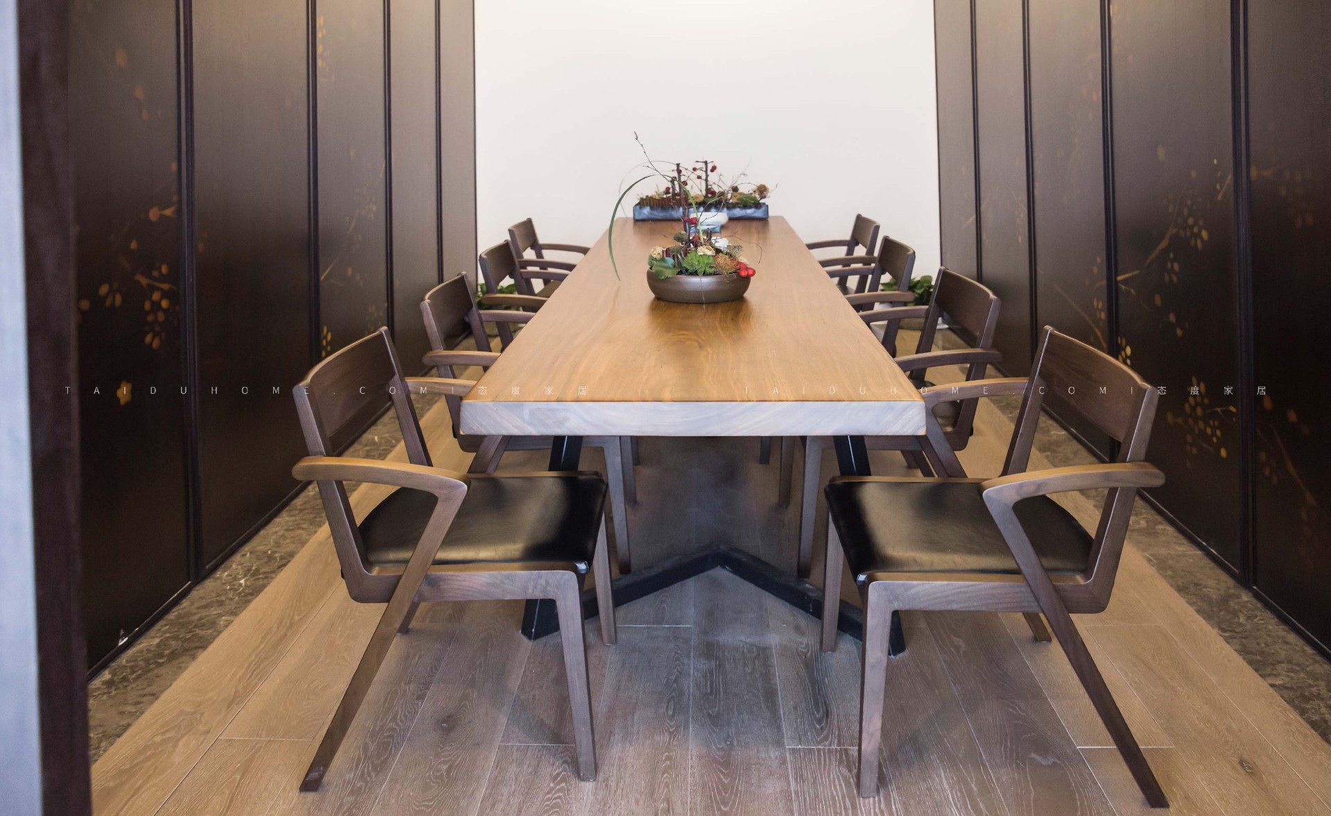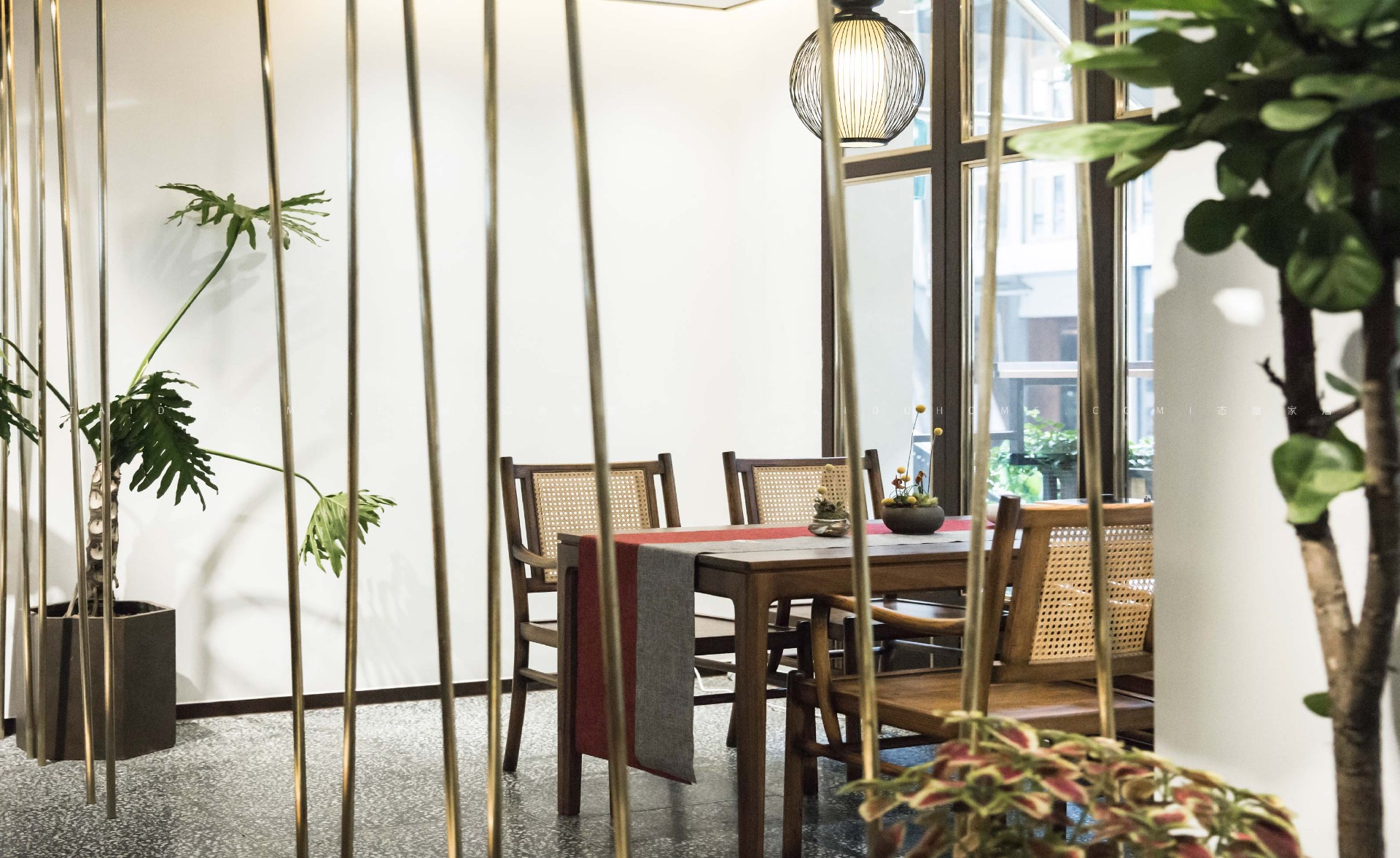 The welcoming area of the tea space consists of a tea table, two tea stools, and a tea cabinet. The color is a heavy black walnut wood color, paired with strong bamboo and green plants next to it, full of vitality.