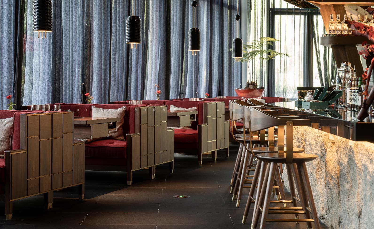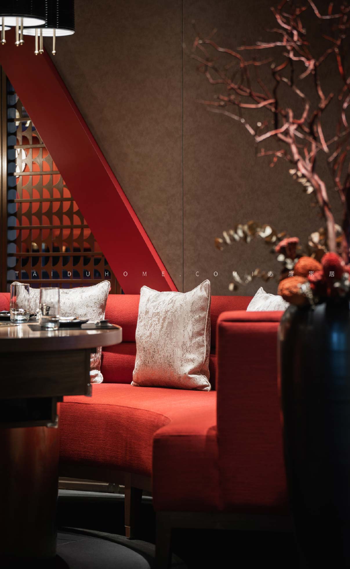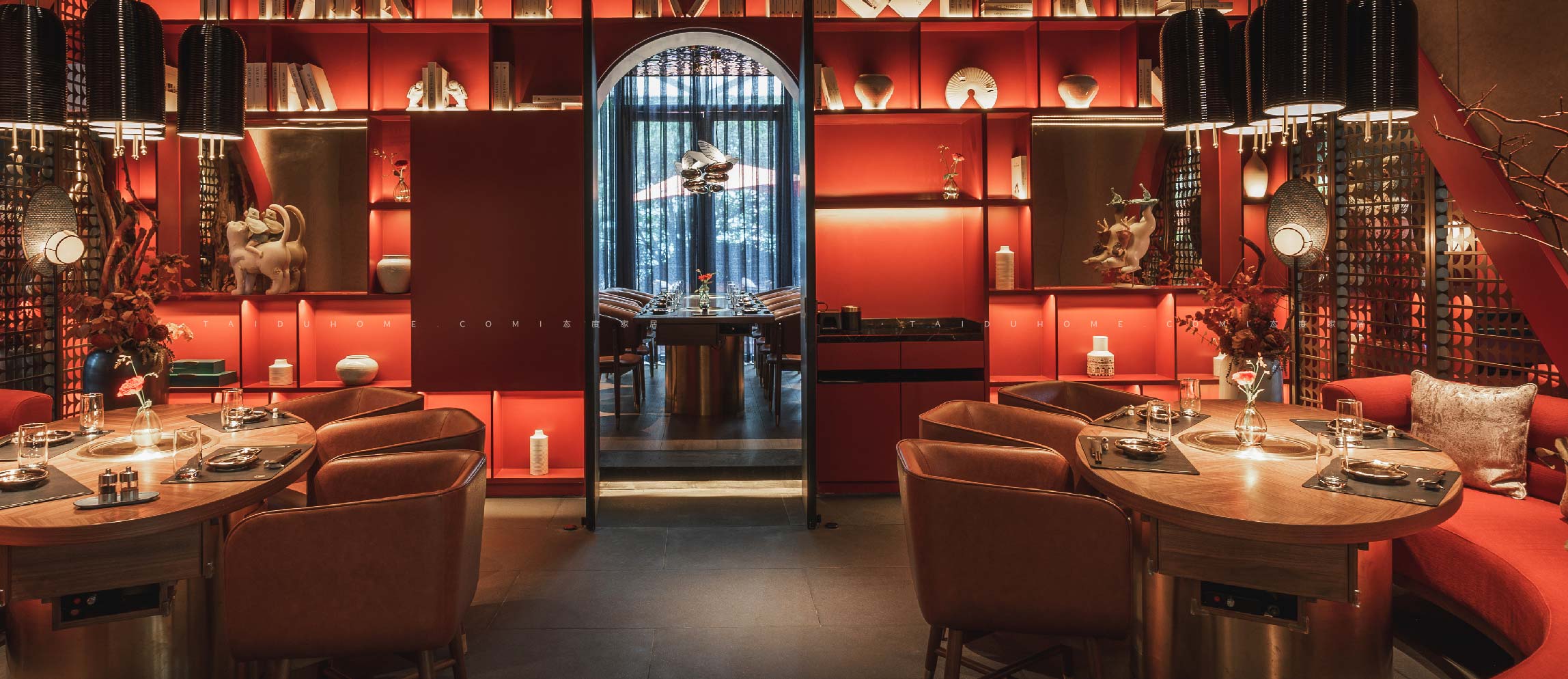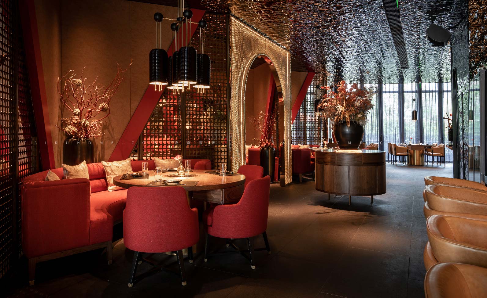 The central device composed of metal and iron enclosures in the entire space, combined with warm colored lighting, stands out with a sense of ceremony in a passionate and confusing environment. The designer creates a high-end spatial atmosphere through a combination of rich red and walnut materials, and the reflective finish on the top of the device also reflects the sparkling night.