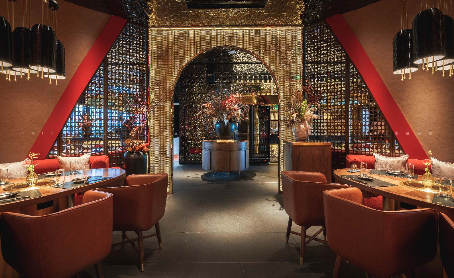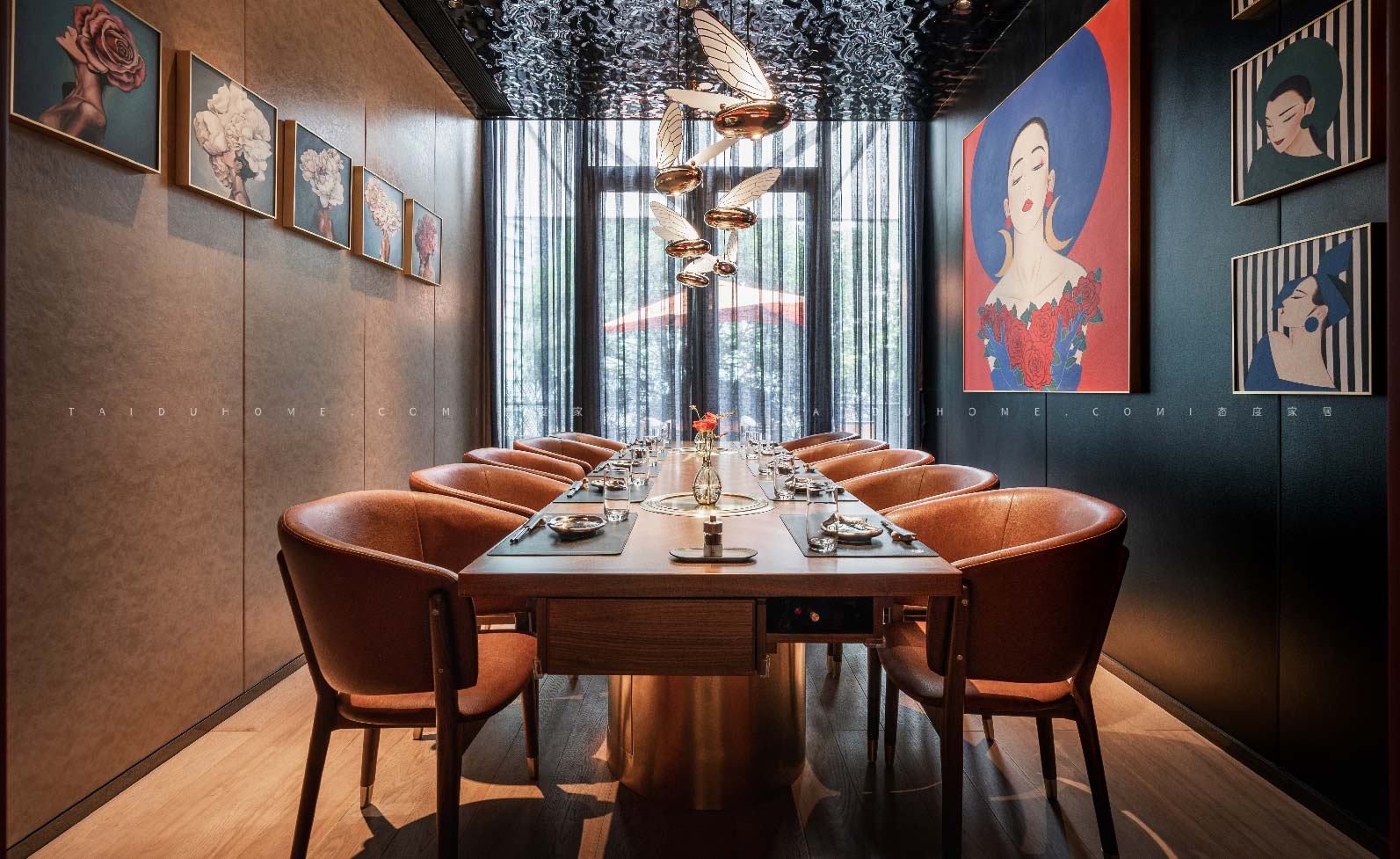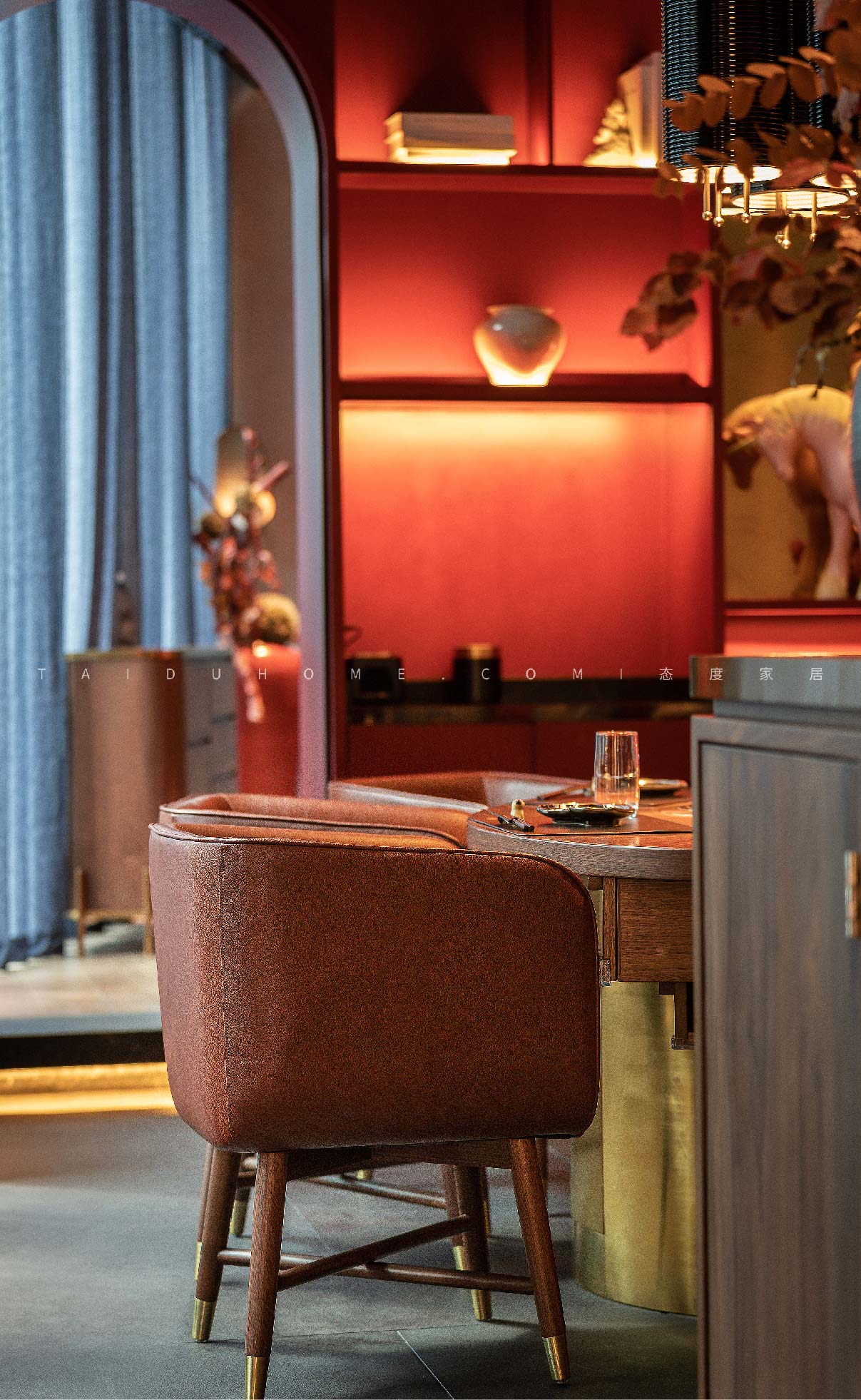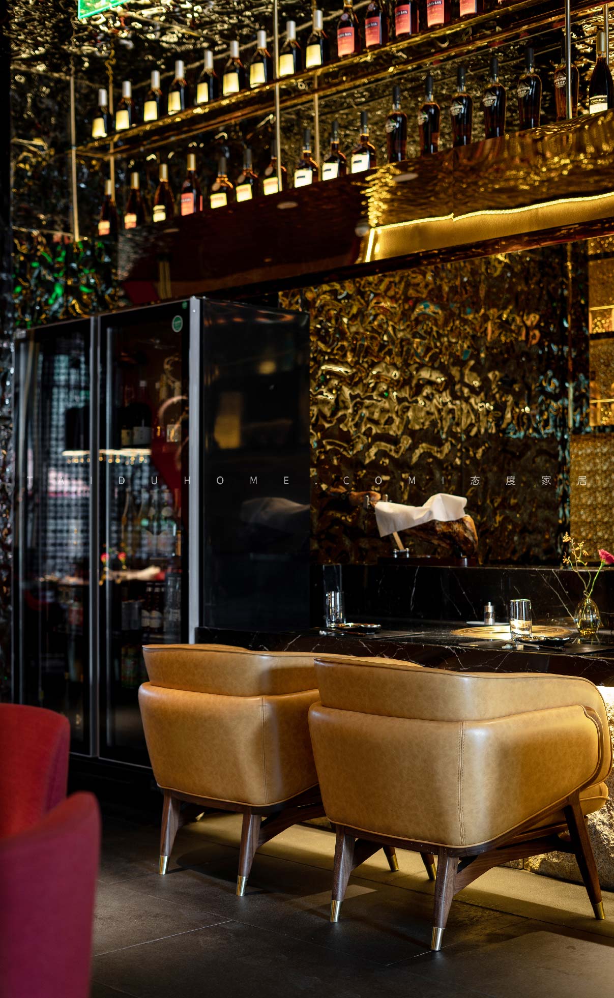 The combination of diverse spaces, the private rooms surround the gathering wine guests with neon sounds, and the decorative pleated metal carried by the top device also fills the regional space with a dreamy atmosphere. The circular sofa gives a comfortable wrapping feeling, and the dark brown leather art, combined with the overall color tone and artistic hanging paintings, creates a retro and modern style.
