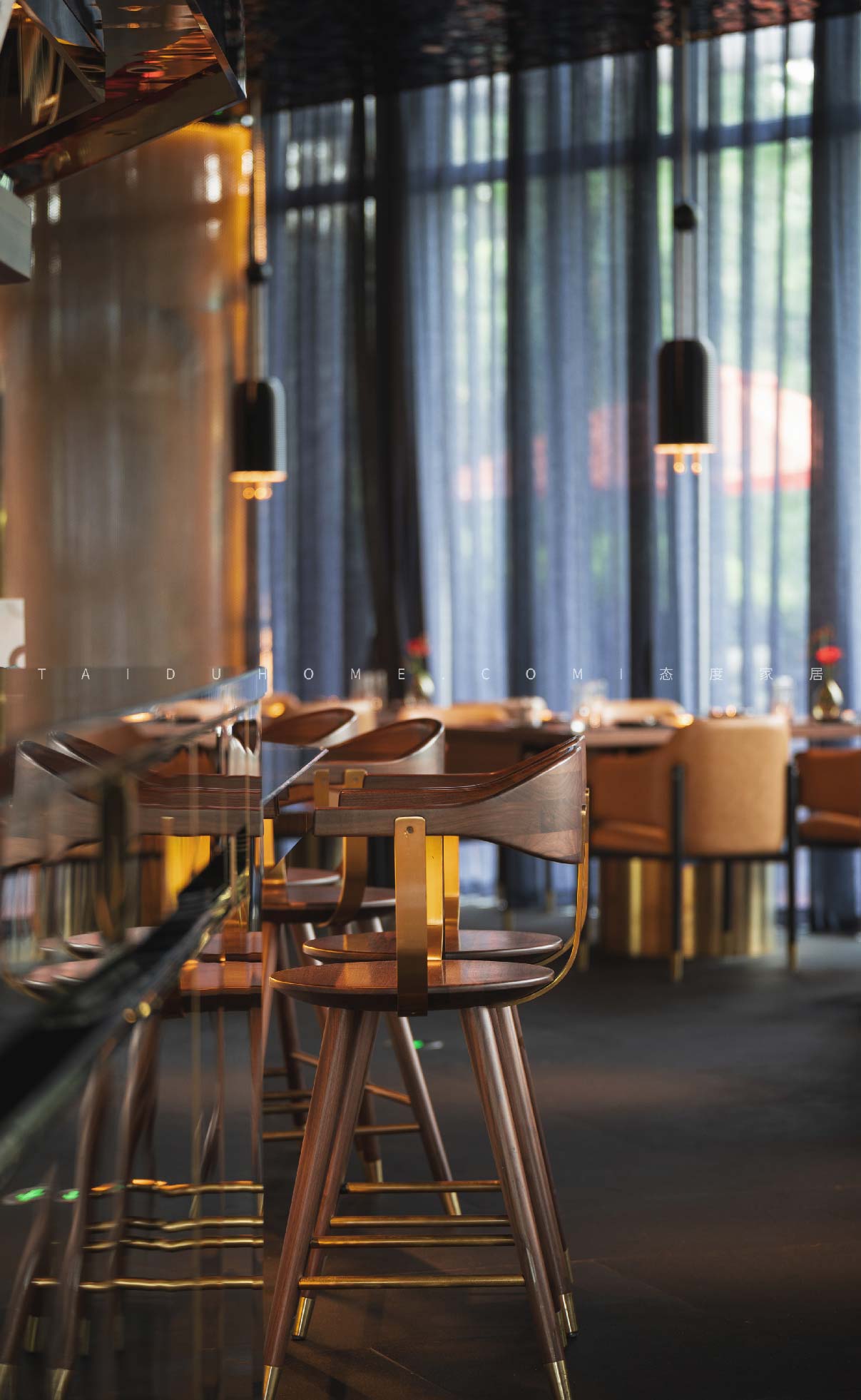 整个空间金属铁艺围合成的中心装置配合暖色灯光在热情迷离的环境中更突显得具有仪式感。设计师通过饱满的红色调和胡桃木材质组织搭配出的高级空间氛围,装置顶部反光饰面亦折射出波光粼粼的夜晚。