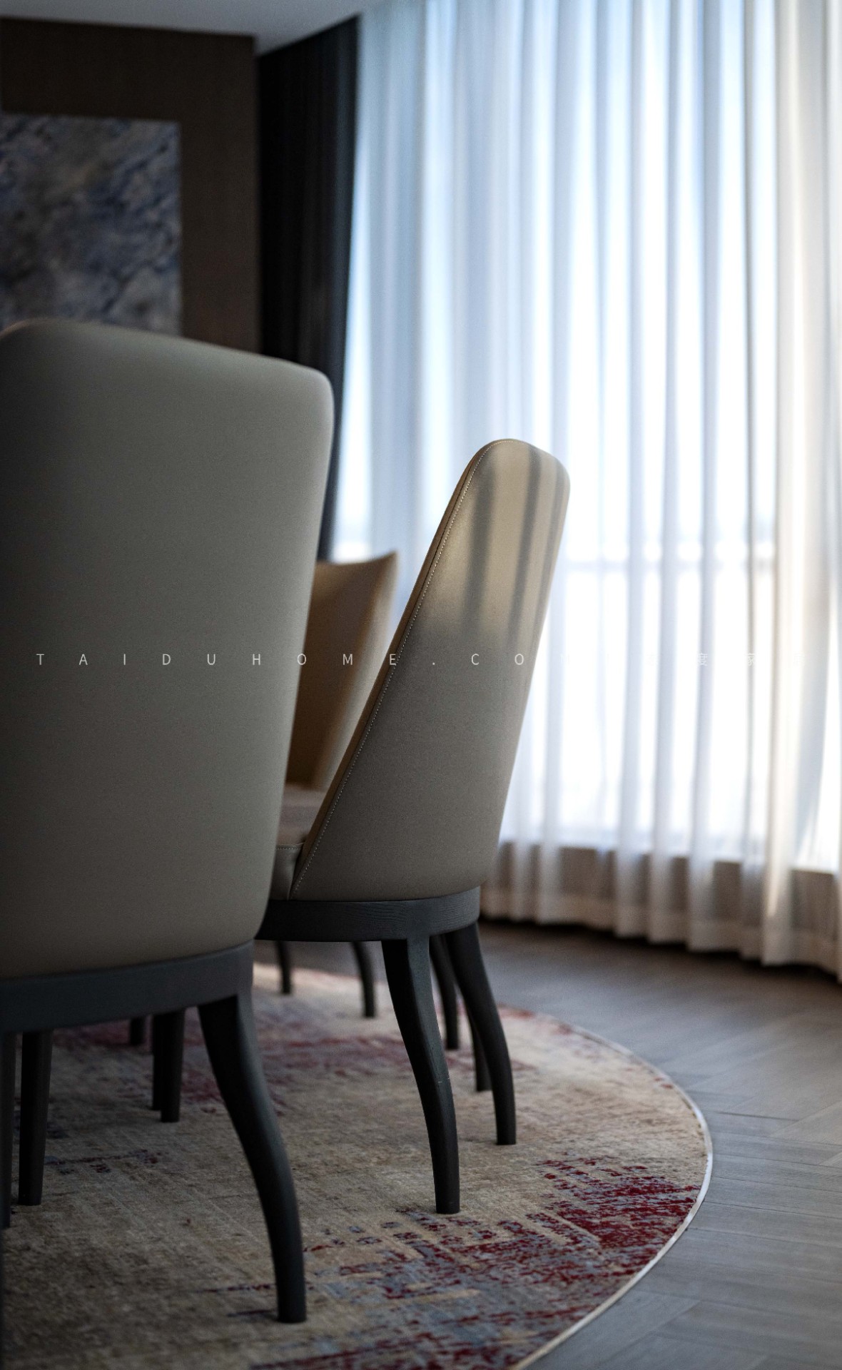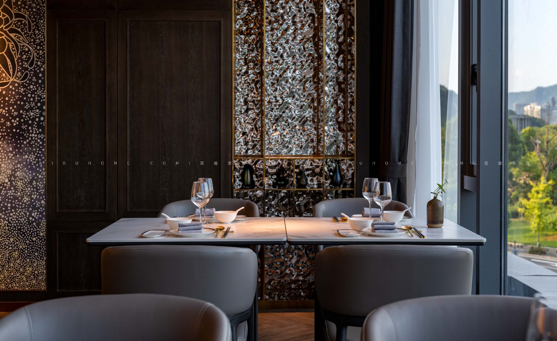 黛瓦青砖转化为纹理分明的大理石材面,从中式风格中提炼出窗花、格栅等元素,其镂空线条维持了空间通透,独特的型态与寓意运用在设计元素中,为享用美食的时光再添意趣。