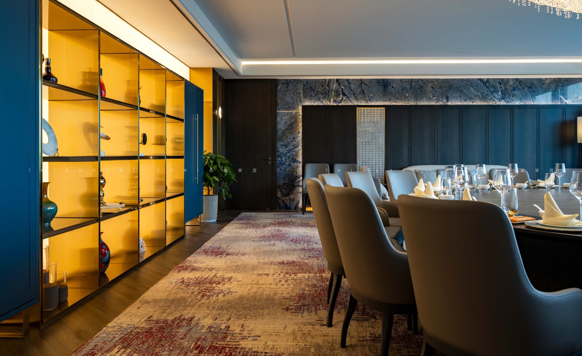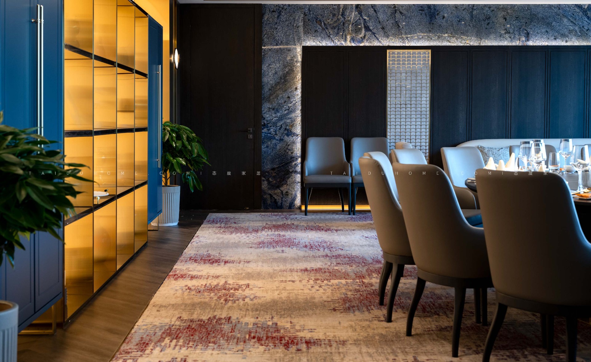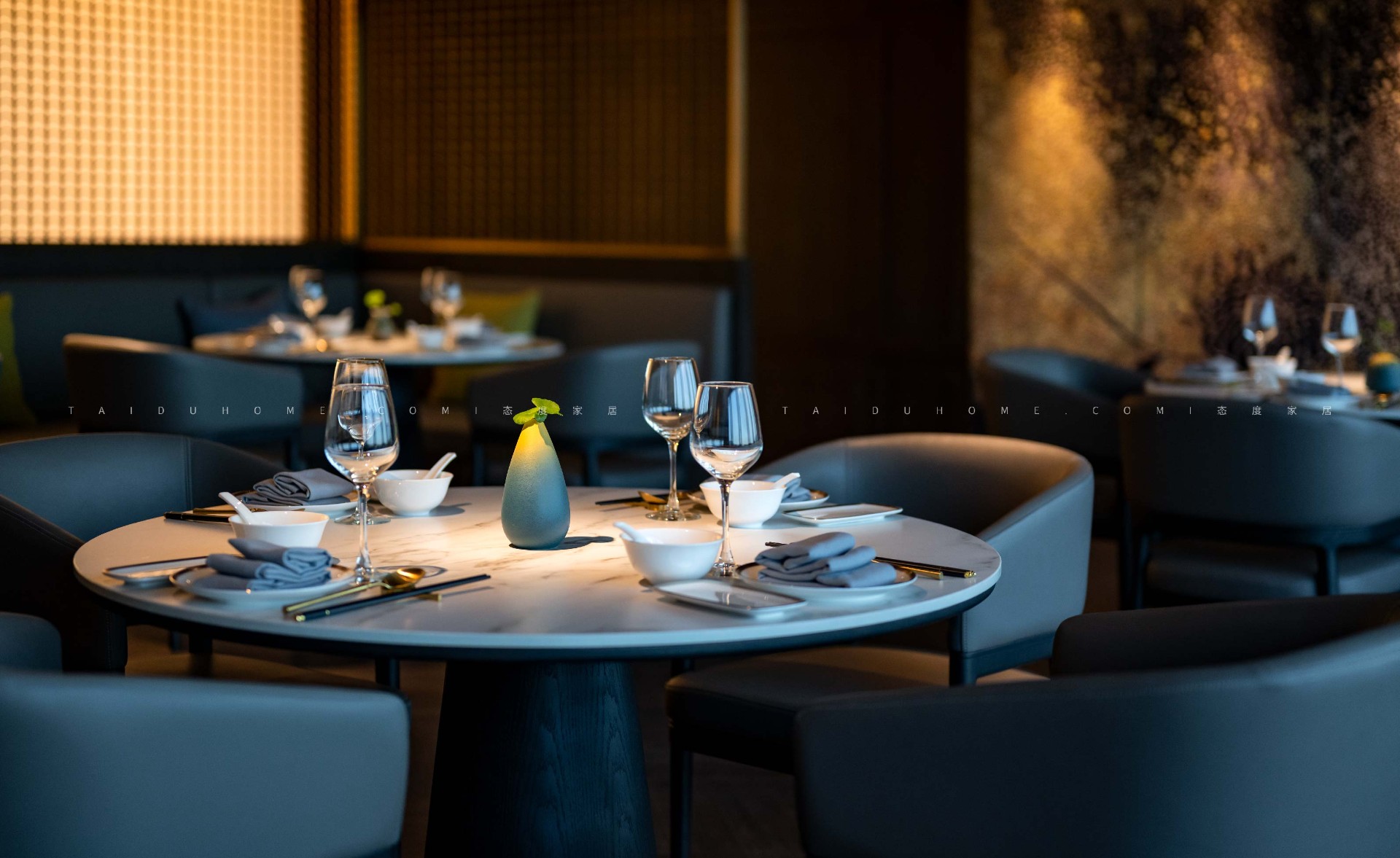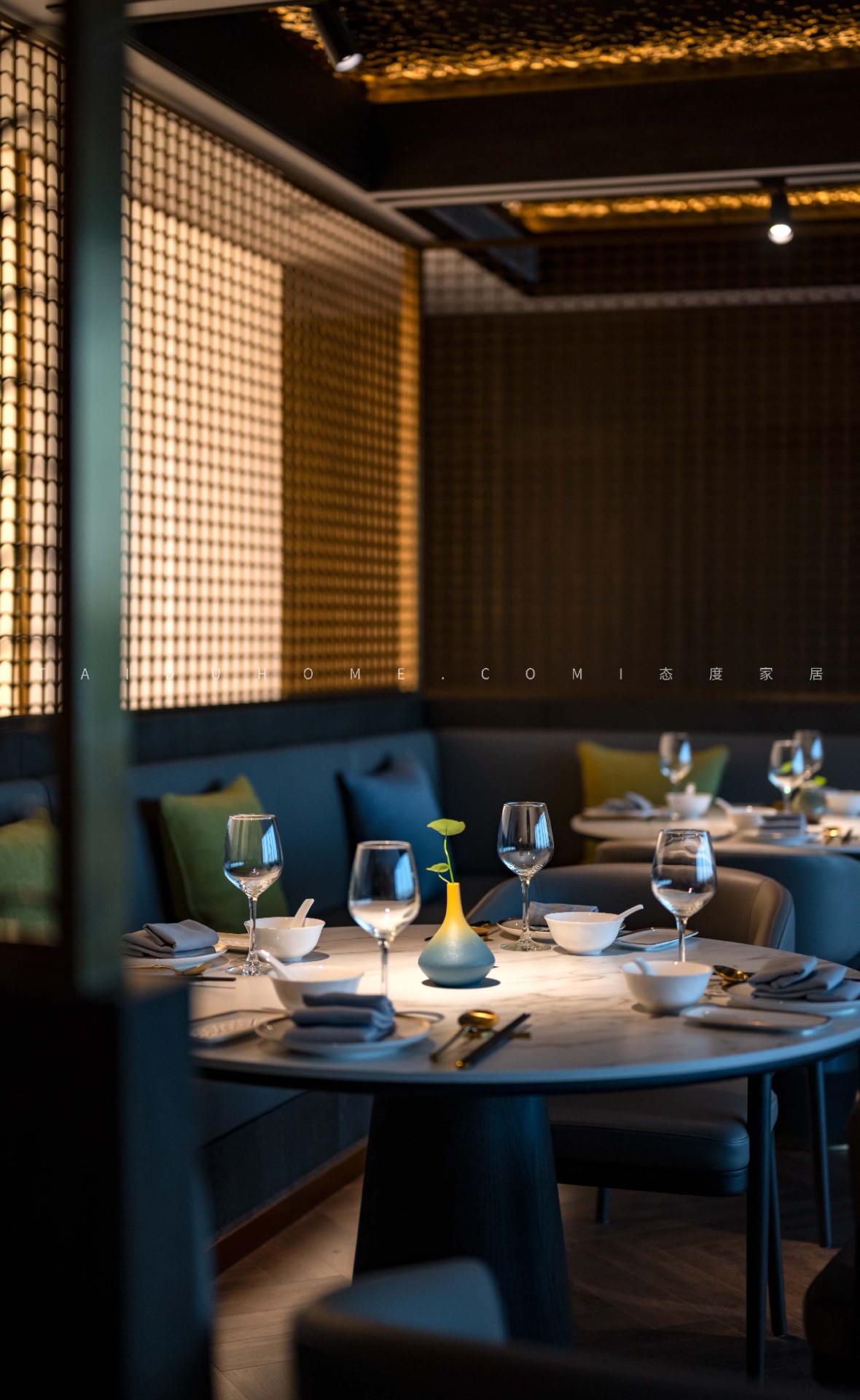 Daiwa blue bricks are transformed into a textured marble surface, extracting elements such as window flowers and grilles from the Chinese style. The hollow lines maintain transparency in the space, and the unique shape and meaning are applied in the design elements, adding fun to the time of enjoying delicious food.