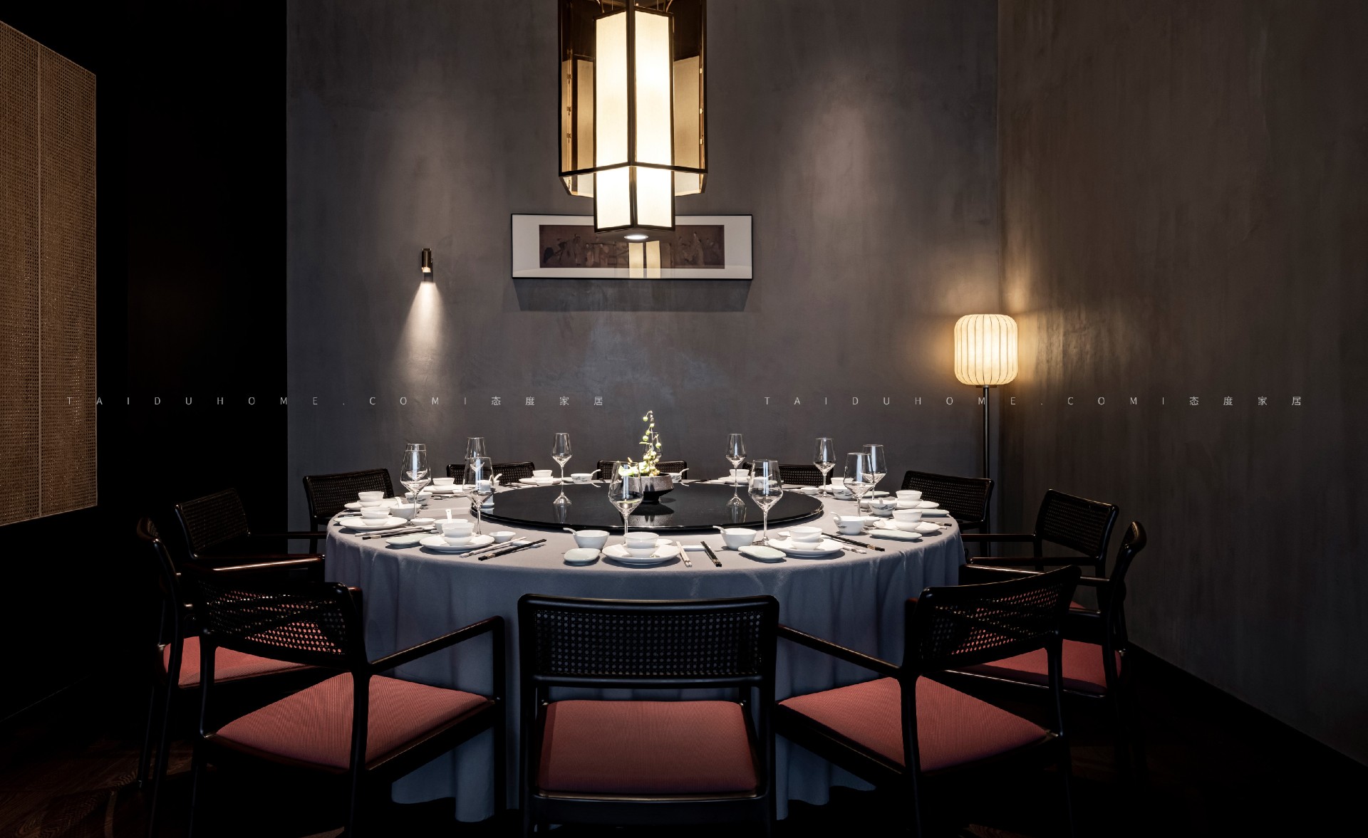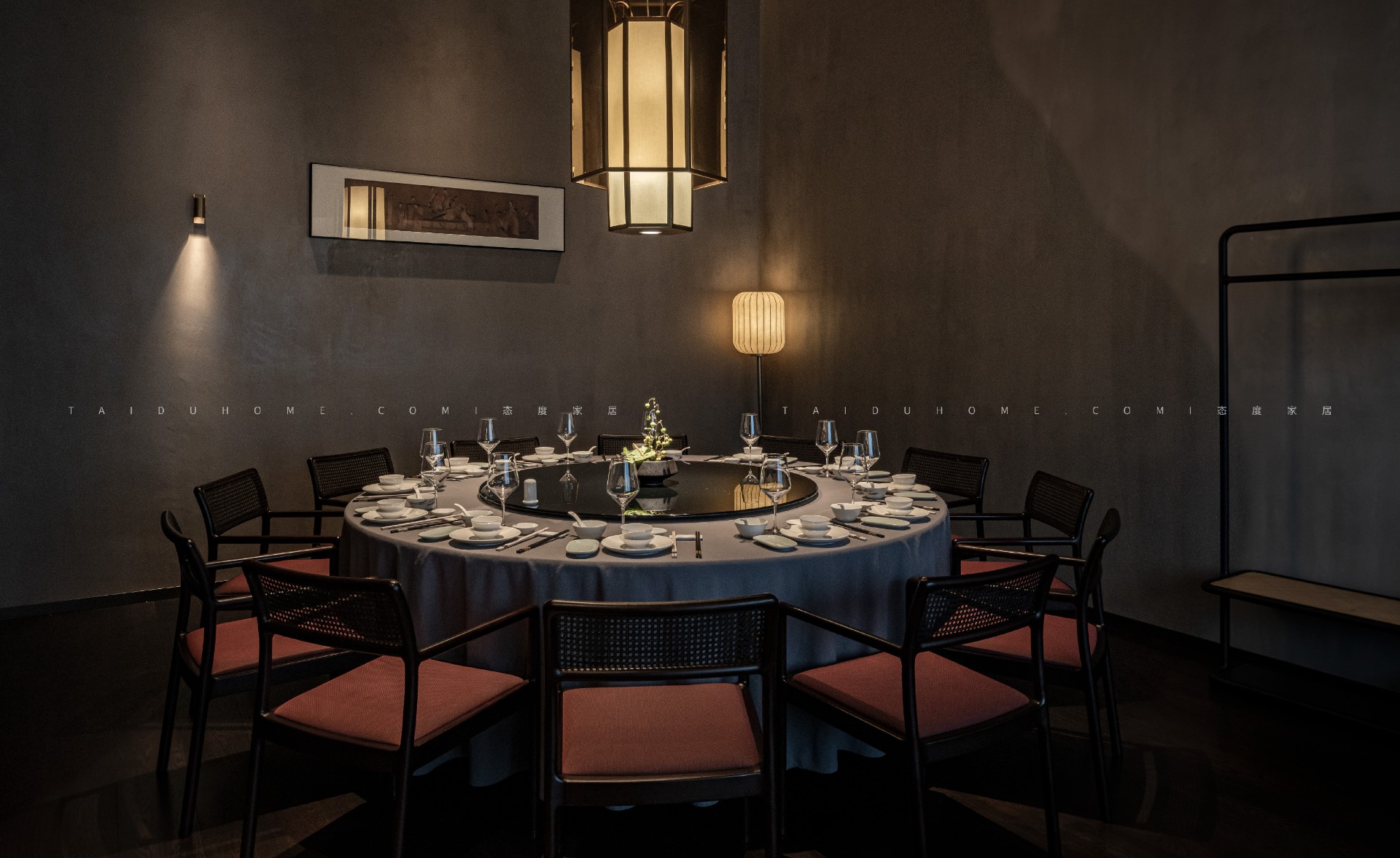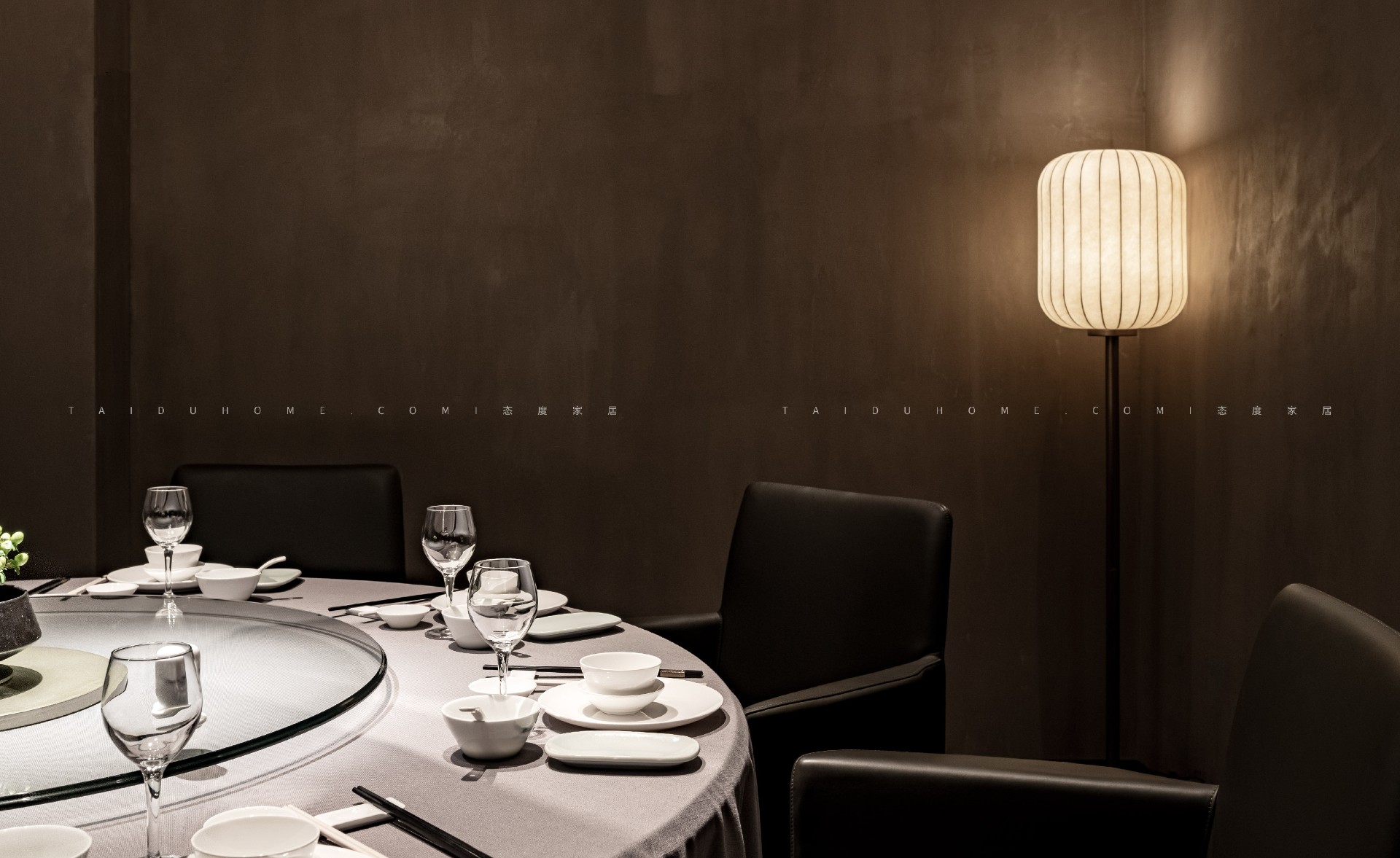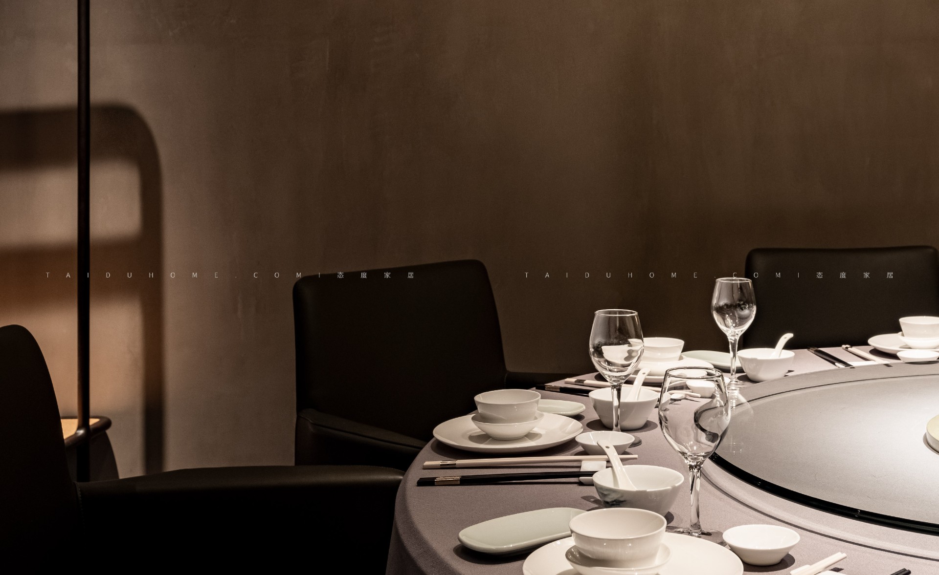 夜幕降临,浮光初现,在这世隐之处,藏一绝味佳境。光与影的融合,尽显侘寂之美。搭配精致而细腻的器物,用谦逊的黯然之美取代单一色调空间的沉闷和乏味。搭配墙面地面的自然肌理,化繁为简,为空间营造一种舒适、自然、简朴的就餐环境。