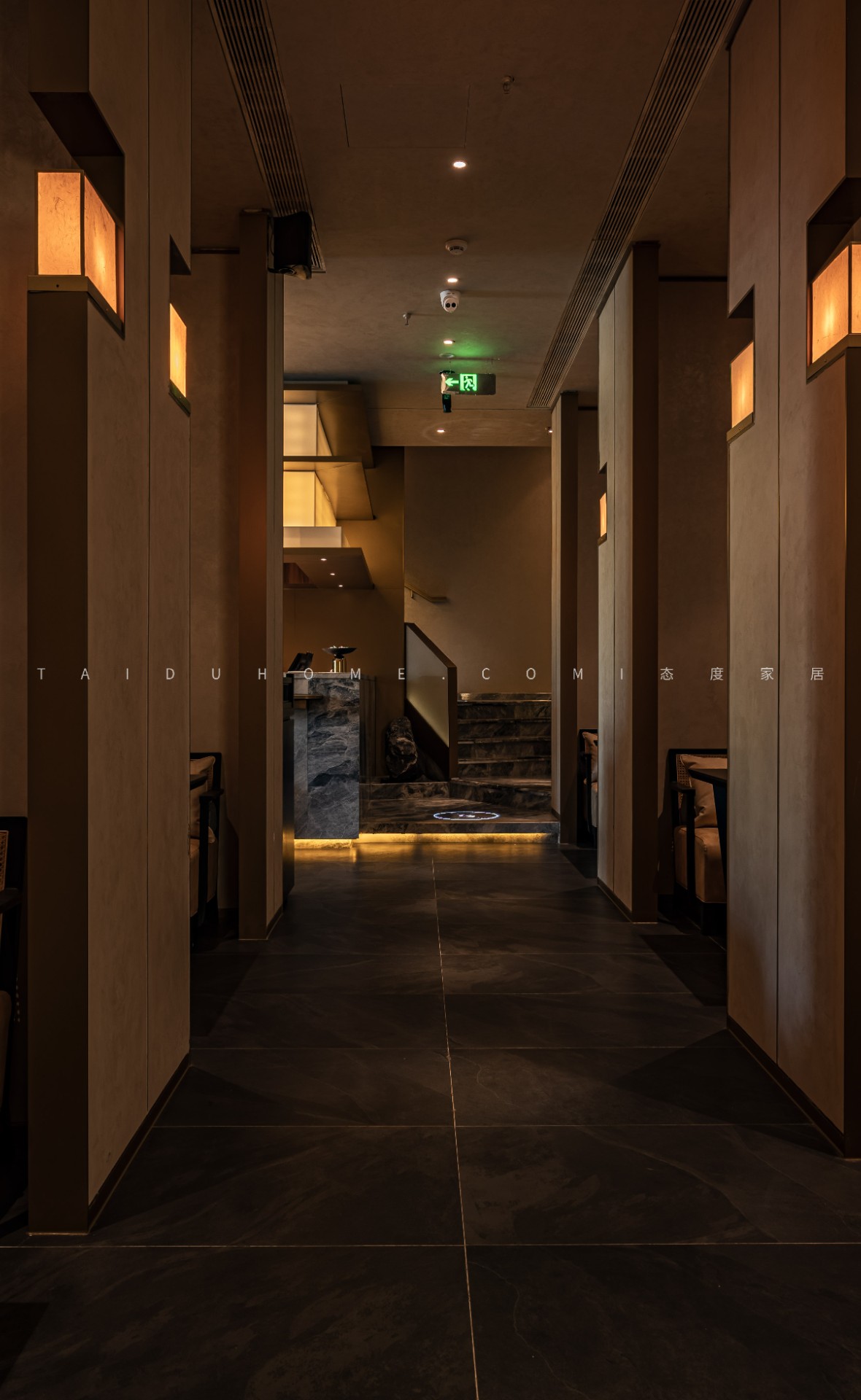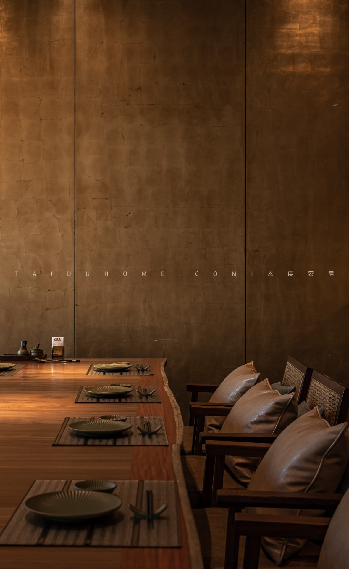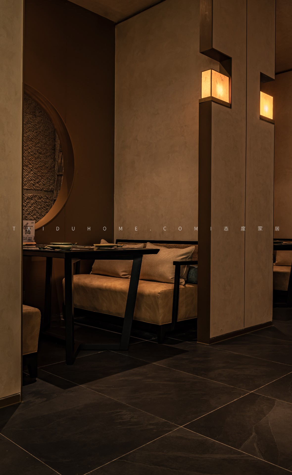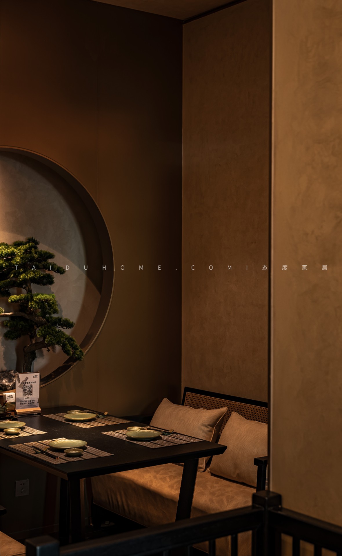 抛舍了像“白灯笼、粗体毛笔字、竹质牌匾”等常见的日式元素。取而代之的是烧痕纹理般的金属,以温暖的色调,暧昧的氛围,复古的烟火气覆盖流于表面的“日式风情”,而以斑驳感和肌理感充实“日式侘寂”。