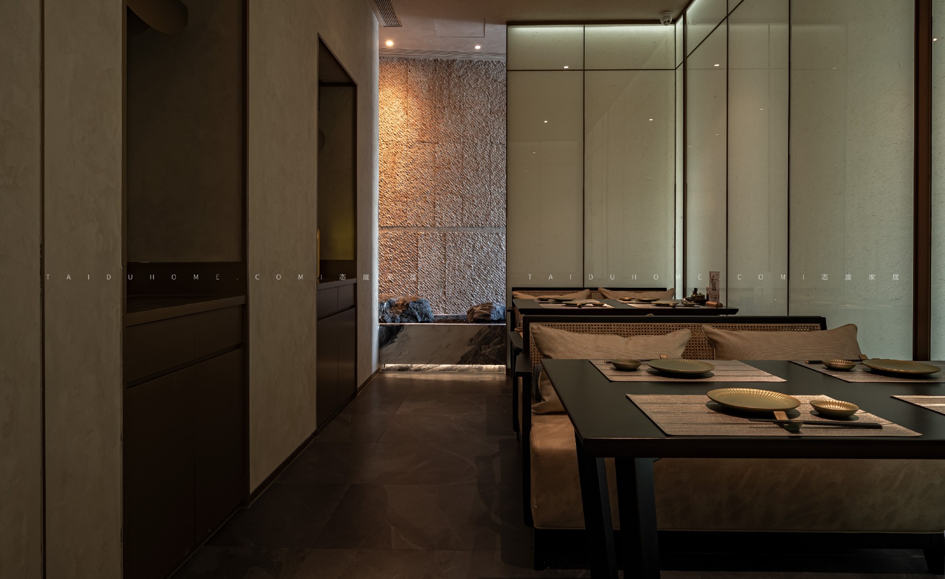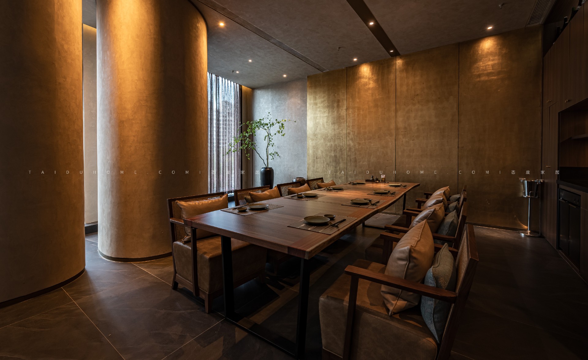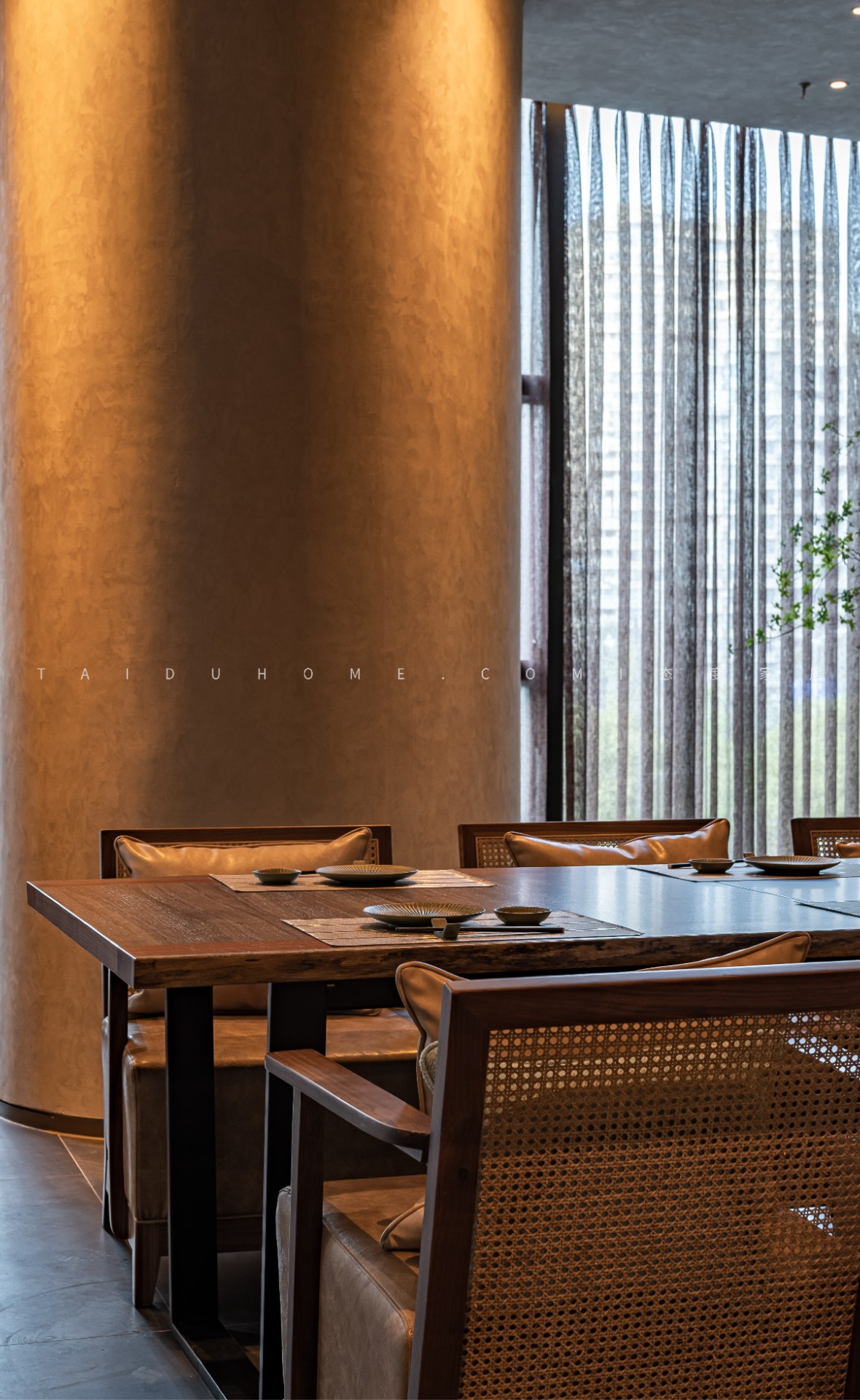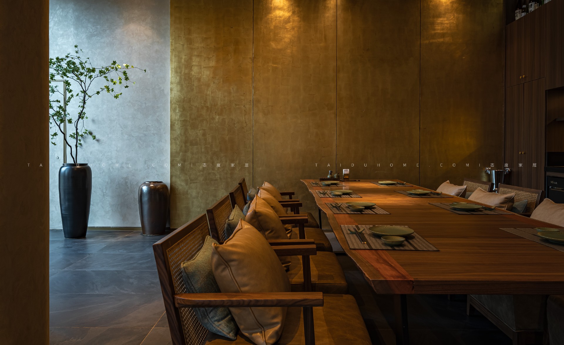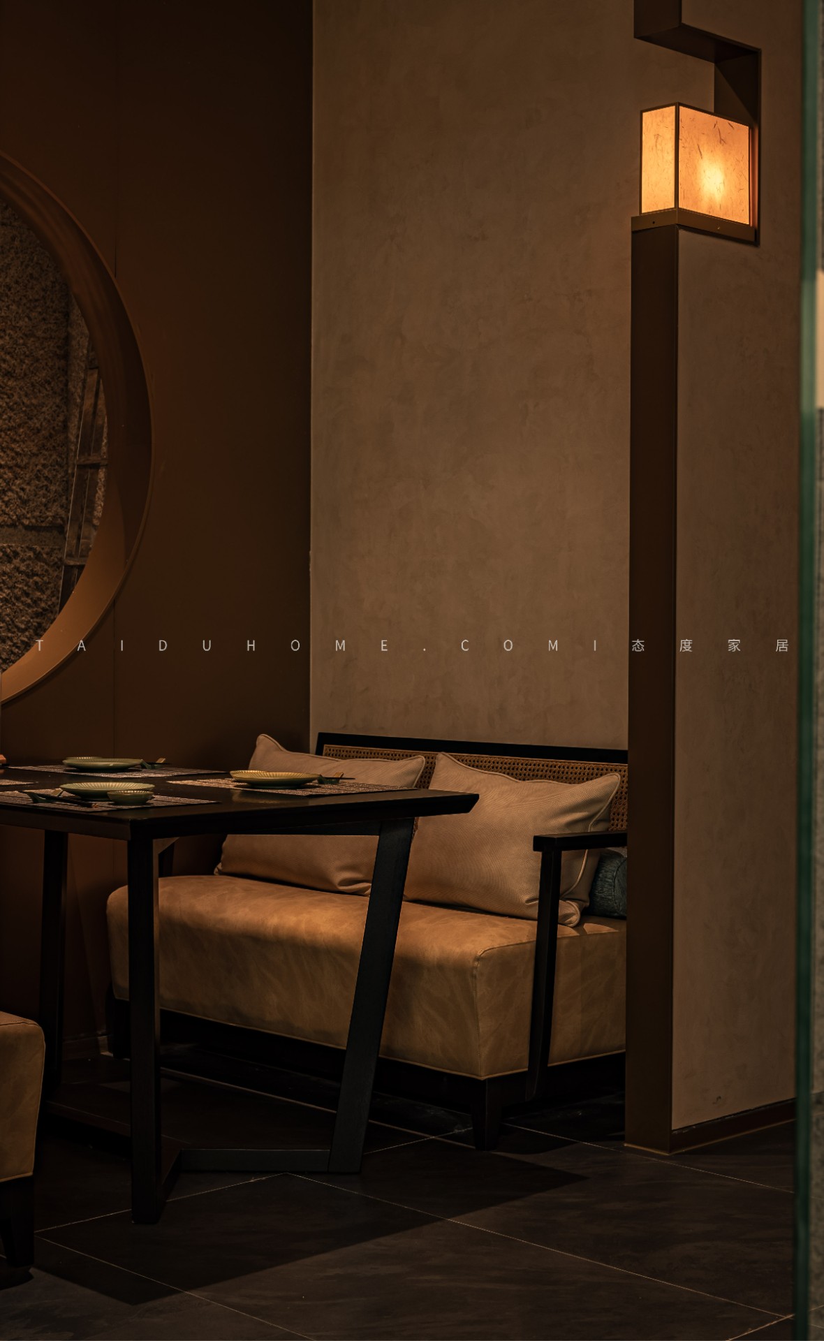 抛舍了像“白灯笼、粗体毛笔字、竹质牌匾”等常见的日式元素。取而代之的是烧痕纹理般的金属,以温暖的色调,暧昧的氛围,复古的烟火气覆盖流于表面的“日式风情”,而以斑驳感和肌理感充实“日式侘寂”。