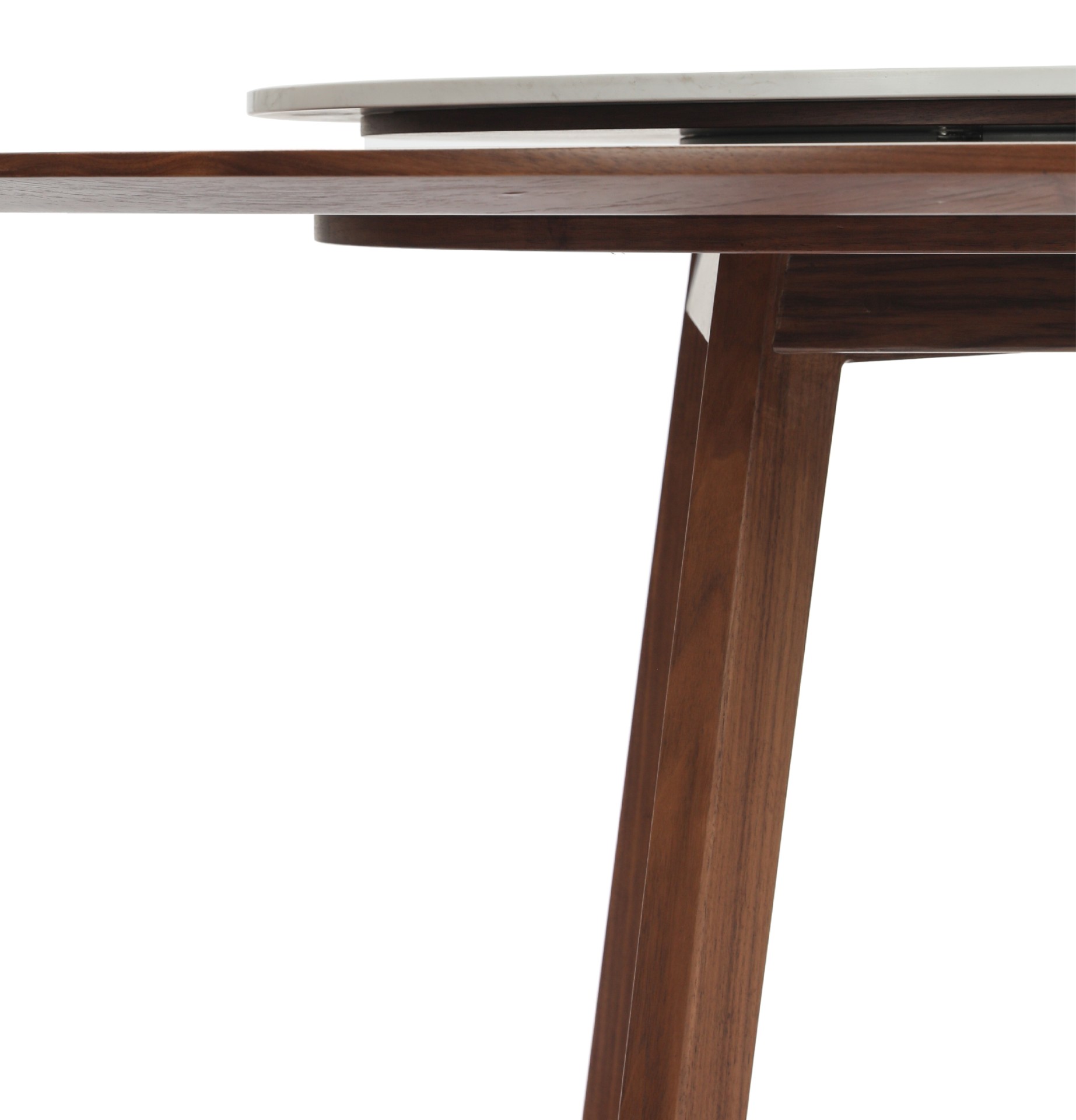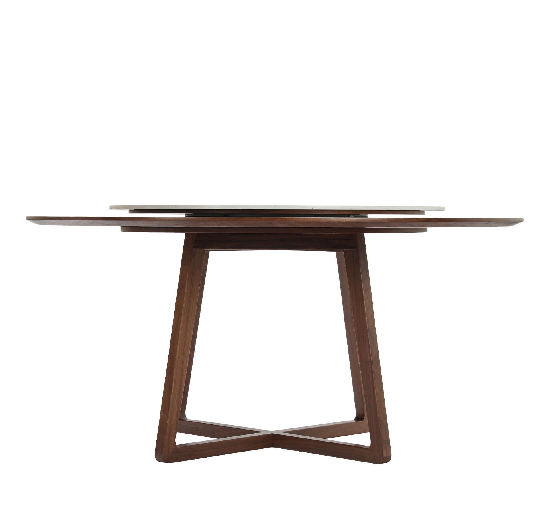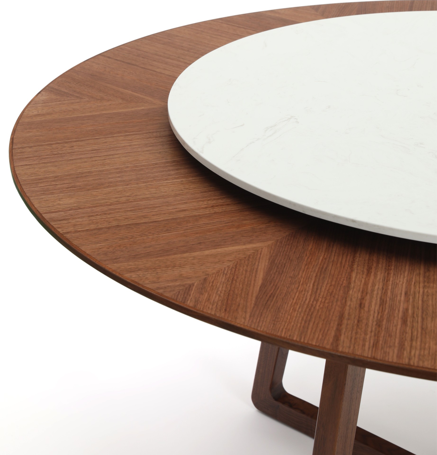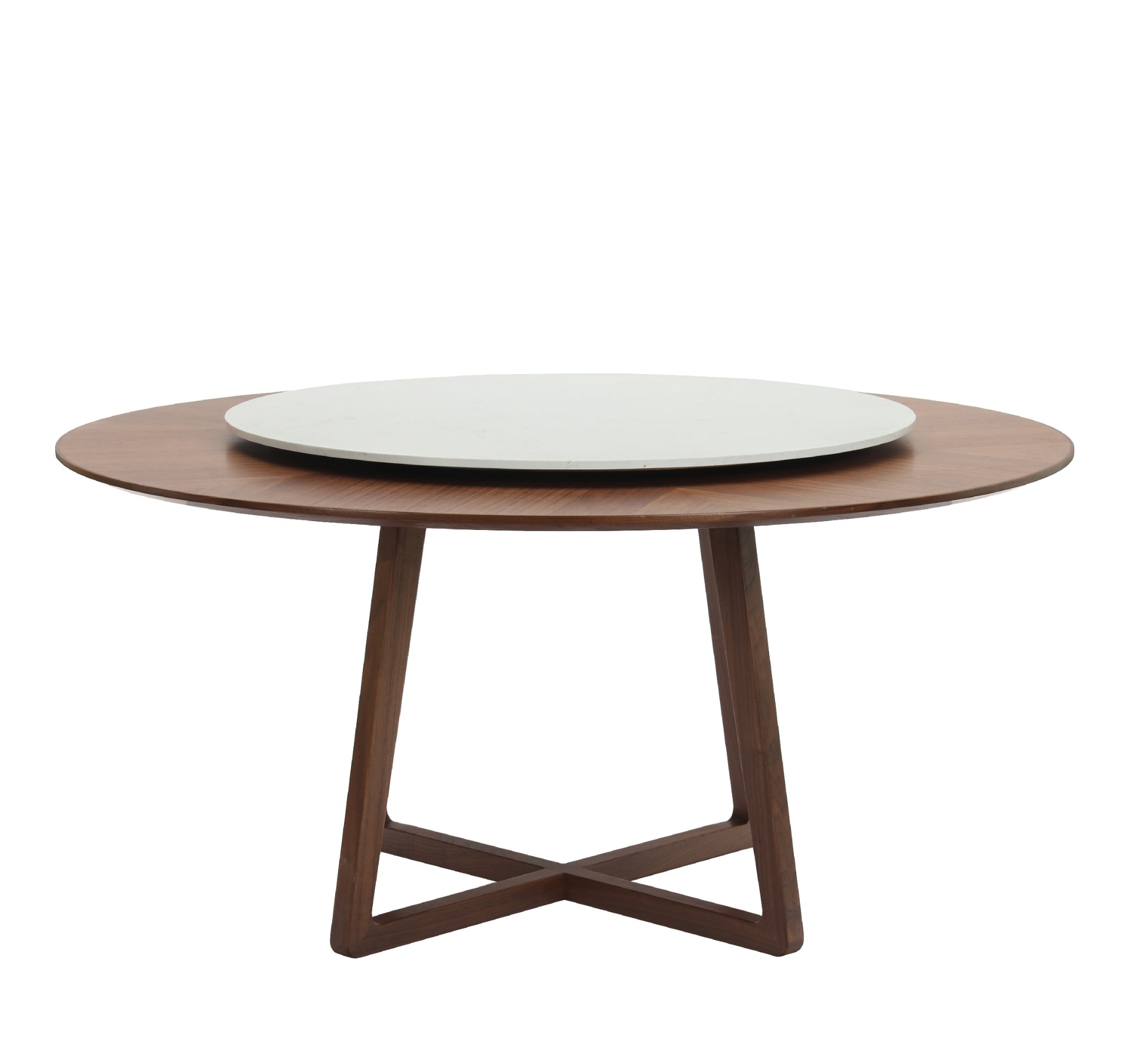 产品介绍 | Product Introduction白色的大理石转盘像一汪池水,映照着天上的一轮圆月,石与木的搭配,清爽简洁、富有诗意。黑胡桃木细腻的打磨,给家里增添自然气息,圆桌添加转盘,方便就餐取用,桌腿交叉支撑,既稳固又美观。The white marble turntable is like a pool of water, reflecting a round moon in the sky. The combination of stone and wood is refreshing, simple, and poetic. The delicate polishing of black walnut wood adds a natural atmosphere to the home, and the round table is equipped with a turntable for convenient dining access. The legs of the table are cross supported, which is both stable and beautiful.
