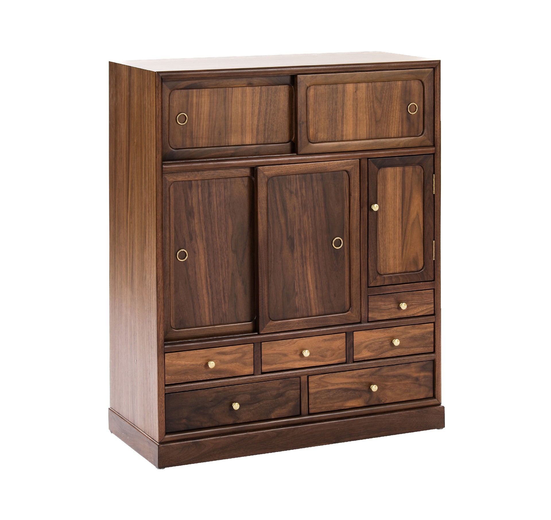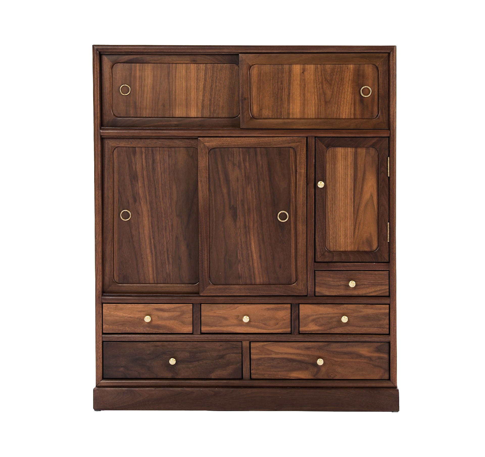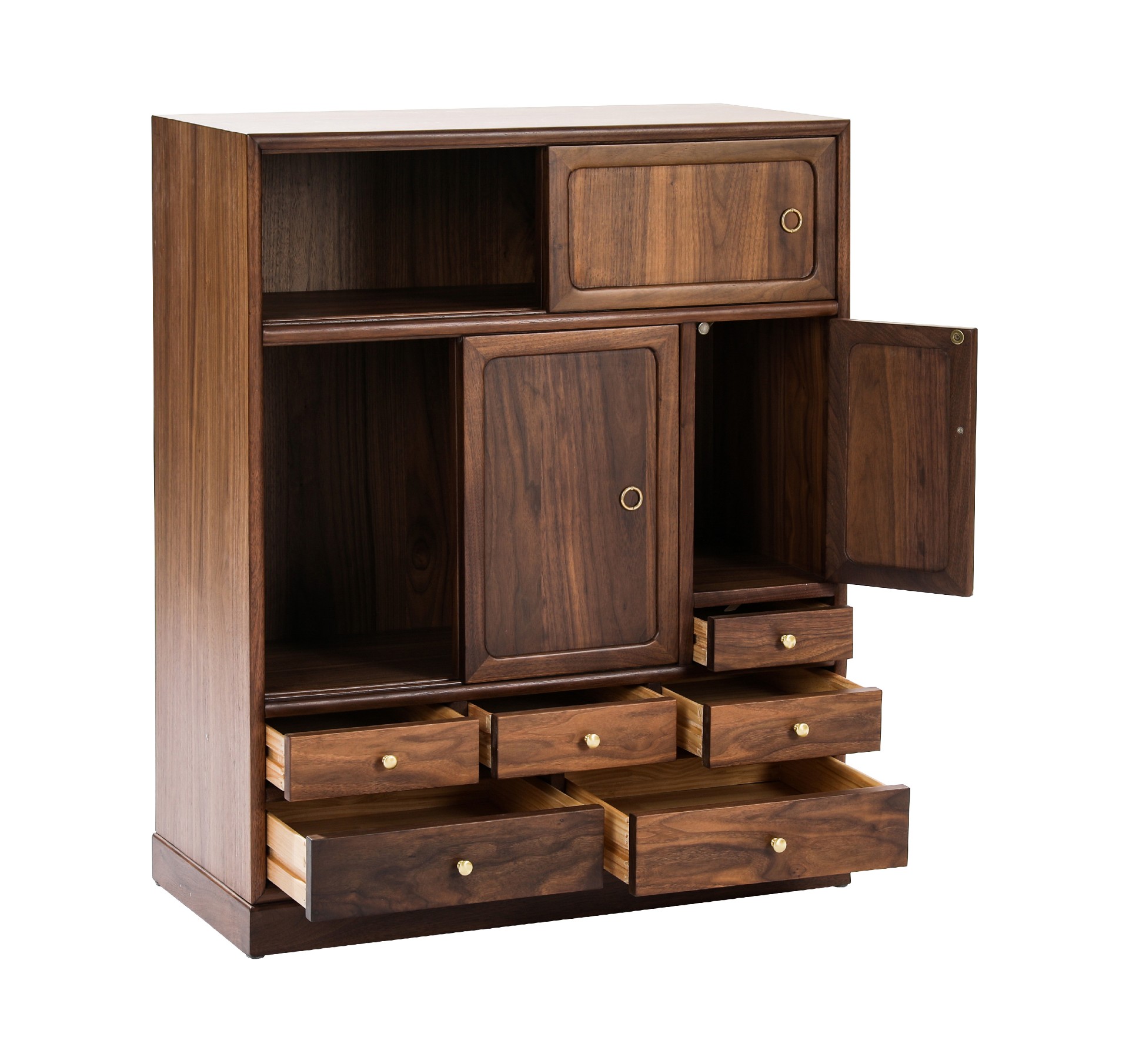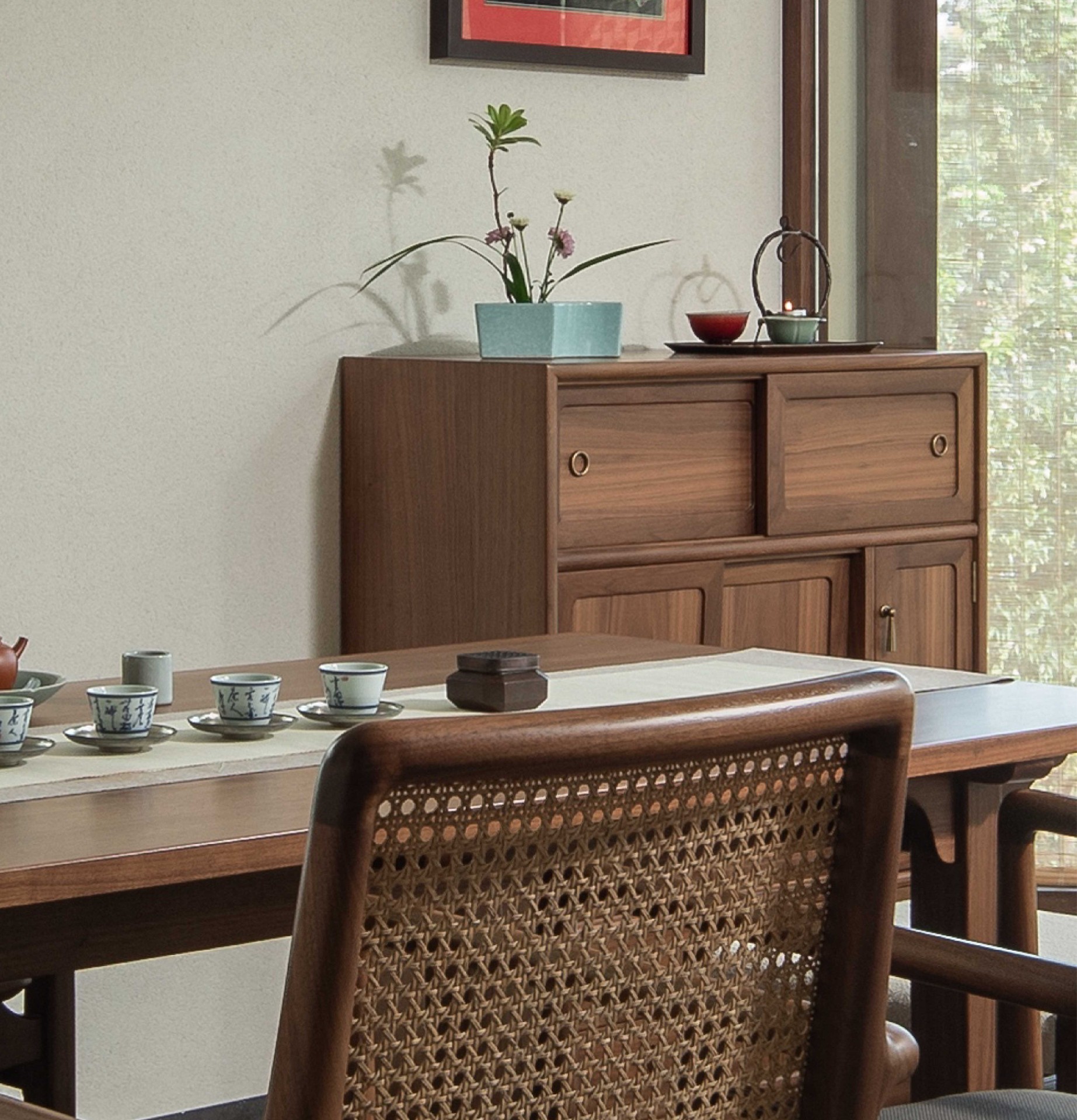 产品介绍 | Product Introduction光影斑驳,博古通今。通体北美黑胡桃打造的暗格茶柜,尺寸小巧,可以放置榻上或茶桌边收纳茶壶、茗碗、茶叶之类的茶道具。柜顶为平壤,方便放置盆栽之类的小景,柜格门板整木对剖而成,花纹对称、近乎孪生,可见用料之奢、选料之严。Light and shadow are mottled, covering the past and present. The concealed tea cabinet made of North American black walnut is compact in size and can be placed on a couch or at a tea table to store tea utensils such as teapots, tea bowls, and tea leaves. The top of the cabinet is made of Pyongyang, and the cabinet grid door panels are made of solid wood with symmetrical patterns.