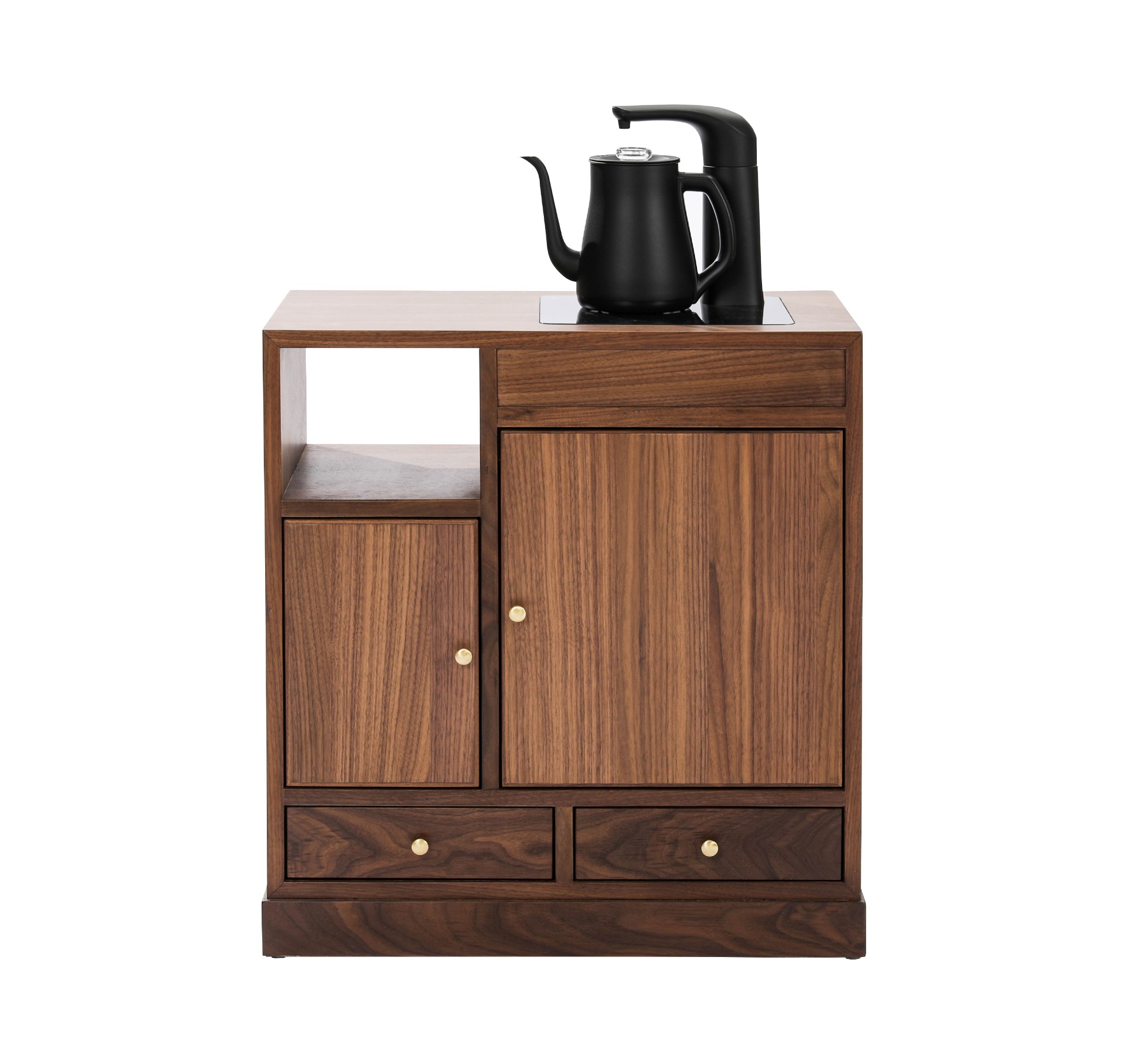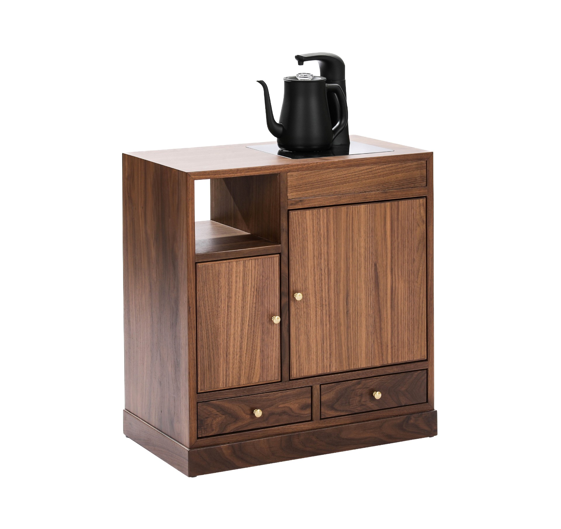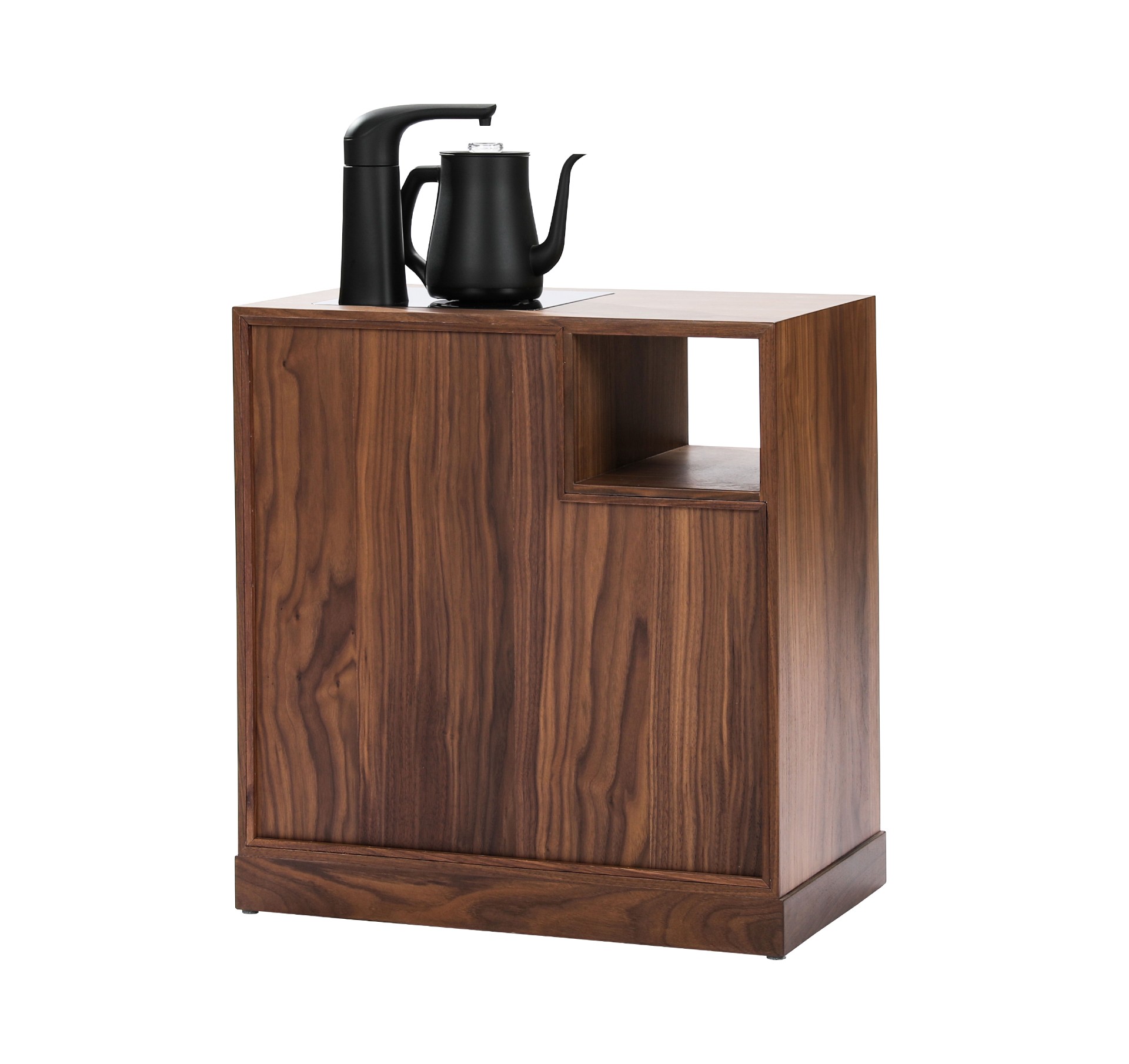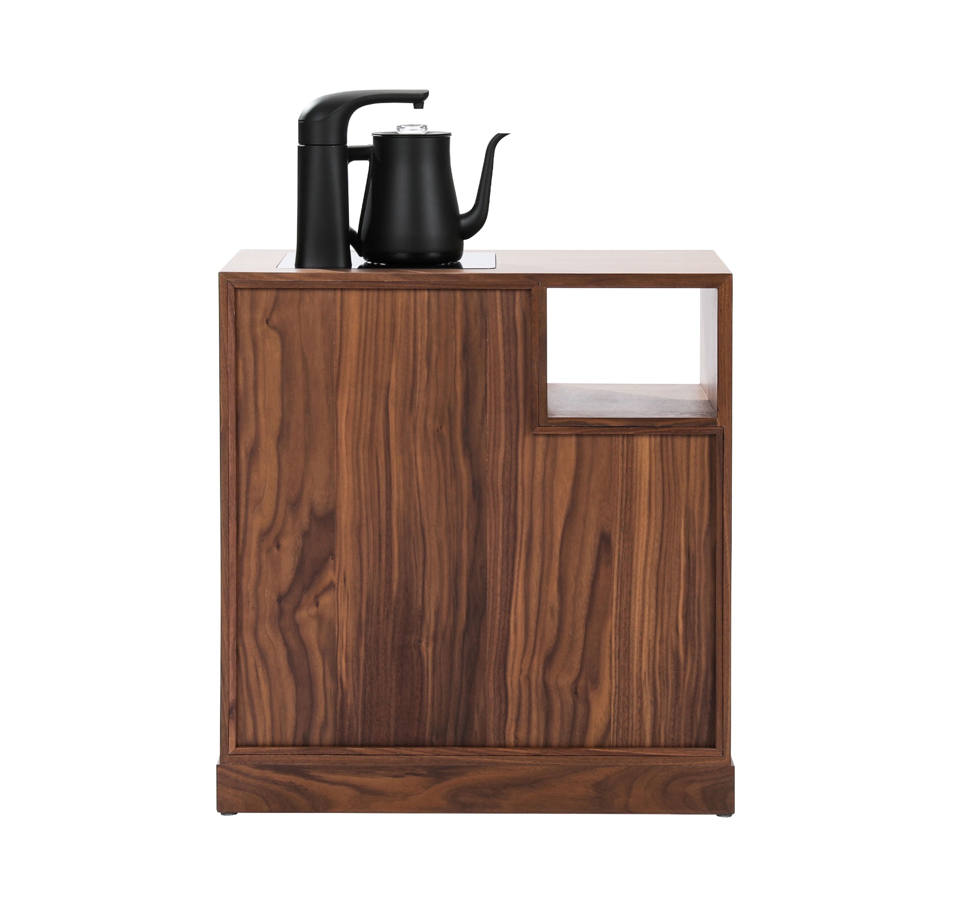 产品介绍 | Product Introduction光影斑驳,古今融合。选用北美黑胡桃,通过两种工艺展现光影变化。古朴茶柜设计与现代电煮水功能相结合,方便快捷。明格可收纳常用茶器,暗格可藏茶叶防潮防灰,右侧大柜门隐藏水桶,既美观又便捷。底部小抽屉增加额外收纳,打造整洁雅致的饮茶空间。Blending two crafting techniques to showcase the play of light and shadow, the traditional tea cabinet design integrates modern electric kettle functionality for added convenience. Open compartments store tea utensils, while hidden drawers protect tea leaves from moisture. A large cabinet door on the right cleverly conceals the water container, and small drawers at the bottom offer additional storage, creating a tidy and elegant tea-drinking space.