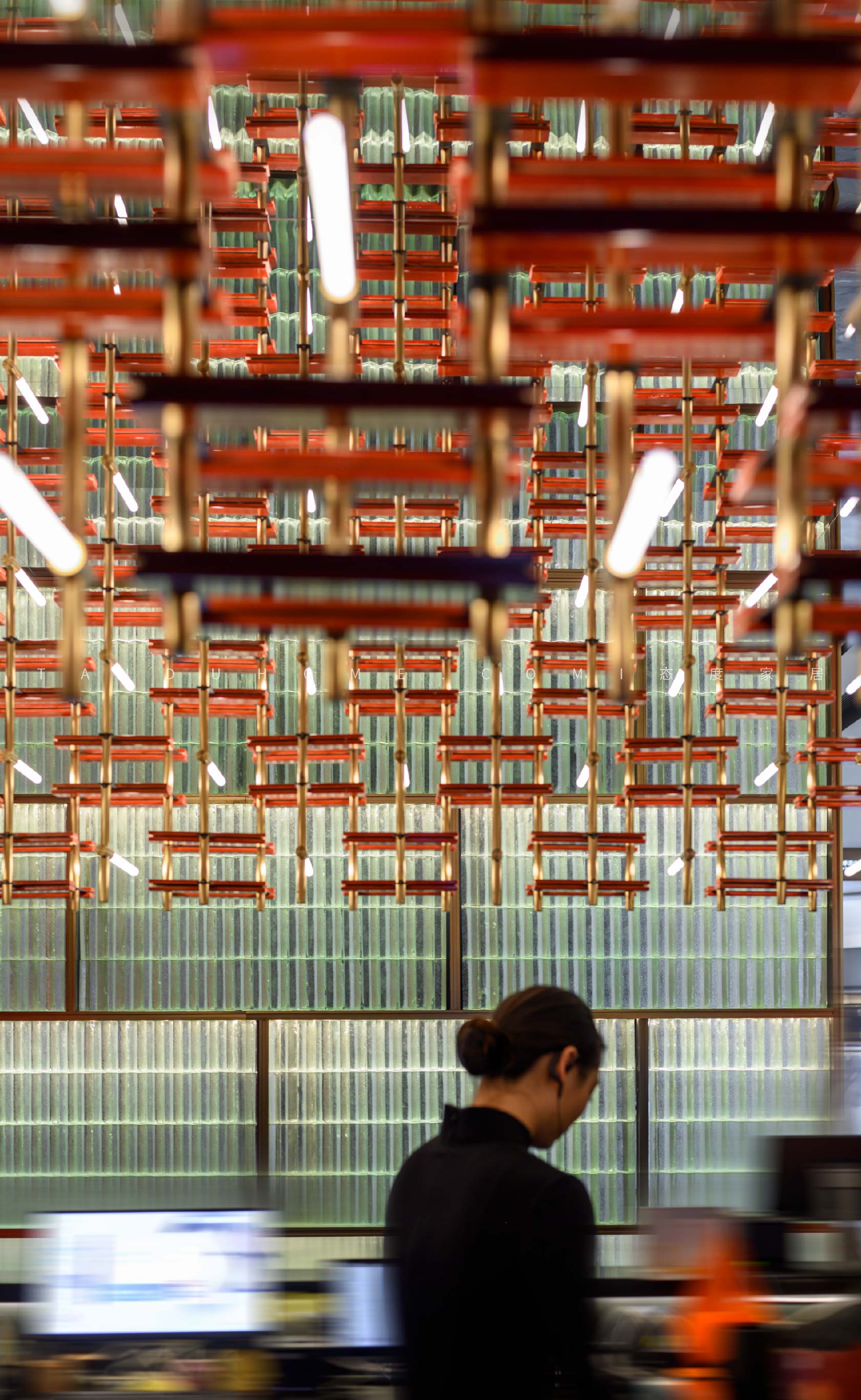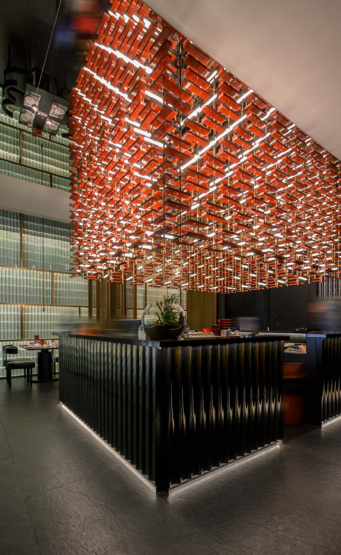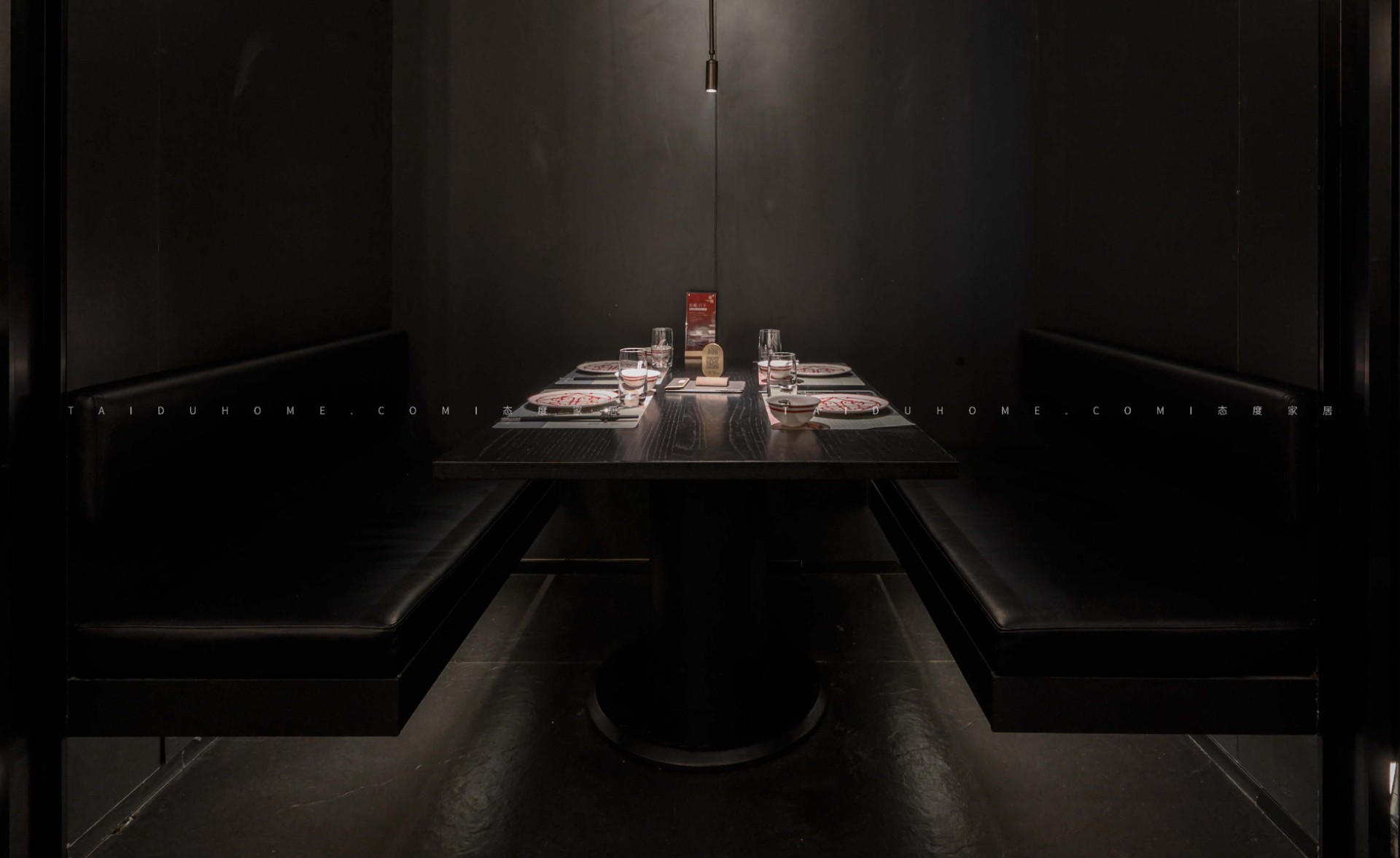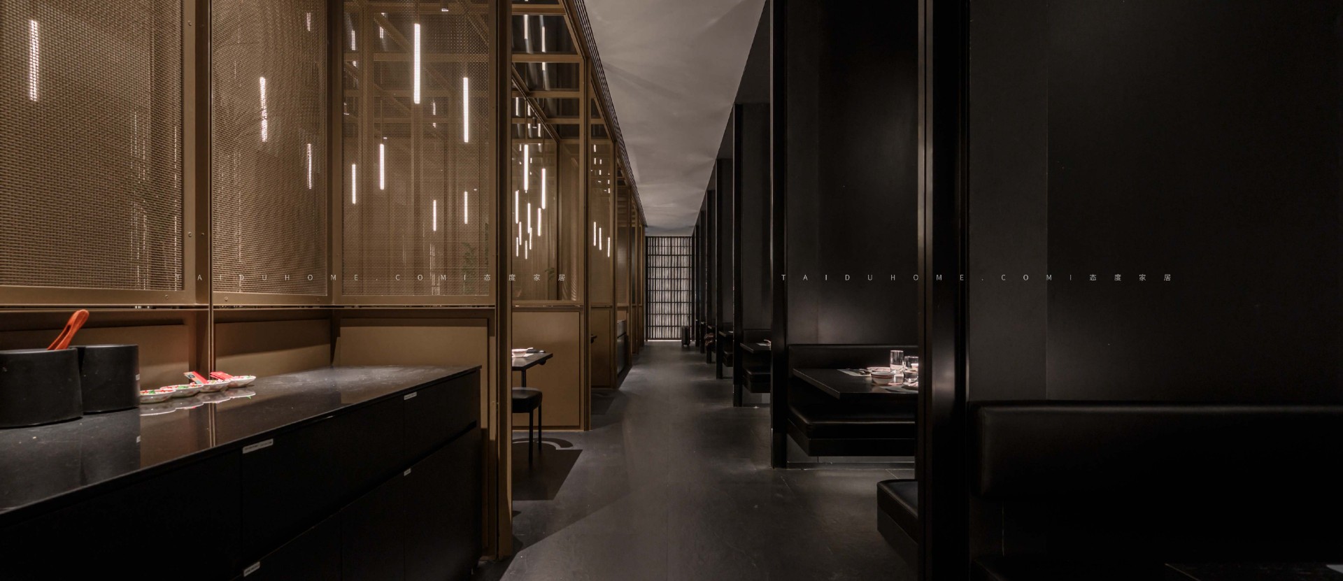 半开放的餐位以金属材质屏风分割成了不同的就餐隔间,来满足无论是商务会餐还是家庭团聚等不同食客的需求,灯光设计成较昏暗神秘的色彩,好似流星悬于堂间。