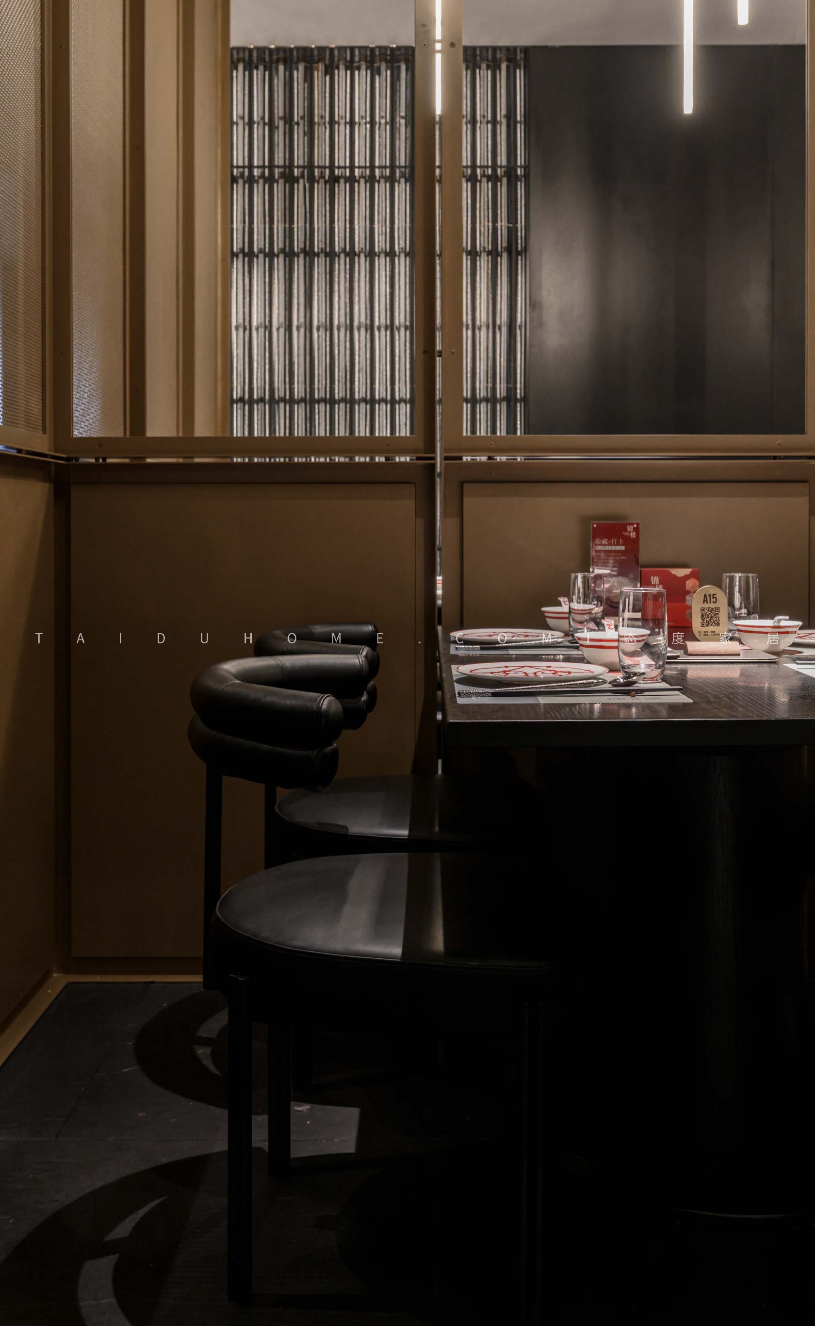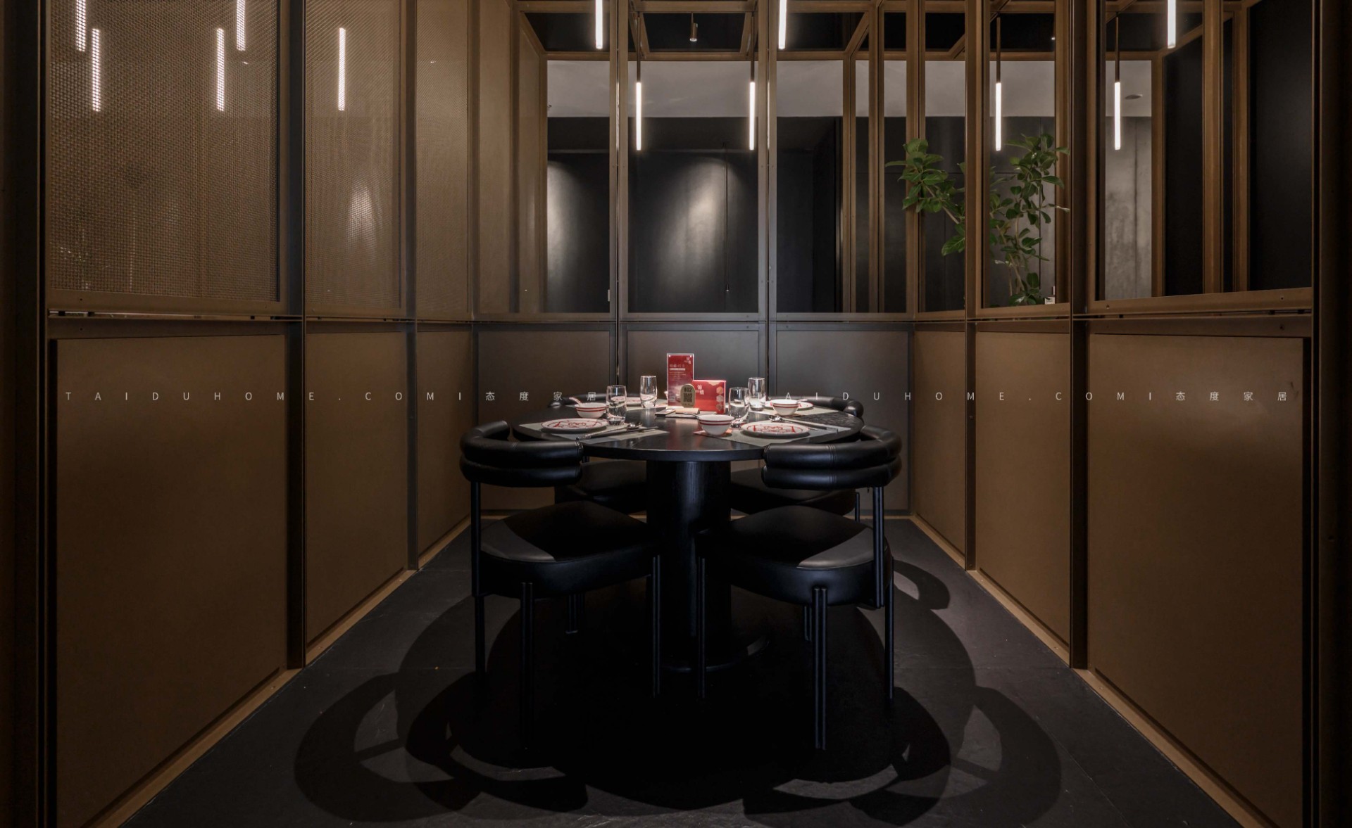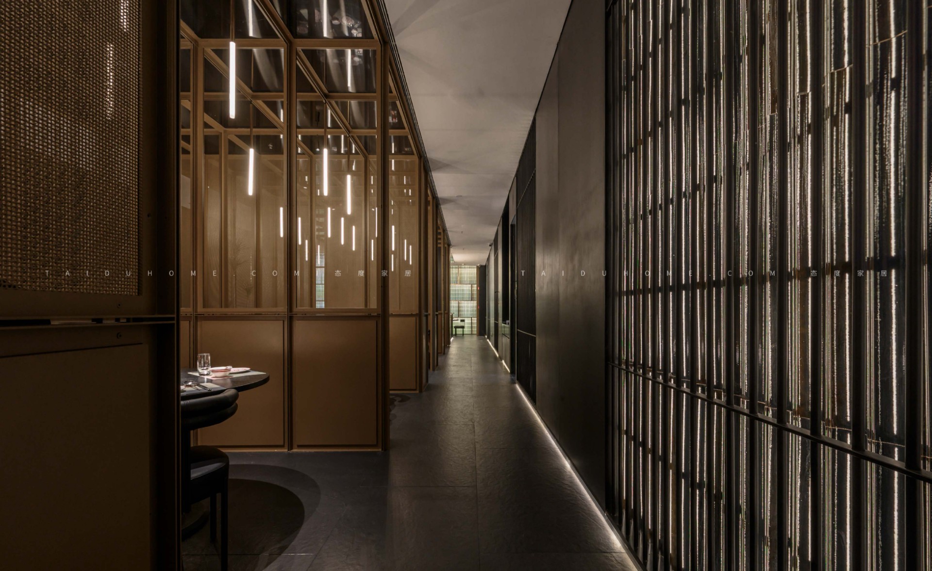 The semi open dining area is divided into different dining compartments with metal screens to meet the needs of different diners, whether it's business dinners or family reunions. The lighting is designed in a dim and mysterious color, like a shooting star hanging in the lobby.