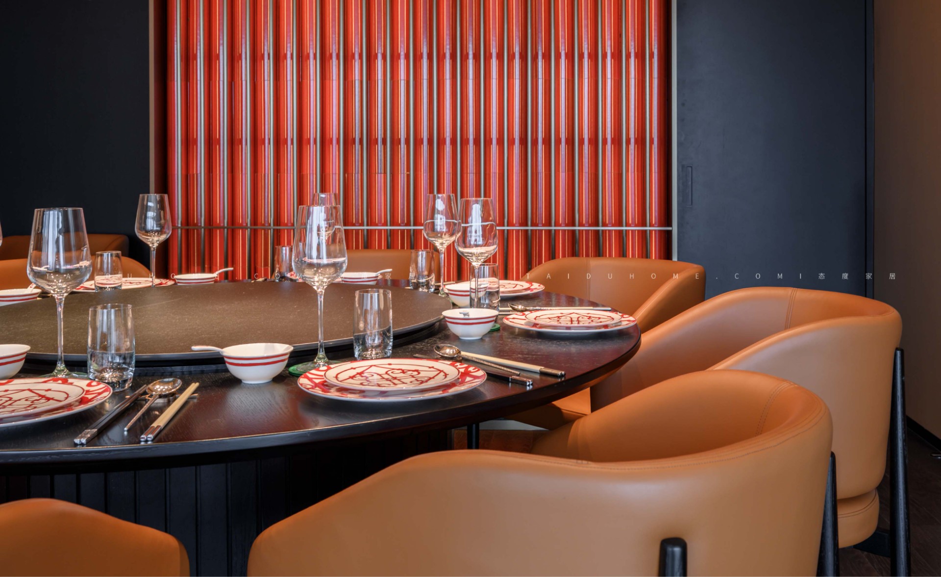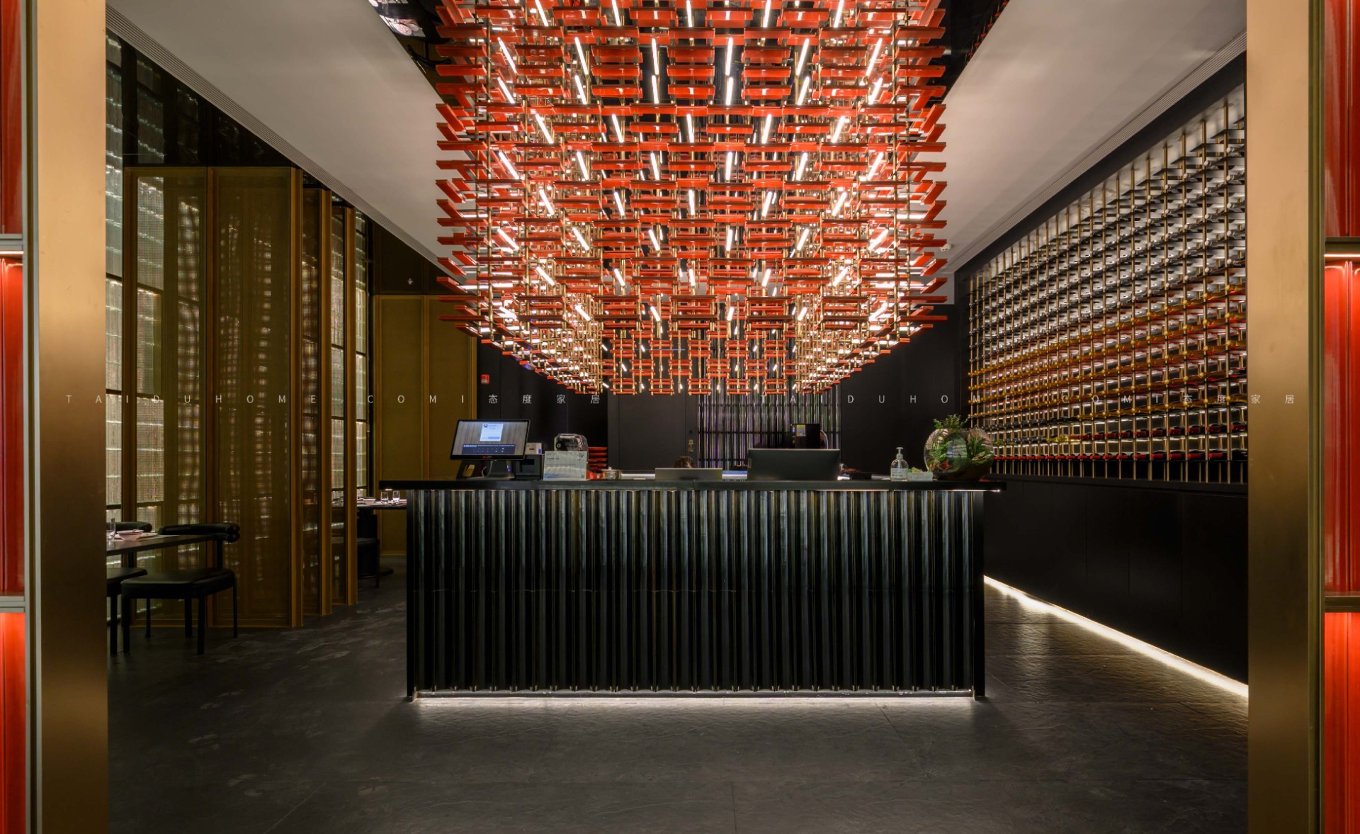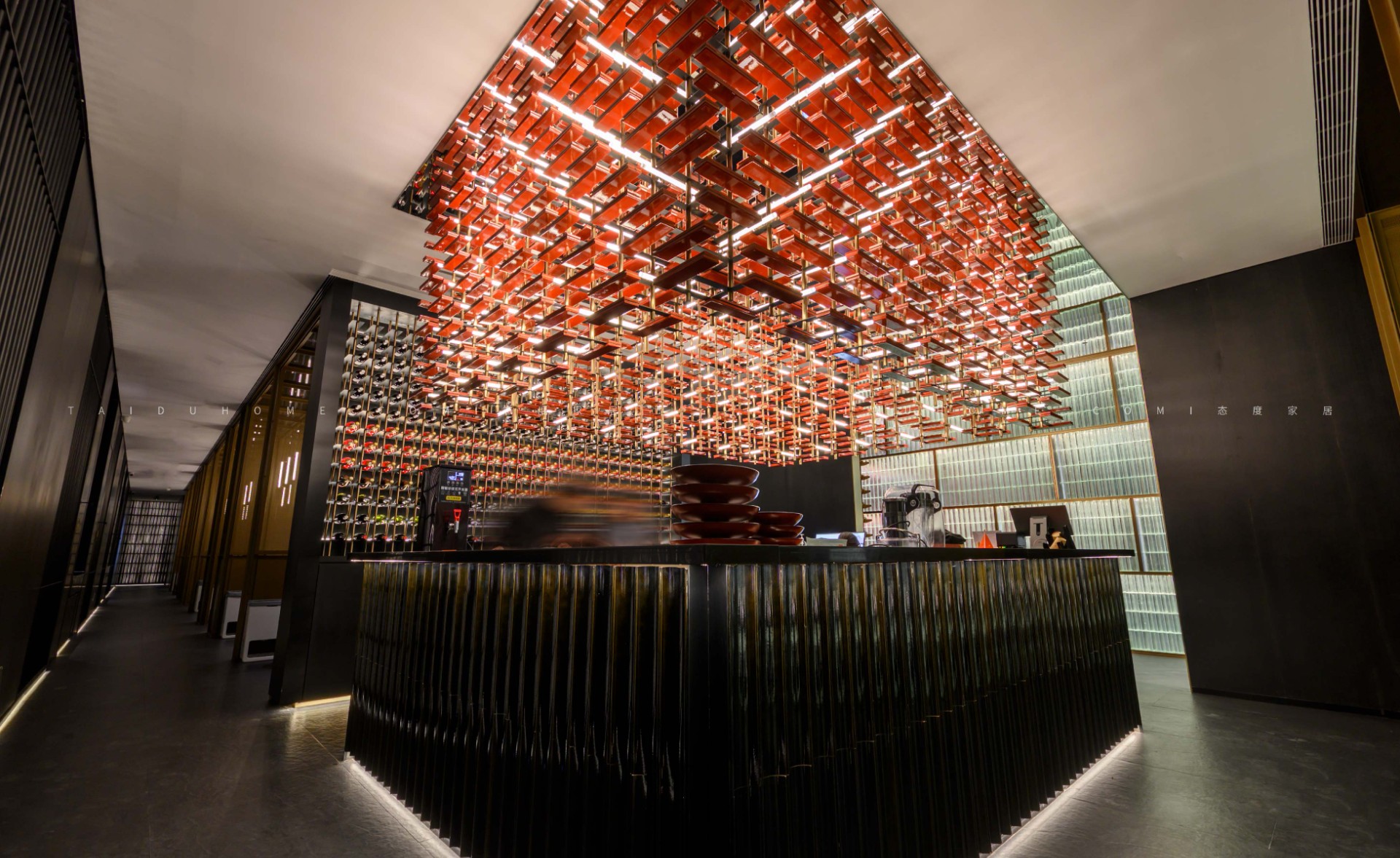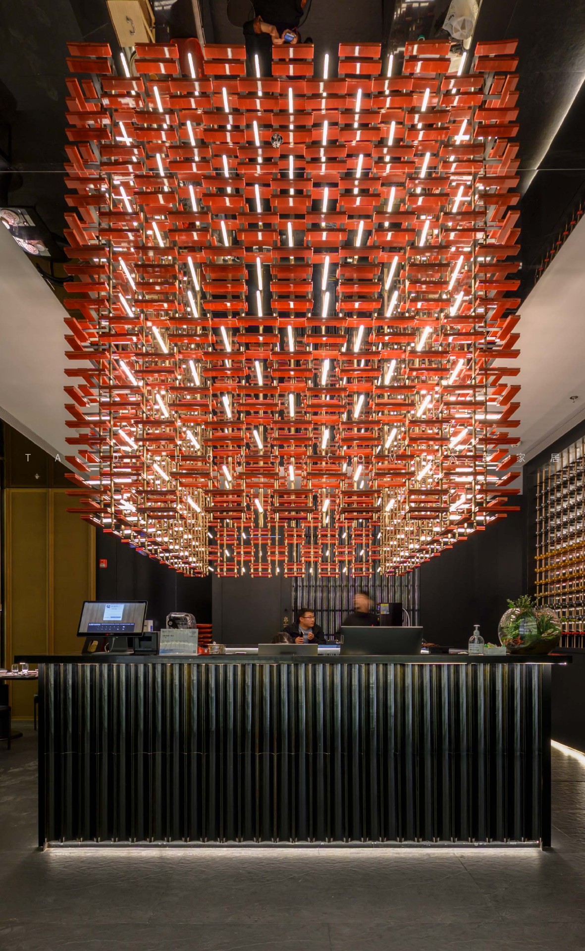 The semi open dining area is divided into different dining compartments with metal screens to meet the needs of different diners, whether it's business dinners or family reunions. The lighting is designed in a dim and mysterious color, like a shooting star hanging in the lobby.