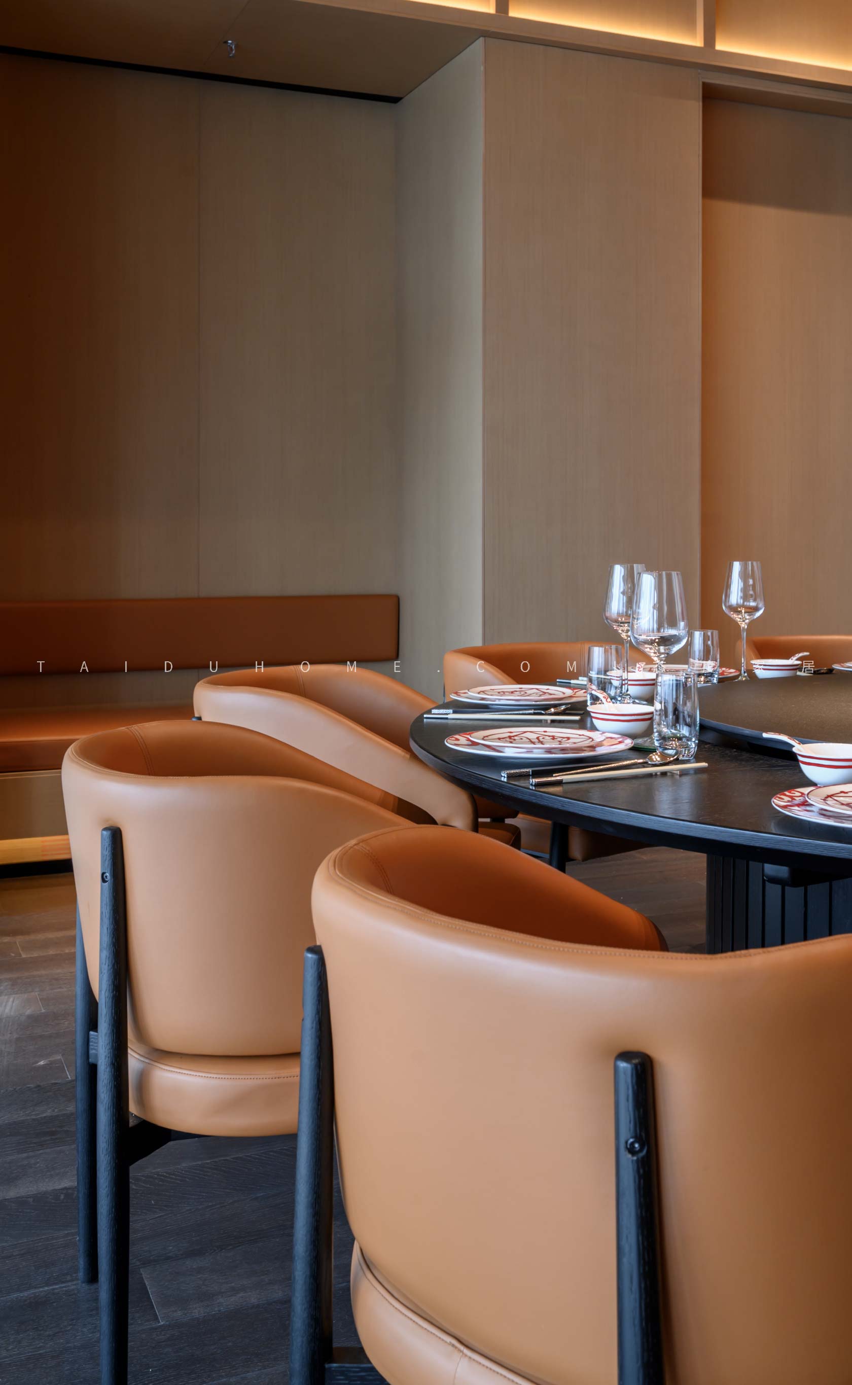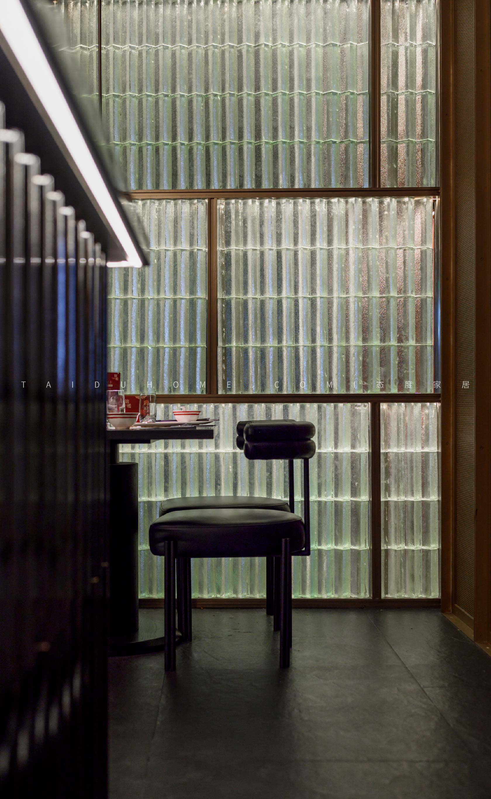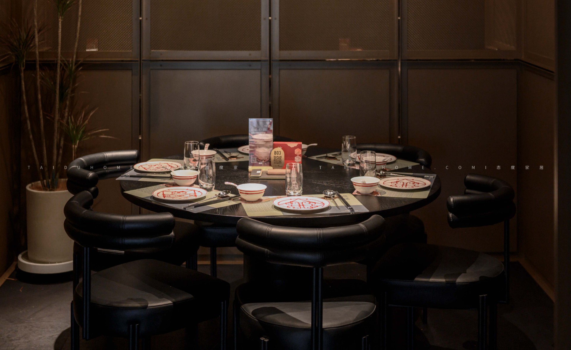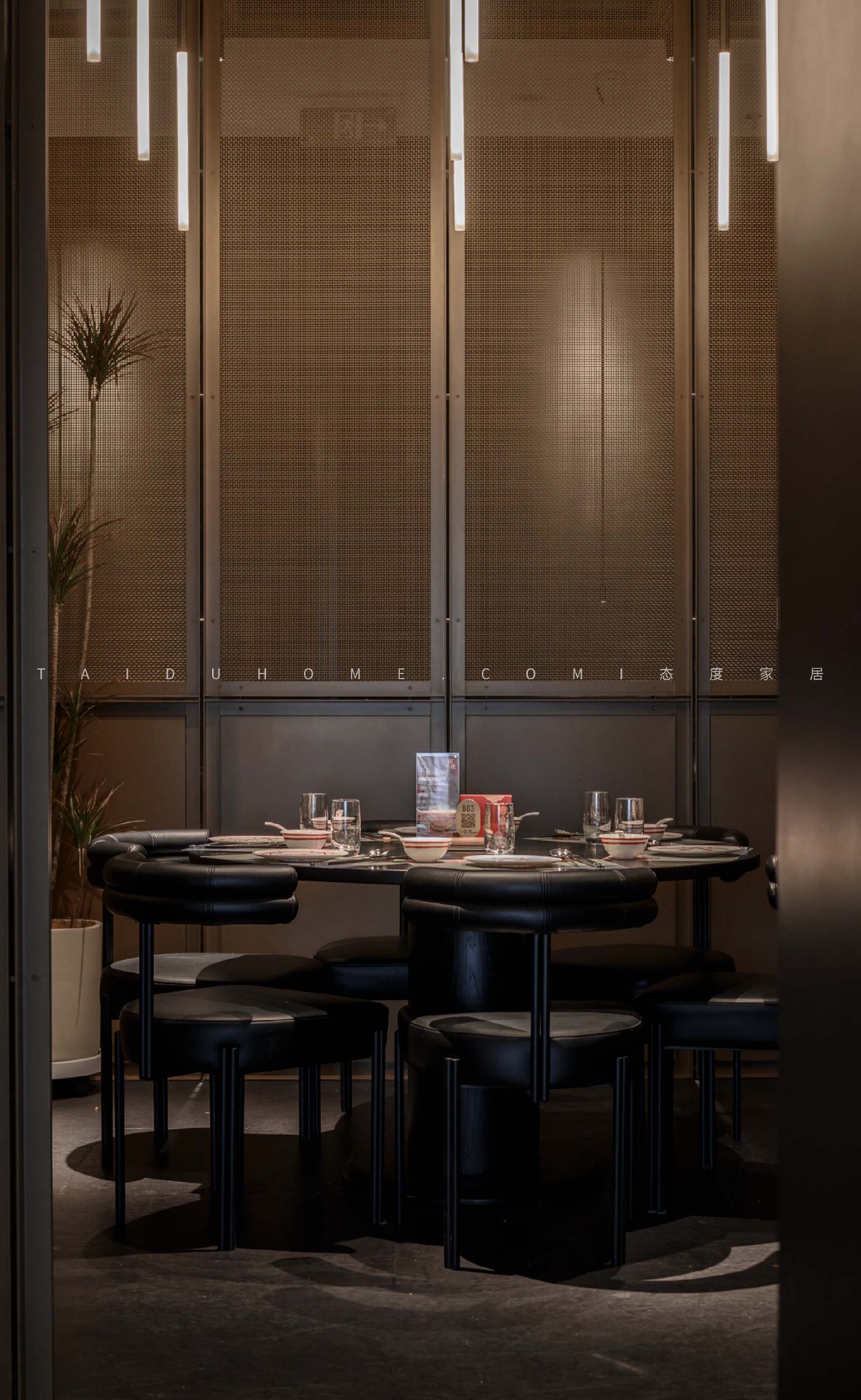 The combination of black and gray cement tiles with glass walls creates a cooler dining atmosphere. The dining chairs in the lobby are black leather arched chairs with a semi enclosed design, allowing diners to have a more comfortable experience during meals.