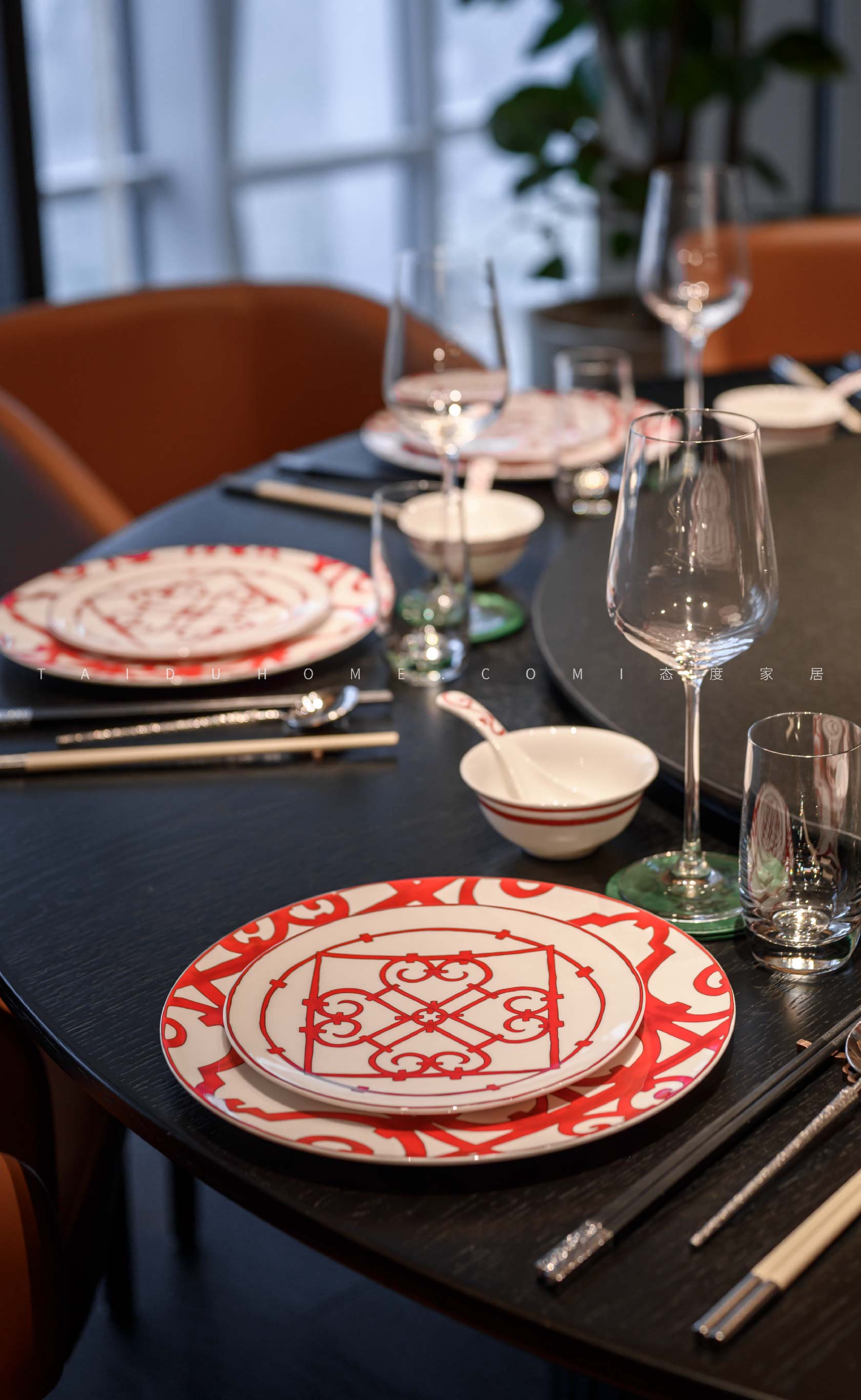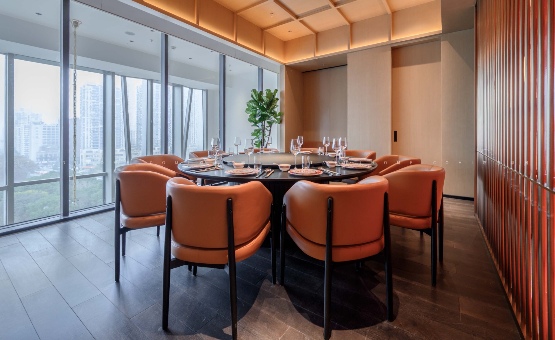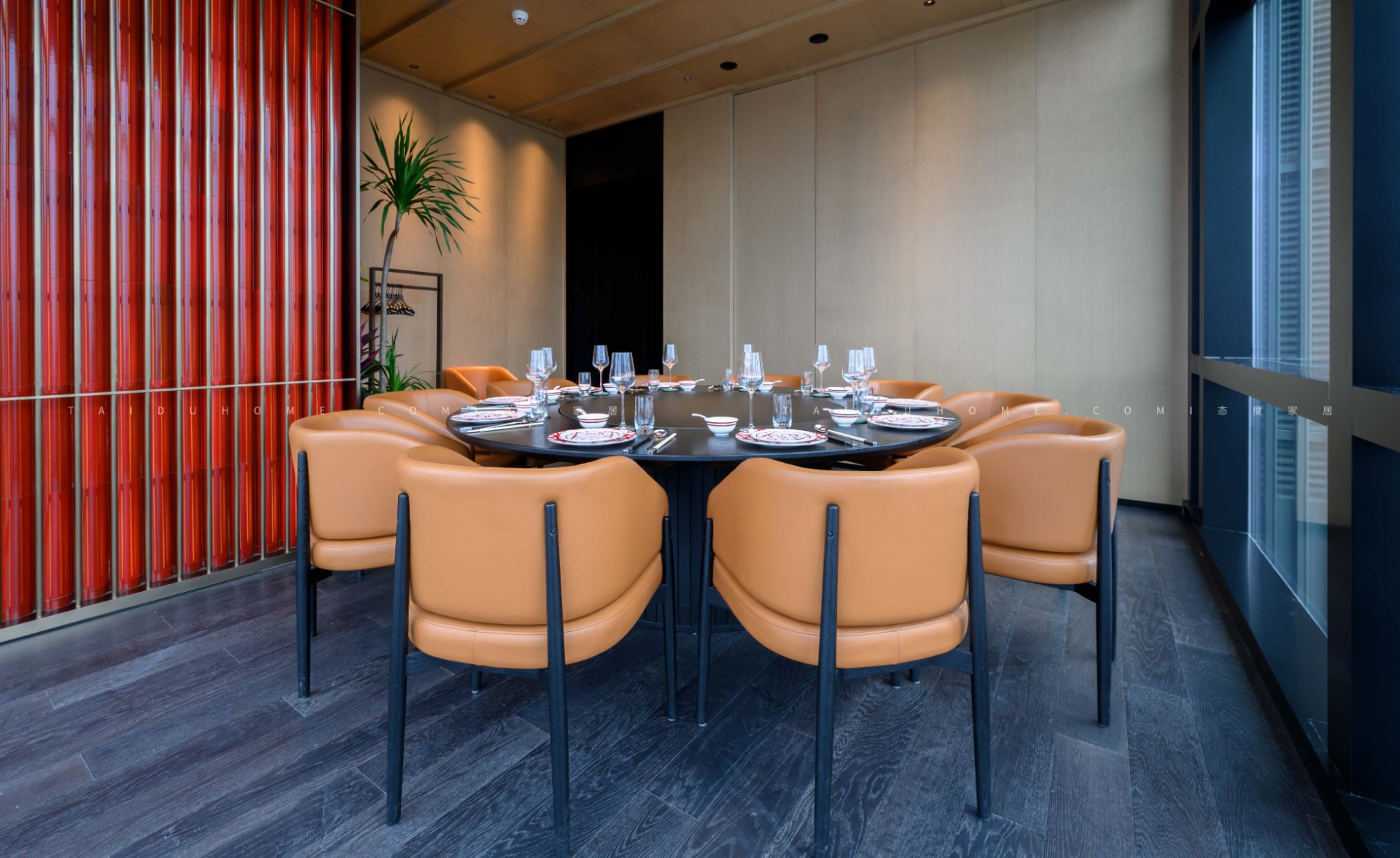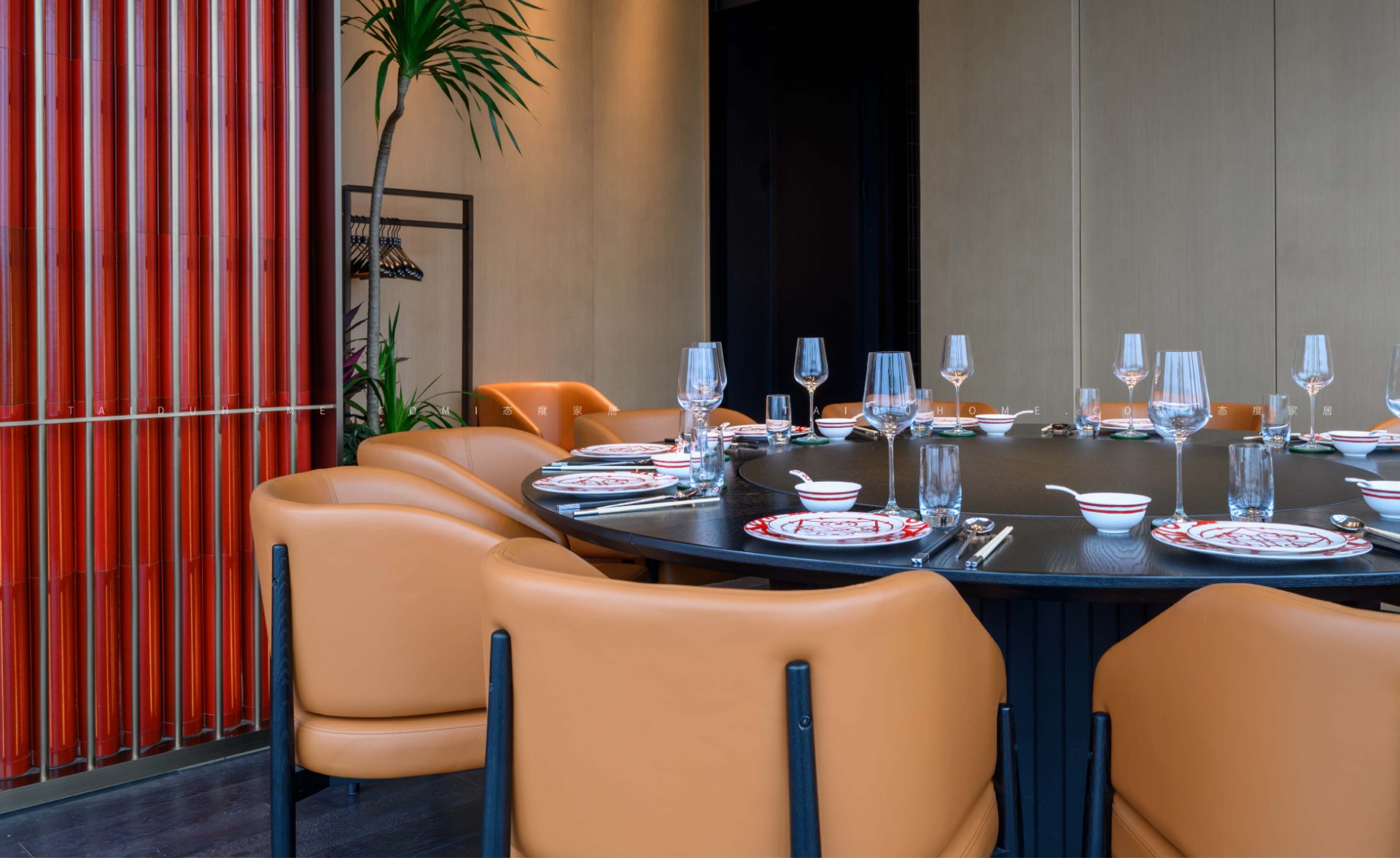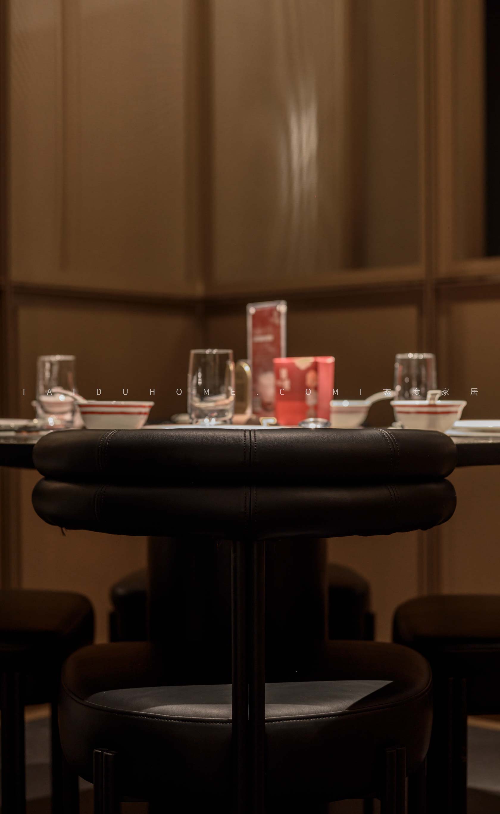 The combination of black and gray cement tiles with glass walls creates a cooler dining atmosphere. The dining chairs in the lobby are black leather arched chairs with a semi enclosed design, allowing diners to have a more comfortable experience during meals.