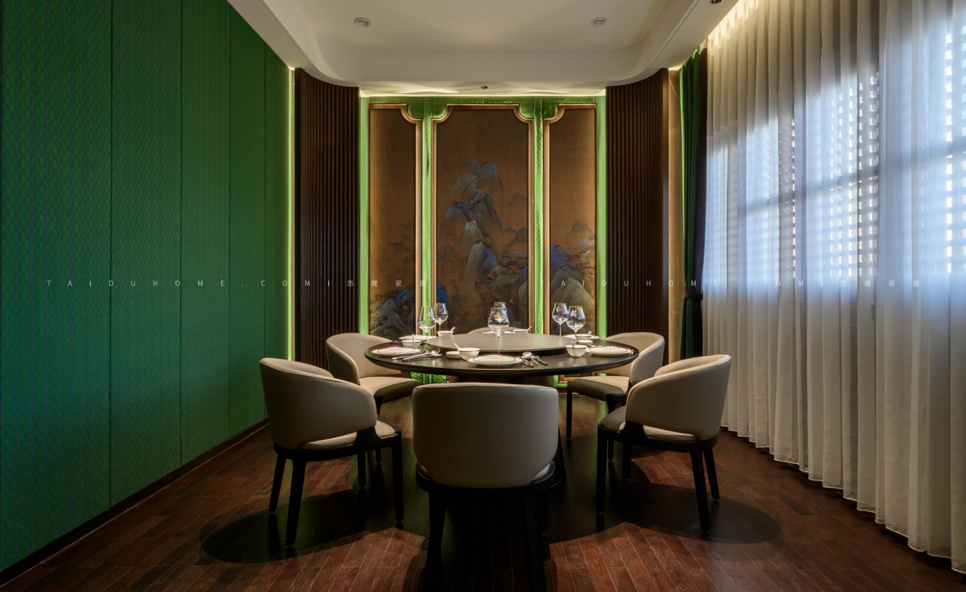 以米白色凯瑟体闲椅为松花绿包厢做配,绿色意味新鲜与生命,也代表健康与活力。红色的川度椅,让人无论是从感官视觉还是舒适度上都是独特的体验。