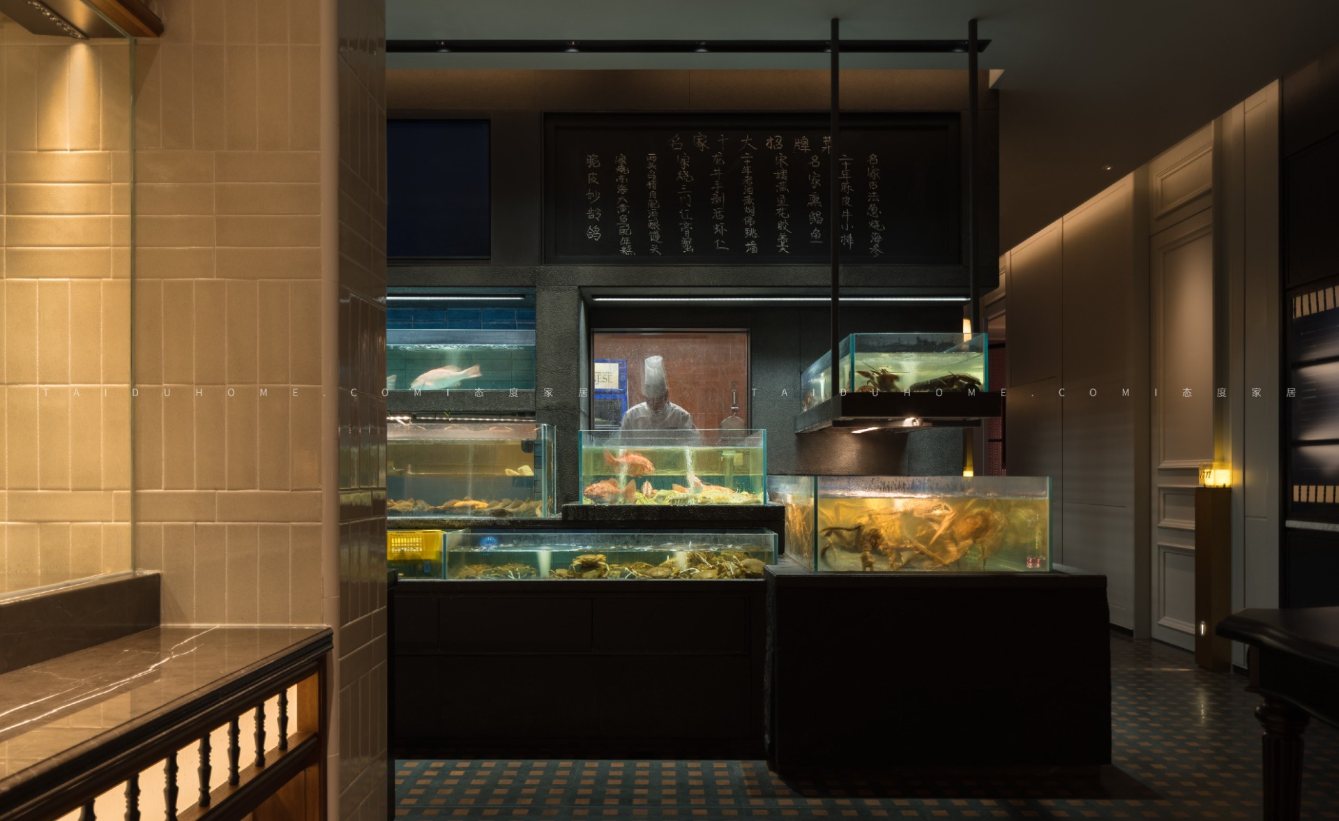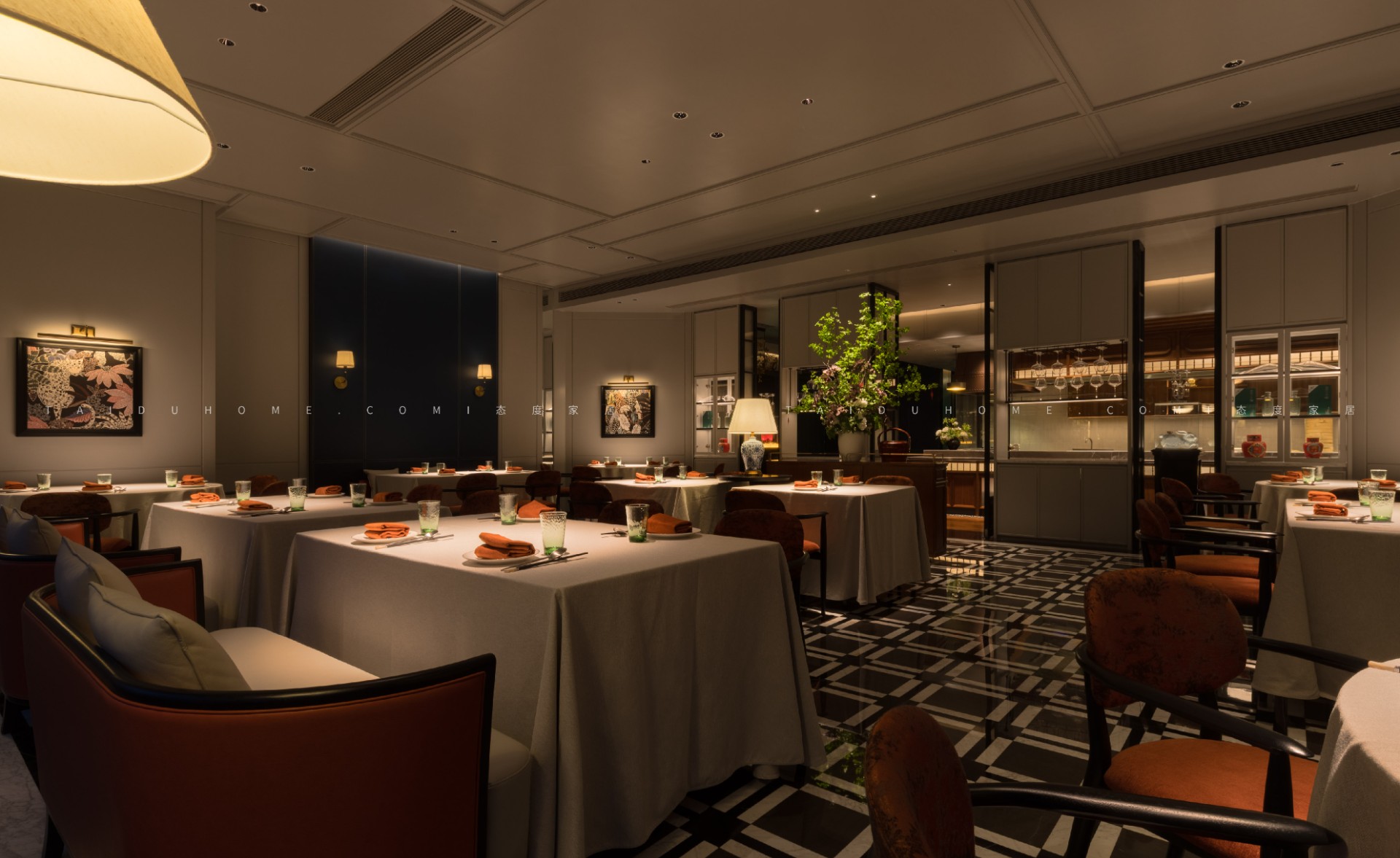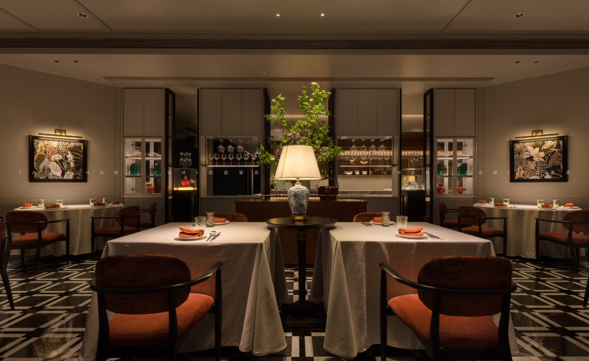 空间序列如一幅展开的长卷,以 “书房” 门厅为序,经水墨意蕴的 “曲廊” 过渡,最终抵达烟火氤氲的 “明档” 核心。散厅直面这份温暖景观,两侧包厢则如静雅厢房,借景生情,隔而不断。