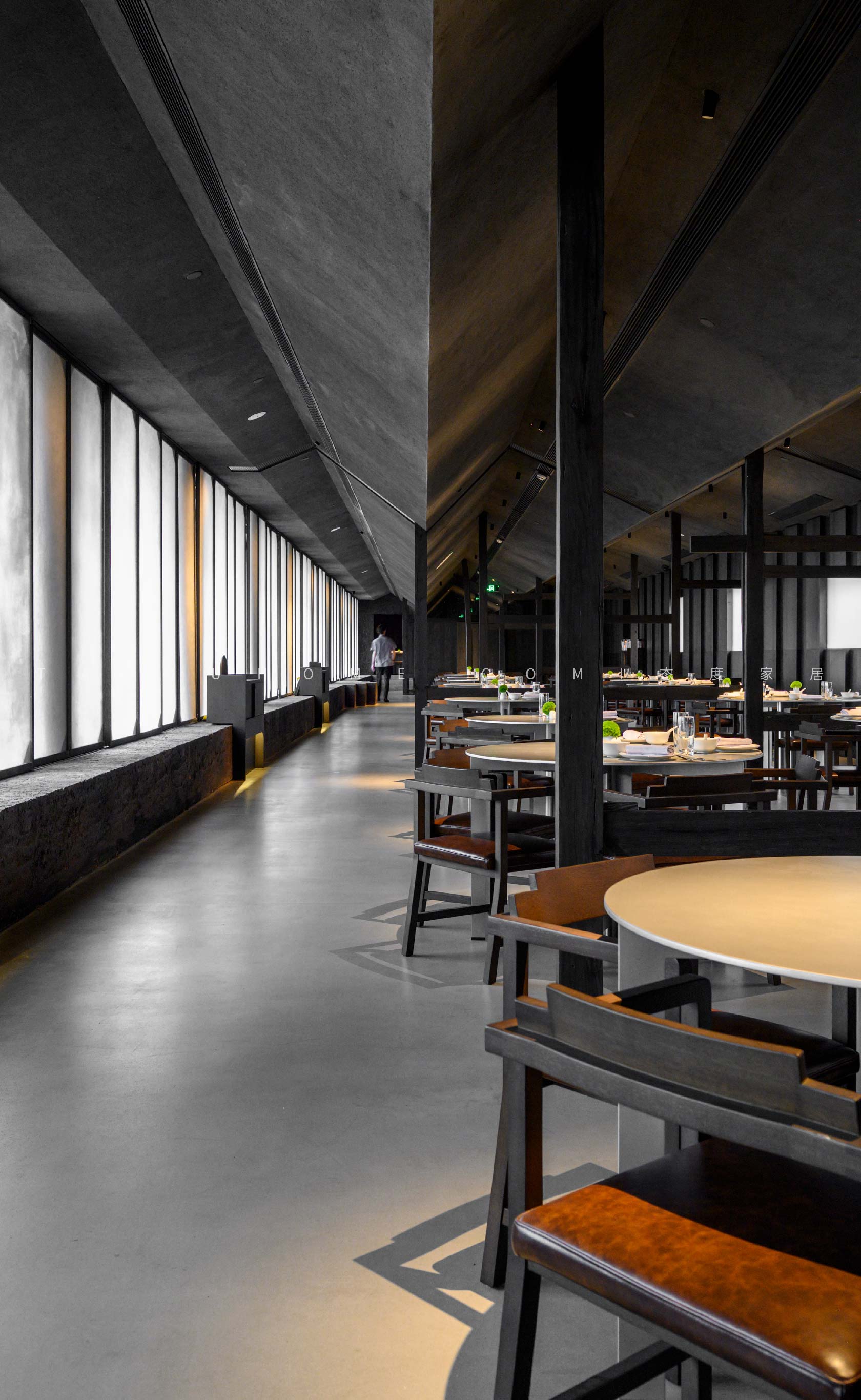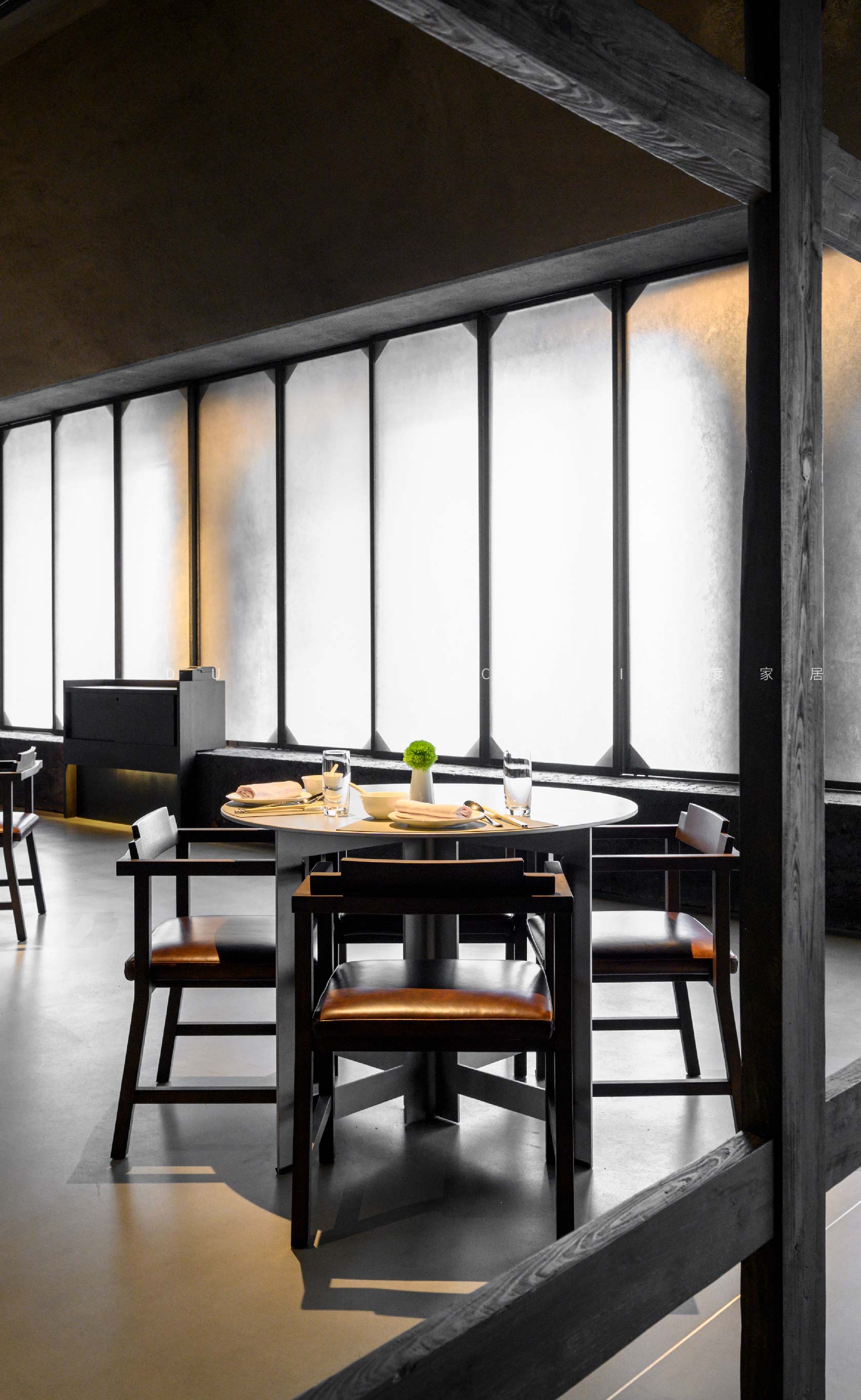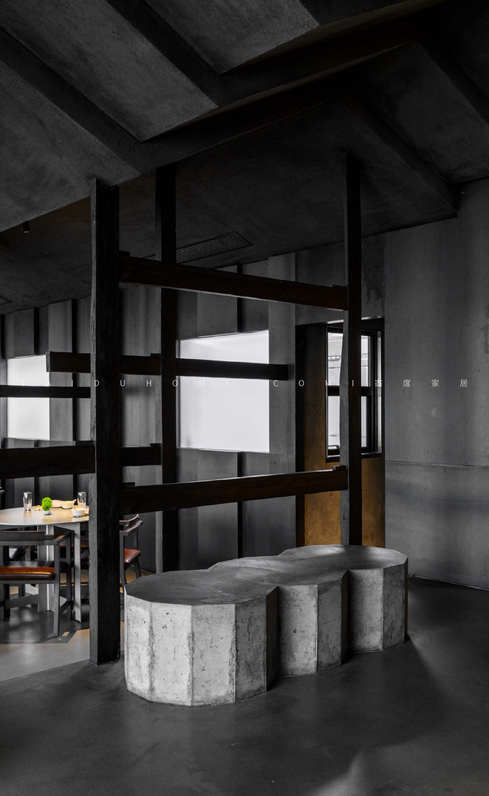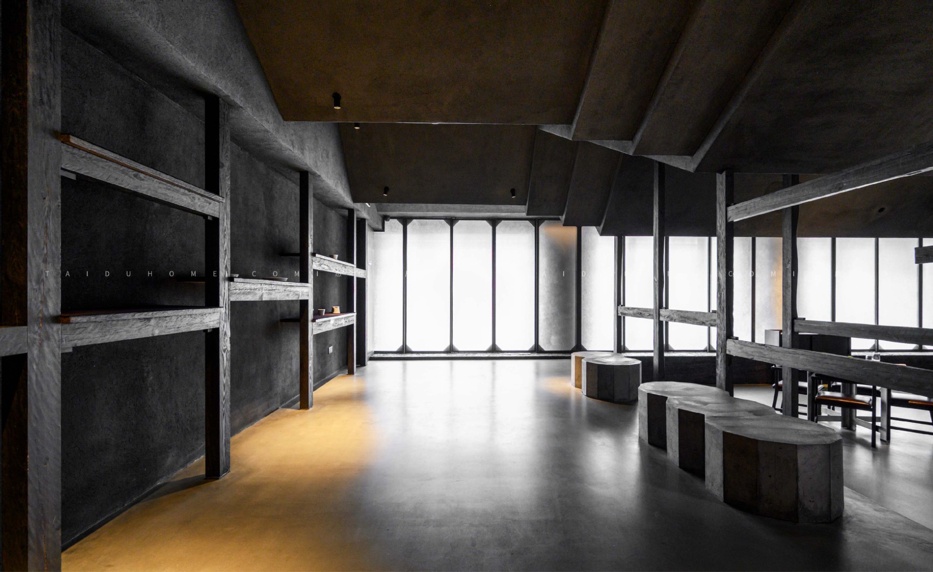 The structure of the entire space is basically made of old wooden beams and crossbeam frames recycled from local old houses. The eye-catching colors are all dark, and the walls and ceilings are made of cement materials. The semi transparent "window" on that side is even more refreshing. During the day, natural light gently reflects on the concrete floor, presenting a vast sense of interstellar space. At night, the dim yellow lights were like moonlight, with people passing by and silhouettes hazy and beautiful.