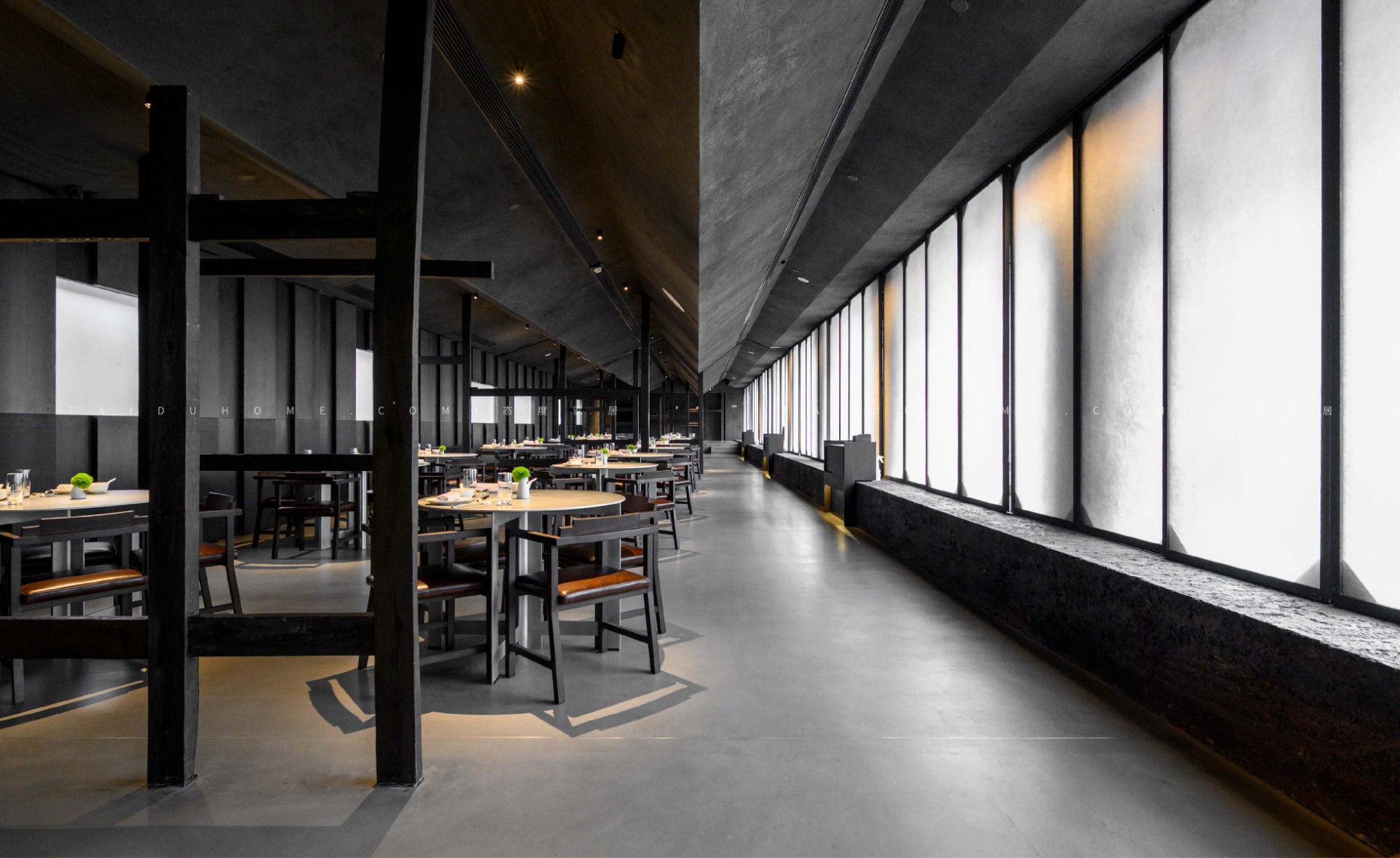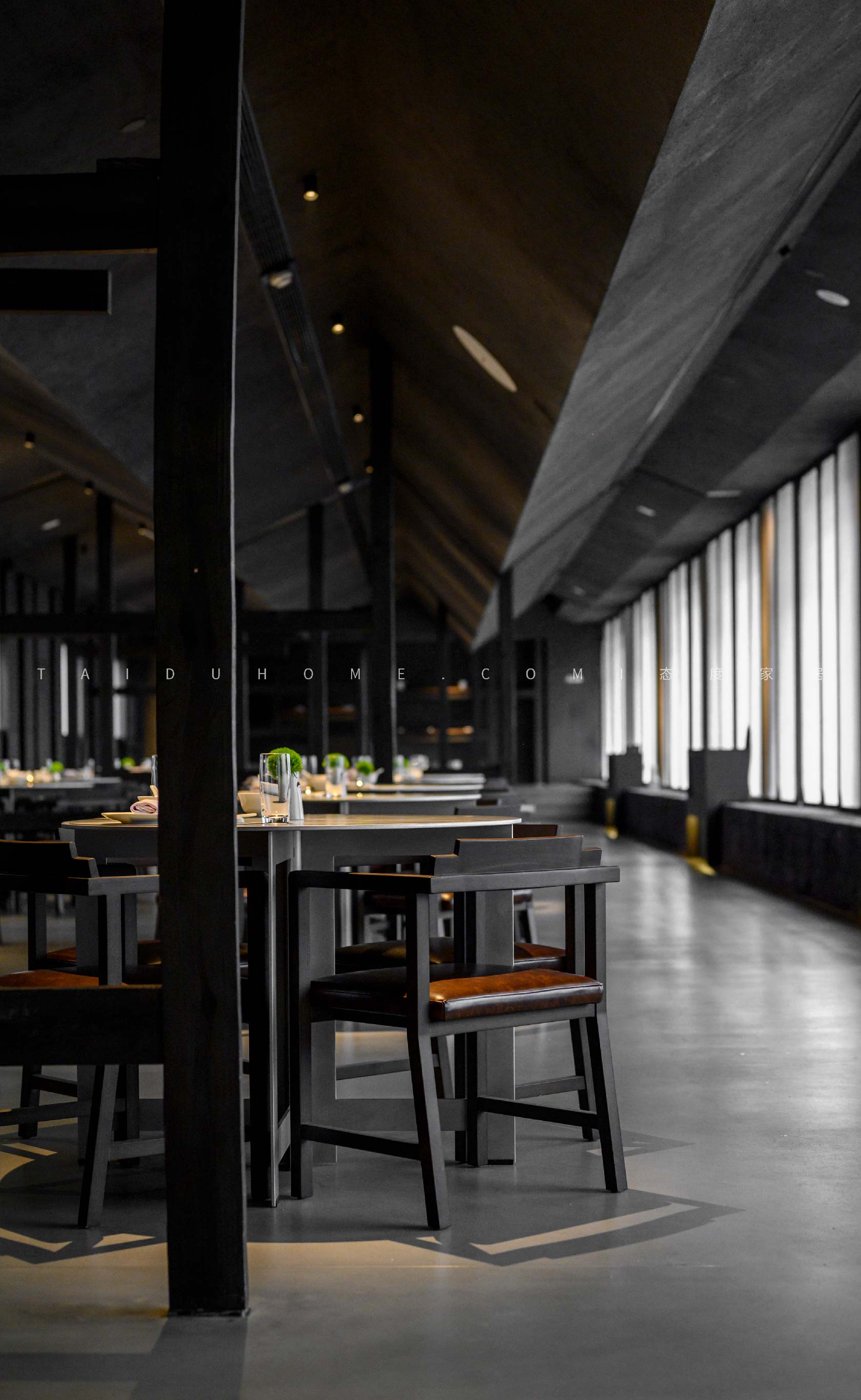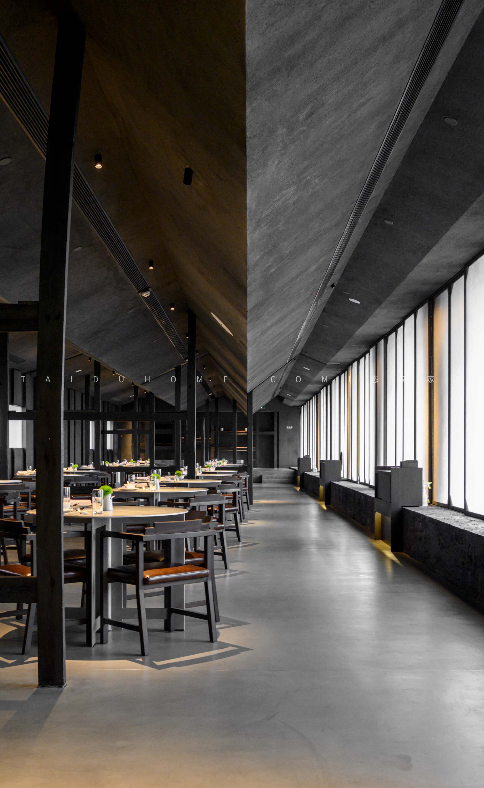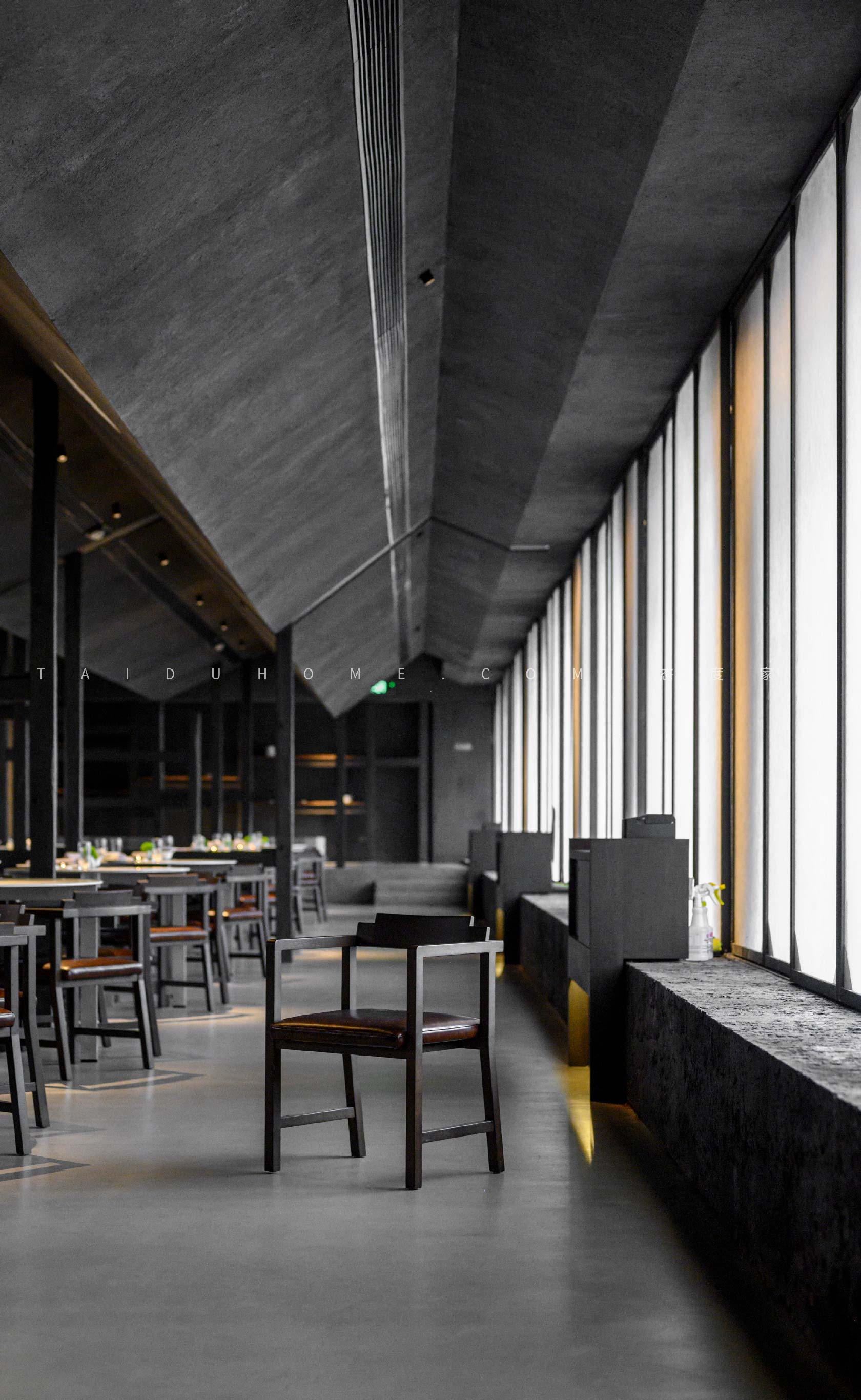 The structure of the entire space is basically made of old wooden beams and crossbeam frames recycled from local old houses. The eye-catching colors are all dark, and the walls and ceilings are made of cement materials. The semi transparent "window" on that side is even more refreshing. During the day, natural light gently reflects on the concrete floor, presenting a vast sense of interstellar space. At night, the dim yellow lights were like moonlight, with people passing by and silhouettes hazy and beautiful.