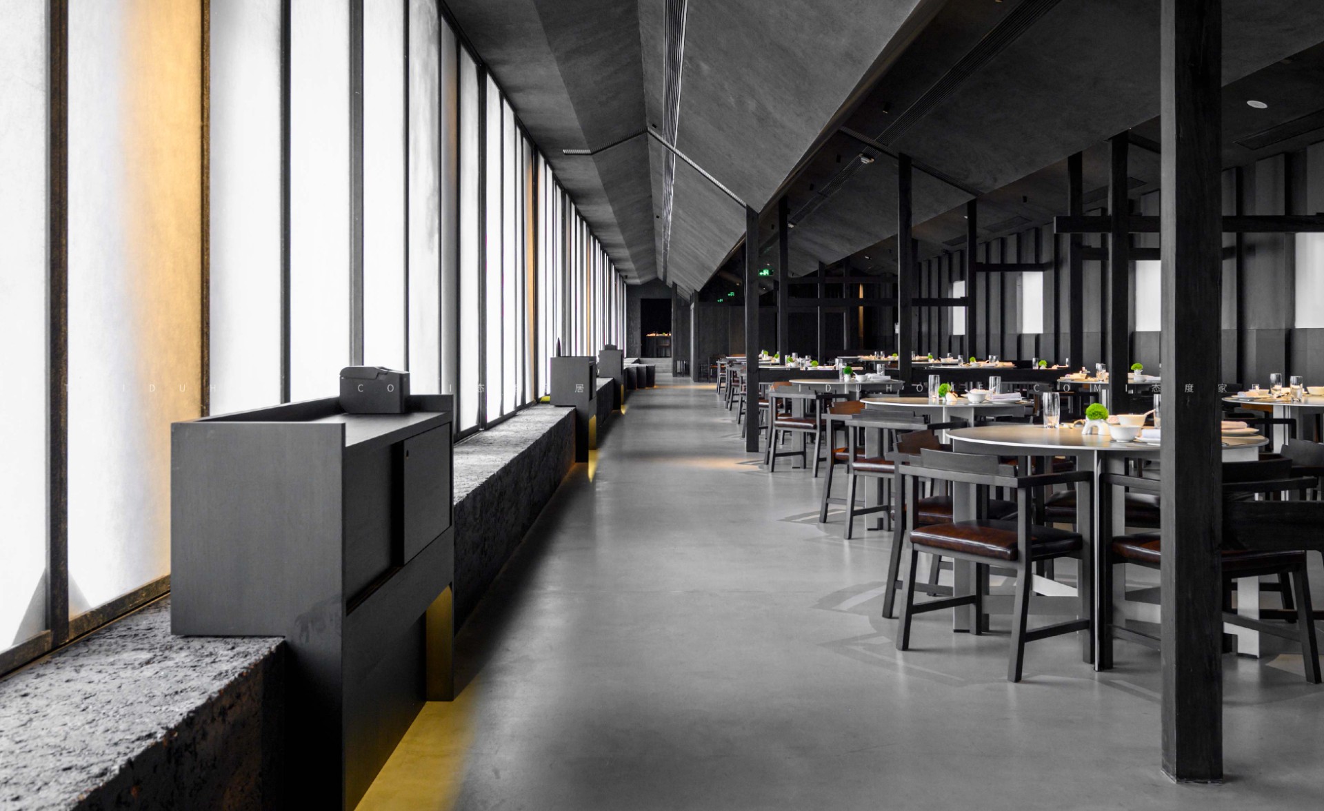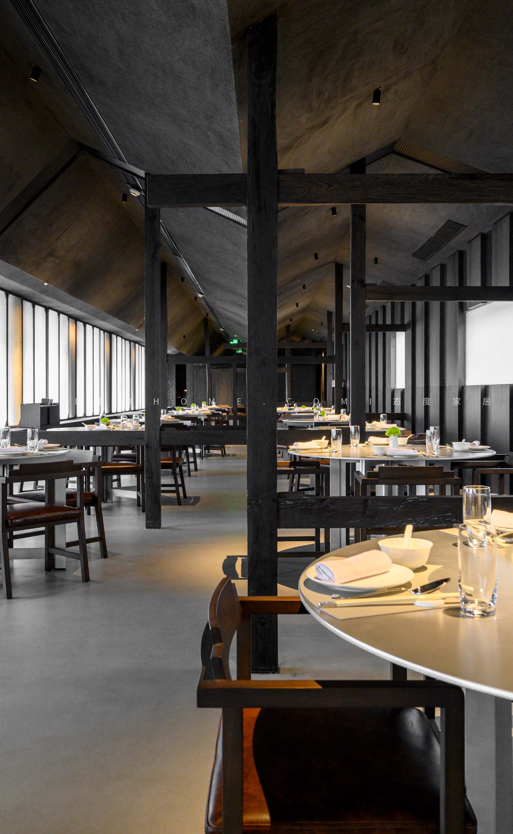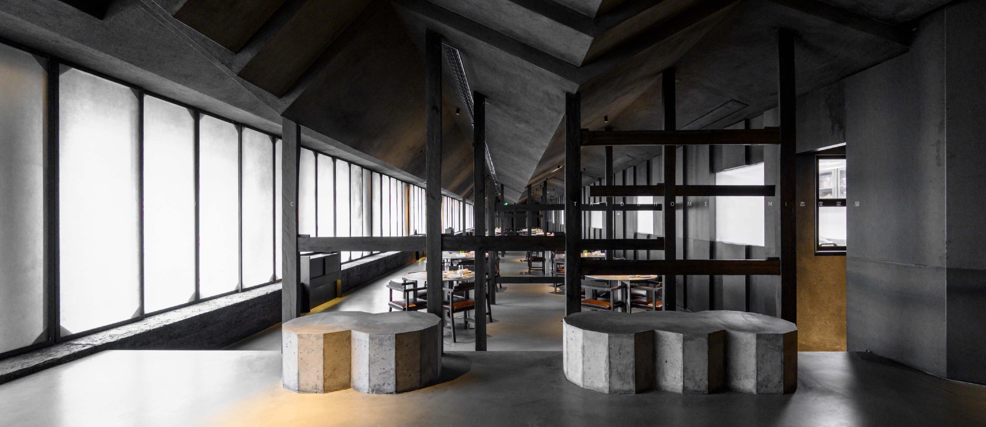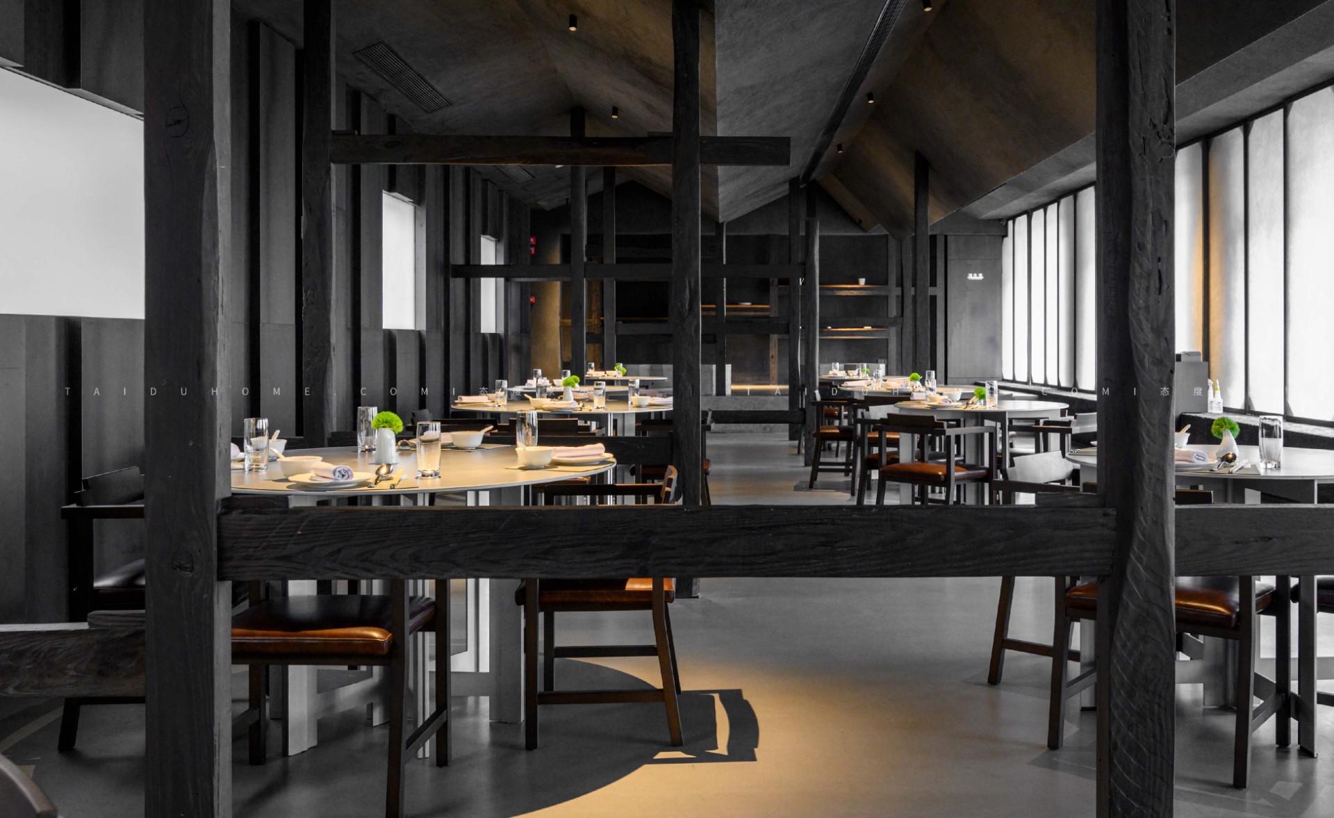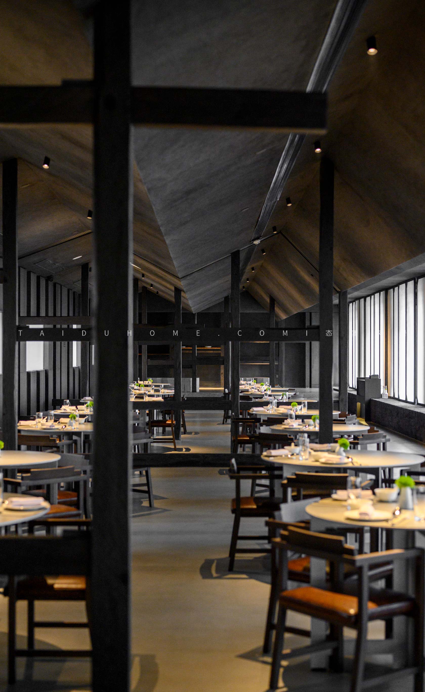 The structure of the entire space is basically made of old wooden beams and crossbeam frames recycled from local old houses. The eye-catching colors are all dark, and the walls and ceilings are made of cement materials. The semi transparent "window" on that side is even more refreshing. During the day, natural light gently reflects on the concrete floor, presenting a vast sense of interstellar space. At night, the dim yellow lights were like moonlight, with people passing by and silhouettes hazy and beautiful.