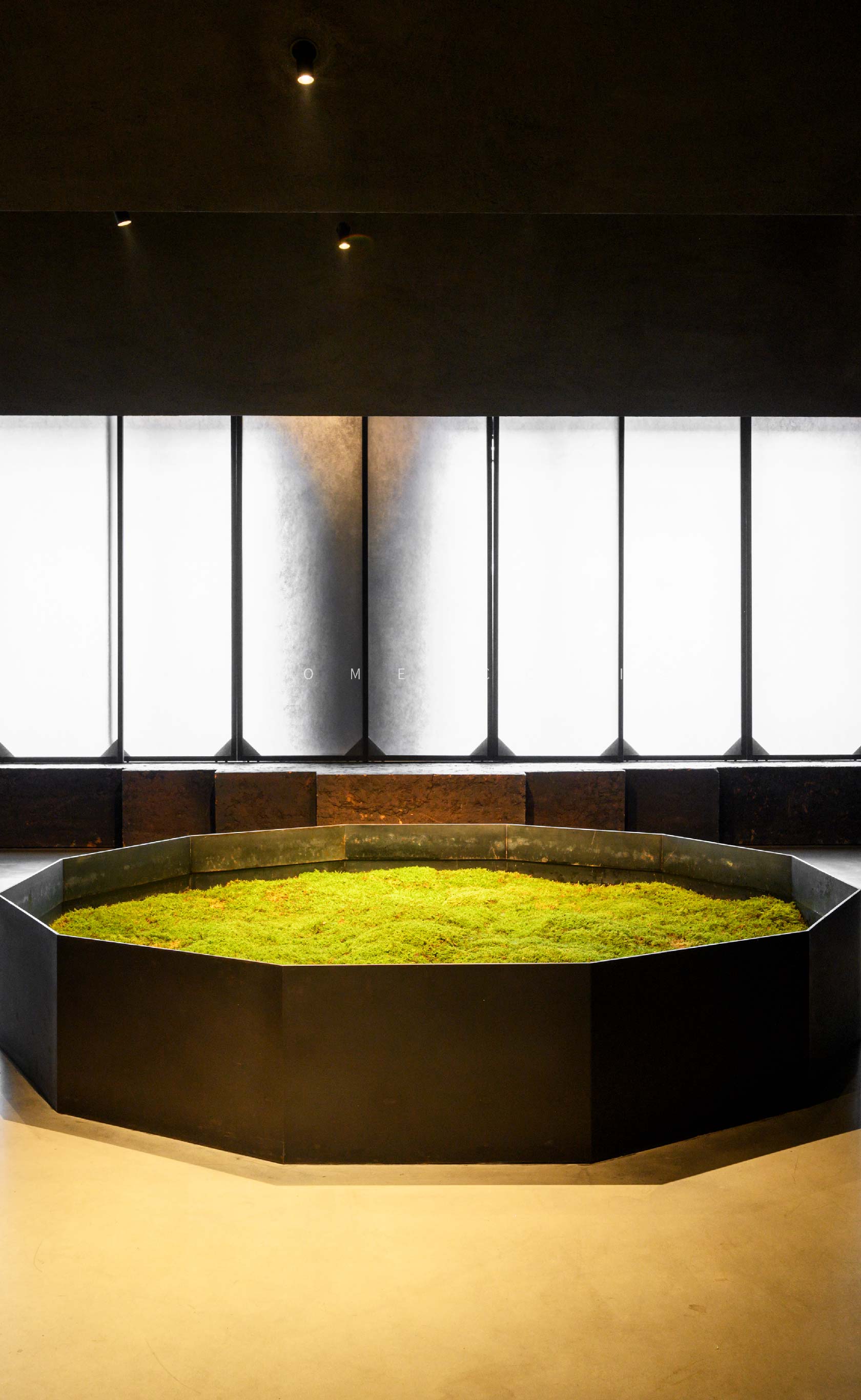 整个空间的结构基本上都是用当地老宅子回收的旧木梁、横梁框架打造出来的。入目皆是深色系,墙面与天花板选用水泥材料,那一面半透明的“窗”更是令人耳目一新。白天自然光柔和的照映于水泥地面,呈现出宇宙星际般的广阔感。到了夜间,昏黄的灯光恍若月光,人流穿梭,剪影朦胧又美好。