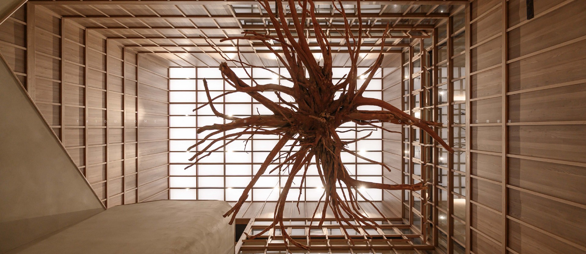 The giant dead wood installation suspended at the staircase courtyard, combined with the visual effect of the skylight on the top, creates a natural feeling in the staircase atrium.