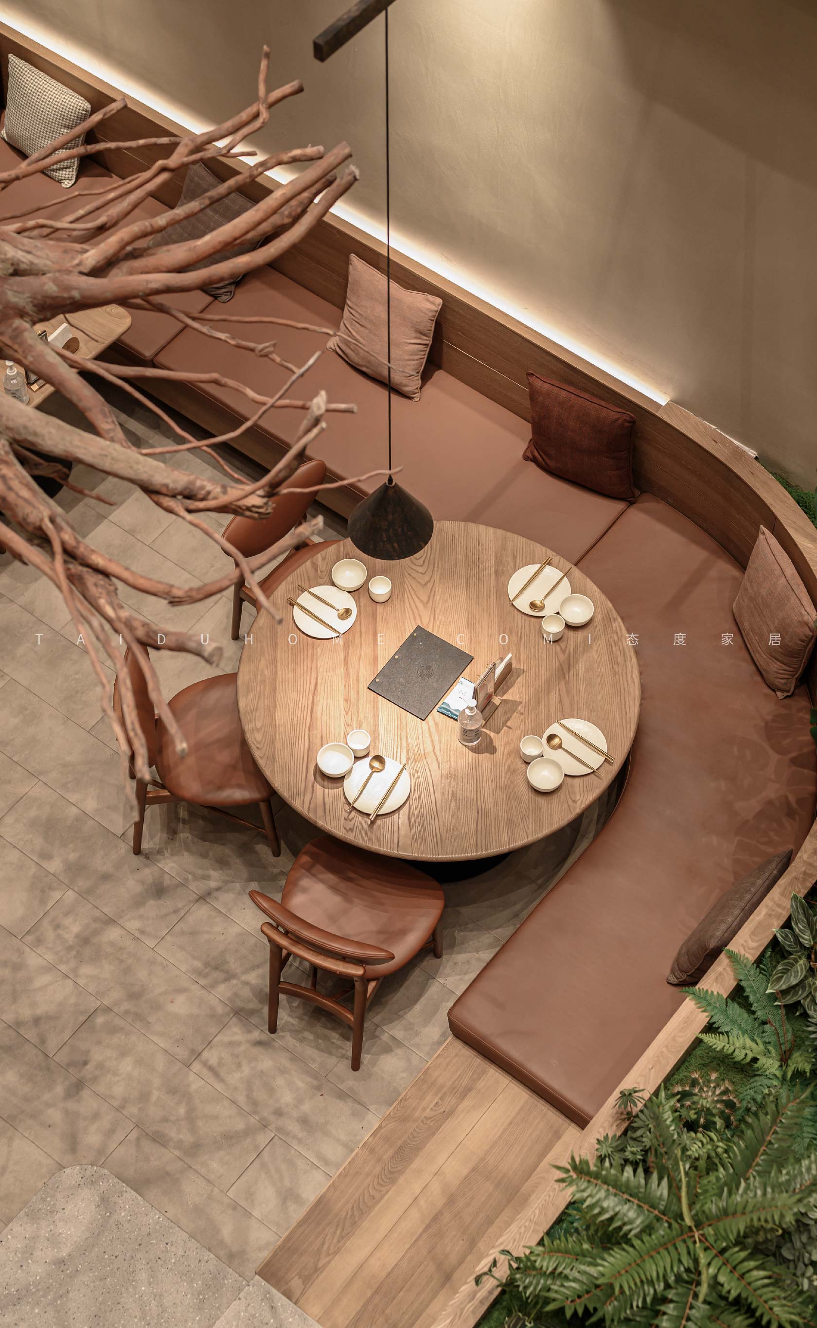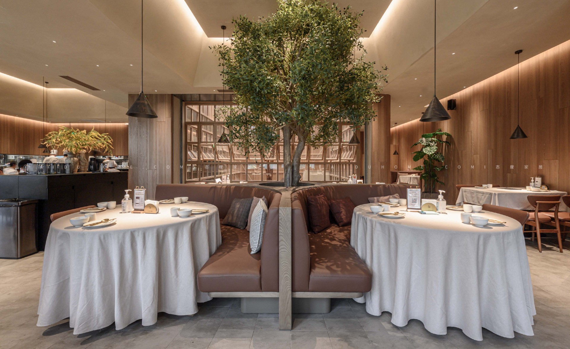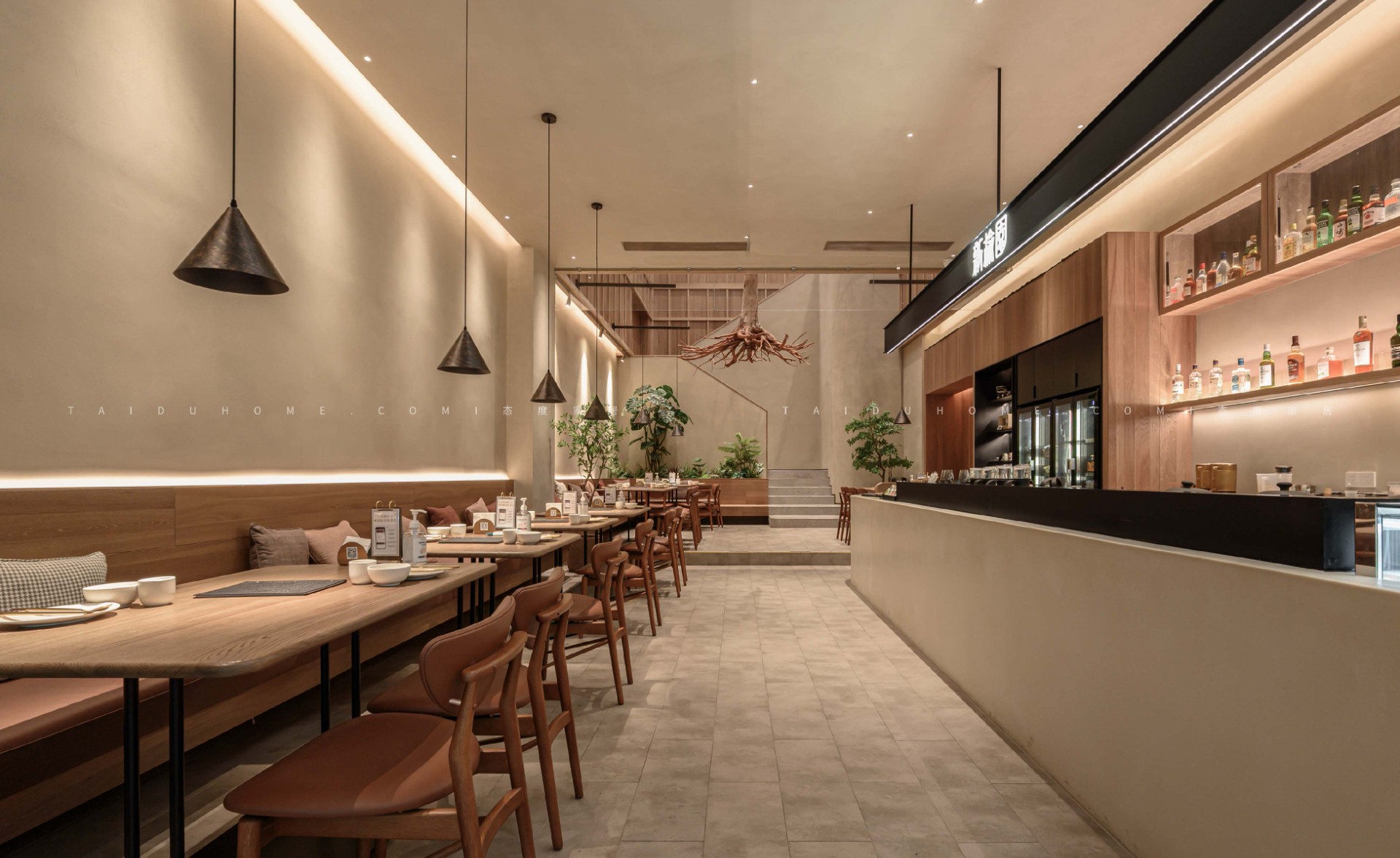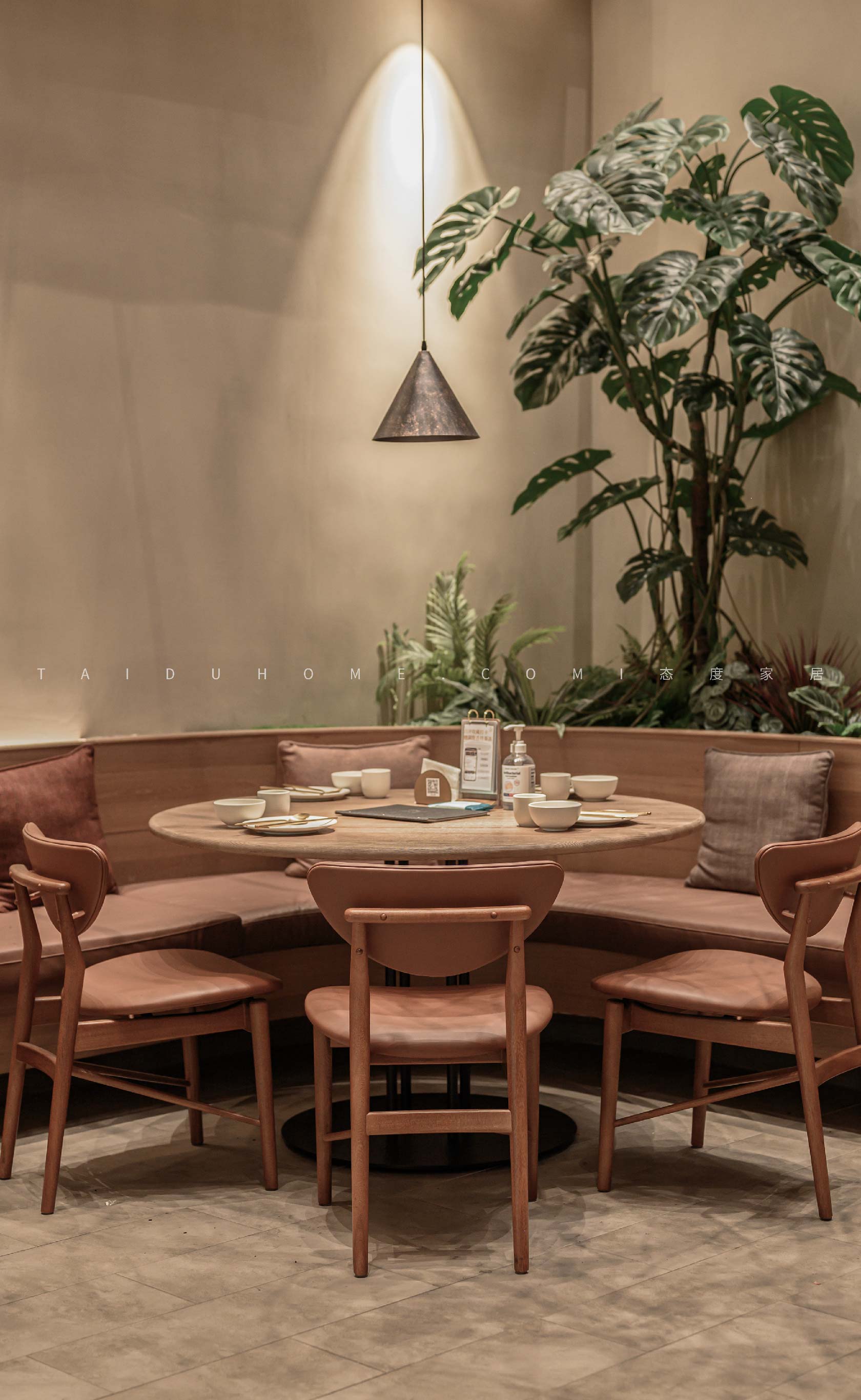 新榆园乐堤港店以“榆”为设计线索,整体基调采用温暖的米咖色系,结合室内绿植造景设计手法,营造出质朴、轻松的用餐氛围。