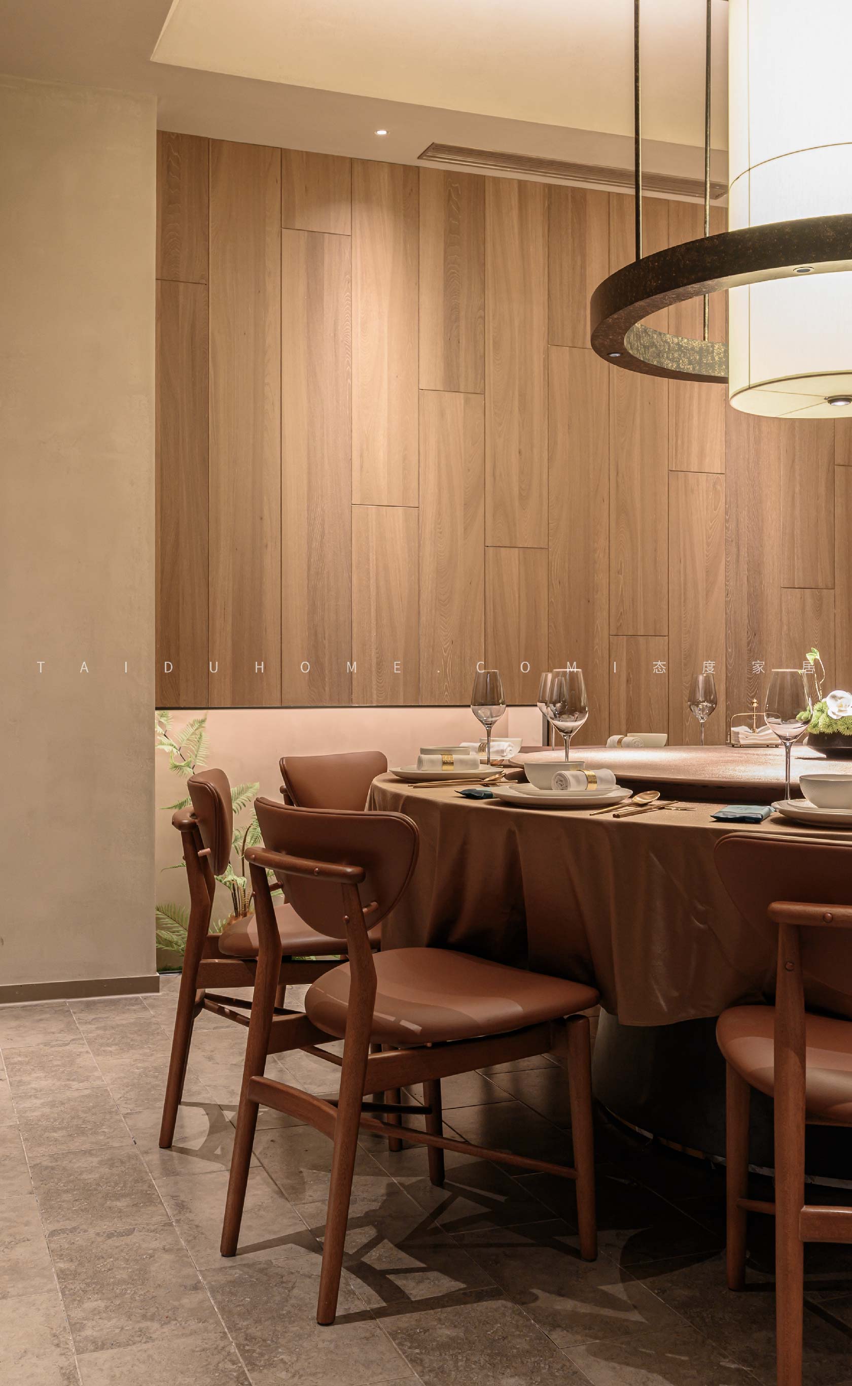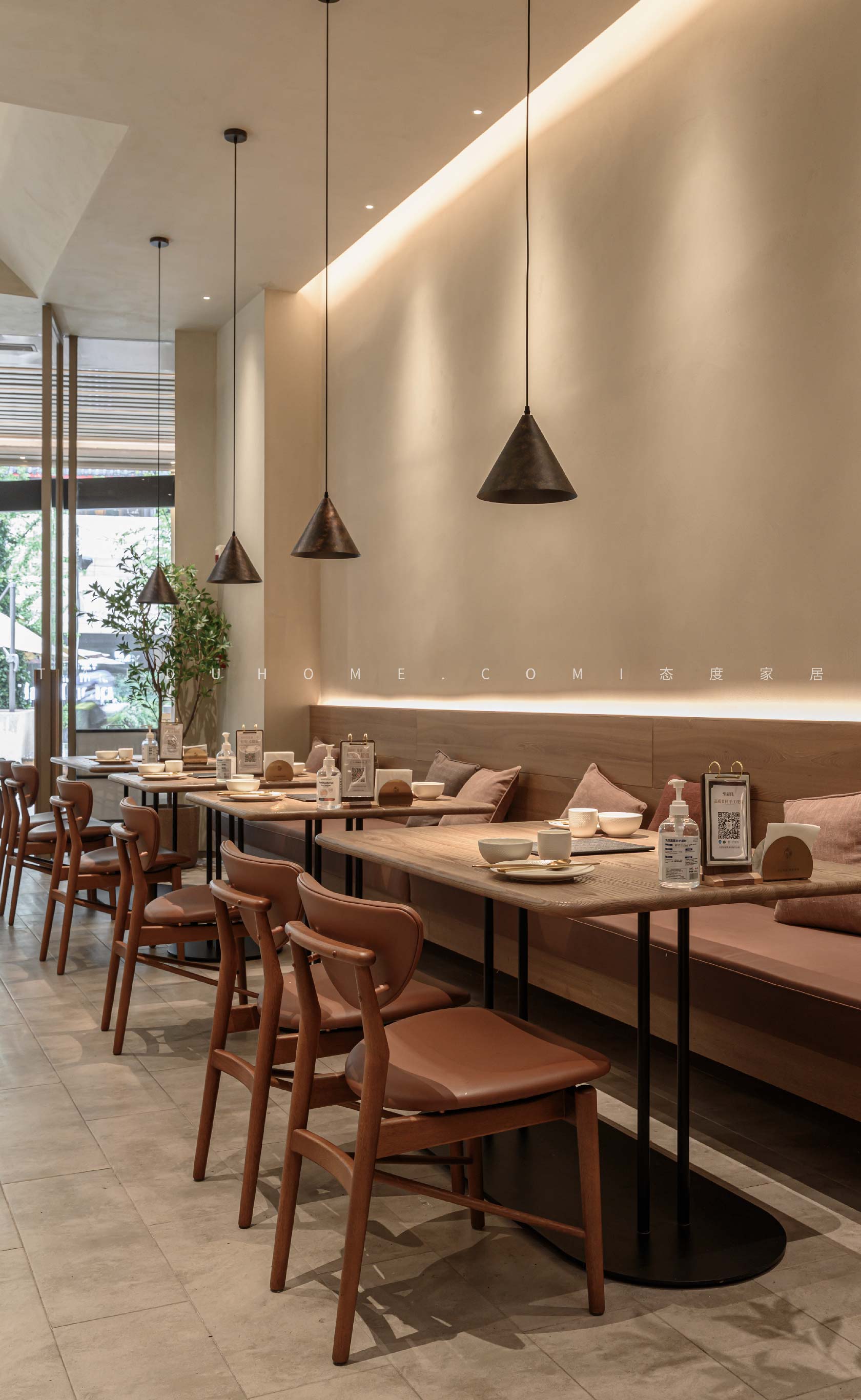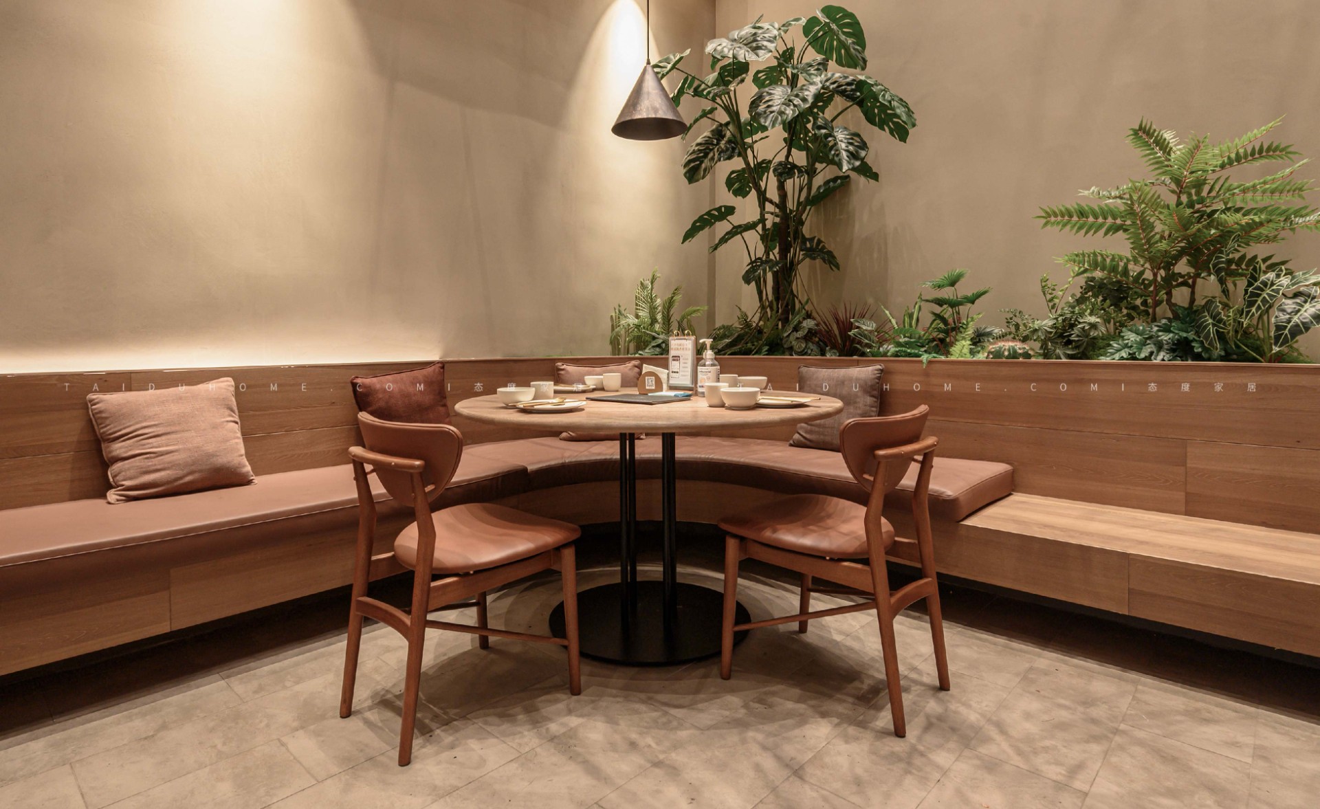 新榆园乐堤港店以“榆”为设计线索,整体基调采用温暖的米咖色系,结合室内绿植造景设计手法,营造出质朴、轻松的用餐氛围。