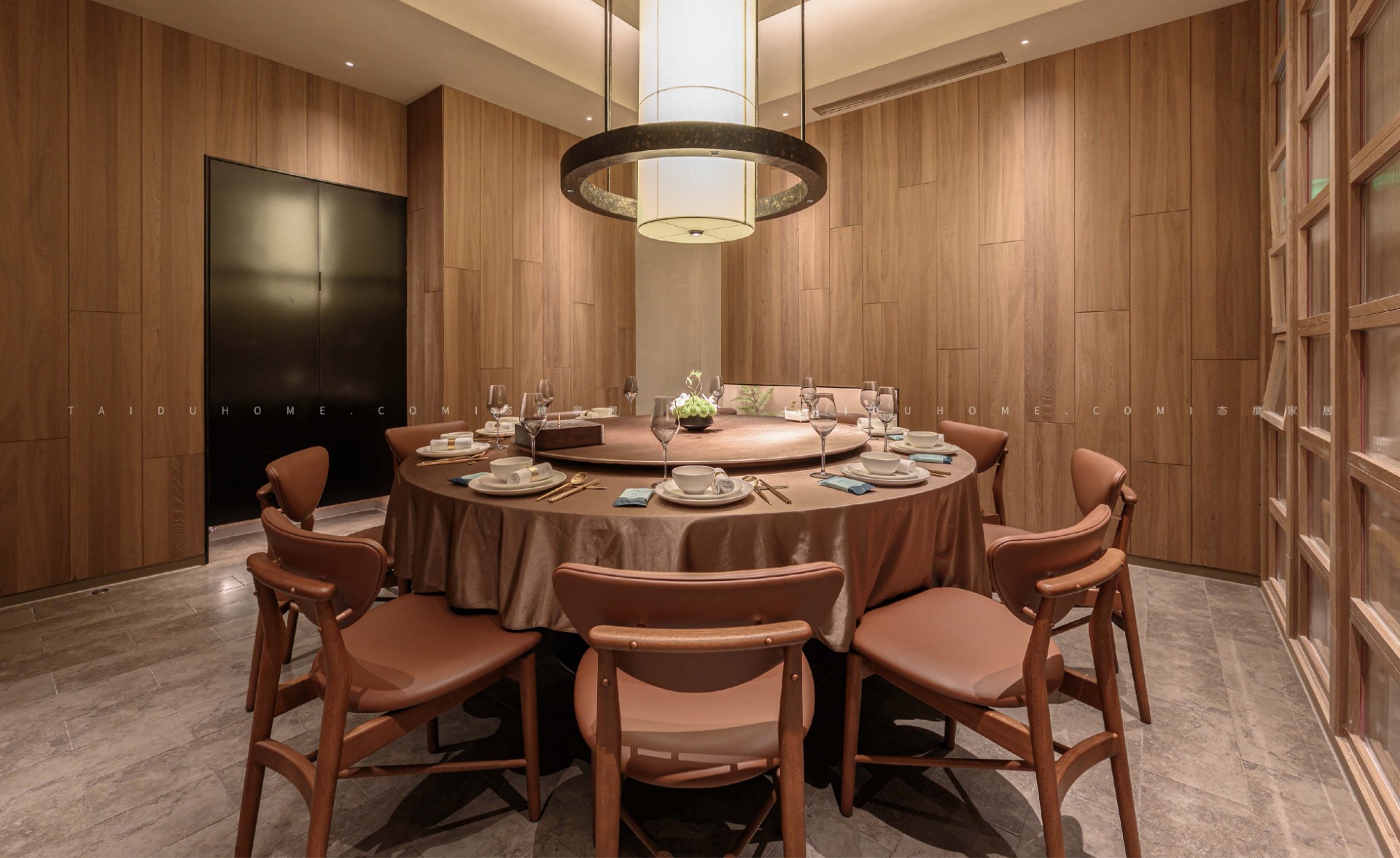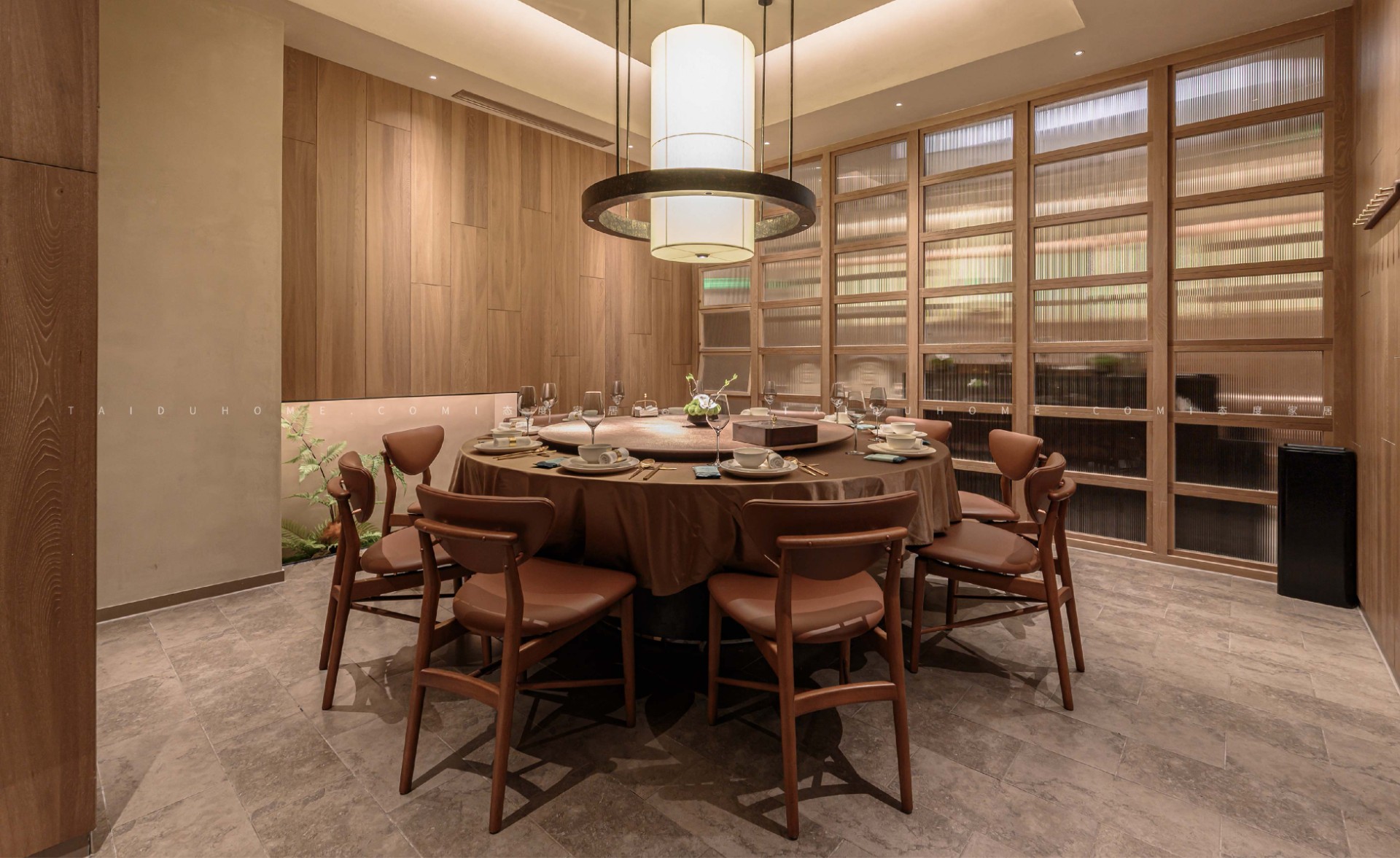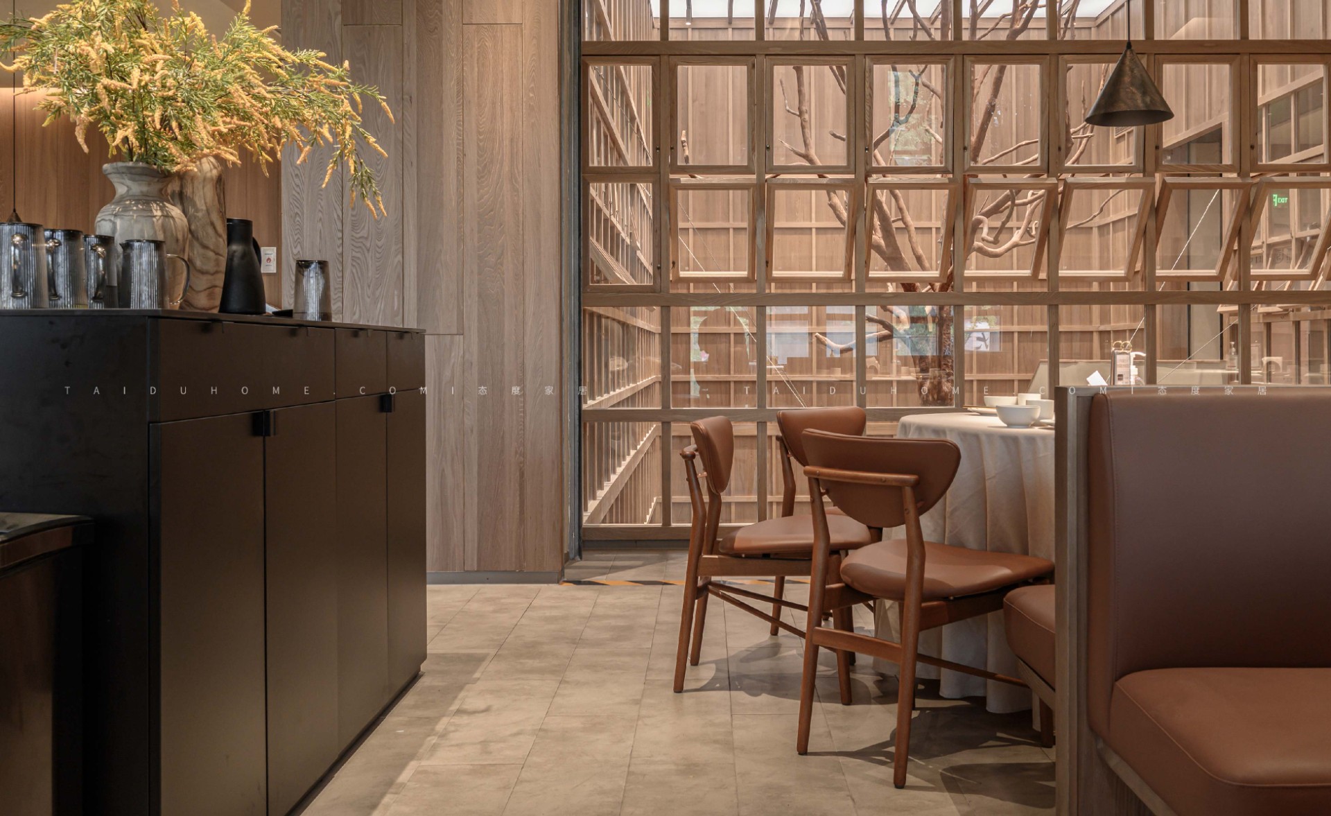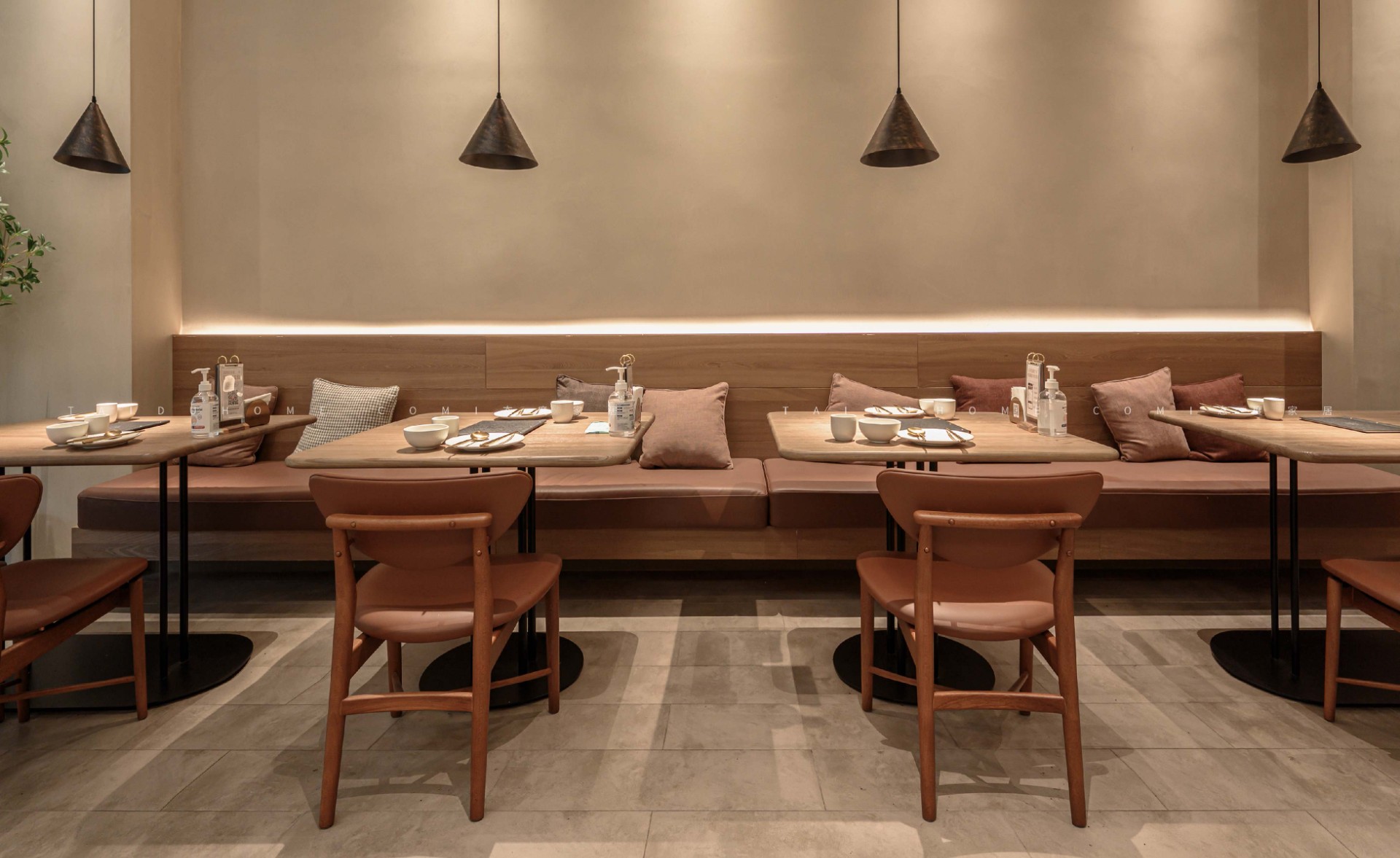 新榆园乐堤港店以“榆”为设计线索,整体基调采用温暖的米咖色系,结合室内绿植造景设计手法,营造出质朴、轻松的用餐氛围。