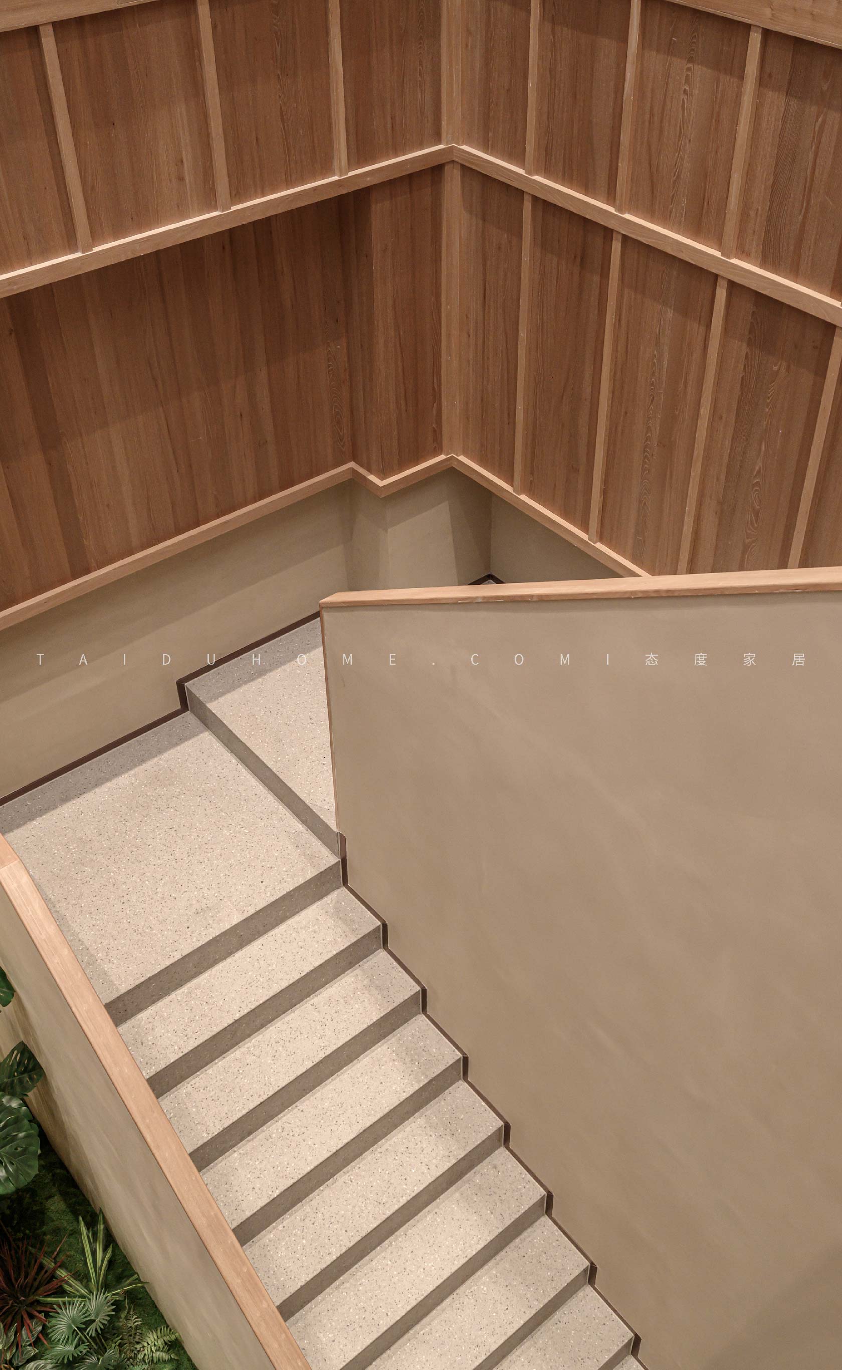 楼梯天井处悬吊的巨型枯木装置,搭配顶面的天光视觉效果,给楼梯中庭渲染出一副置身自然的感觉。