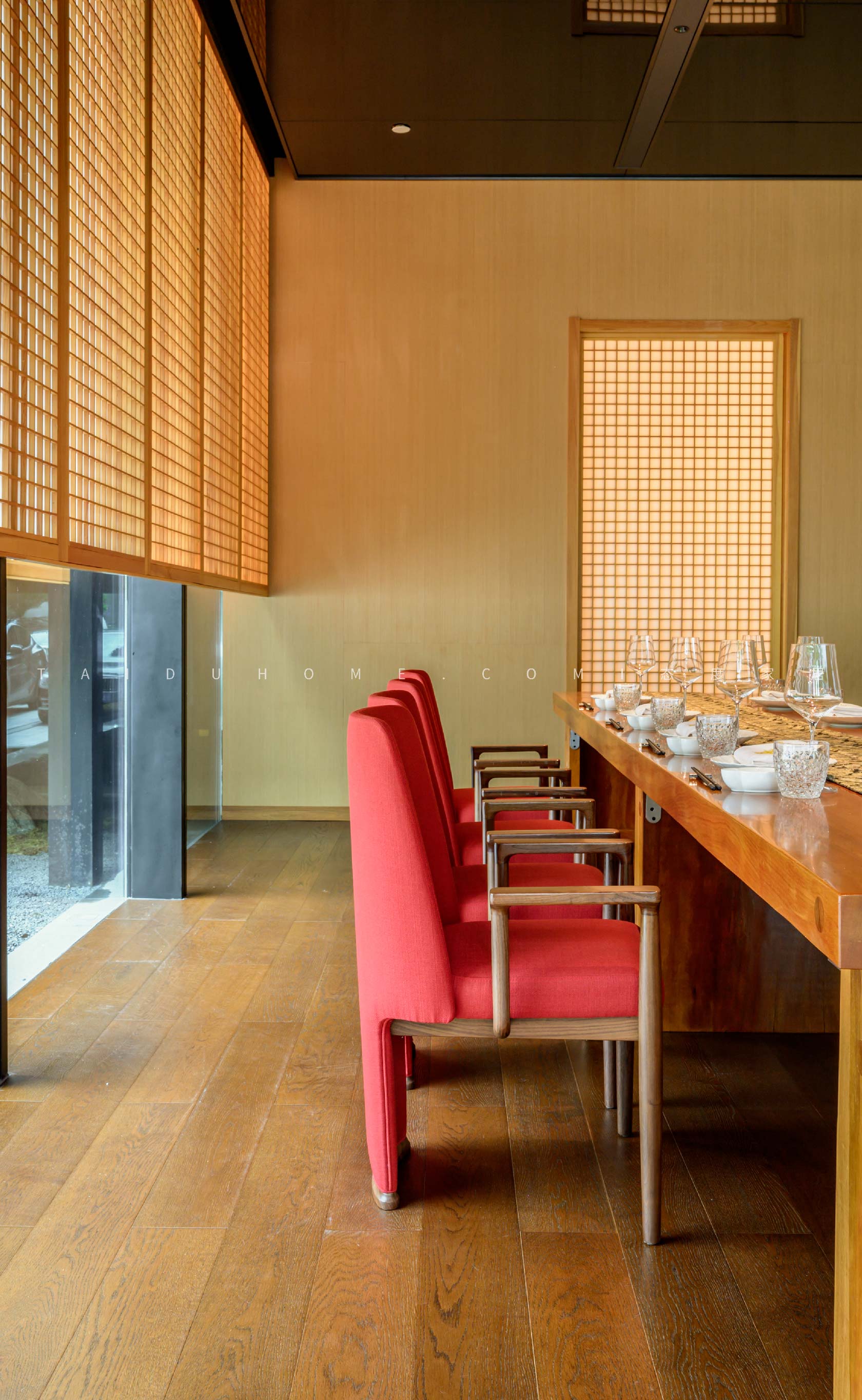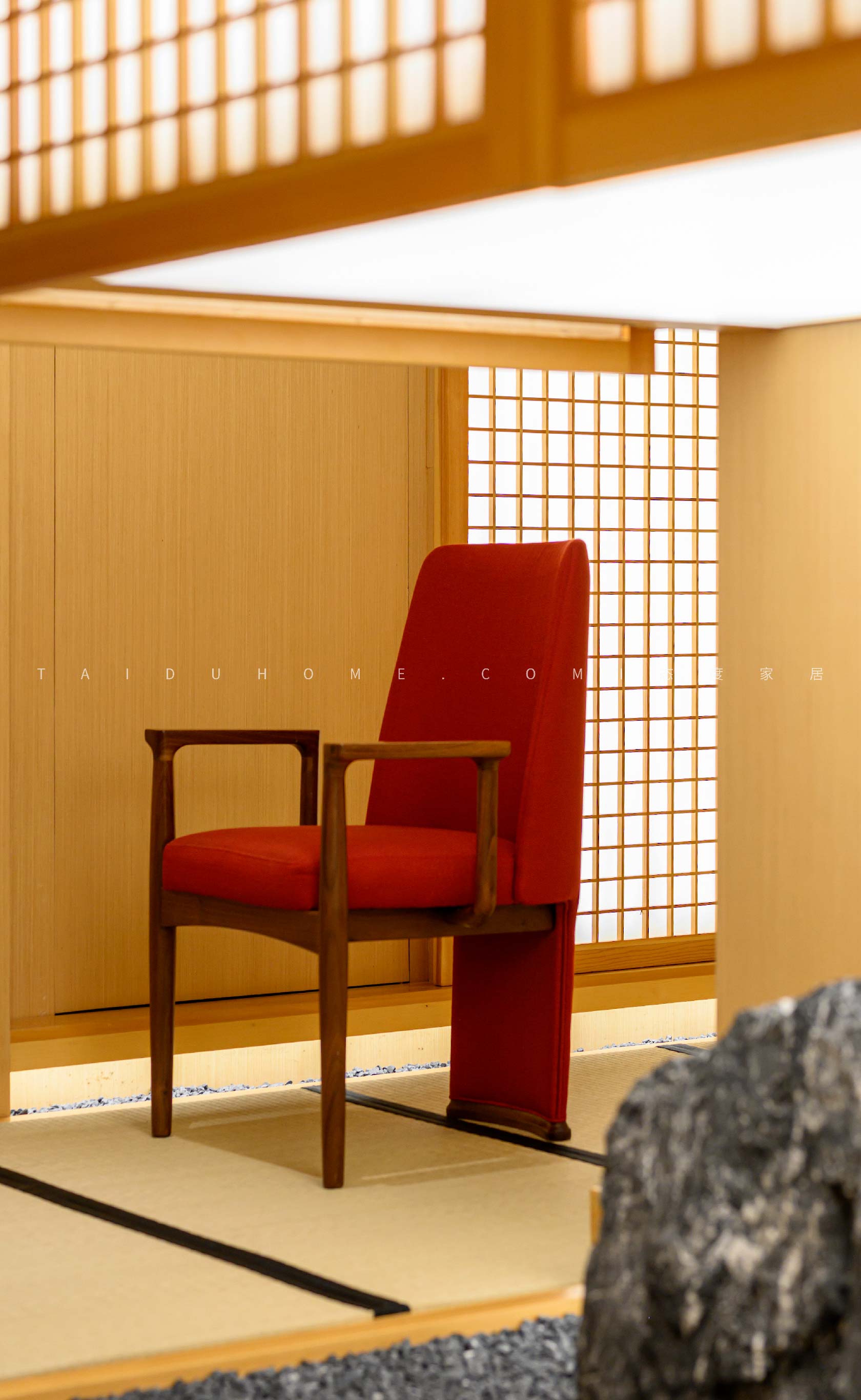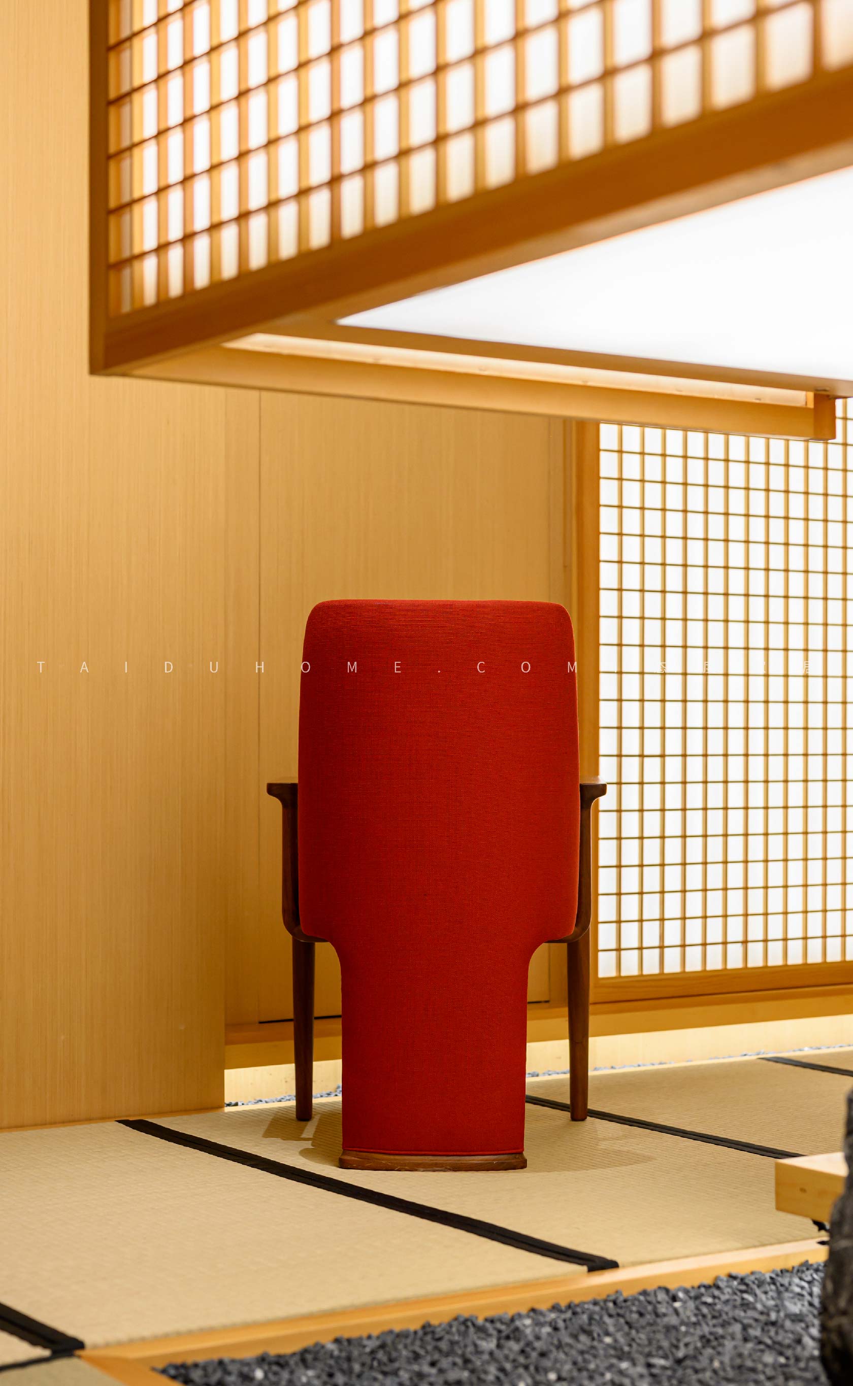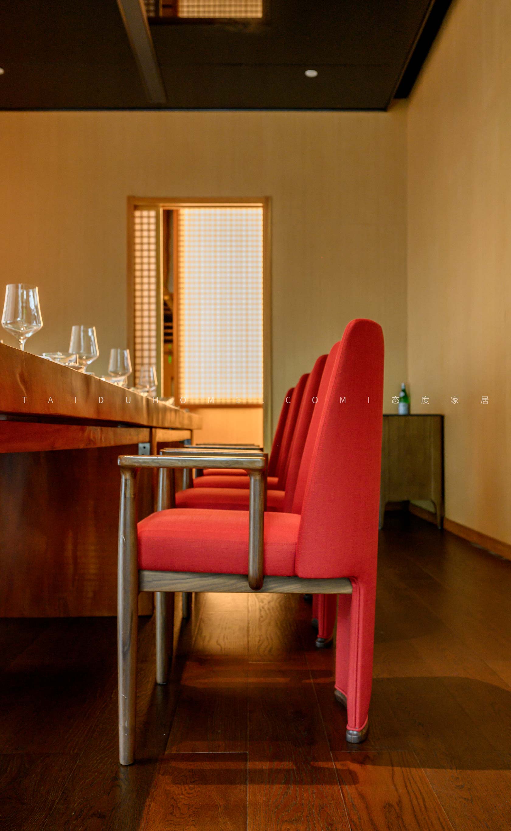 红色的诚鮨椅,造型源于日本女性的和服,搭配富贵龍吟极致的包厢空间,原木长桌与红色椅背的映衬更凸显富贵之气。