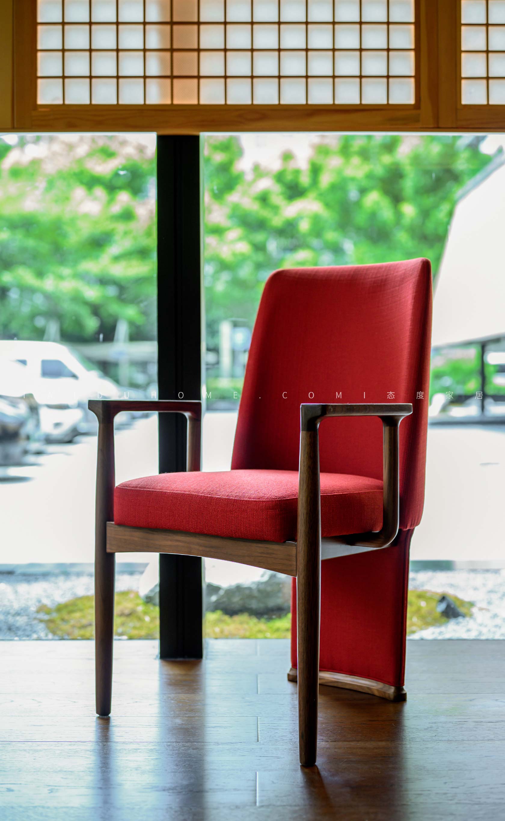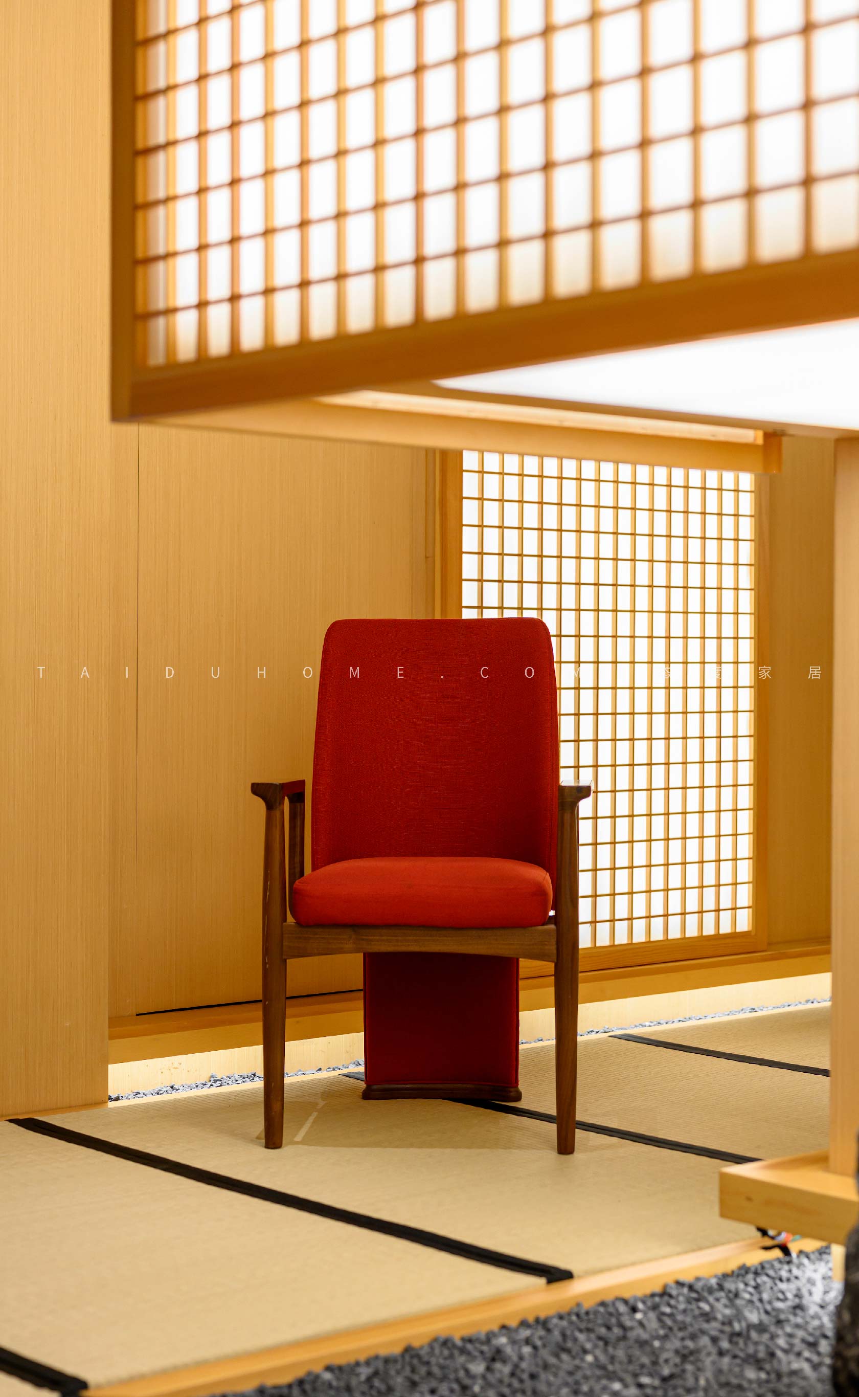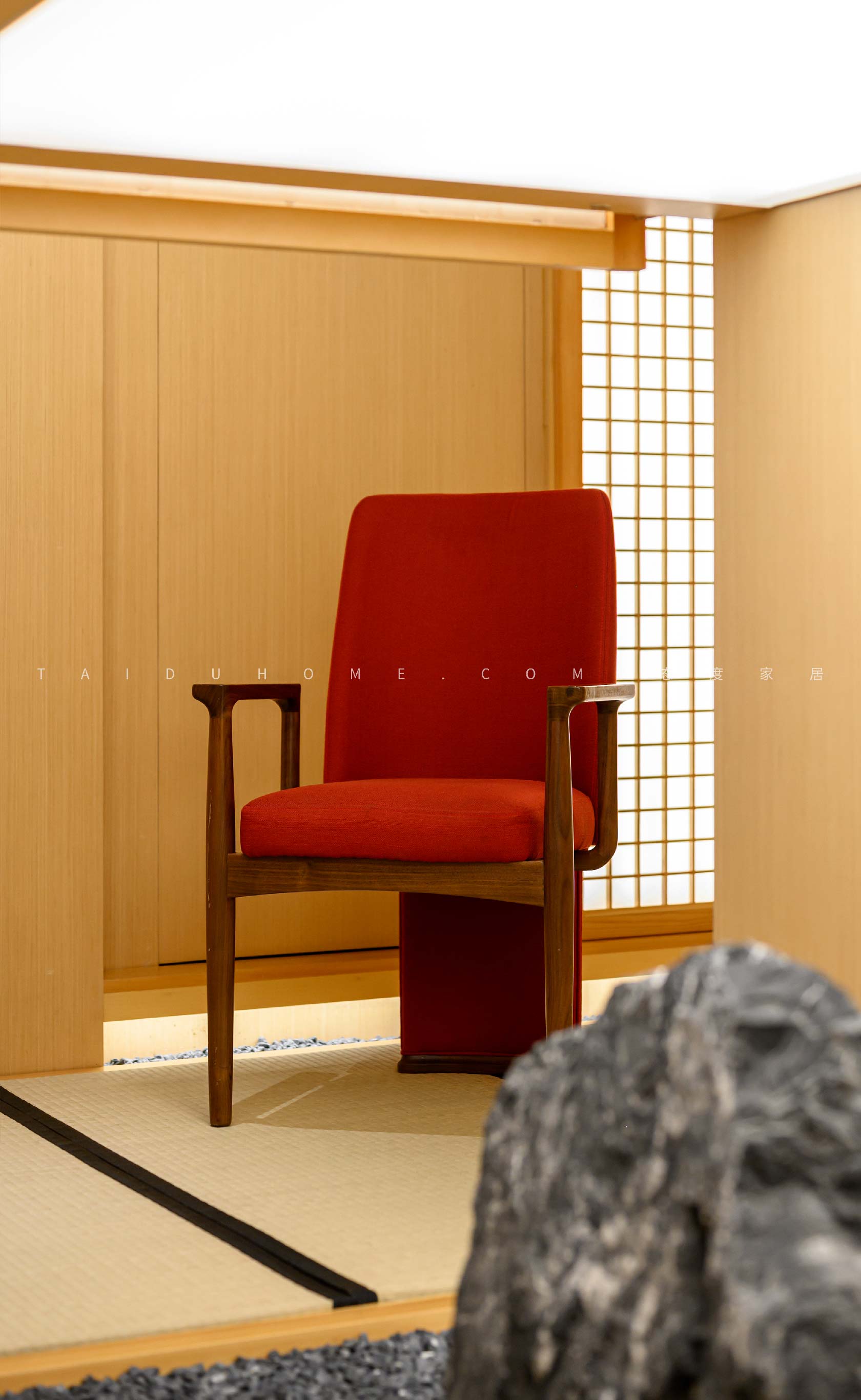 红色的诚鮨椅,造型源于日本女性的和服,搭配富贵龍吟极致的包厢空间,原木长桌与红色椅背的映衬更凸显富贵之气。