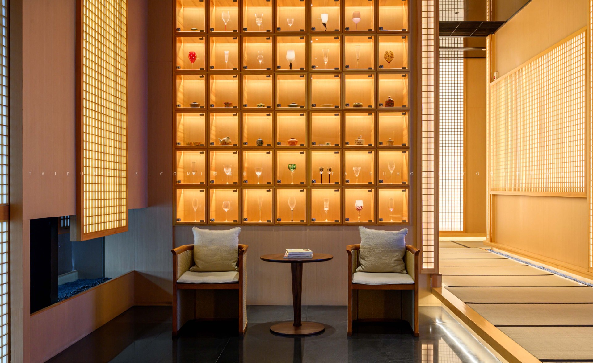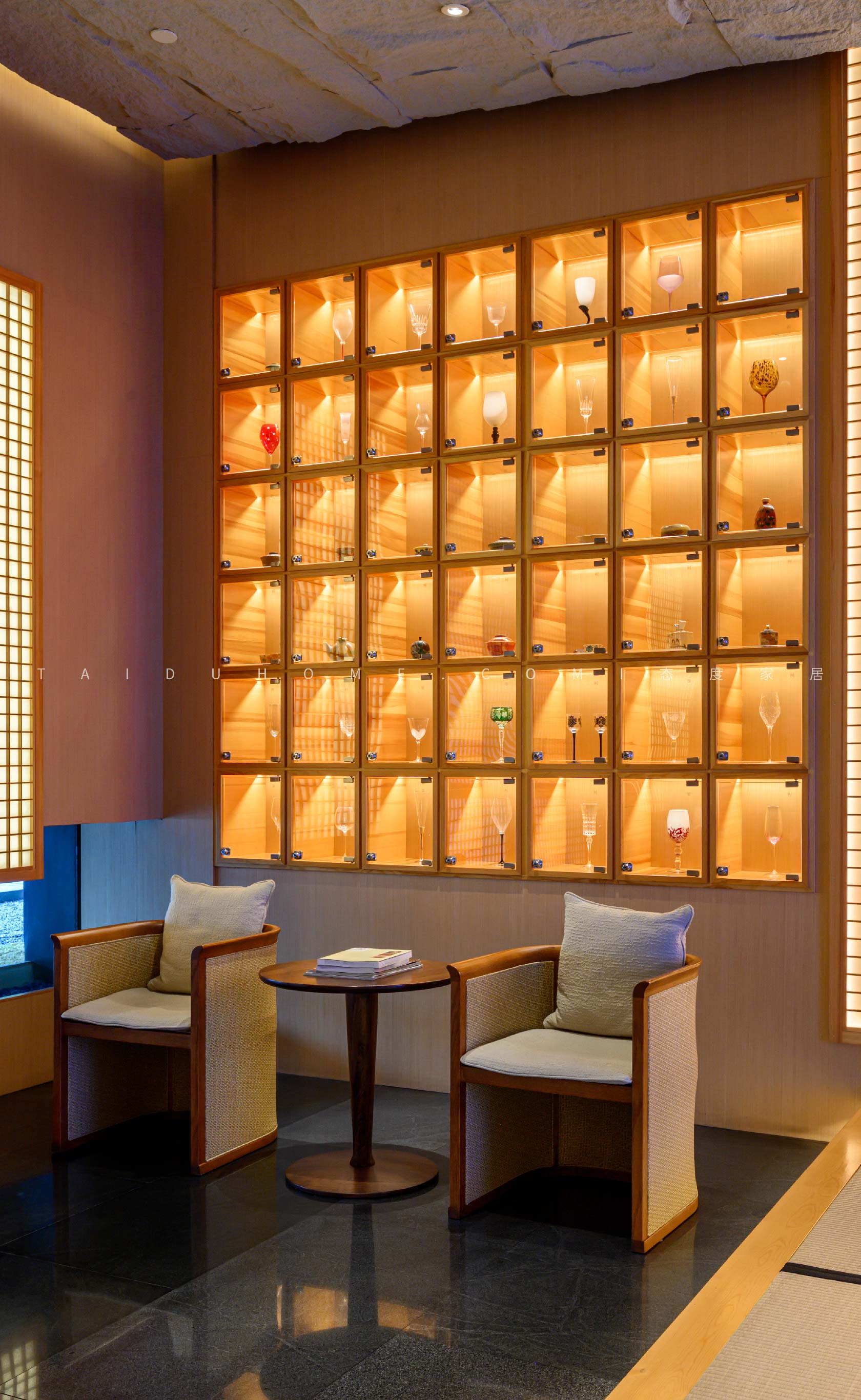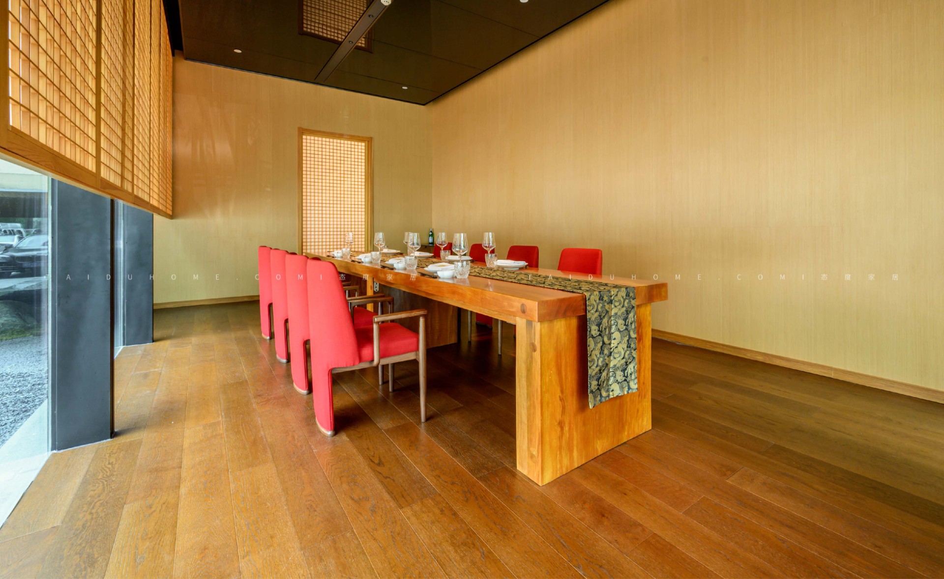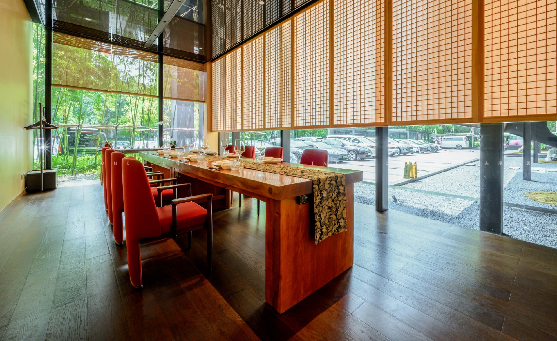 红色的诚鮨椅,造型源于日本女性的和服,搭配富贵龍吟极致的包厢空间,原木长桌与红色椅背的映衬更凸显富贵之气。