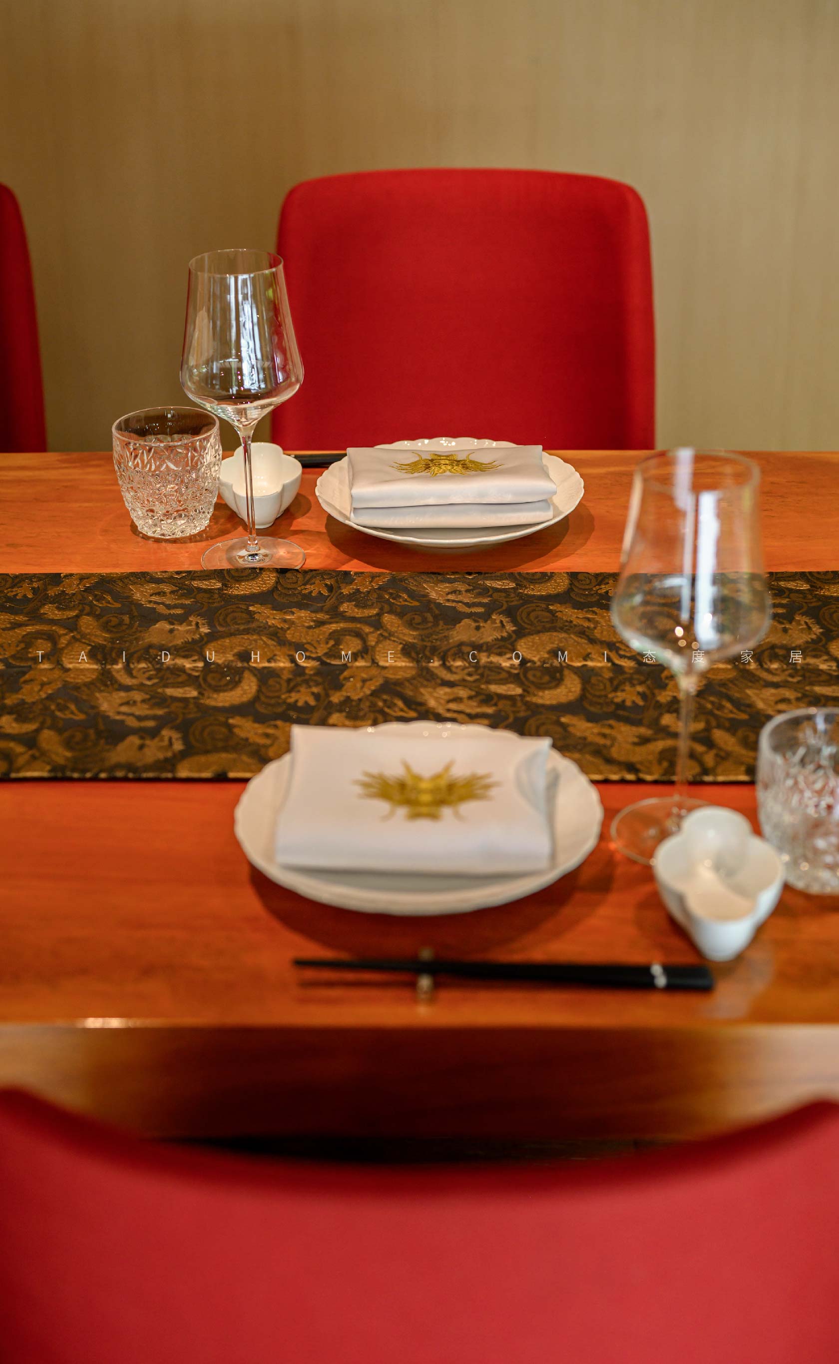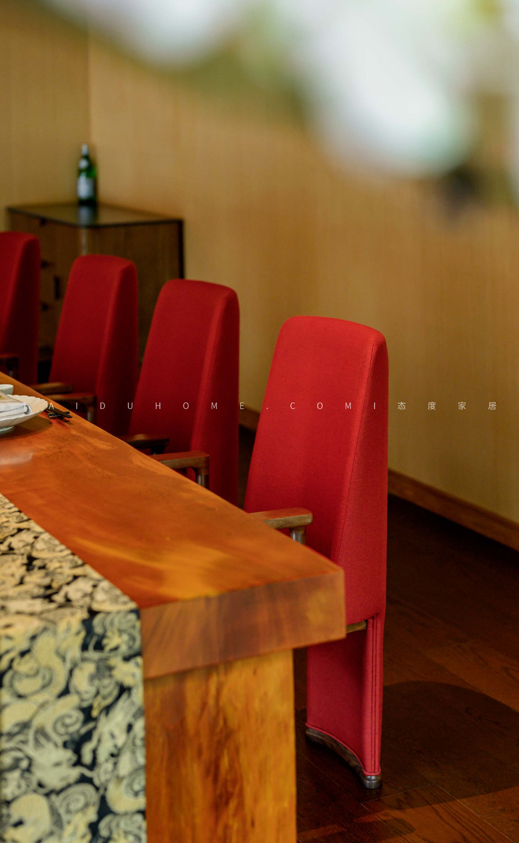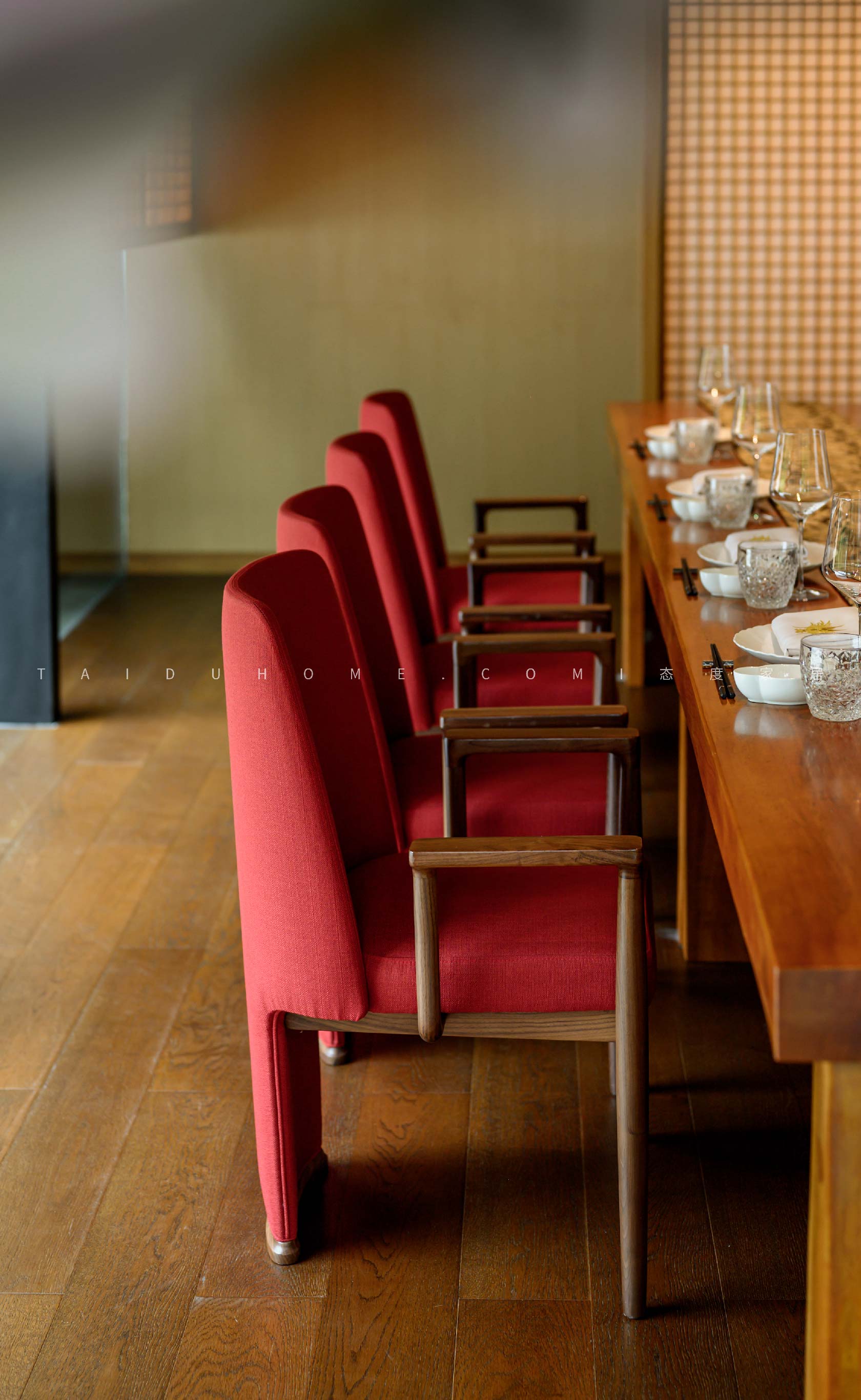 The red Chengshu chair, inspired by Japanese women's kimono, is paired with the ultimate private room space of Fugui Longyin. The contrast between the wooden long table and the red chair back highlights the aura of wealth and nobility.