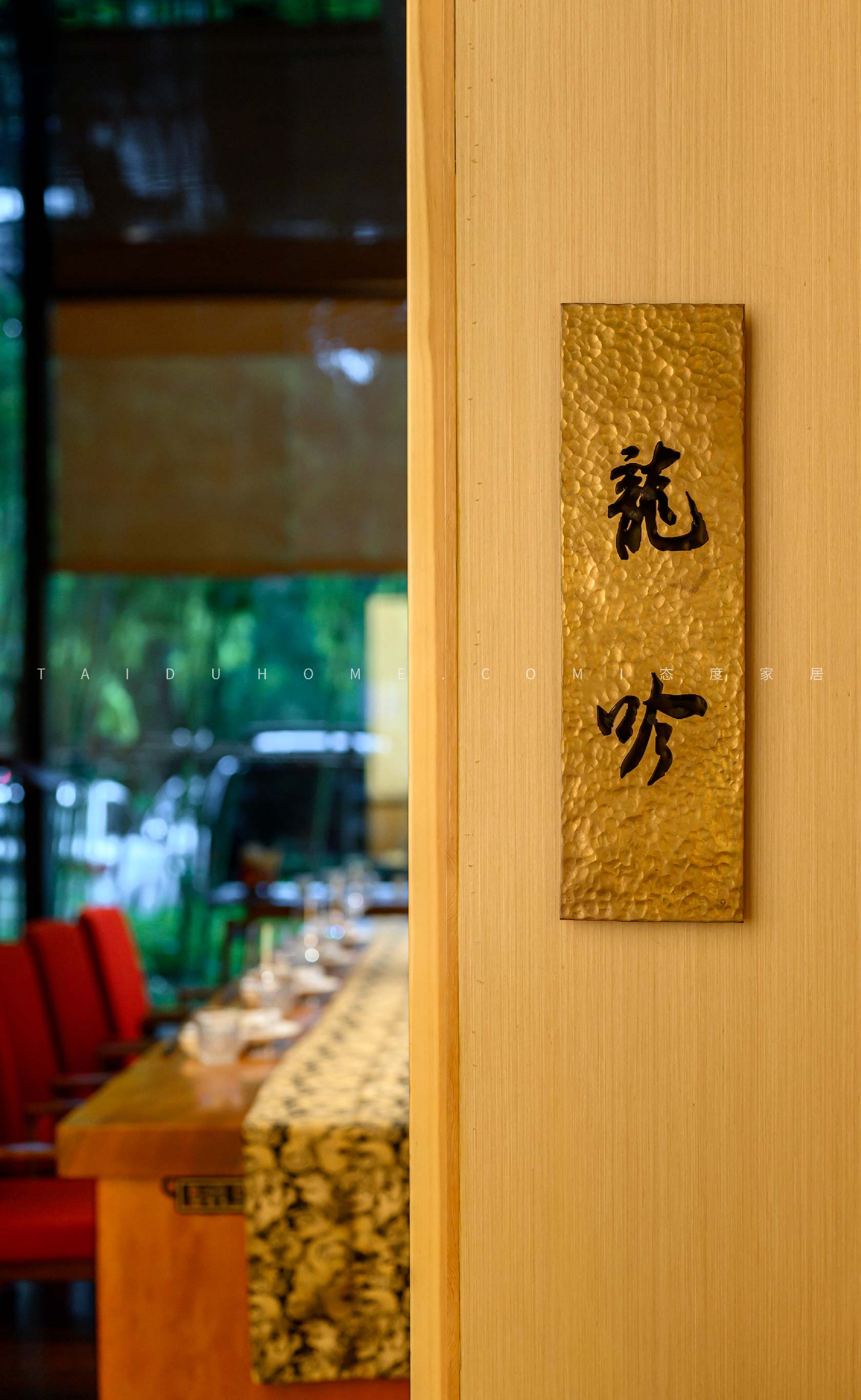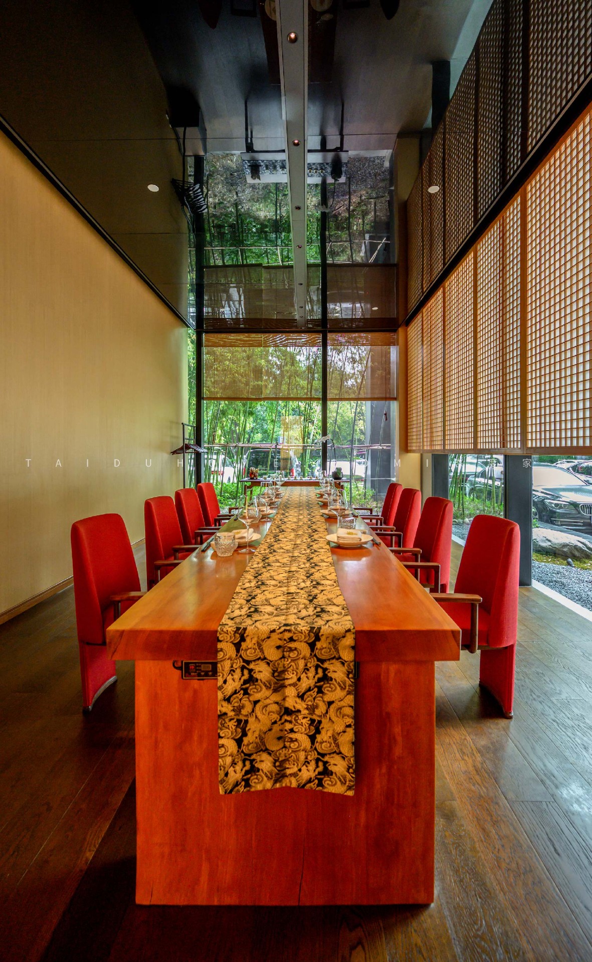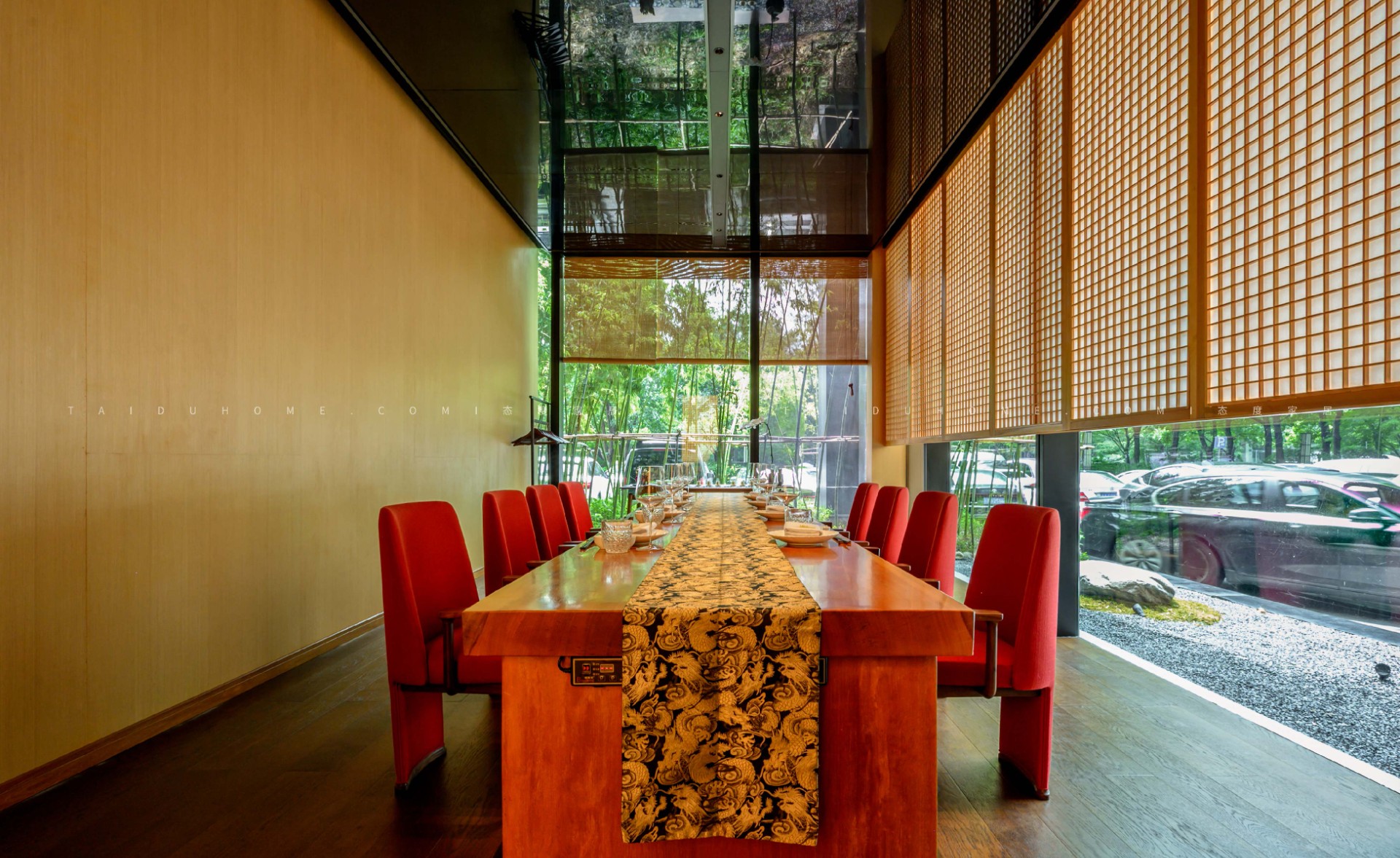 The red Chengshu chair, inspired by Japanese women's kimono, is paired with the ultimate private room space of Fugui Longyin. The contrast between the wooden long table and the red chair back highlights the aura of wealth and nobility.