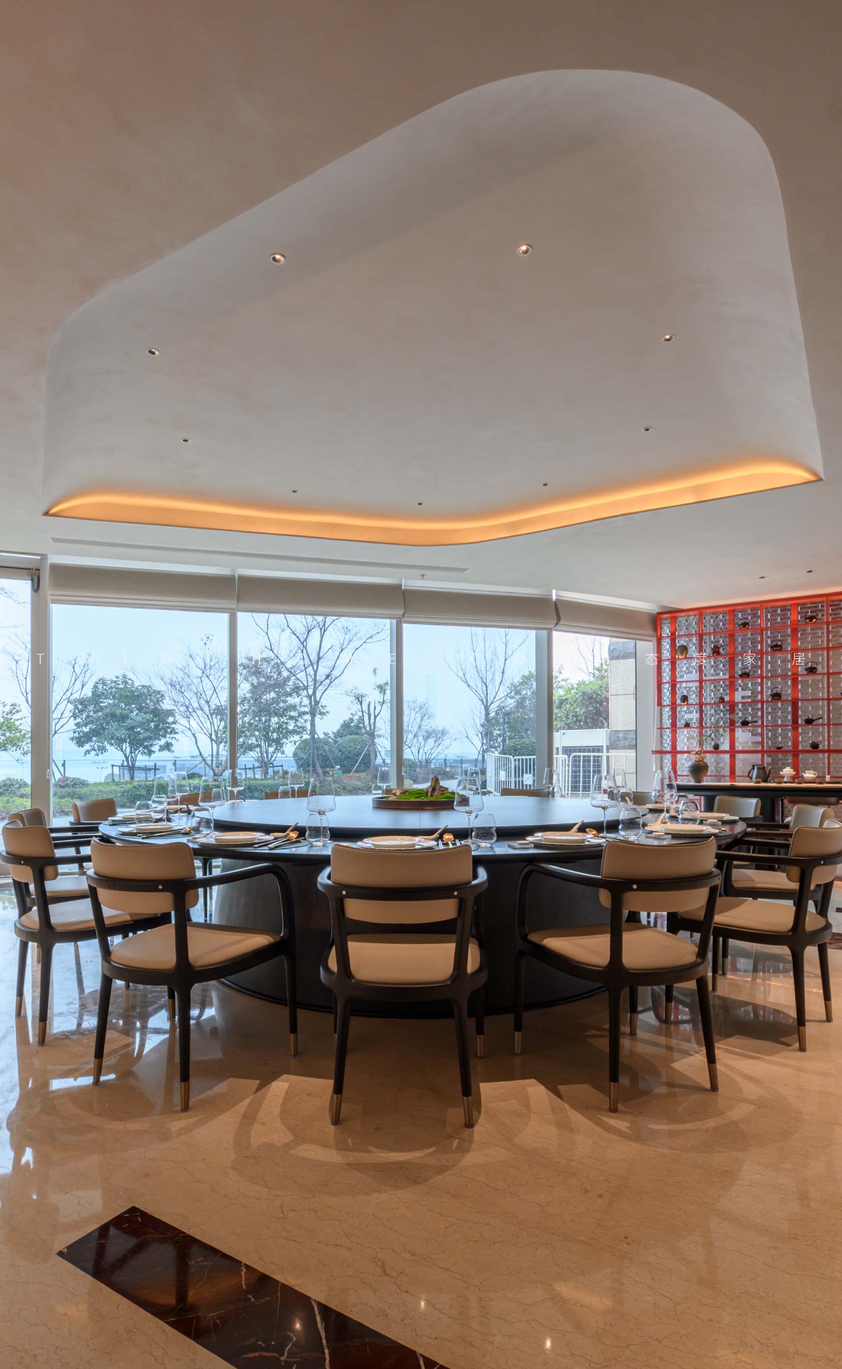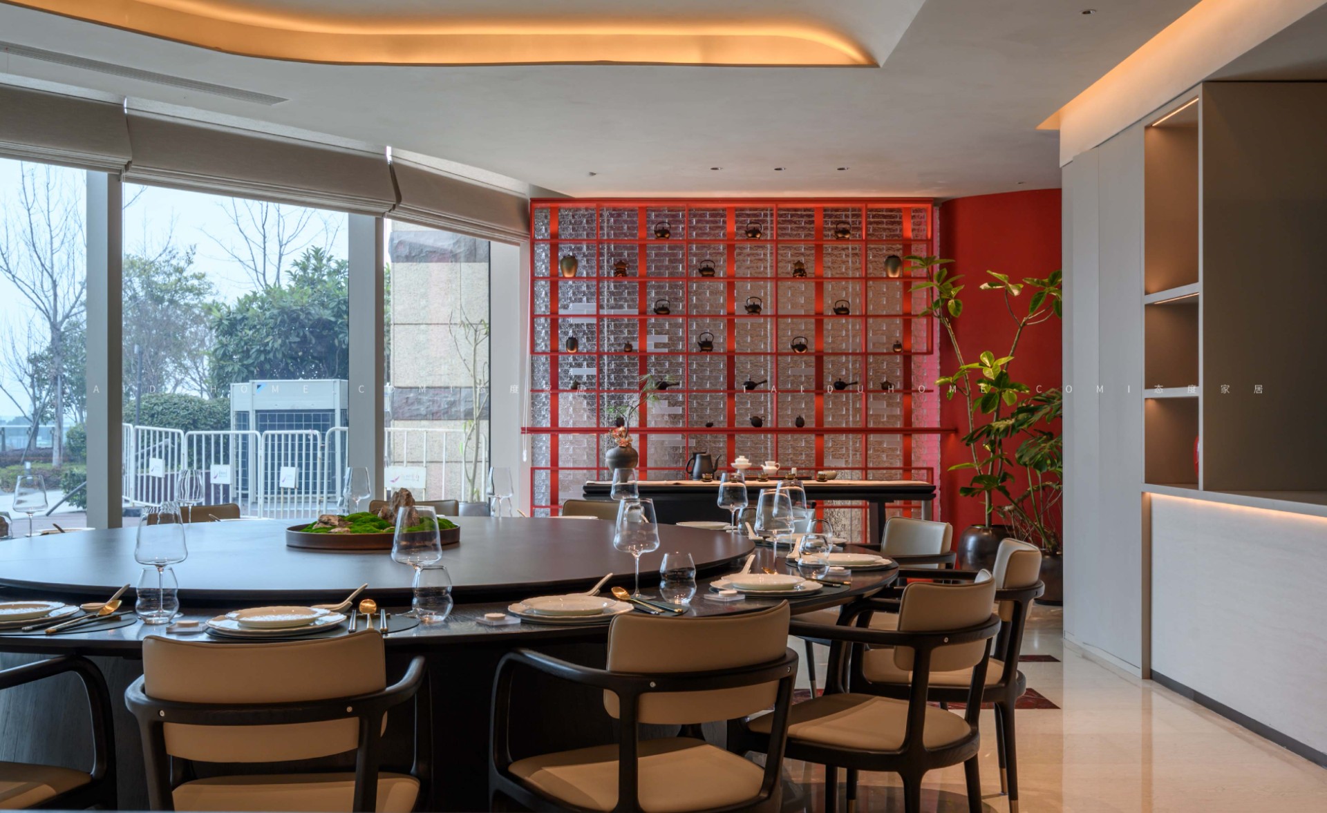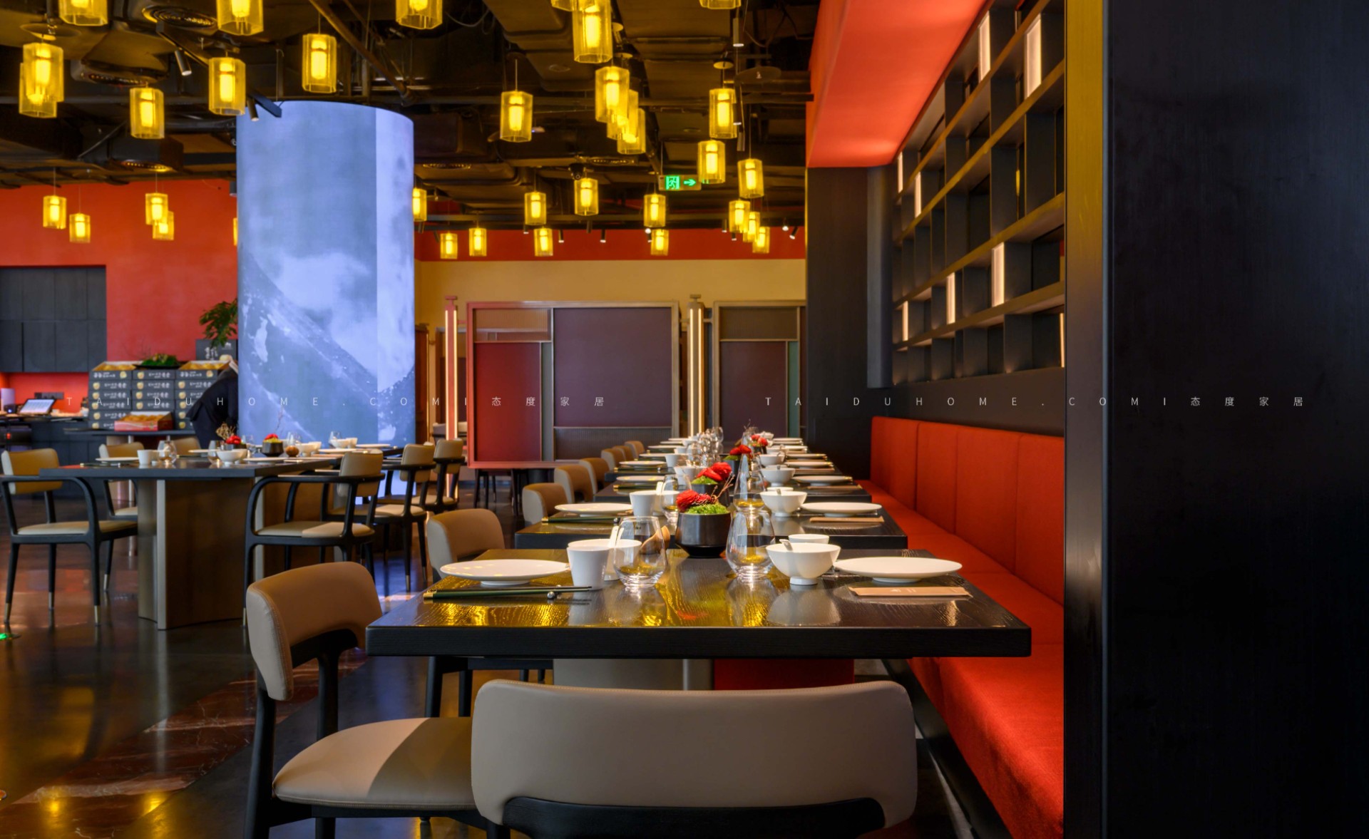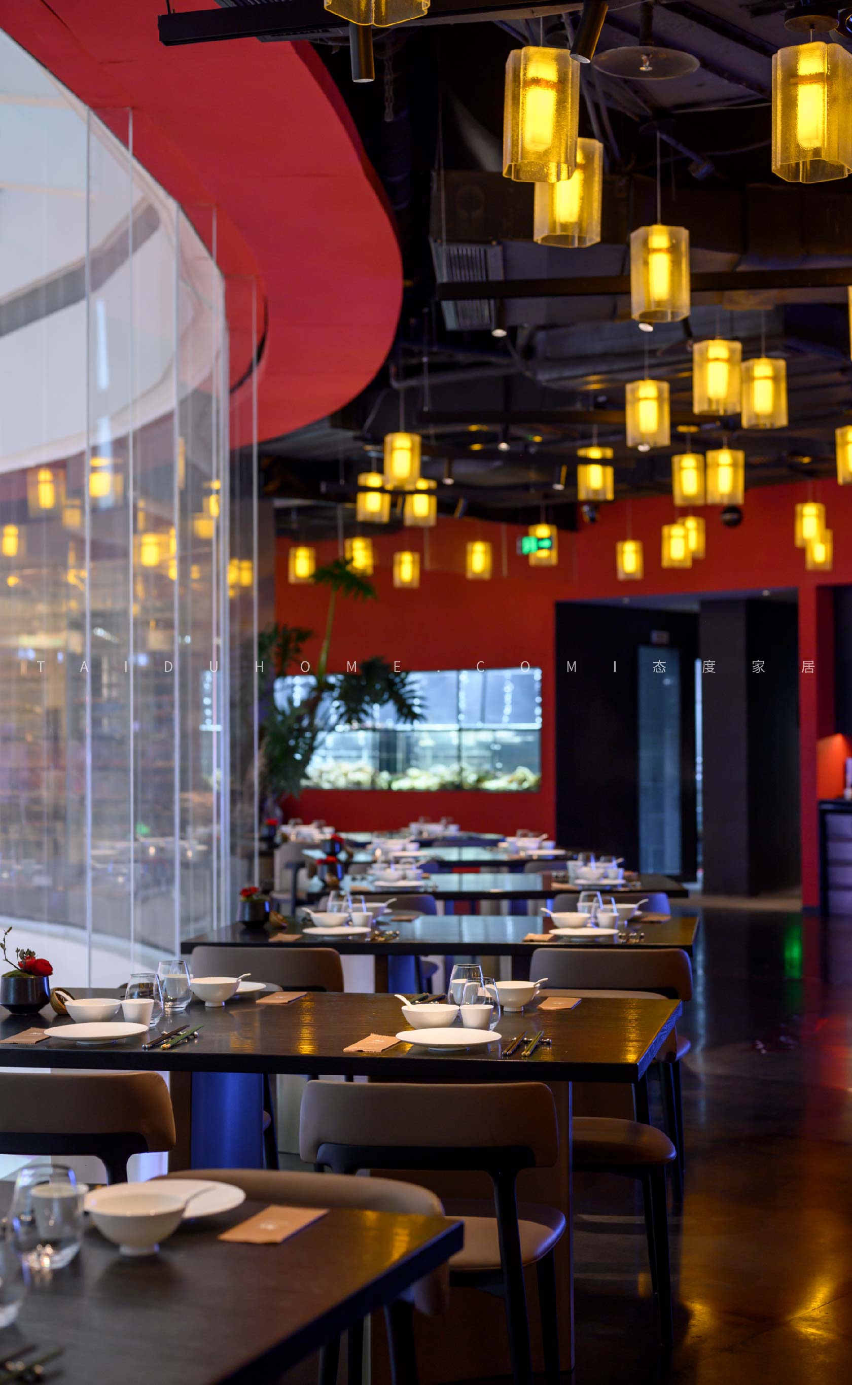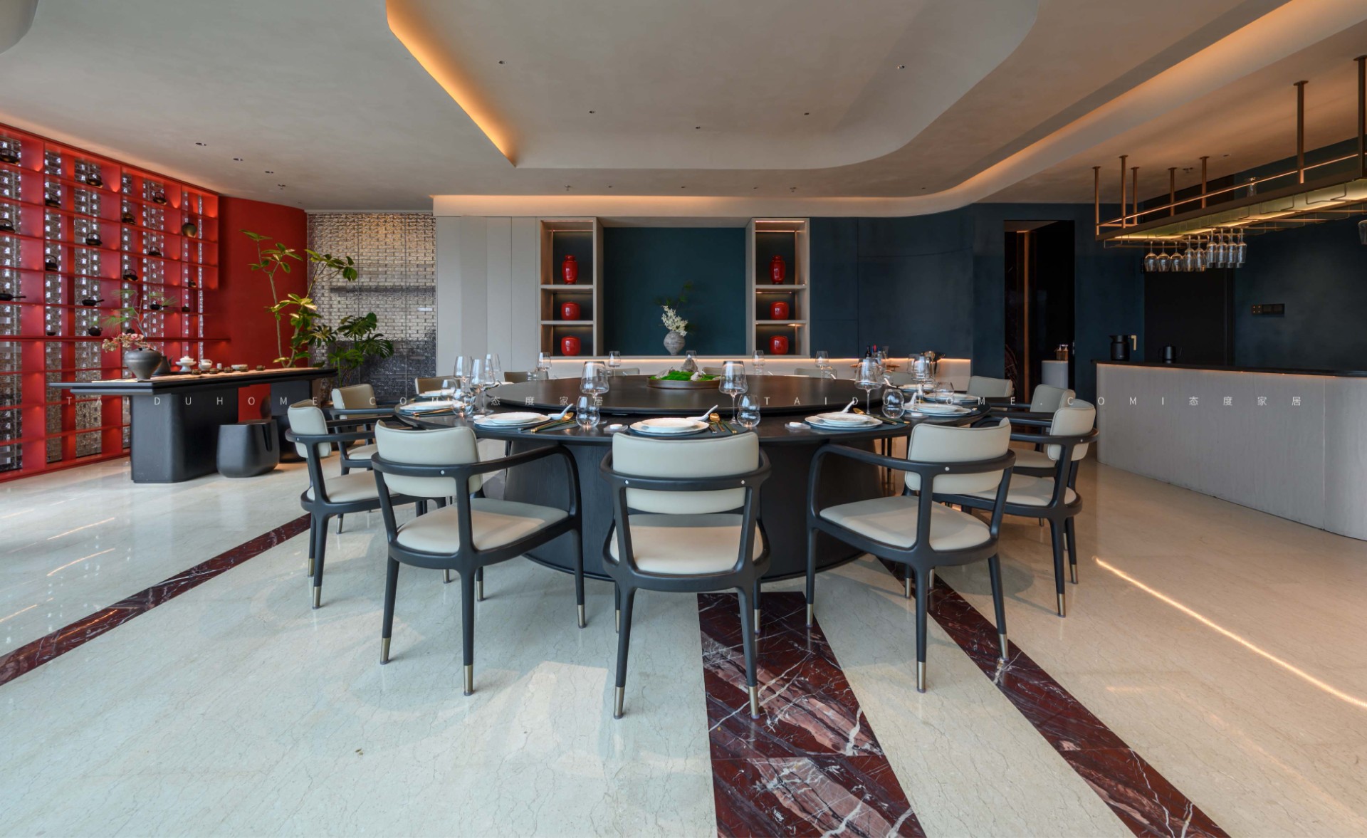 The designer extracted the precious red cherry blossom as the main color tone from the "Wangchuan Map", paired with the blue and blue color scheme representing the mountains and rivers. The dining space uses elements such as green plants and flowing water lanterns to create a peaceful, harmonious, and lively scene of the prosperous Tang Dynasty.