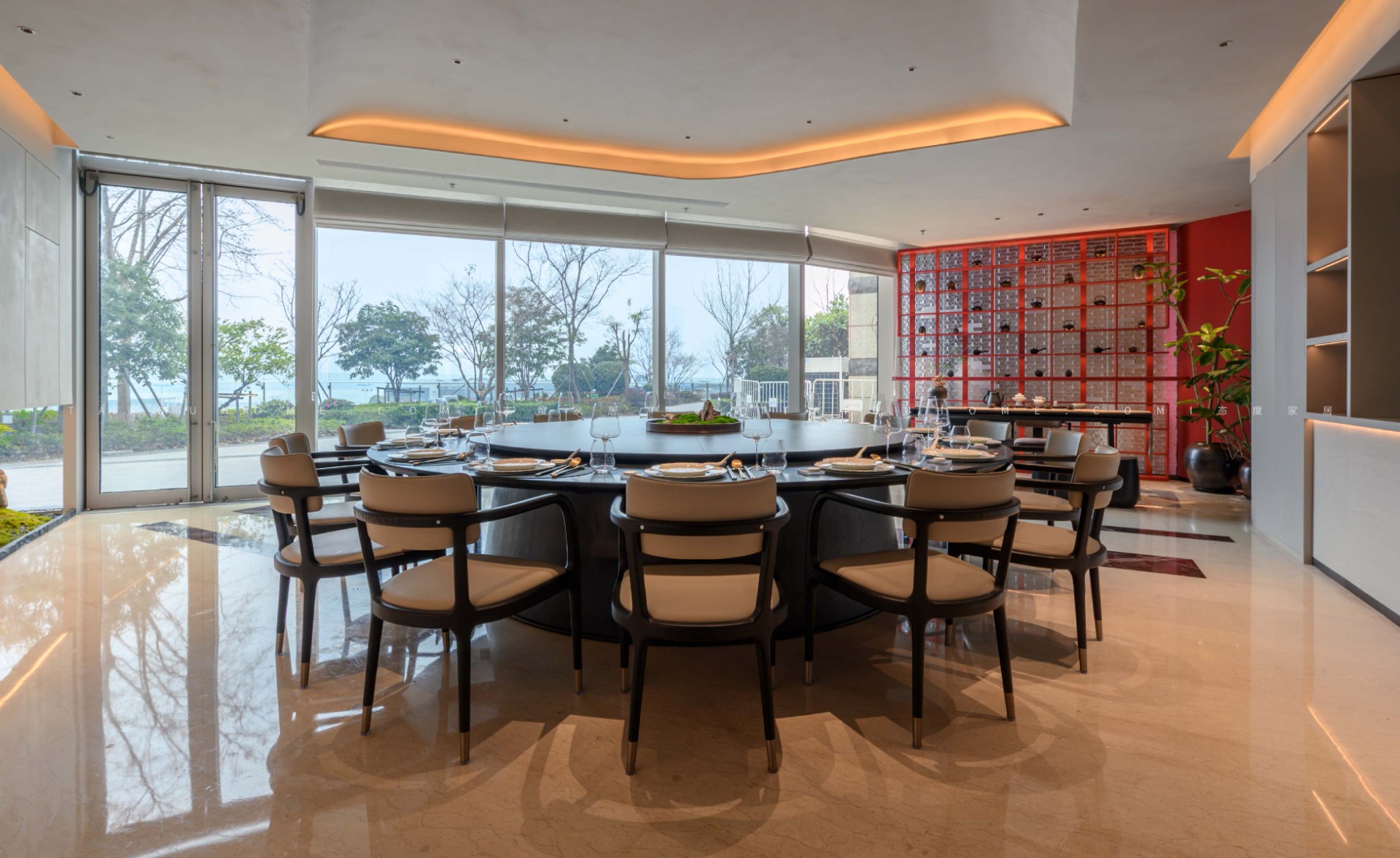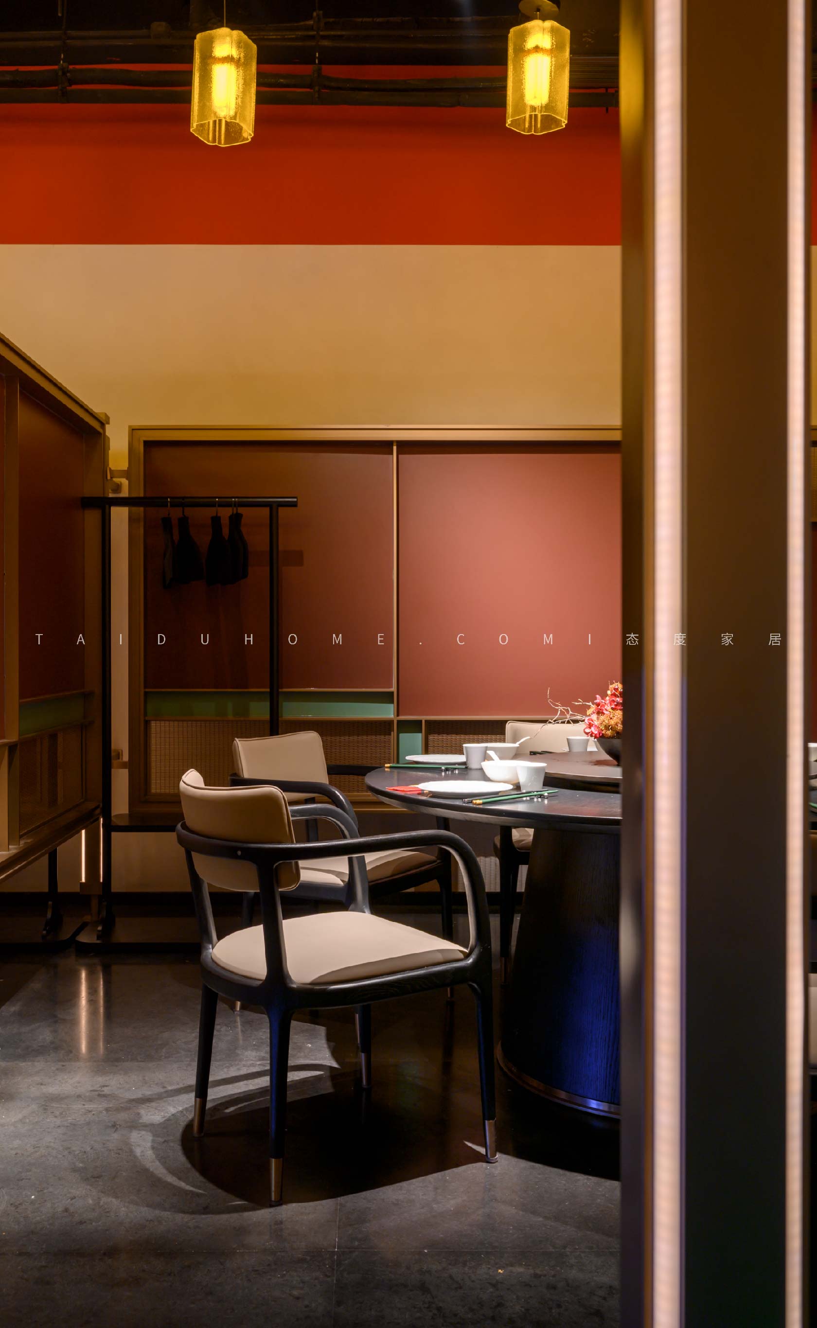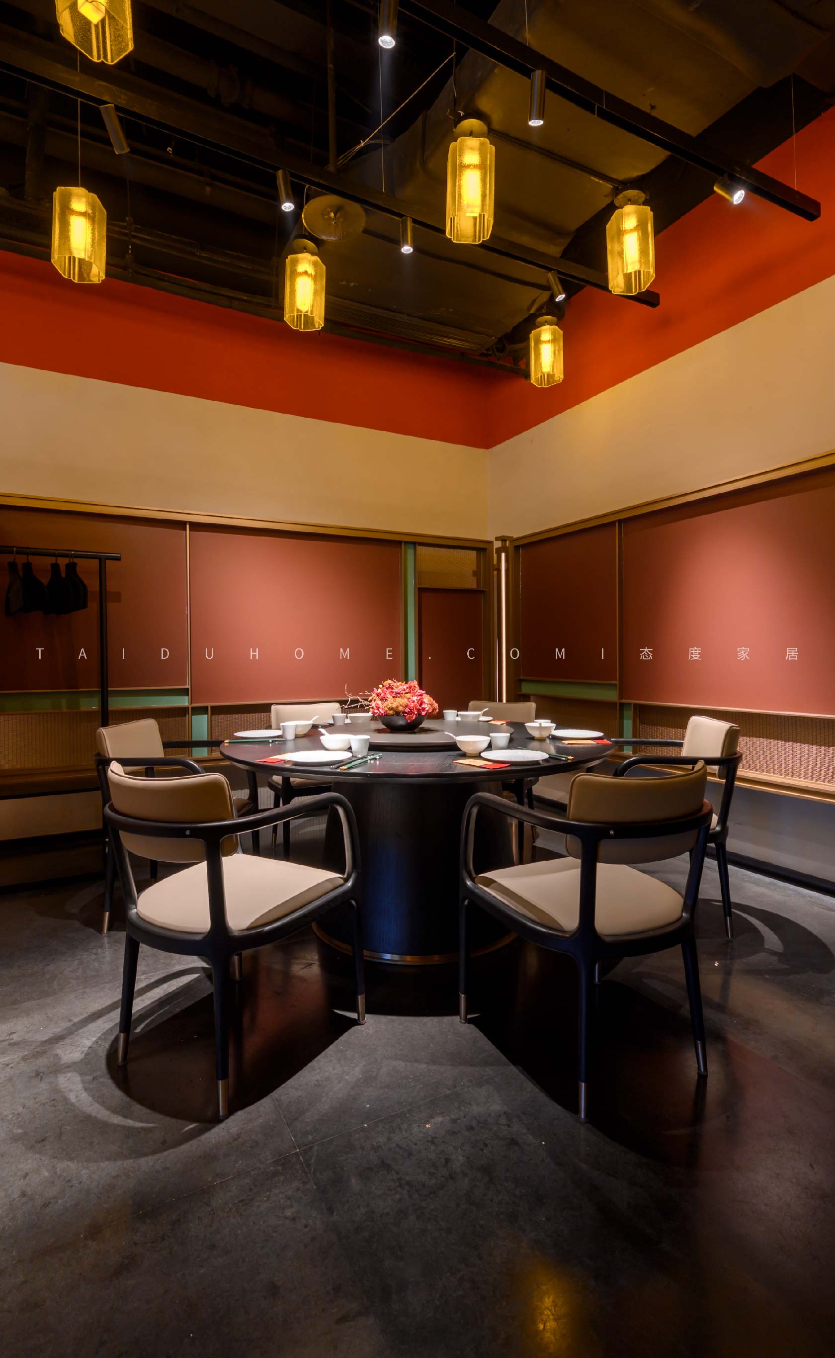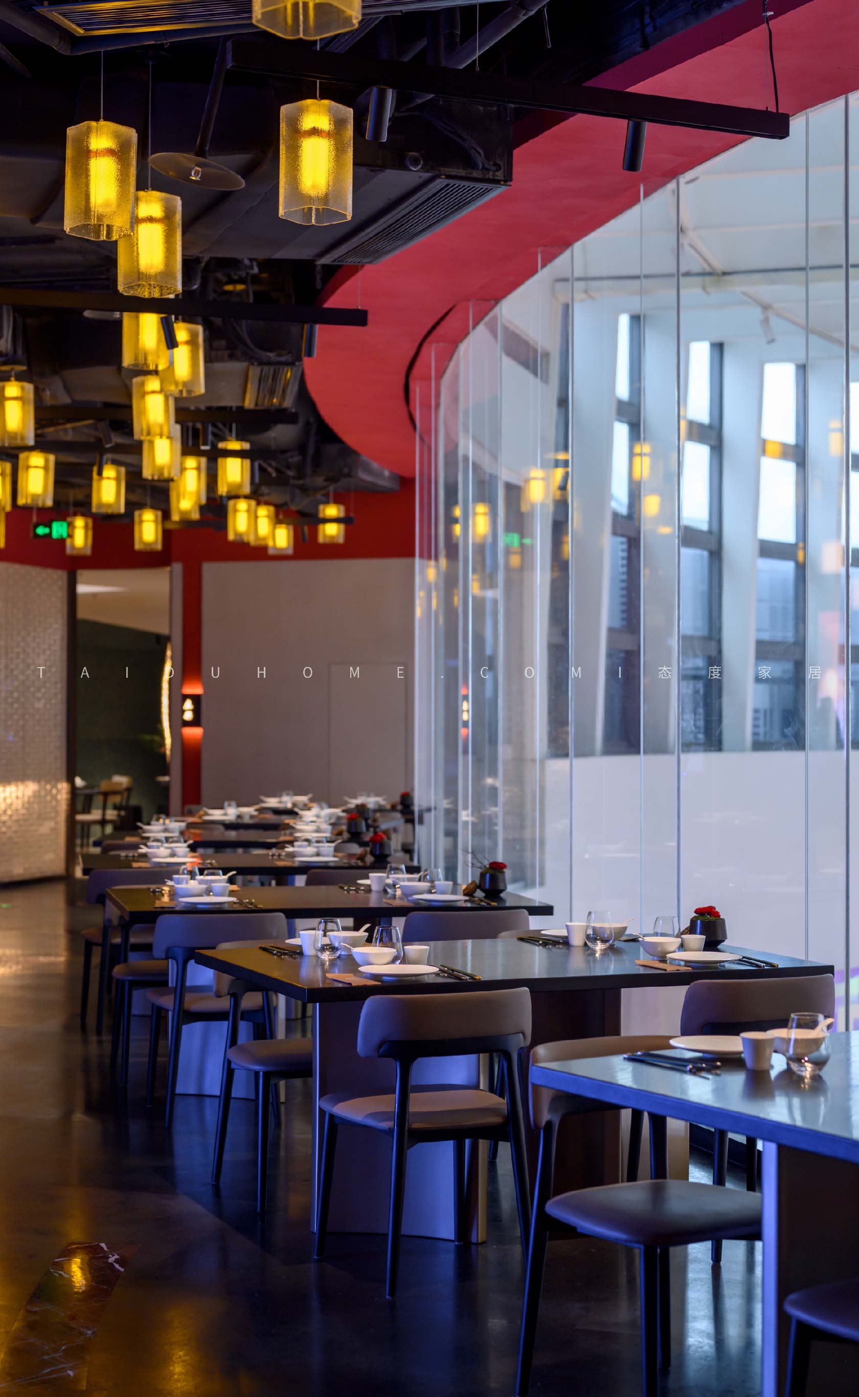 The designer extracted the precious red cherry blossom as the main color tone from the "Wangchuan Map", paired with the blue and blue color scheme representing the mountains and rivers. The dining space uses elements such as green plants and flowing water lanterns to create a peaceful, harmonious, and lively scene of the prosperous Tang Dynasty.