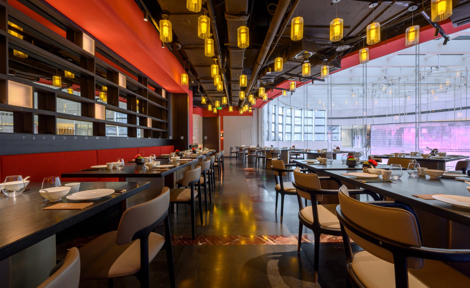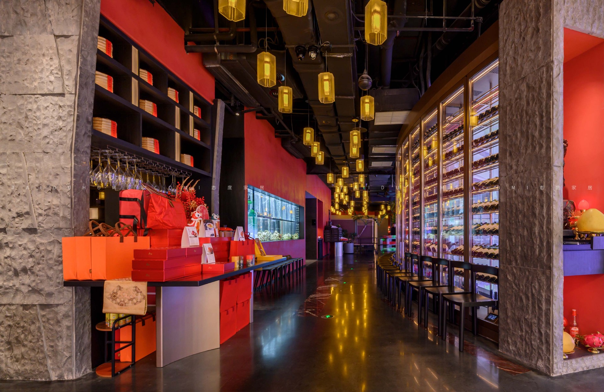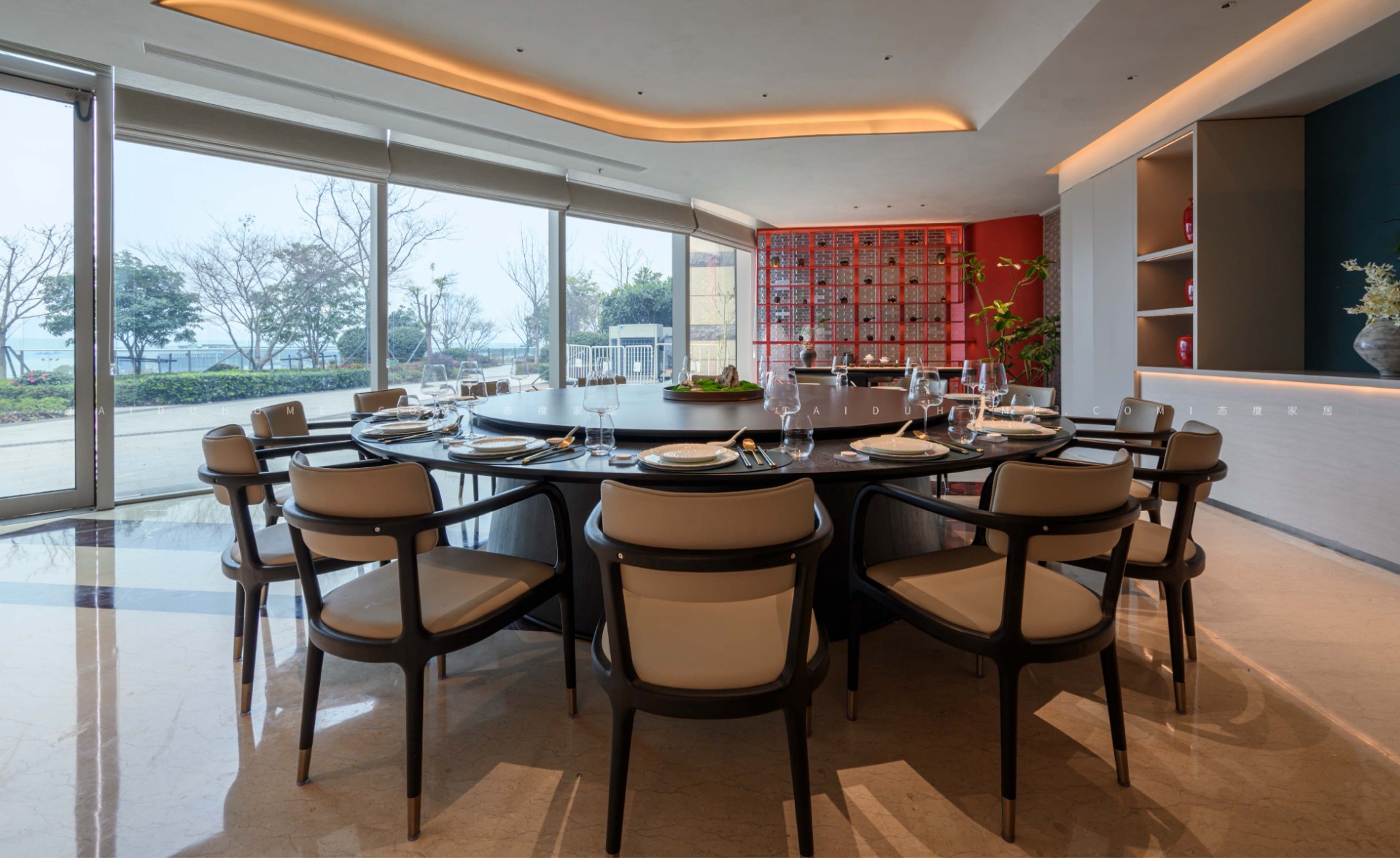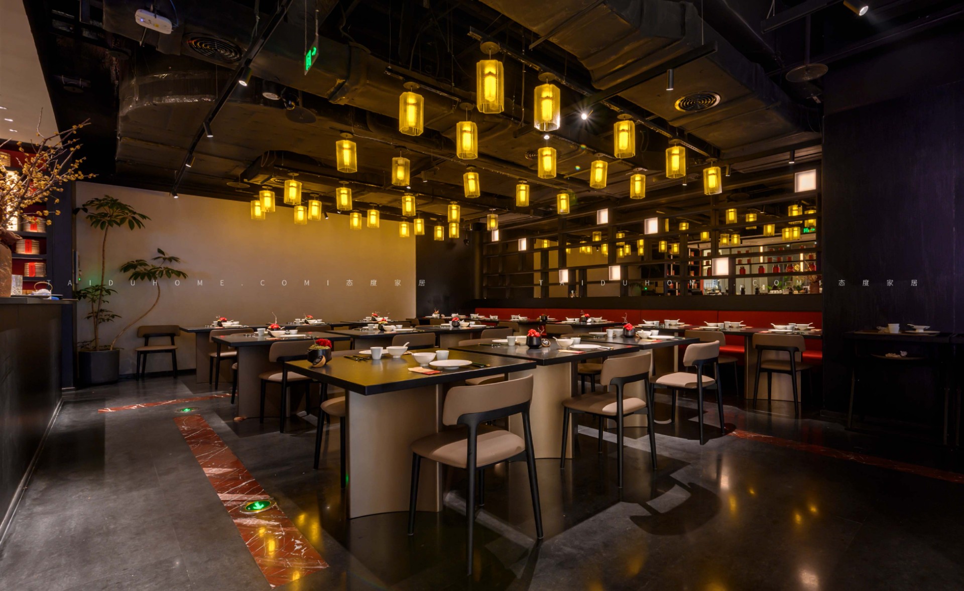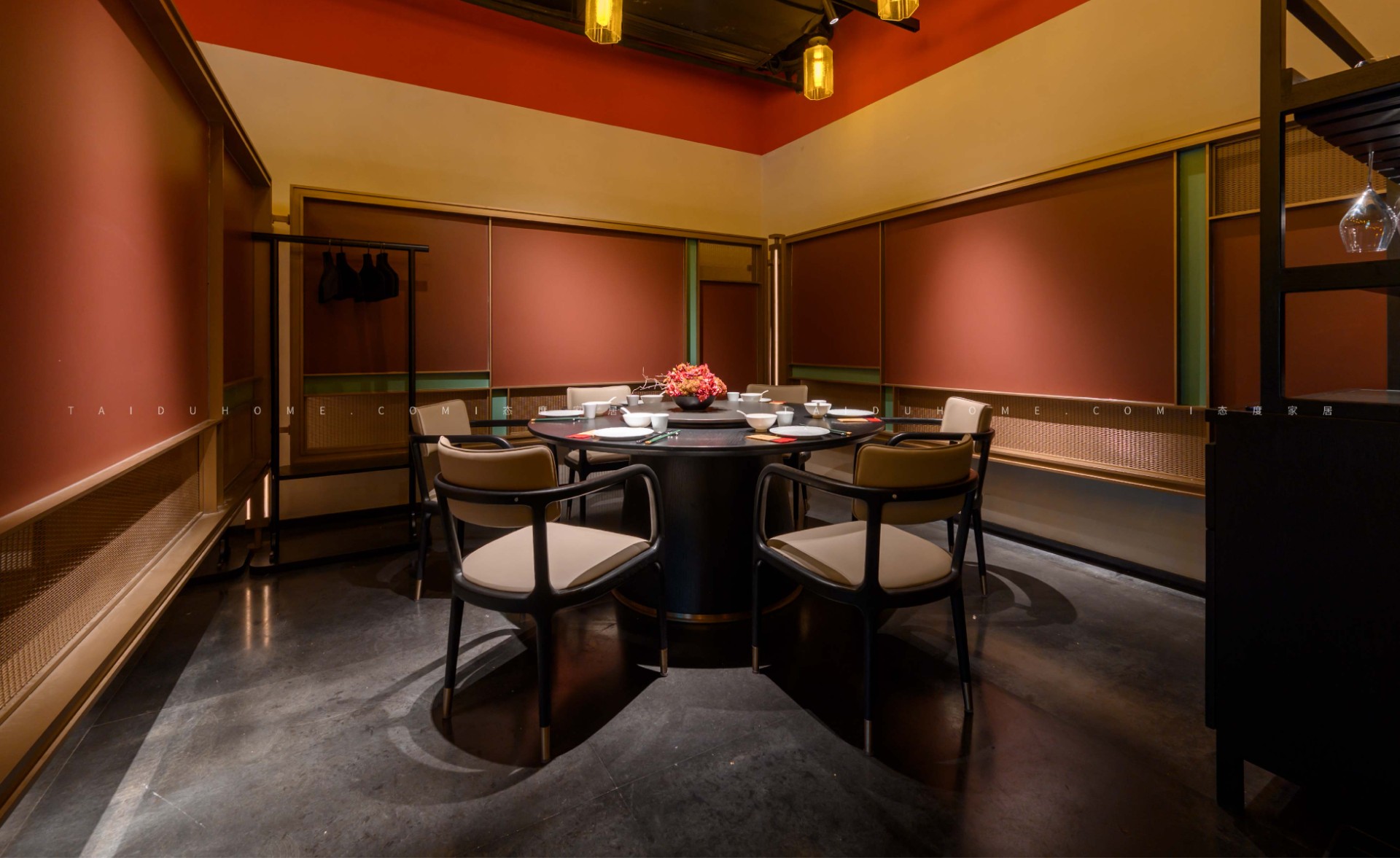 The designer extracted the precious red cherry blossom as the main color tone from the "Wangchuan Map", paired with the blue and blue color scheme representing the mountains and rivers. The dining space uses elements such as green plants and flowing water lanterns to create a peaceful, harmonious, and lively scene of the prosperous Tang Dynasty.