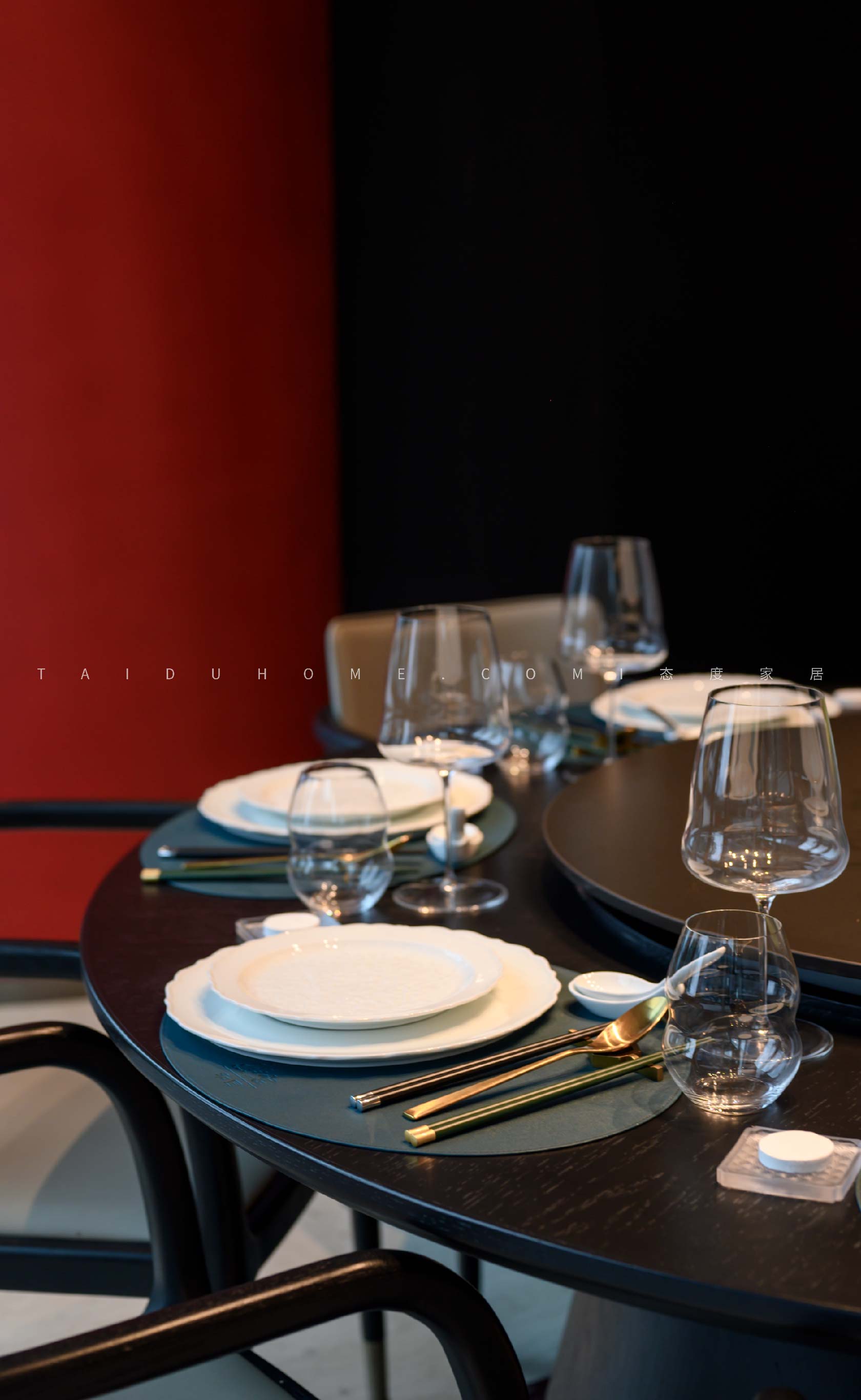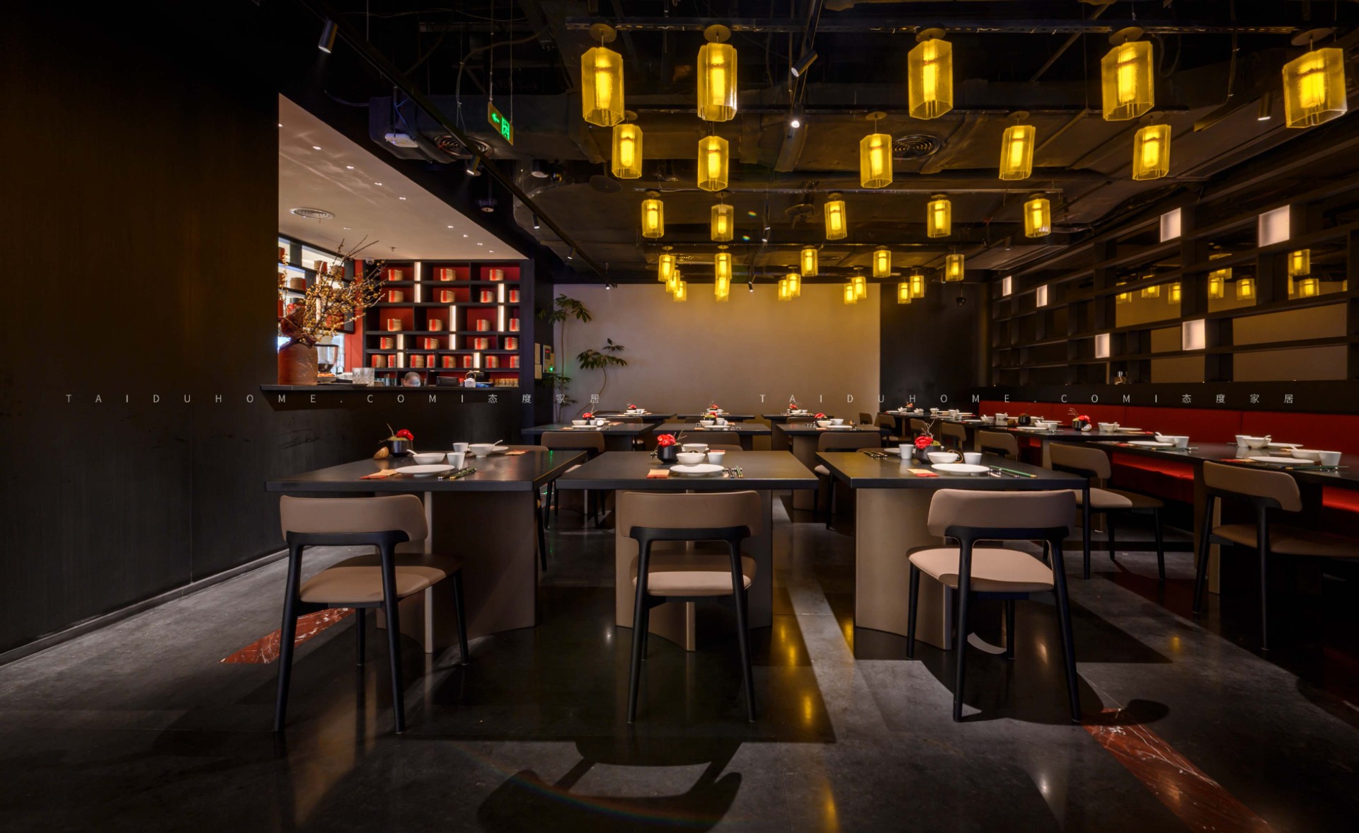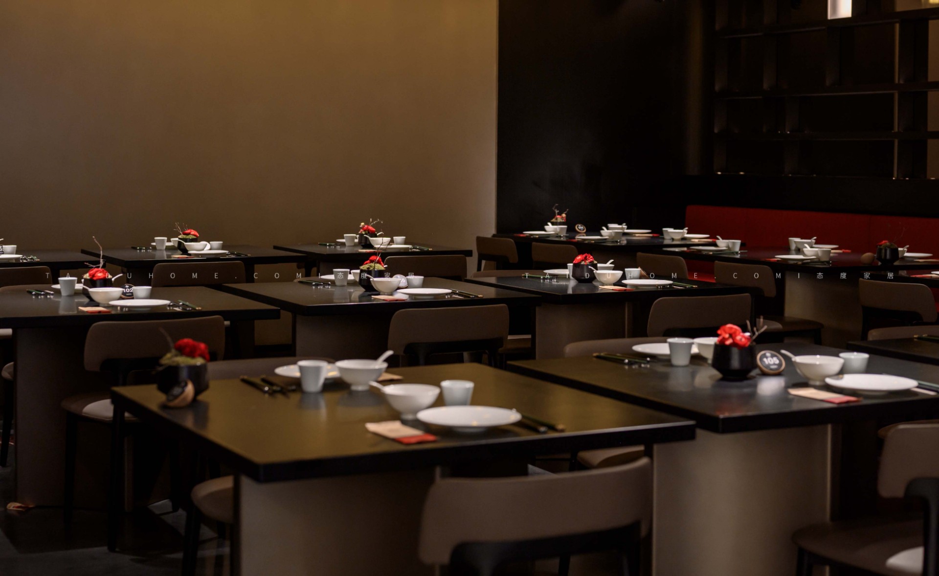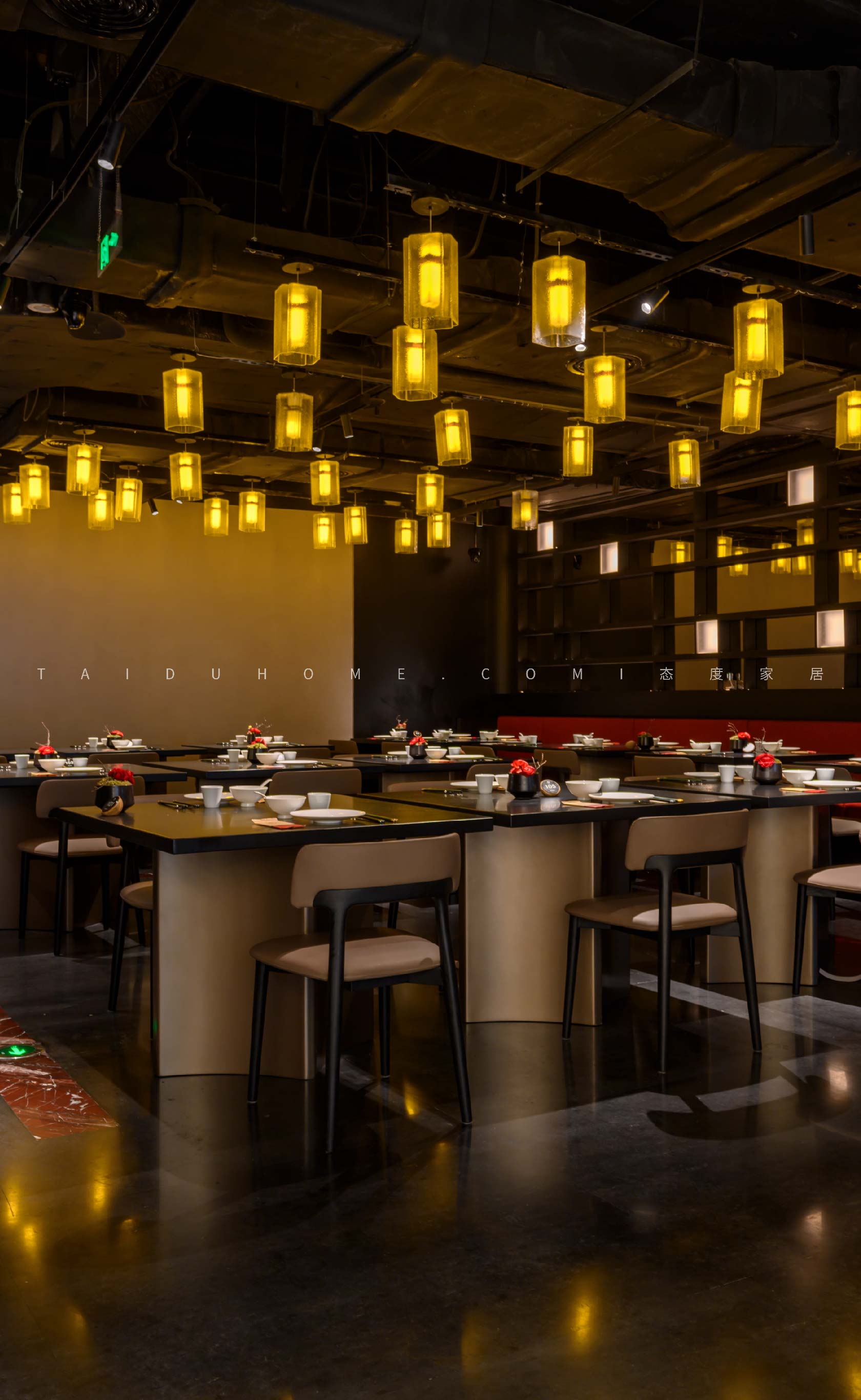 The designer extracted the precious red cherry blossom as the main color tone from the "Wangchuan Map", paired with the blue and blue color scheme representing the mountains and rivers. The dining space uses elements such as green plants and flowing water lanterns to create a peaceful, harmonious, and lively scene of the prosperous Tang Dynasty.