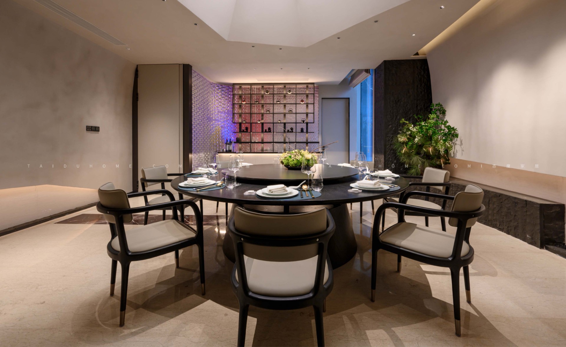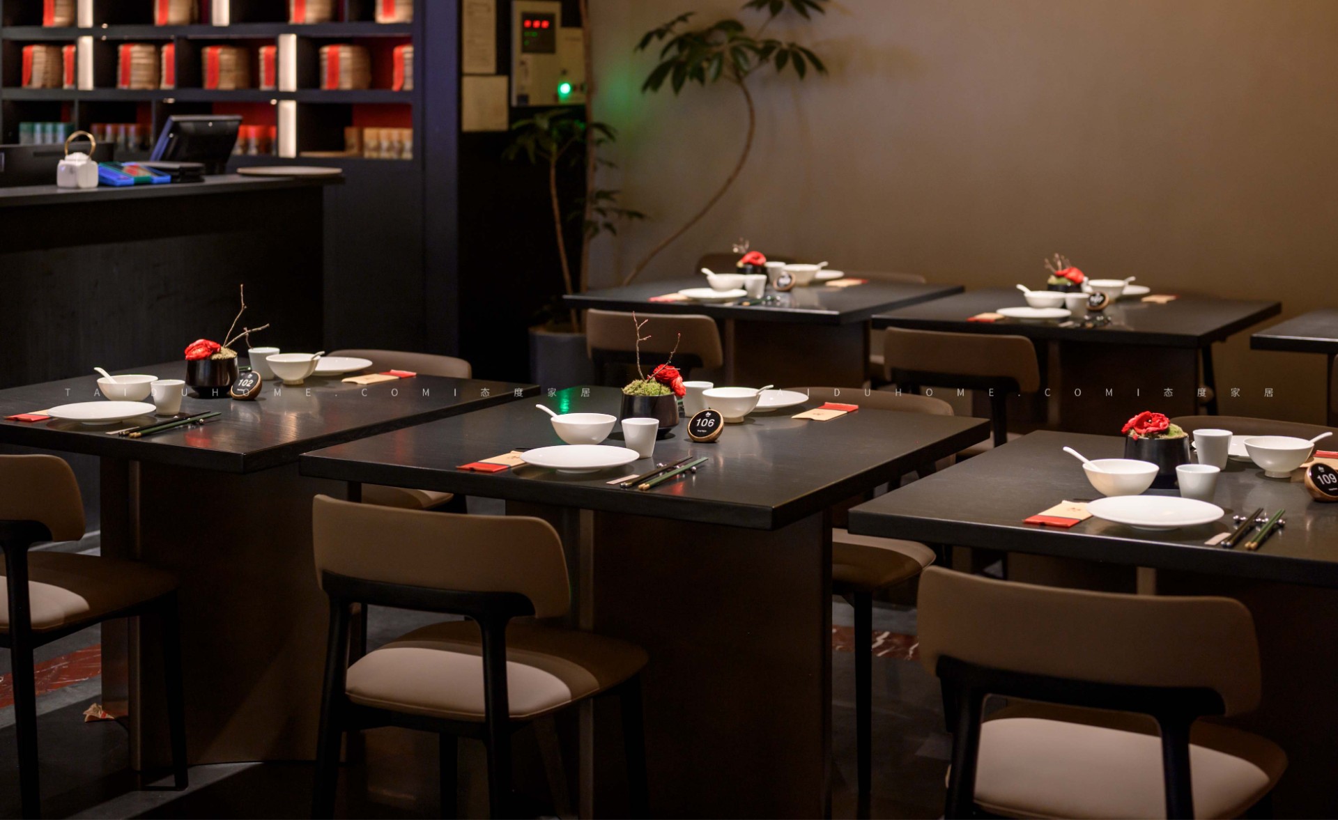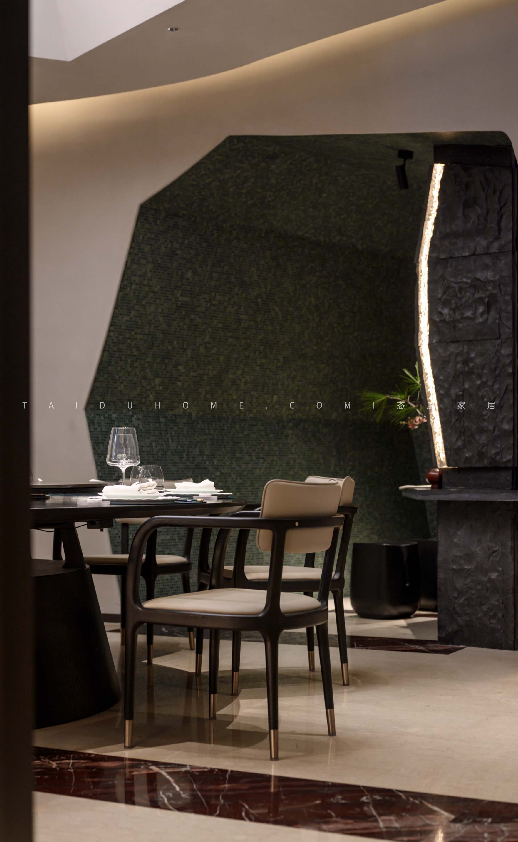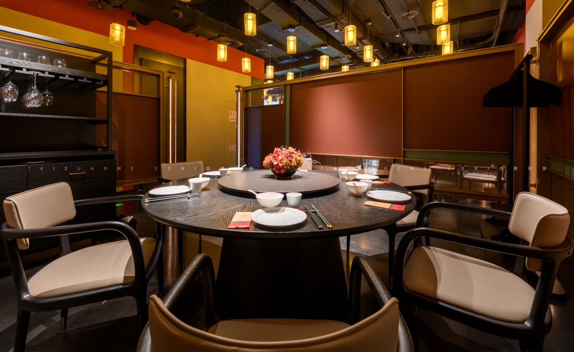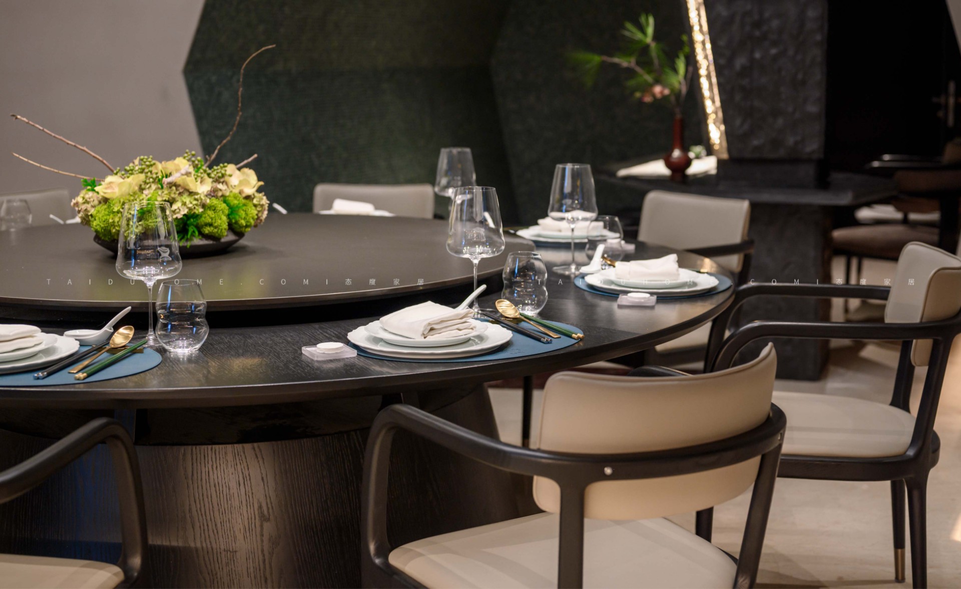 The designer extracted the precious red cherry blossom as the main color tone from the "Wangchuan Map", paired with the blue and blue color scheme representing the mountains and rivers. The dining space uses elements such as green plants and flowing water lanterns to create a peaceful, harmonious, and lively scene of the prosperous Tang Dynasty.