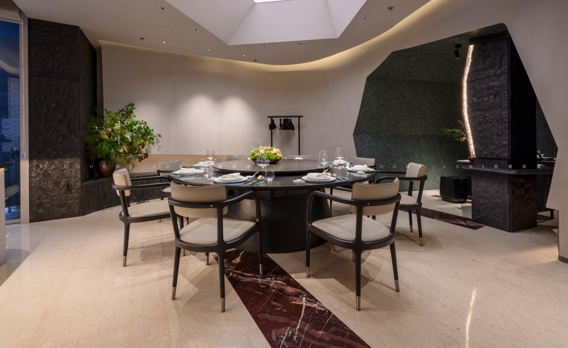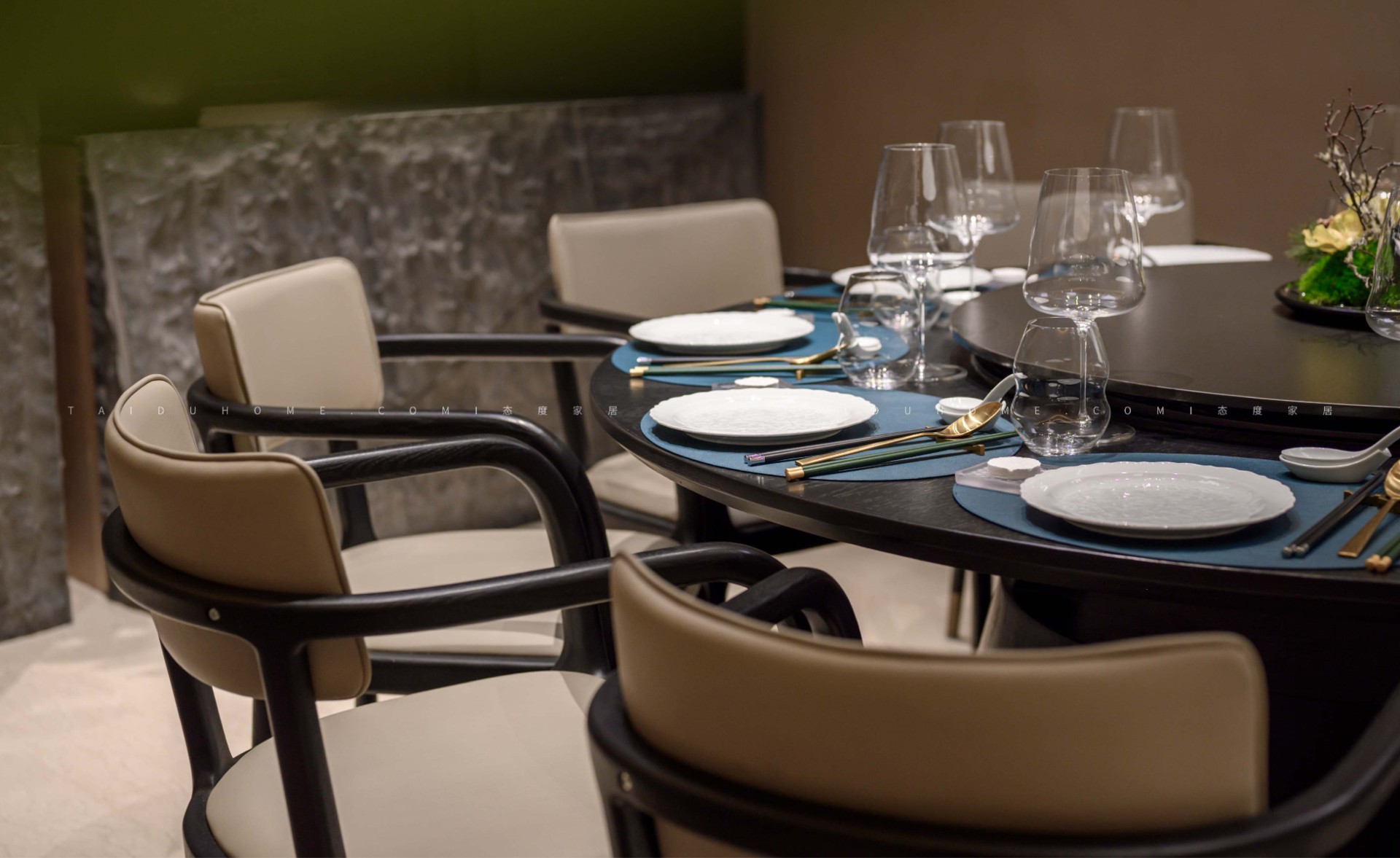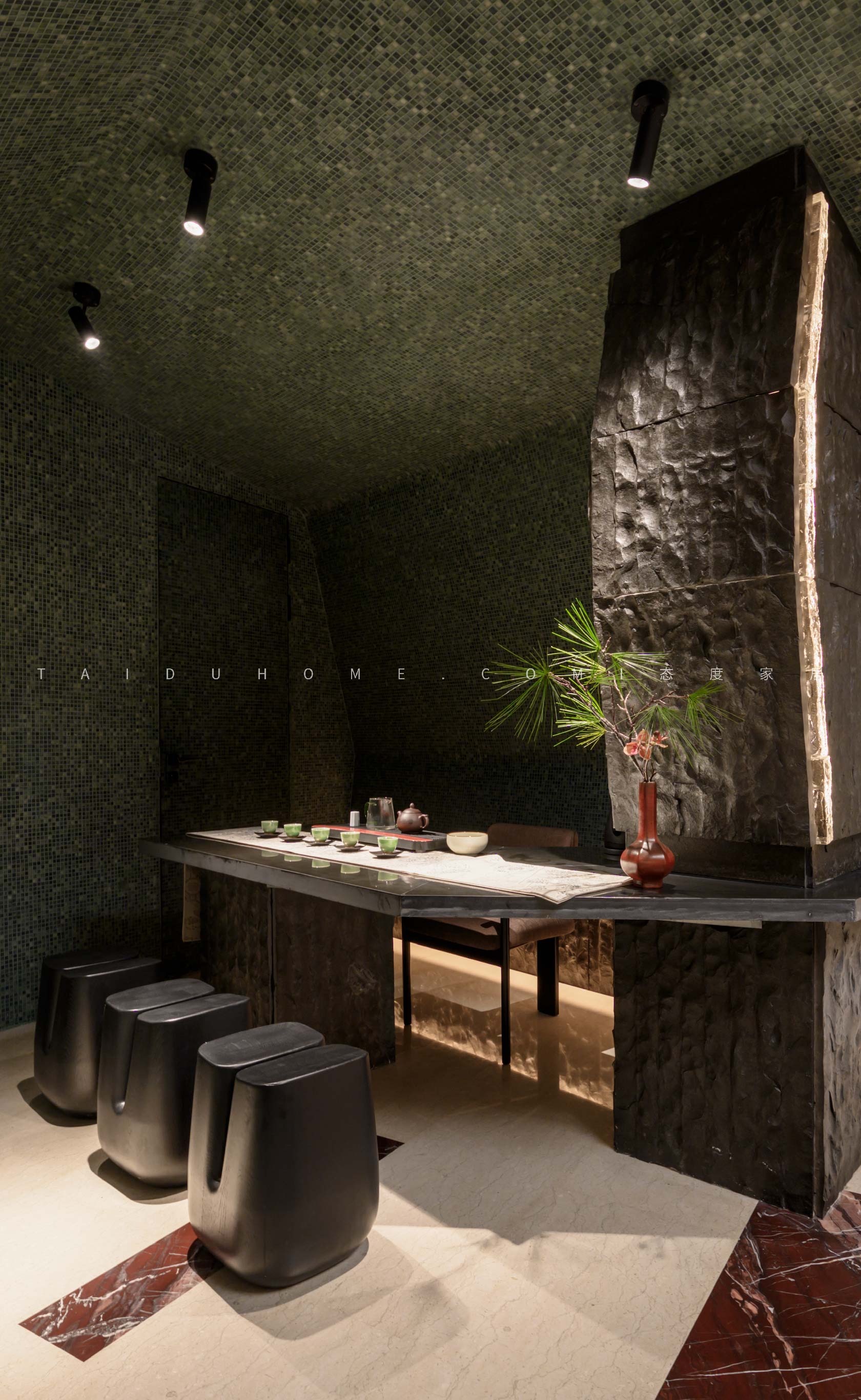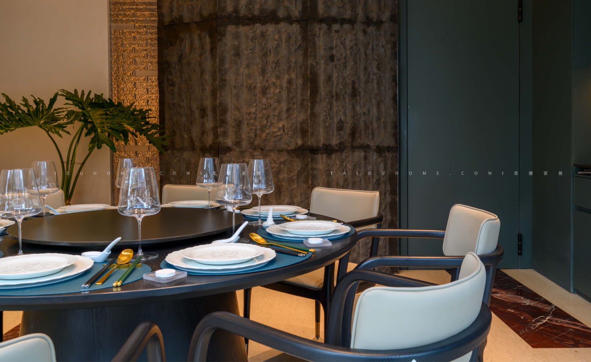 The designer extracted the precious red cherry blossom as the main color tone from the "Wangchuan Map", paired with the blue and blue color scheme representing the mountains and rivers. The dining space uses elements such as green plants and flowing water lanterns to create a peaceful, harmonious, and lively scene of the prosperous Tang Dynasty.