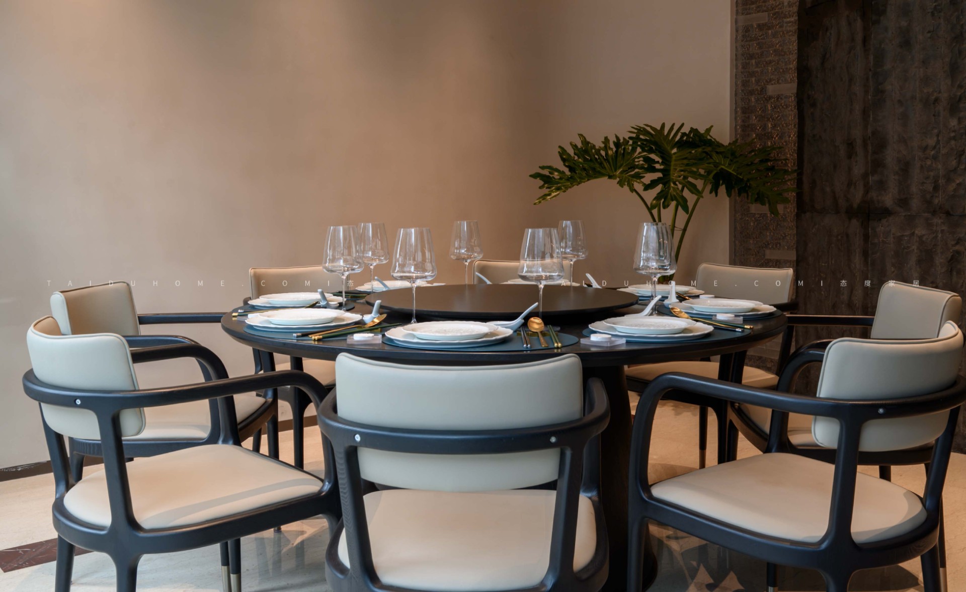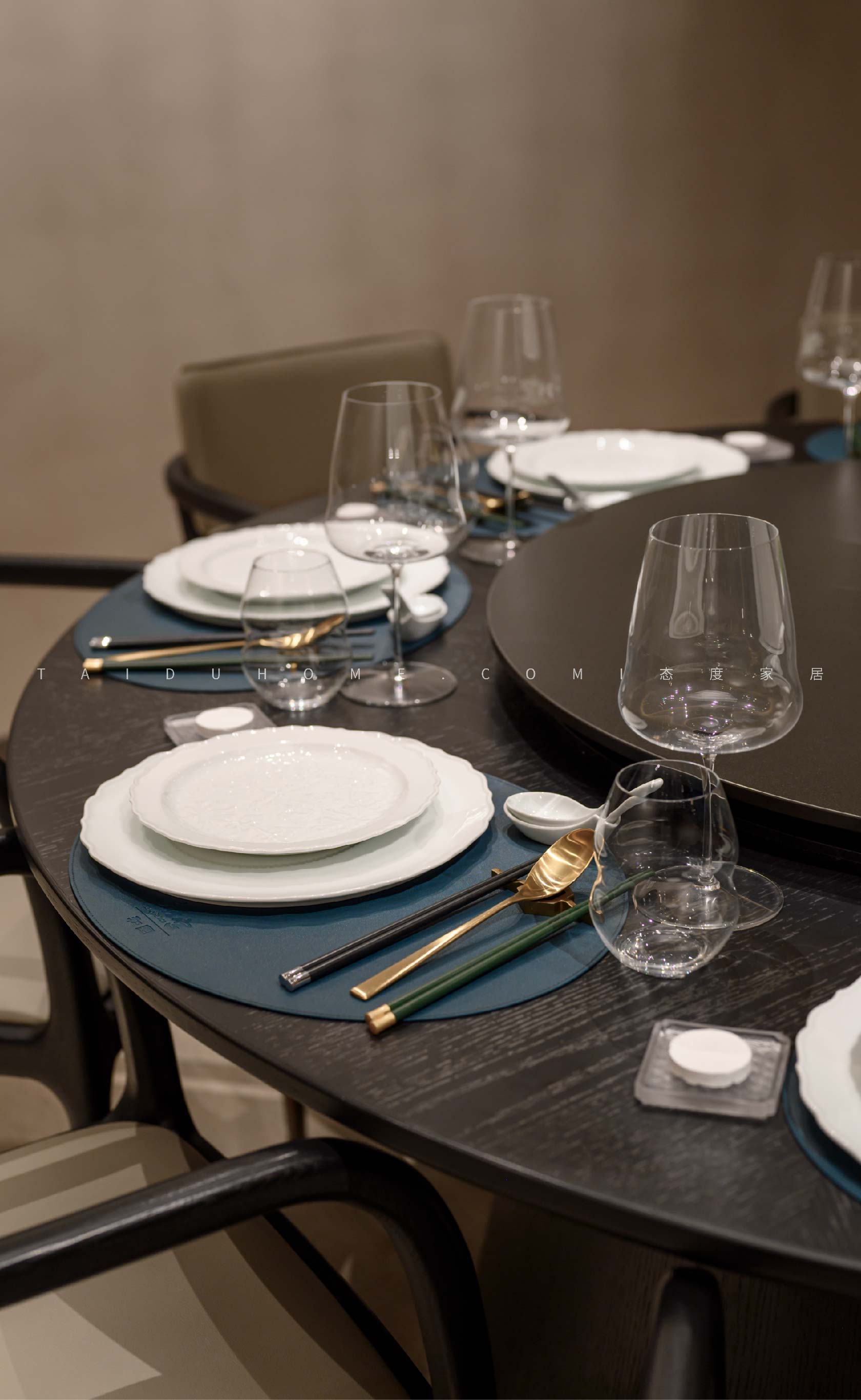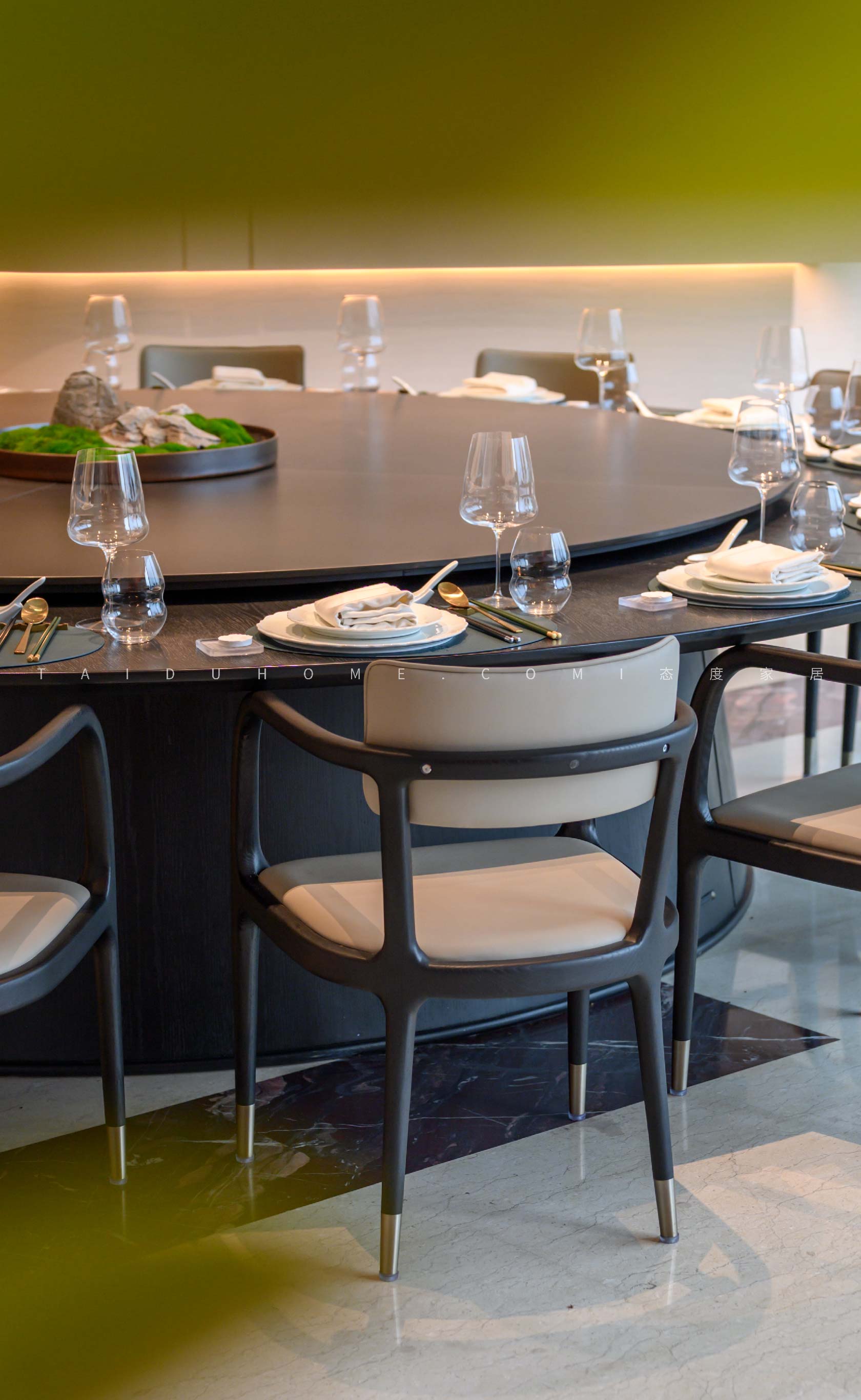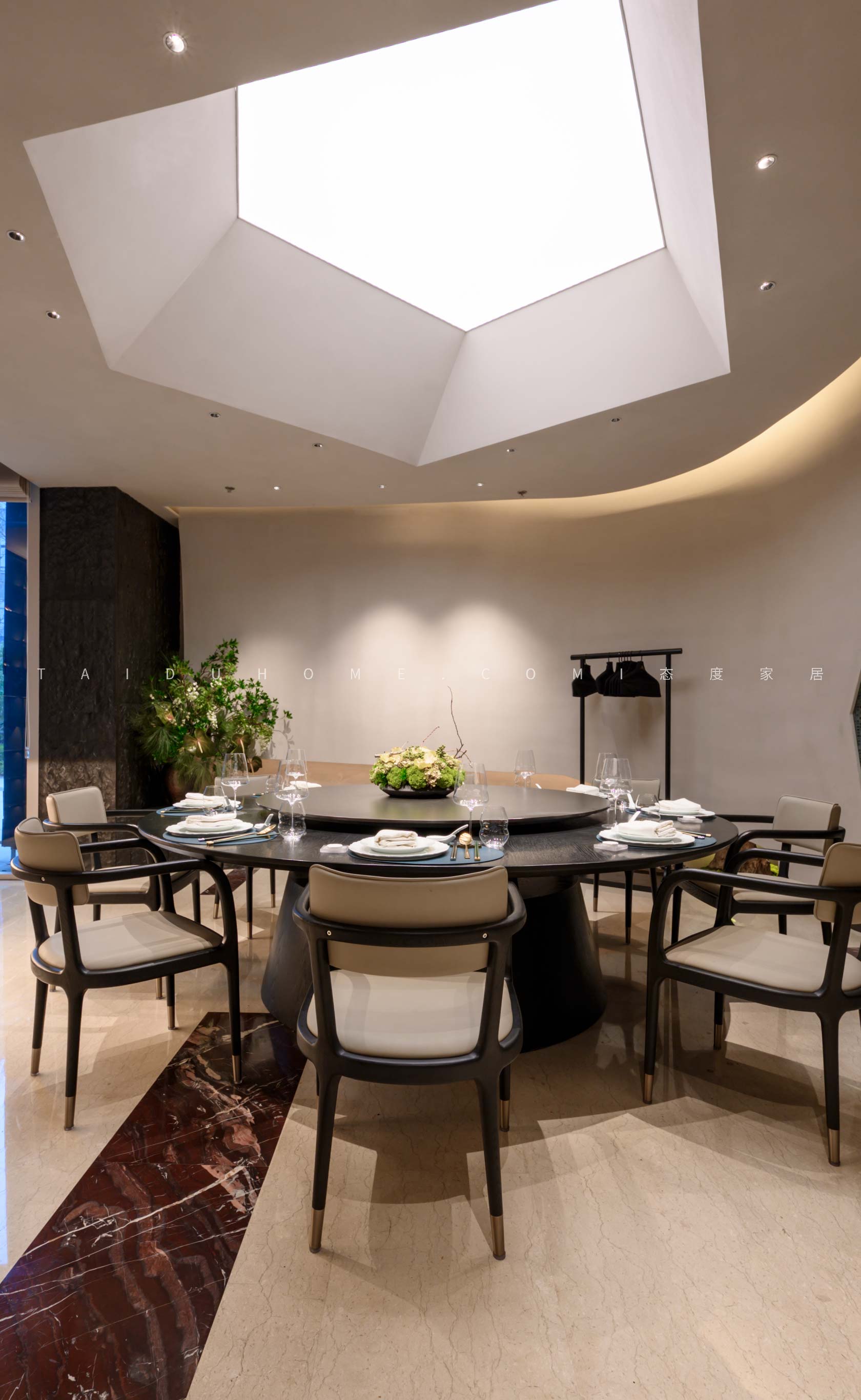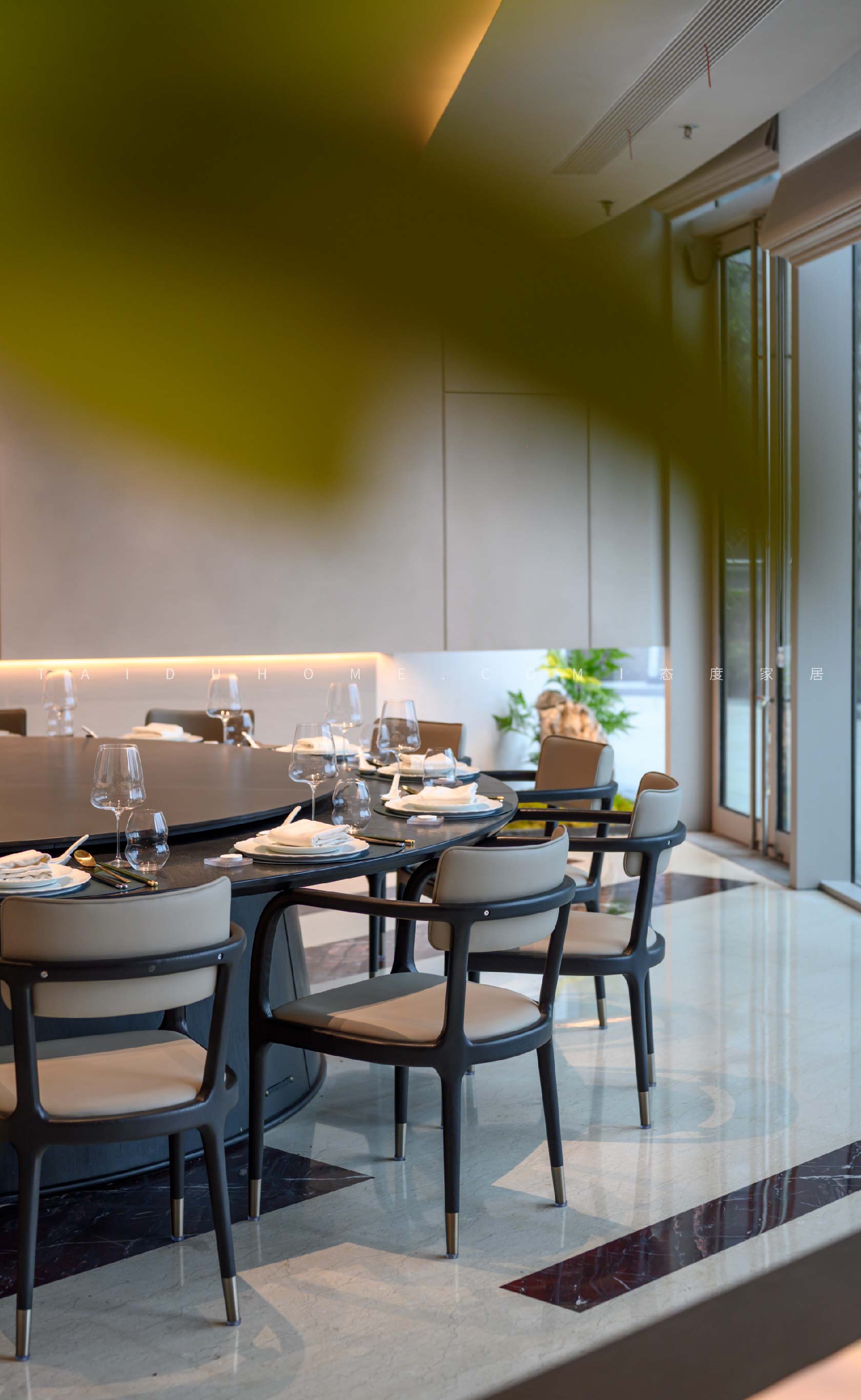 The designer extracted the precious red cherry blossom as the main color tone from the "Wangchuan Map", paired with the blue and blue color scheme representing the mountains and rivers. The dining space uses elements such as green plants and flowing water lanterns to create a peaceful, harmonious, and lively scene of the prosperous Tang Dynasty.