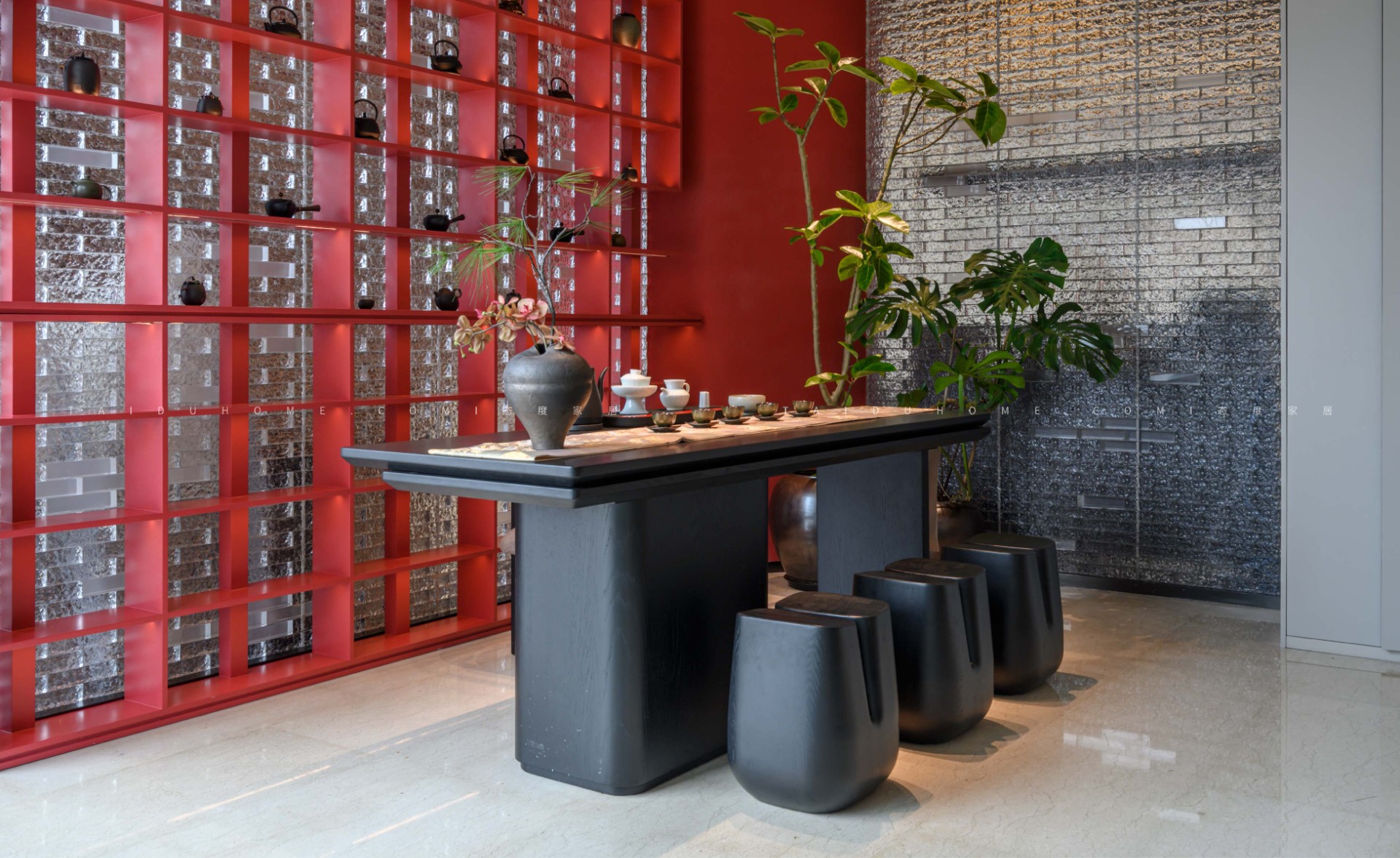 设计师提取《辋川图》中华贵的朱樱红为主色调,搭配代表山川的青蓝色系。用餐空间中运用绿植、流水华灯等元素营造宁静和谐、热闹华丽的大唐盛世景象。