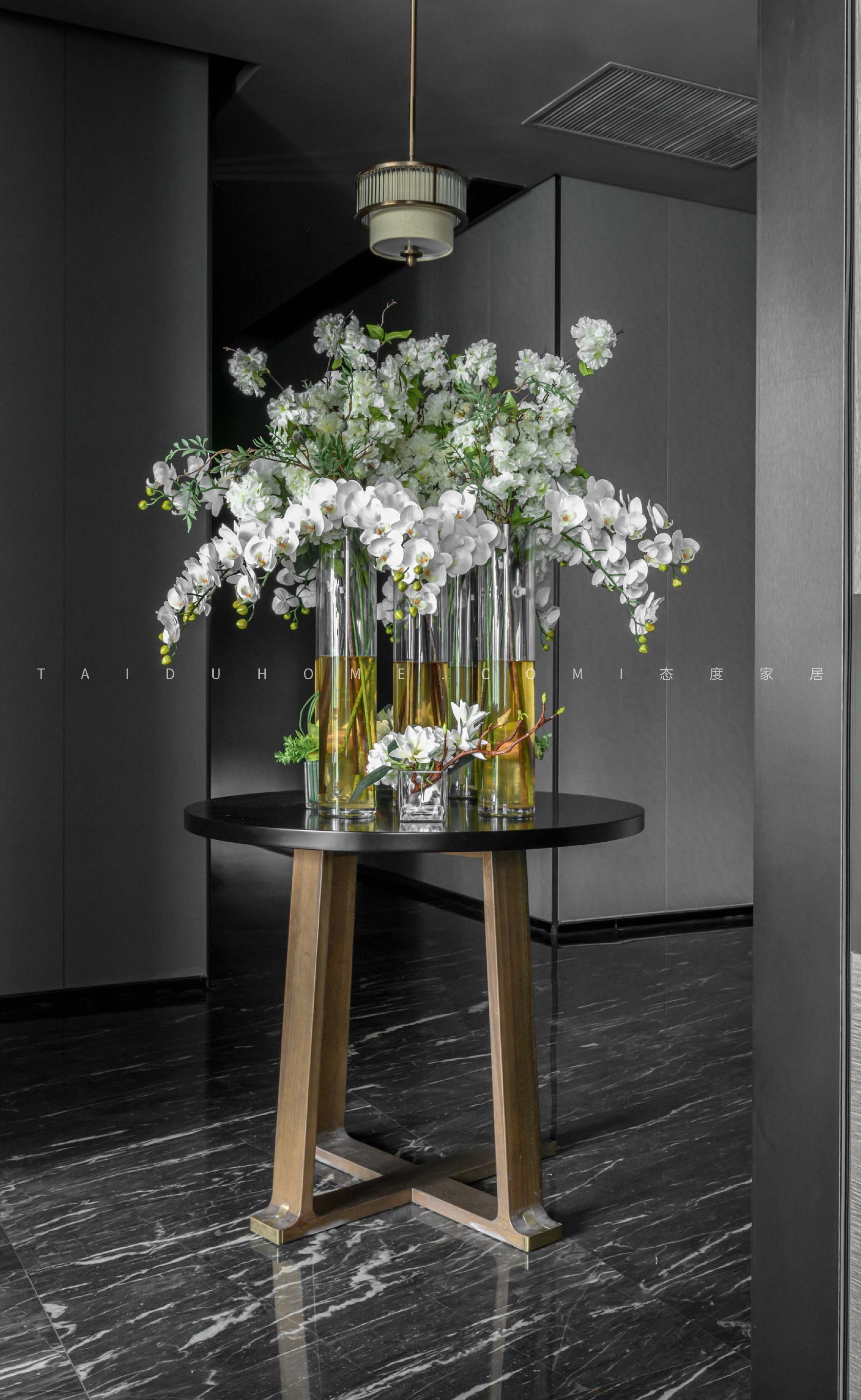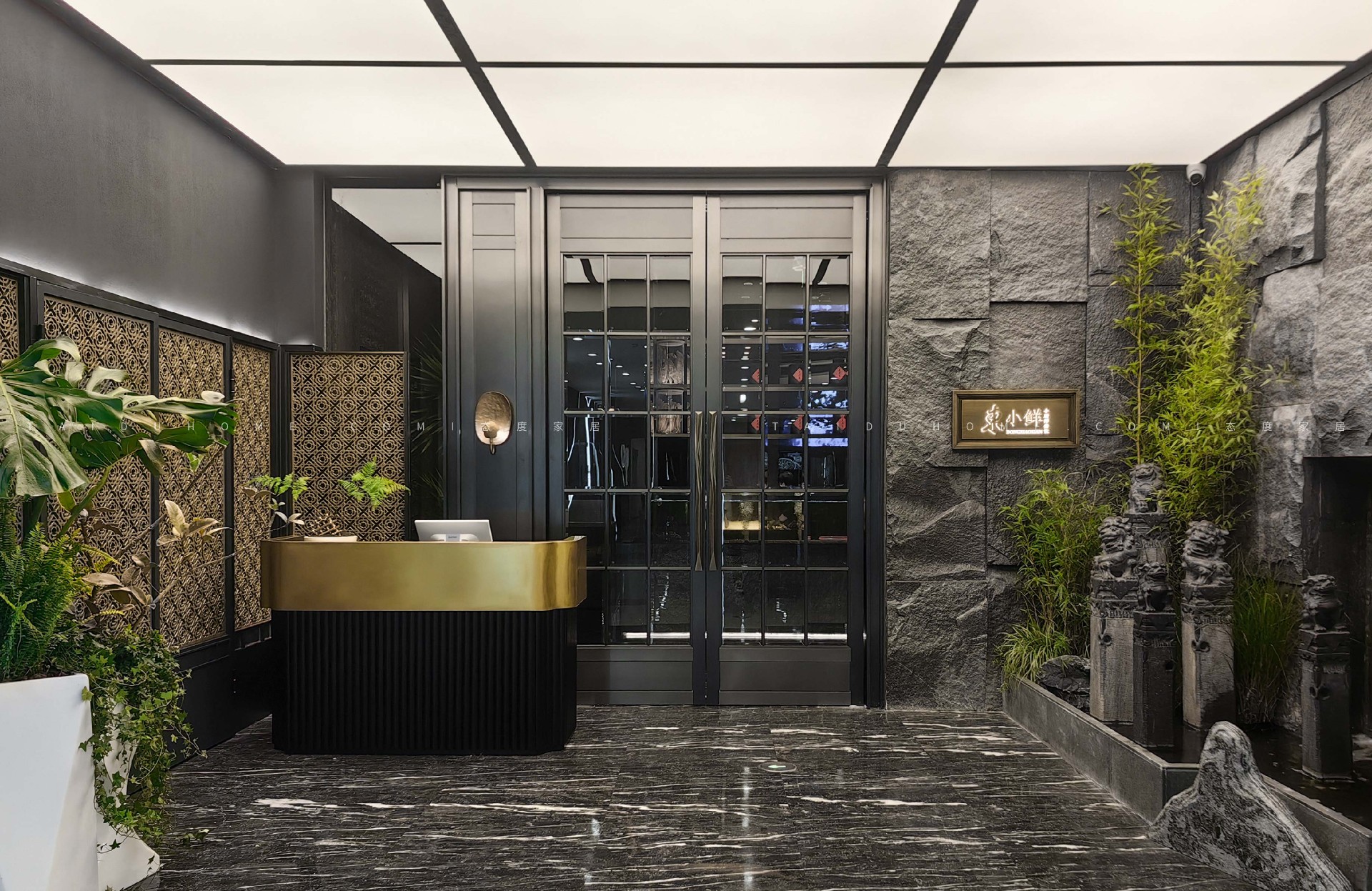 过道的整体地面都选用了质感极好的大理石地砖,黑色通道上摆放了形态各异的弥勒佛雕塑,增添了不少趣味及观赏性。