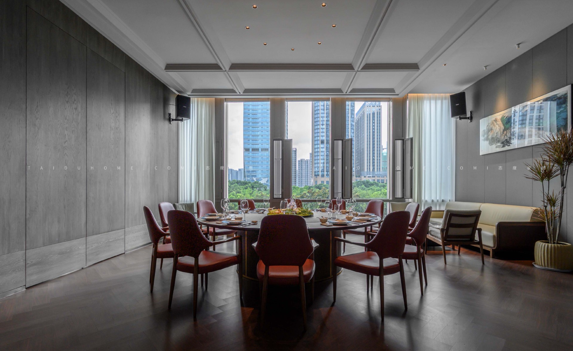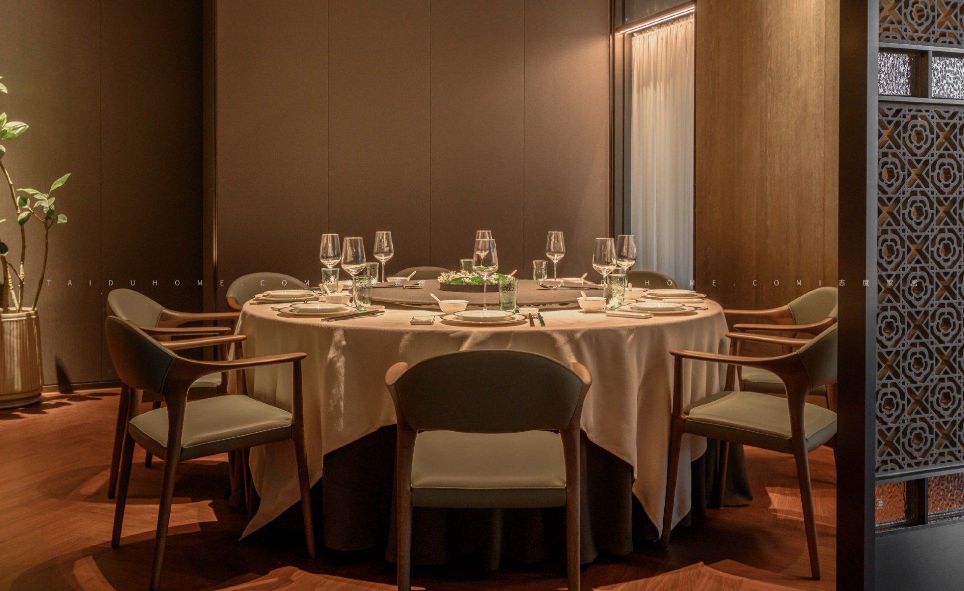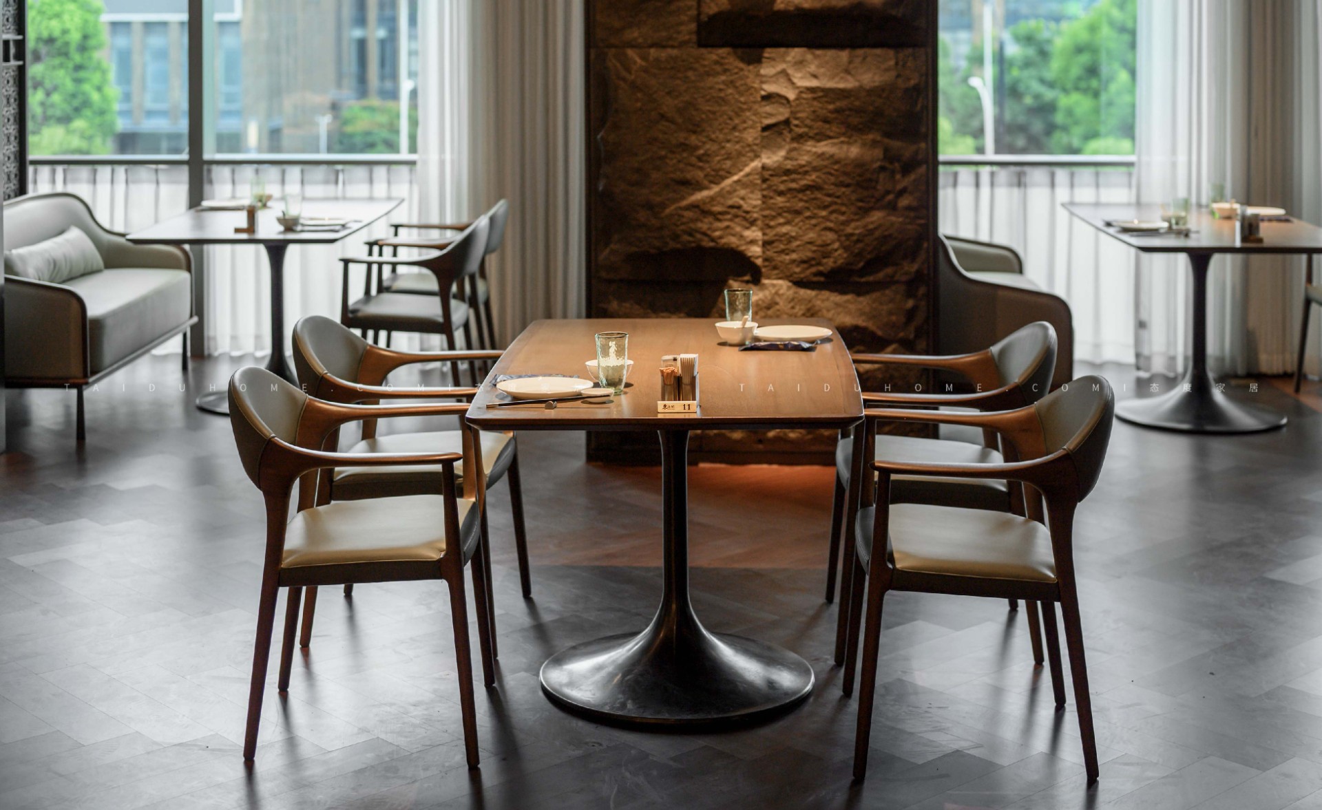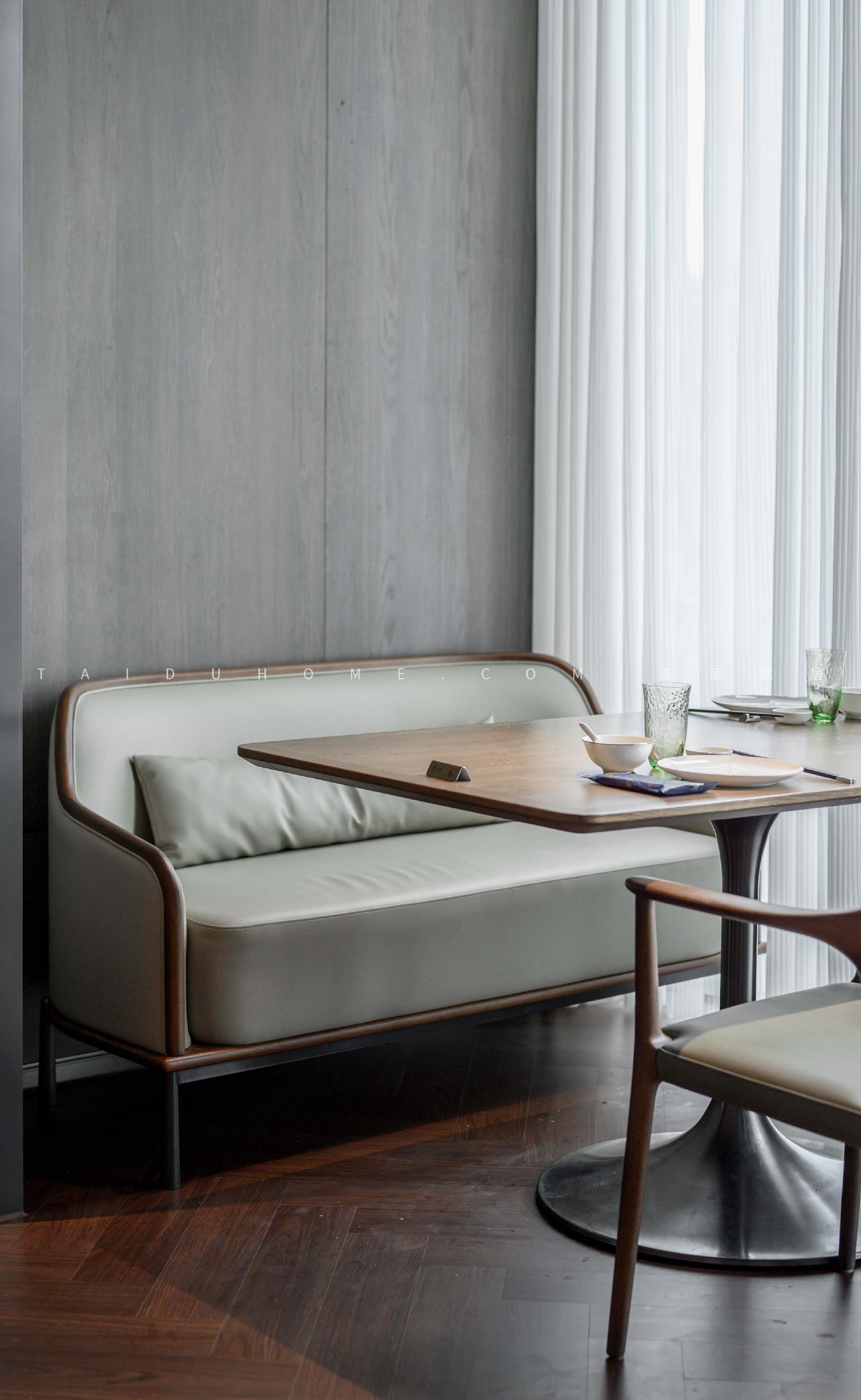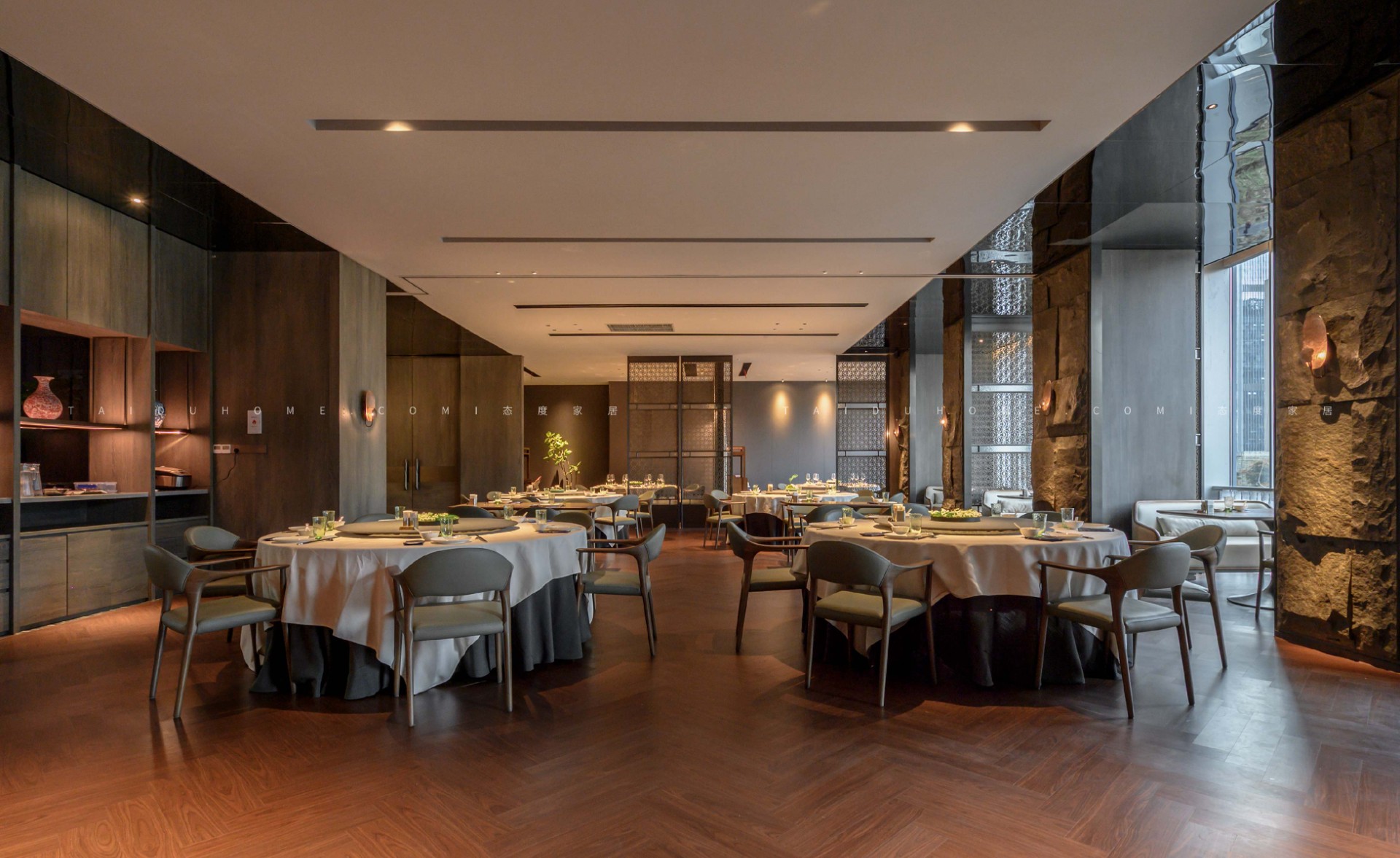 東小鲜共有小中大包厢共19个,每个包厢里都配备不同的会客休憩区,设计师赋予空间以优雅、娴静、自然的舒适感。