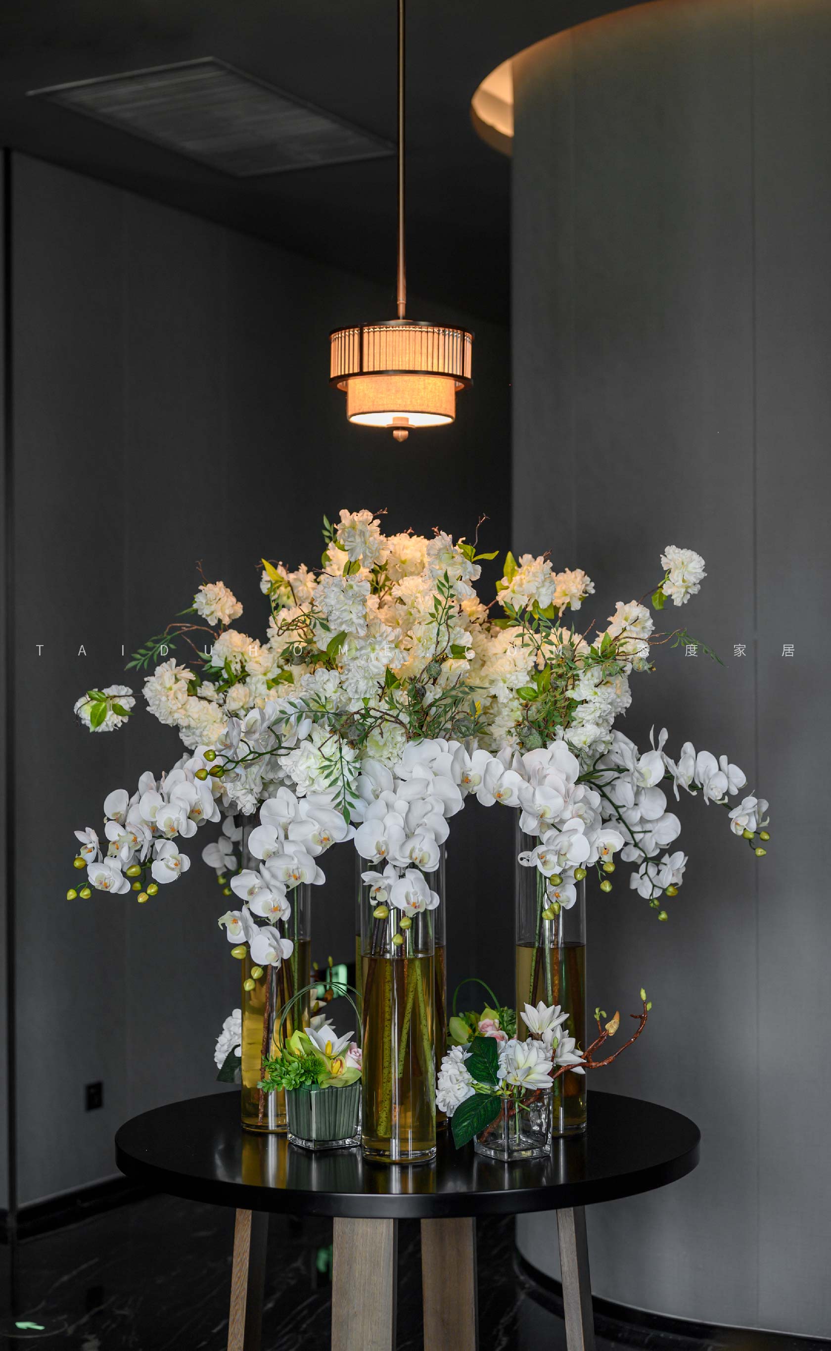 大厅的主色调以黑灰色为主,展示柜表皮均为灰色的水磨石,弧形吊顶在射灯的照映下显得更加宽敞,和展柜本身石材的厚重感形成对比。