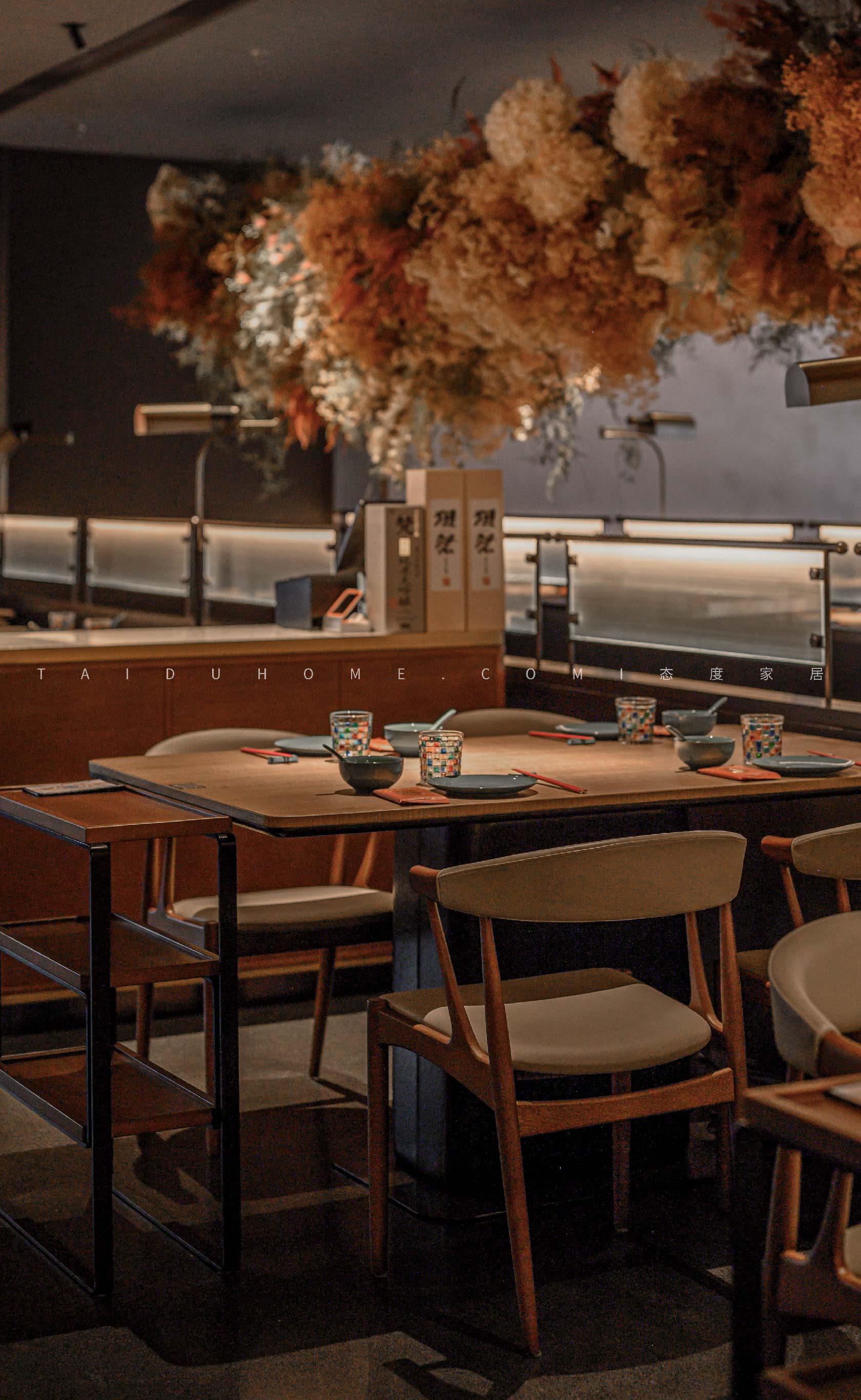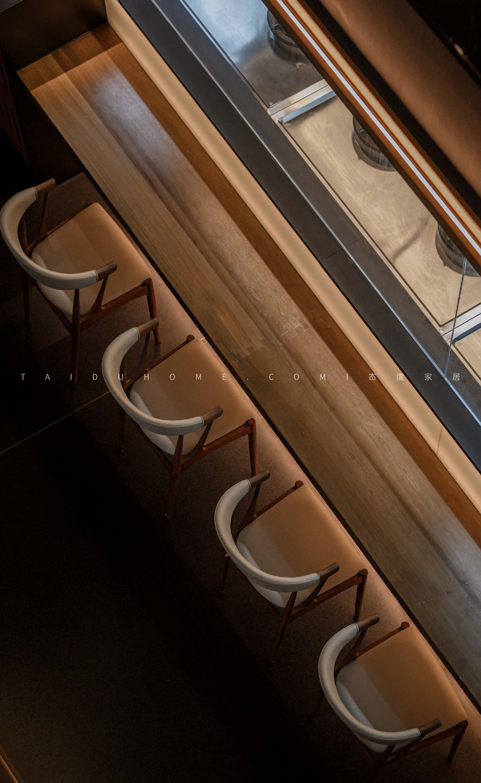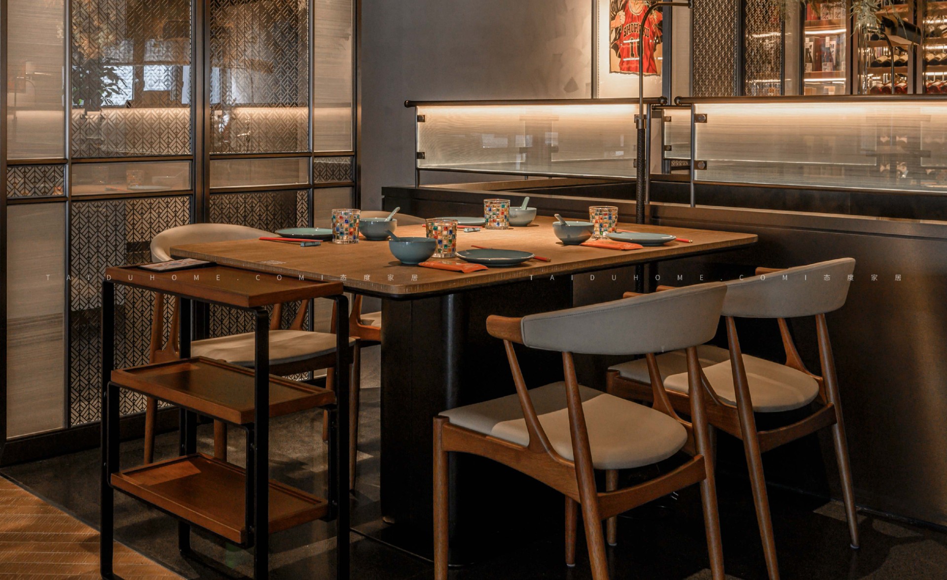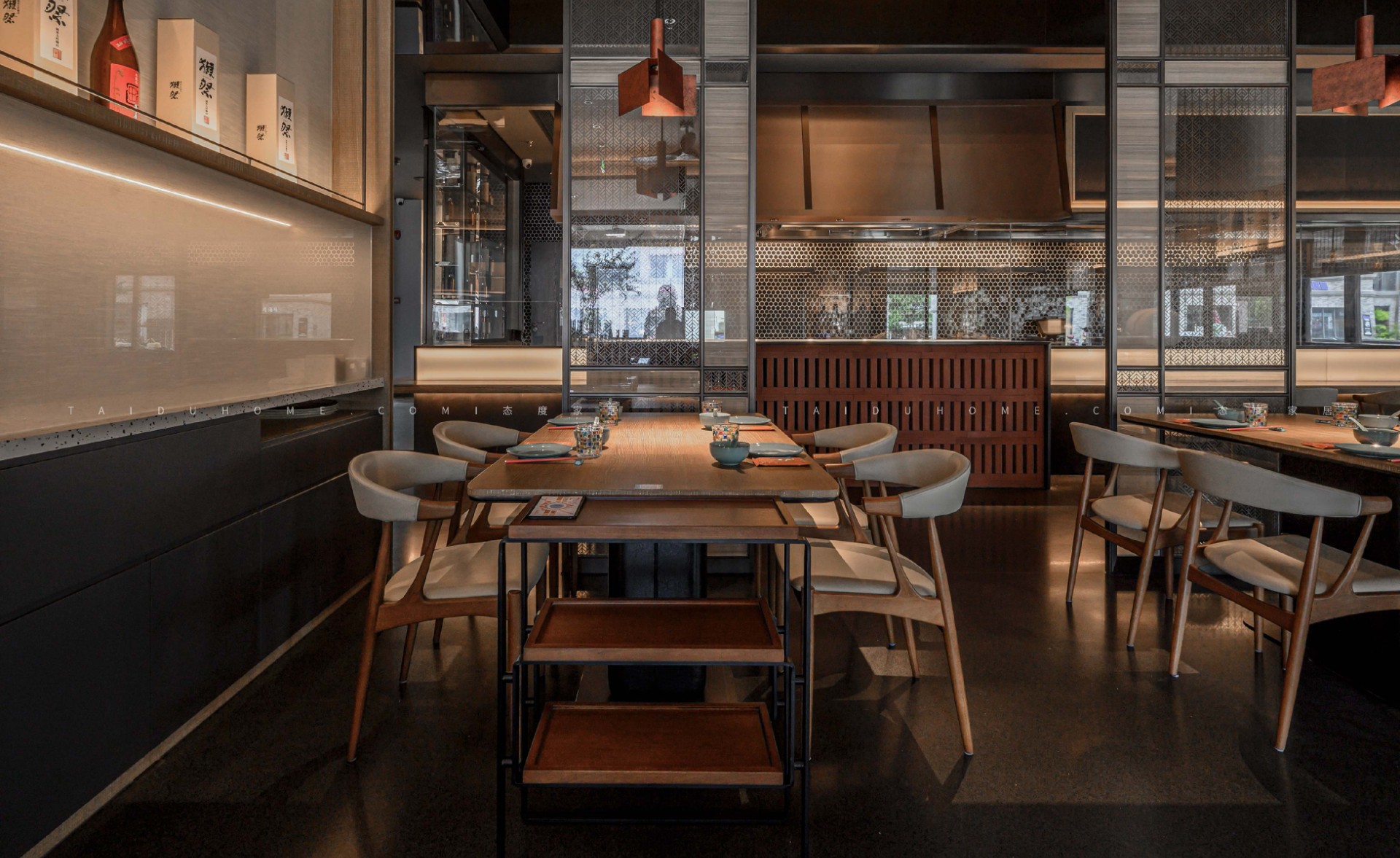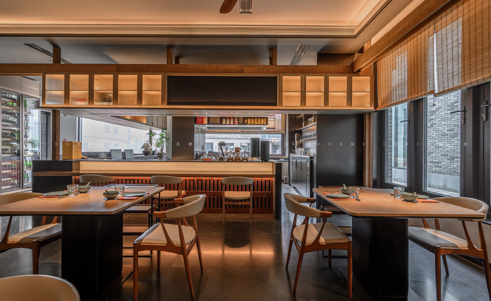 The dim yellow lights, light colored dining chairs, and wooden tabletops create a cozy atmosphere for guests entering the board, creating a comfortable feeling. Through the glass, one can still see the busy figure of the chef in front of the board.