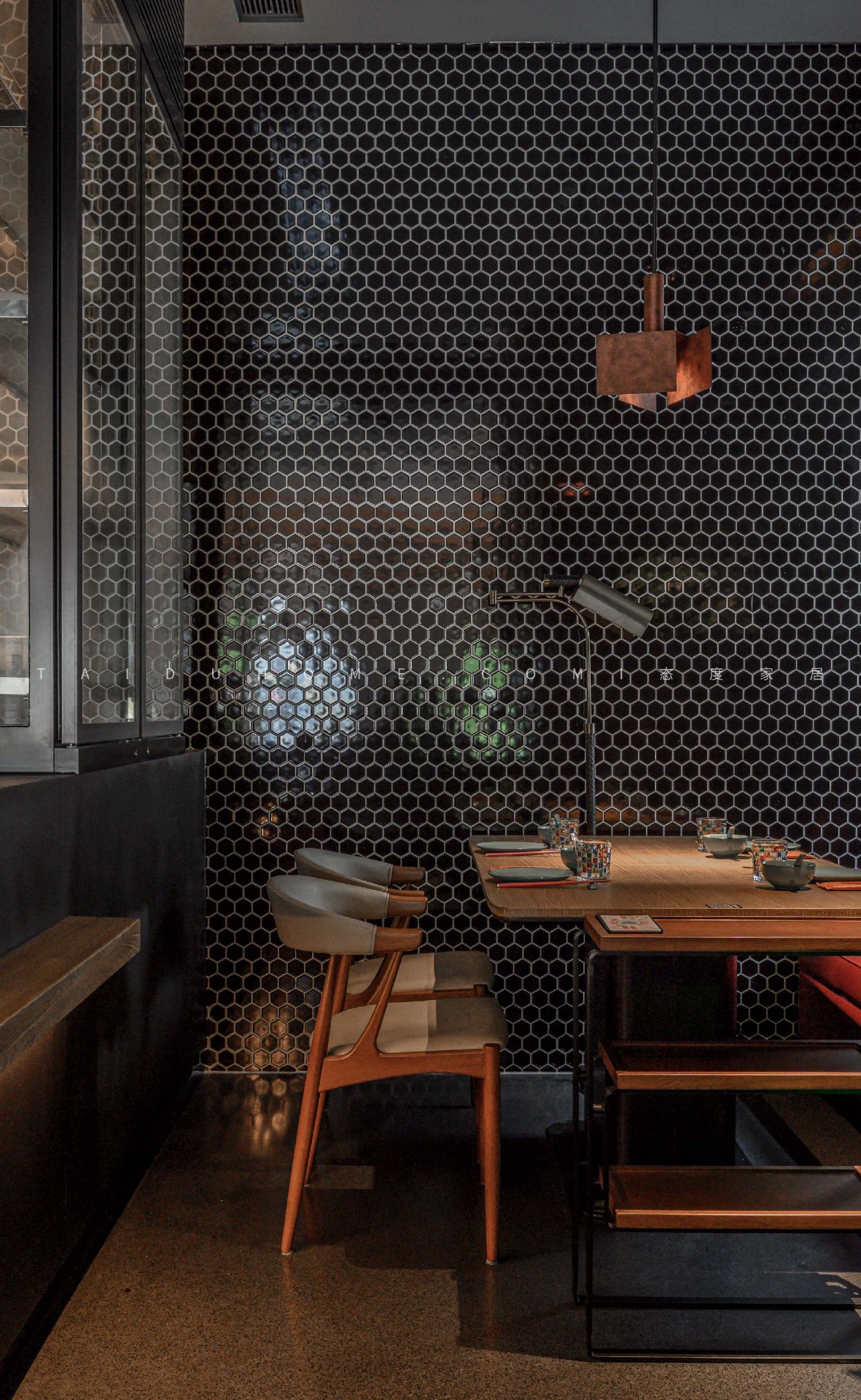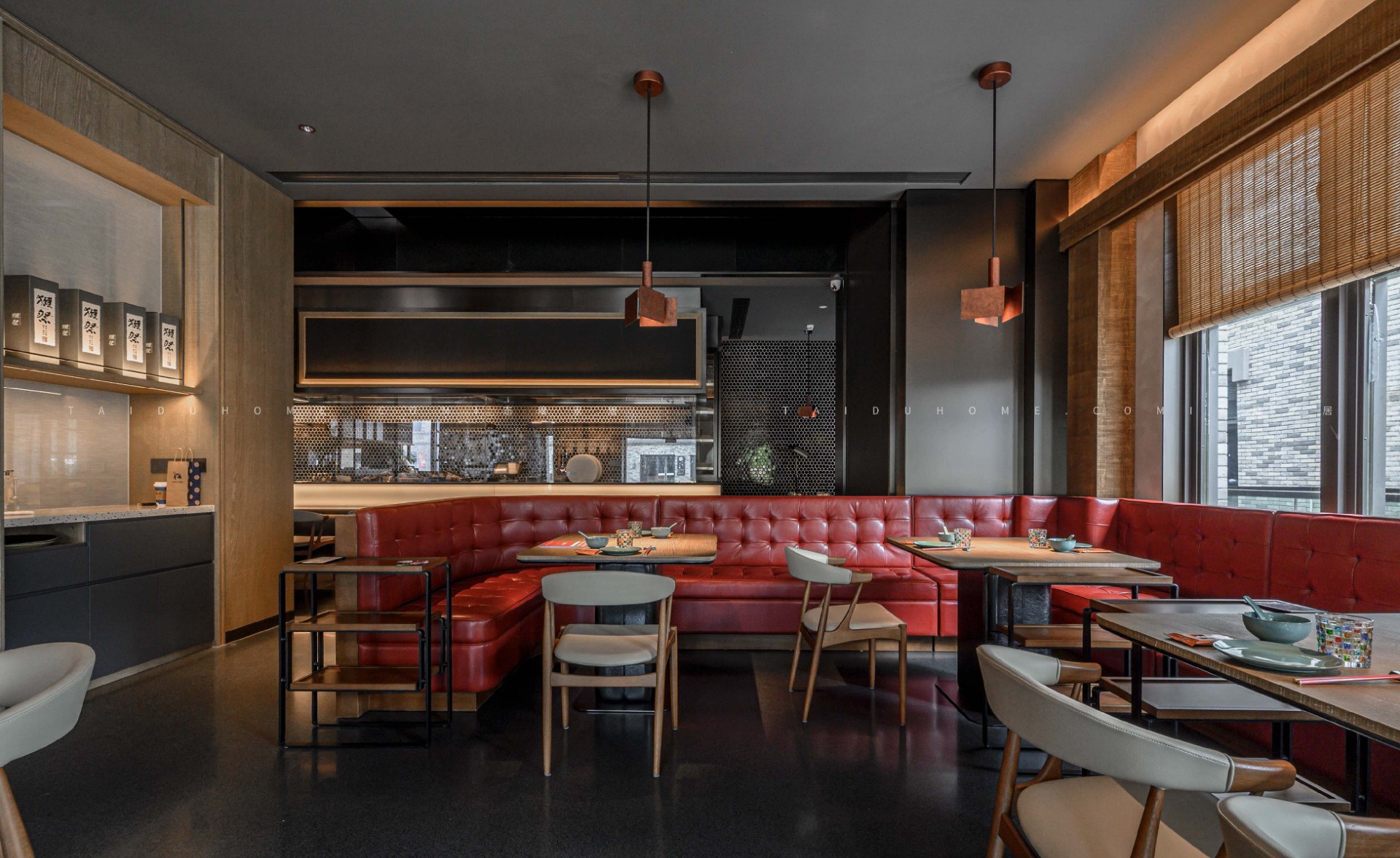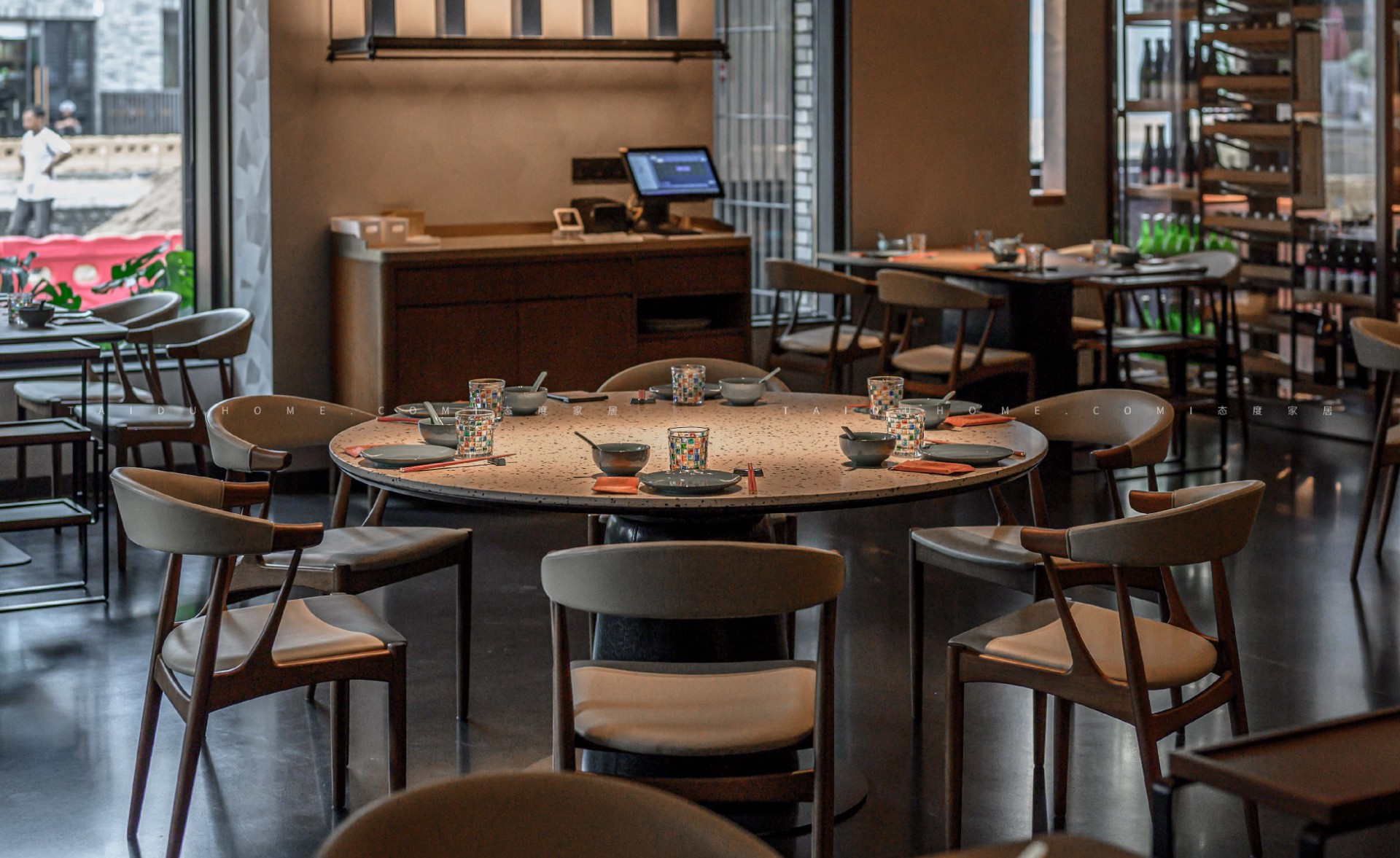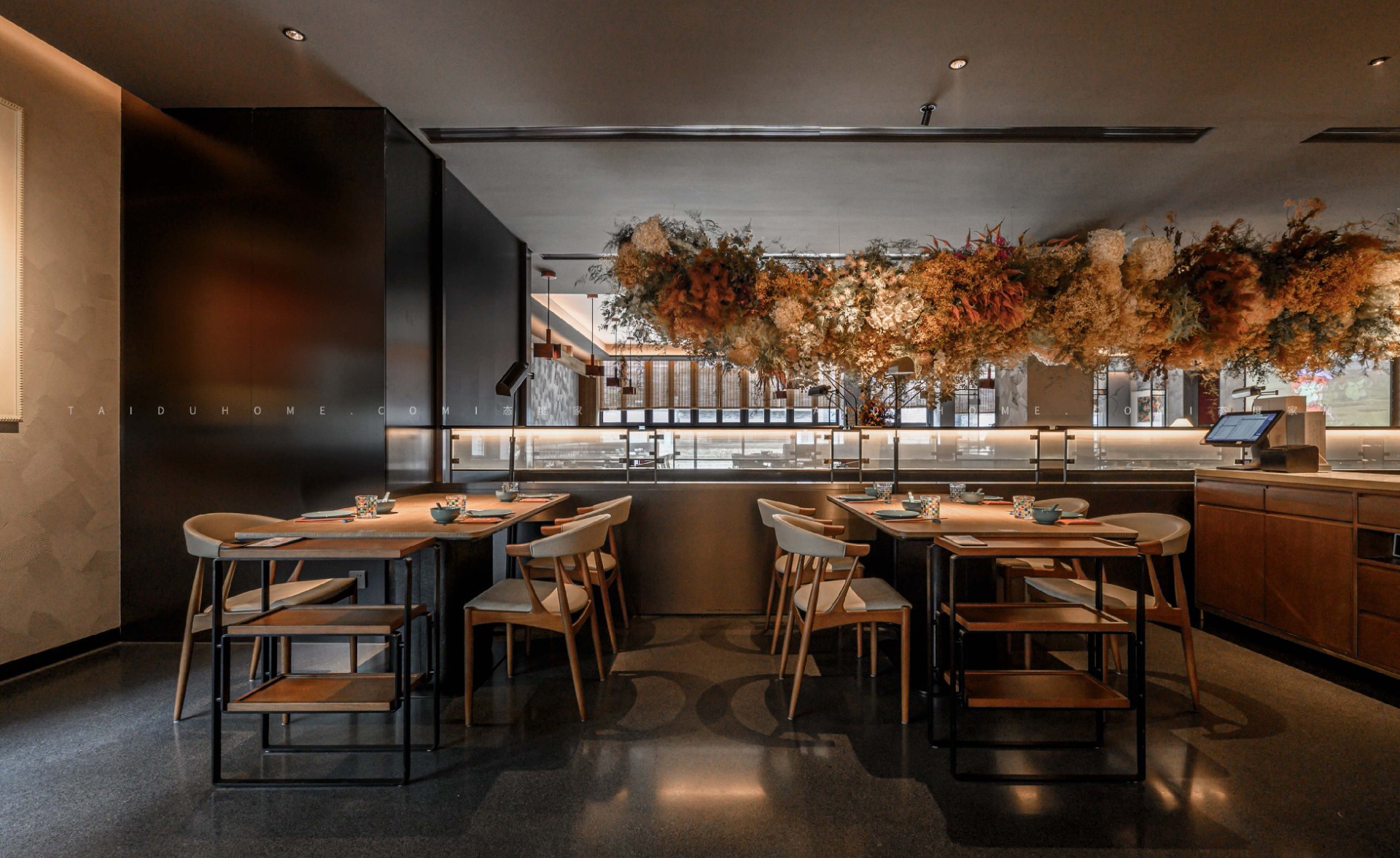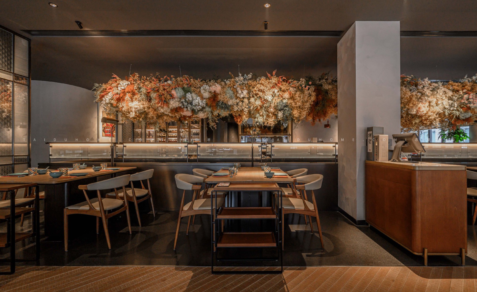 The dim yellow lights, light colored dining chairs, and wooden tabletops create a cozy atmosphere for guests entering the board, creating a comfortable feeling. Through the glass, one can still see the busy figure of the chef in front of the board.